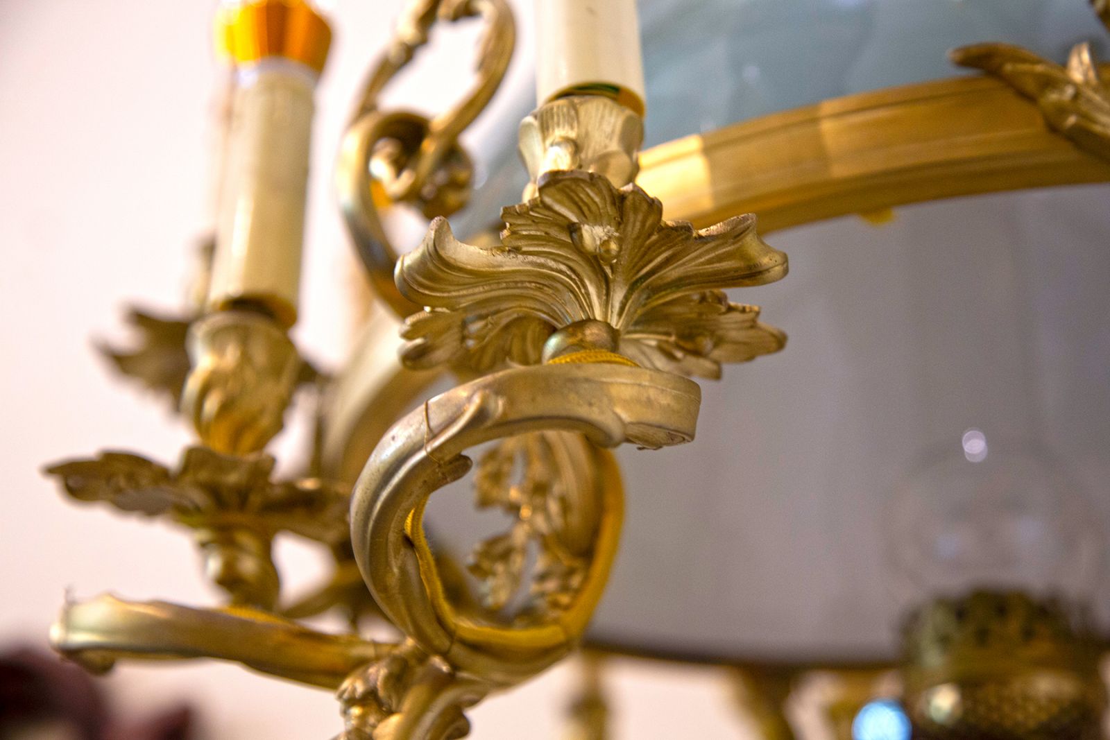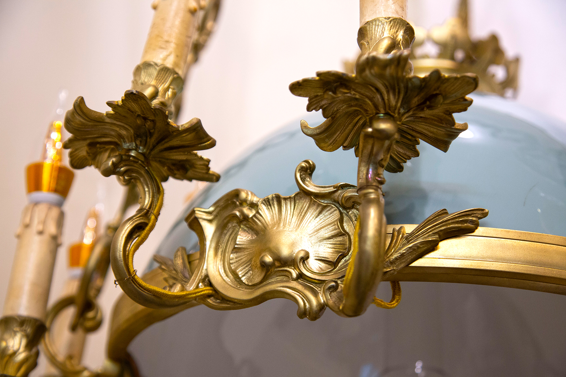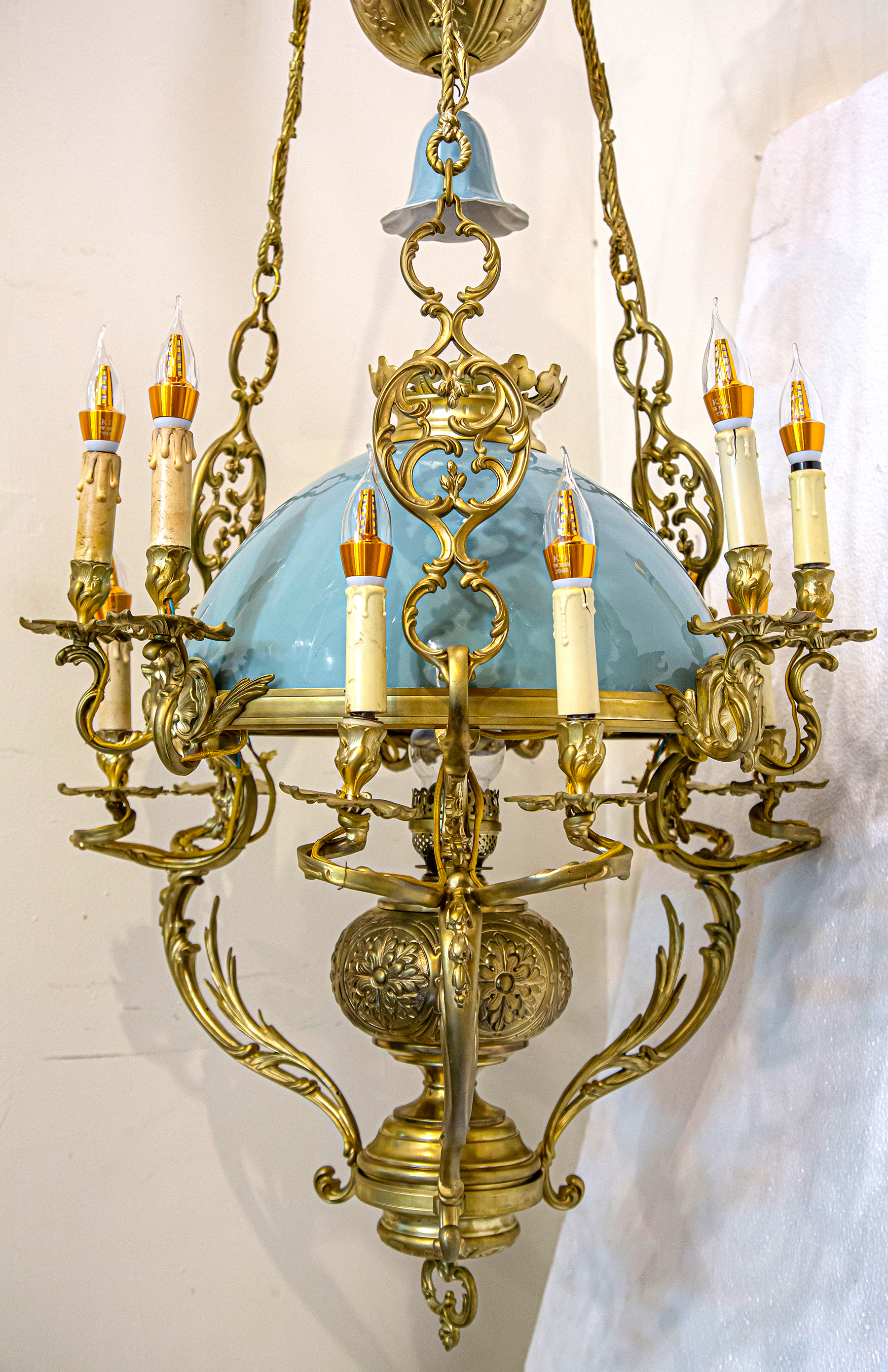 Chiếc đèn ba dây này được chế tác từ chất liệu đồng cao cấp kết hợp với chóa sứ hai da xanh ngọc, tạo nên sự hoà quyện tinh tế giữa kim loại và gốm sứ. Điểm đặc biệt trên chiếc đèn này chính là những họa tiết hoa lá tây mềm mài, tinh xảo được đúc đặc, tạo nên vẻ đẹp sang trọng, hoài cổ. Thành phần đúc đặc không chỉ giúp cho chiếc đèn trở nên bền bỉ theo thời gian, mà còn thể hiện tay nghề đặt trình của các nghệ nhân châu Âu thuở trước.
