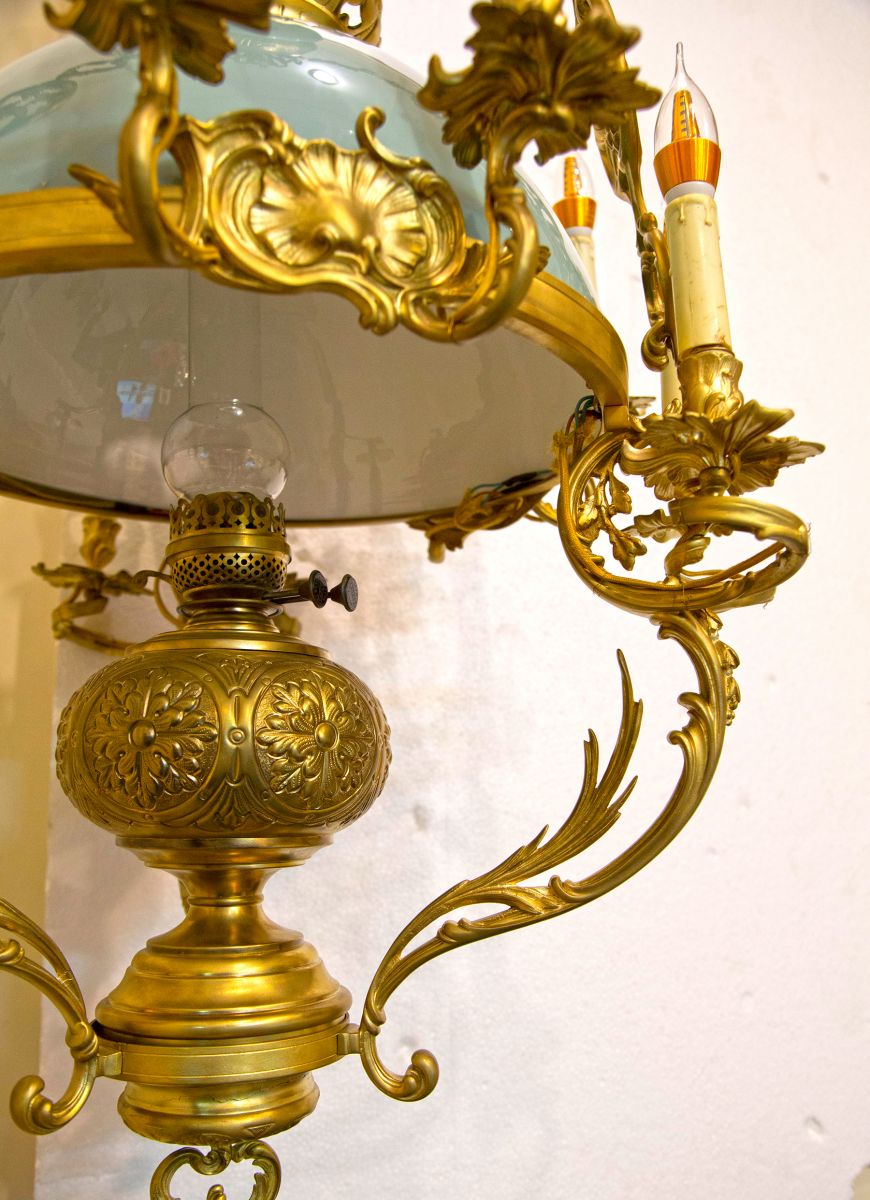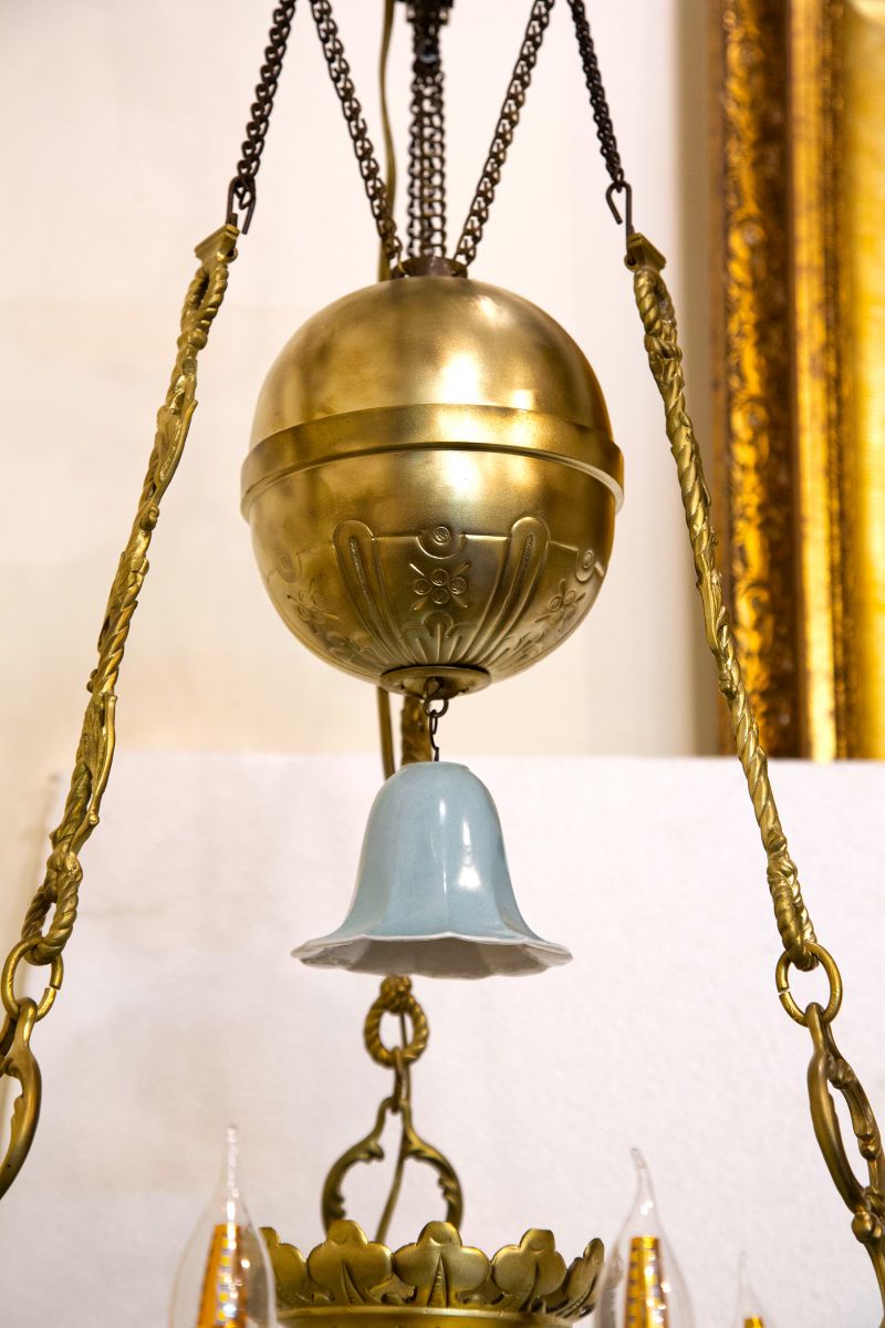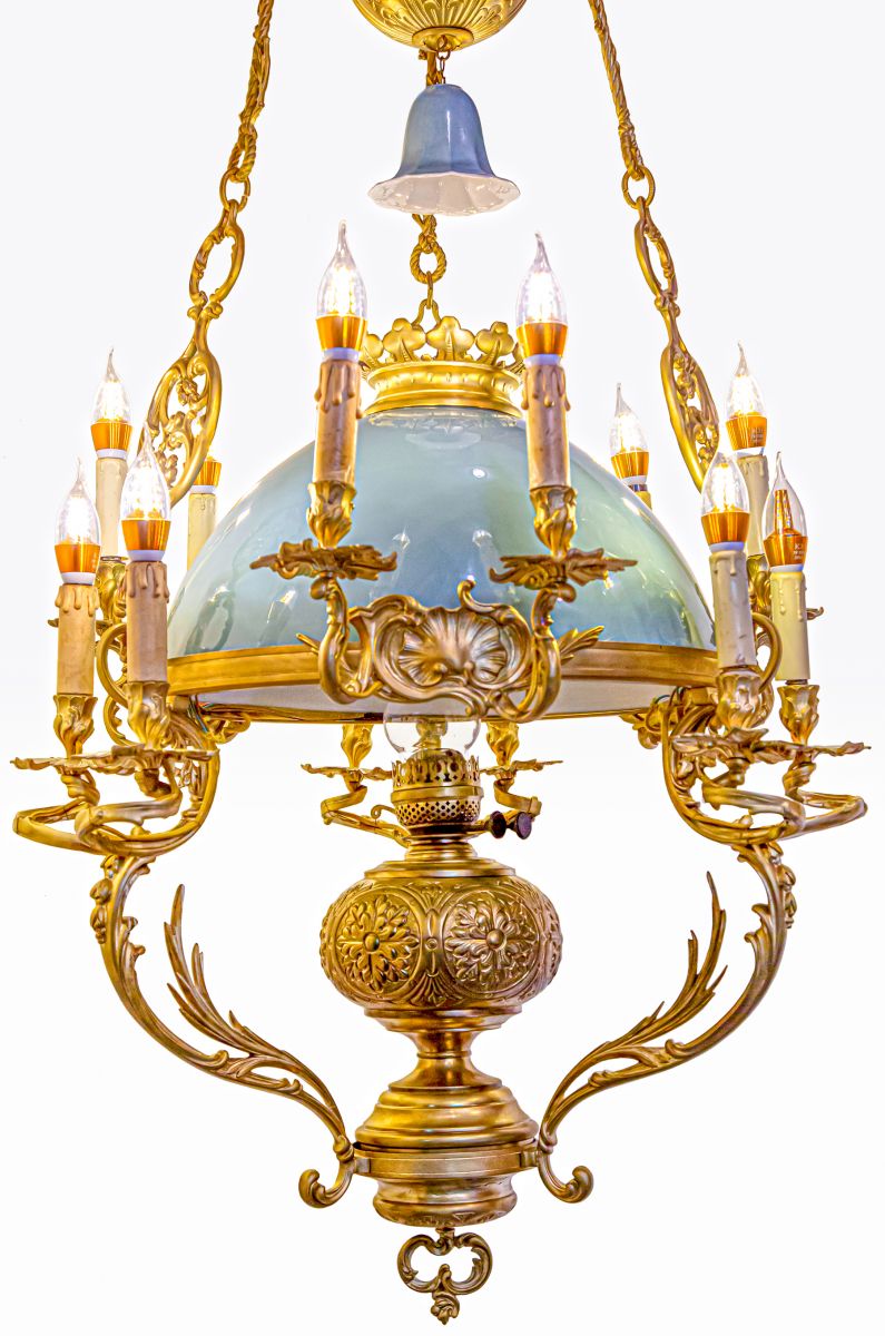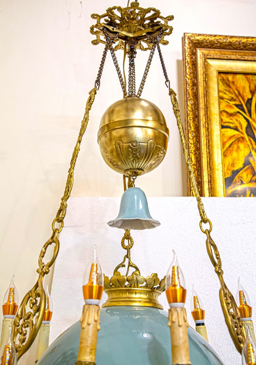Ngoài sự sang trọng và quyền uy, chiếc đèn còn mang vẻ đẹp vượt thời gian nhờ chất liệu đồng kết hợp với chóa sứ hai da xanh ngọc. Chiếc chắn khói điệu đà không chỉ giúp điều tiết khói mà còn tăng tính thẩm mỹ, đáp ứng nhu cầu trang trí của những gia tộc giàu sang.