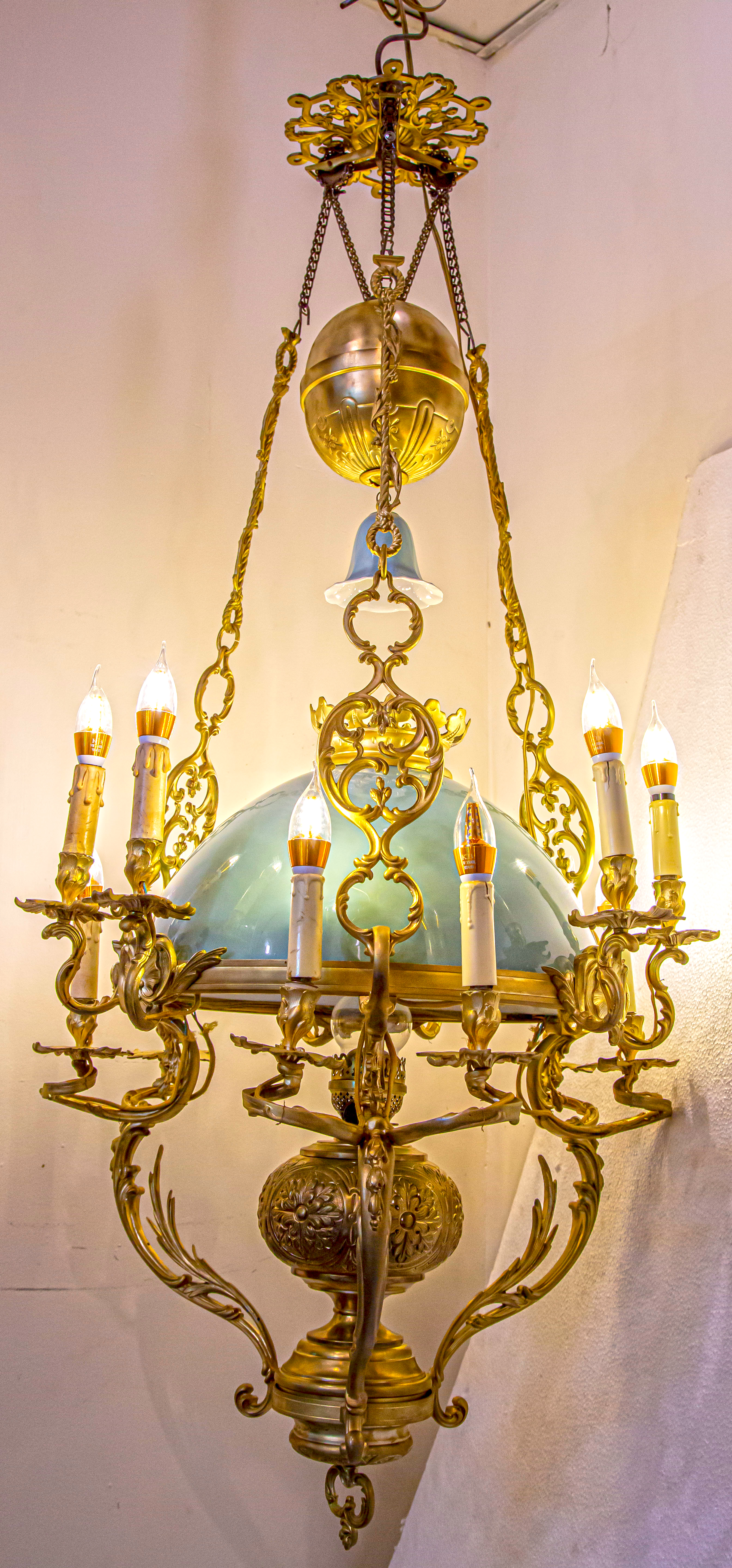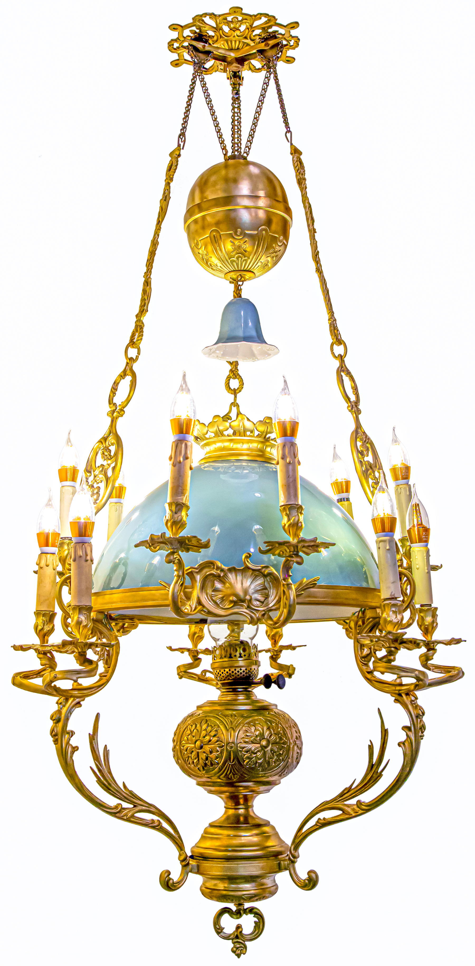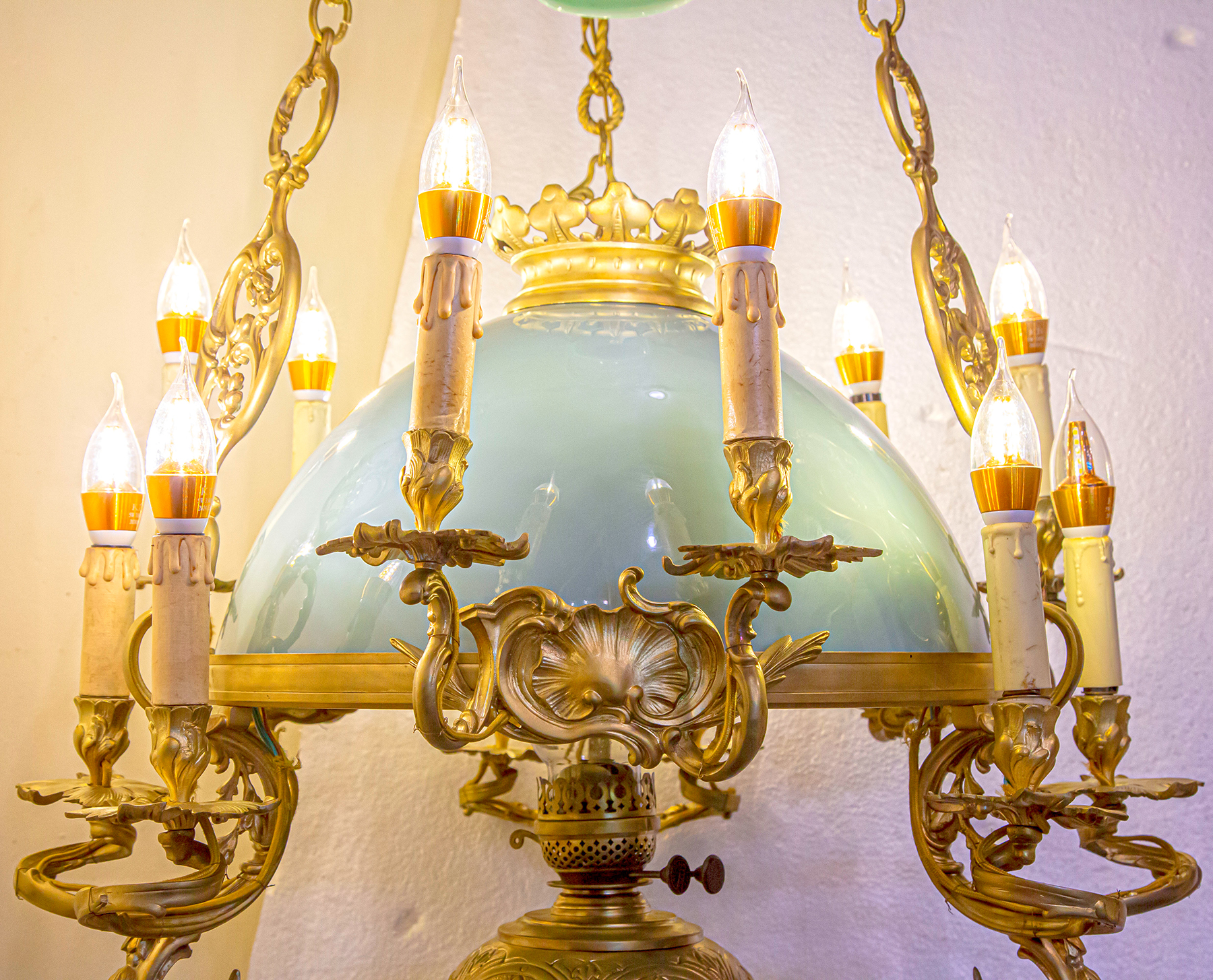 Ngoài sự sang trọng và quyền uy, chiếc đèn còn mang vẻ đẹp vượt thời gian nhờ chất liệu đồng kết hợp với chóa sứ hai da xanh ngọc. Chiếc chắn khói điệu đà không chỉ giúp điều tiết khói mà còn tăng tính thẩm mỹ, đáp ứng nhu cầu trang trí của những gia tộc giàu sang.