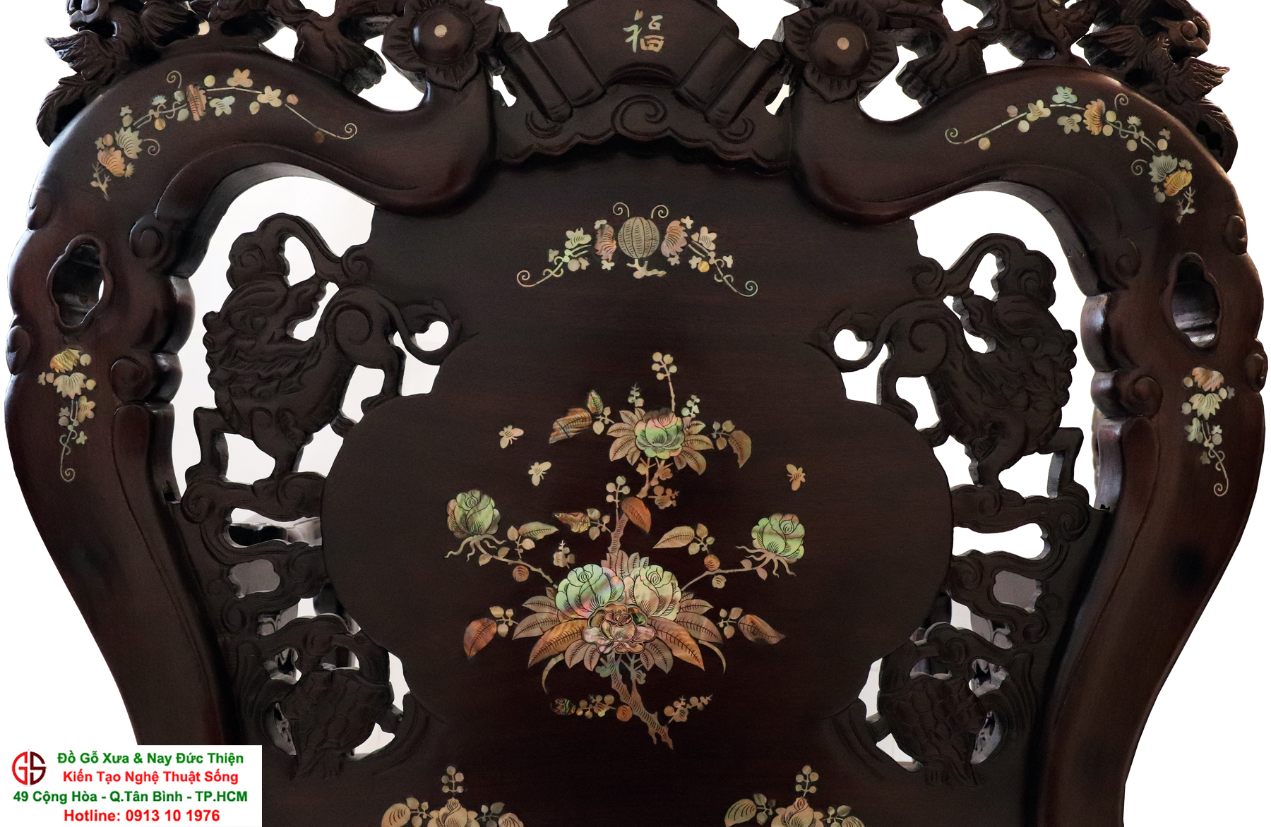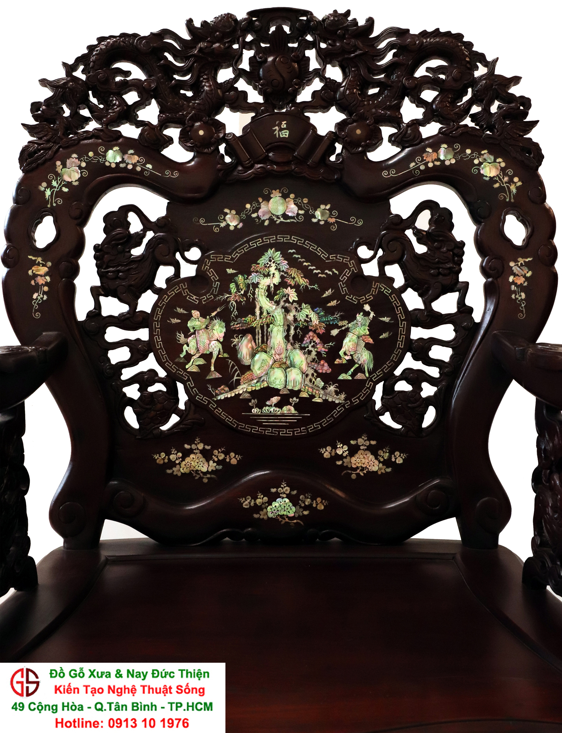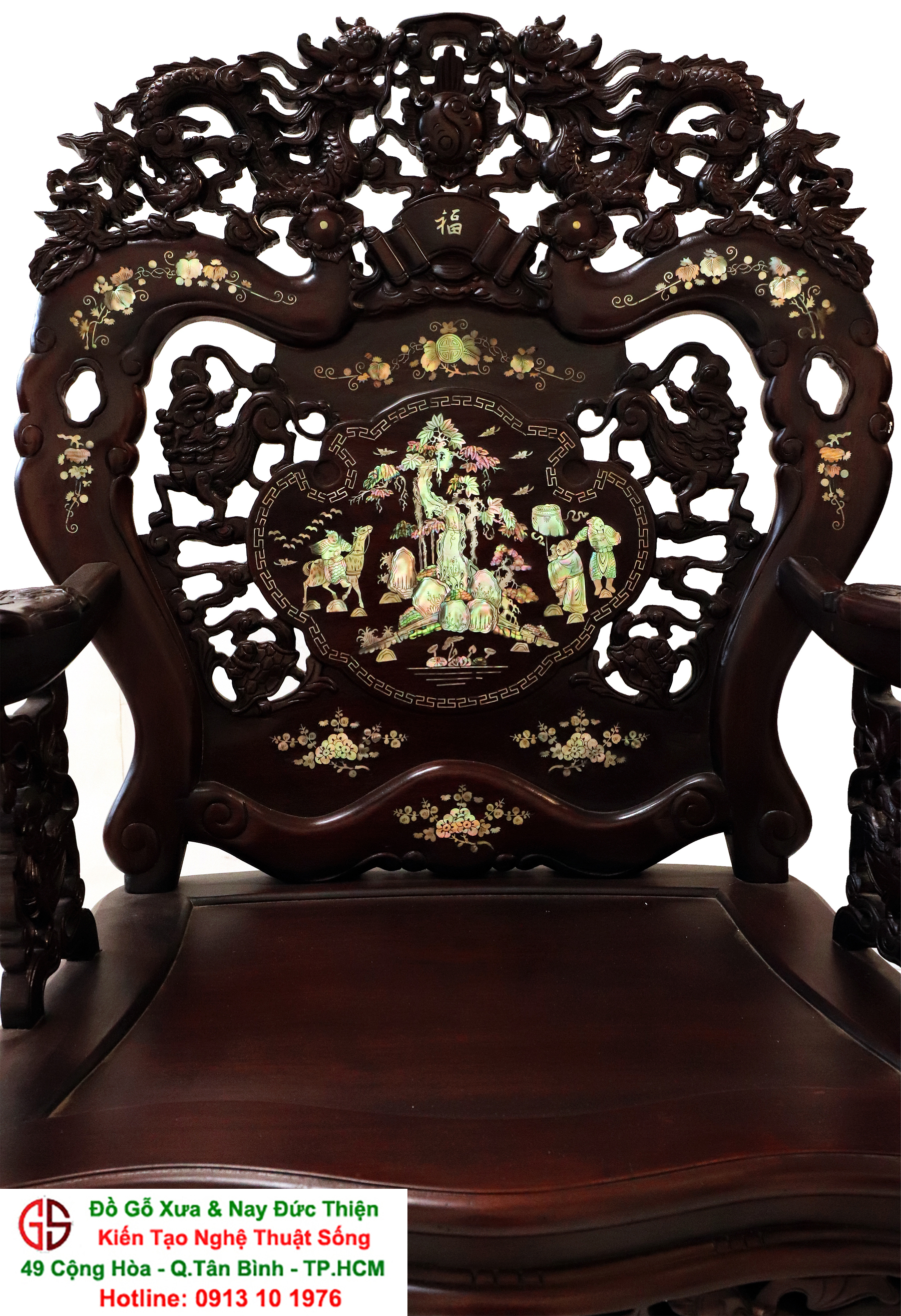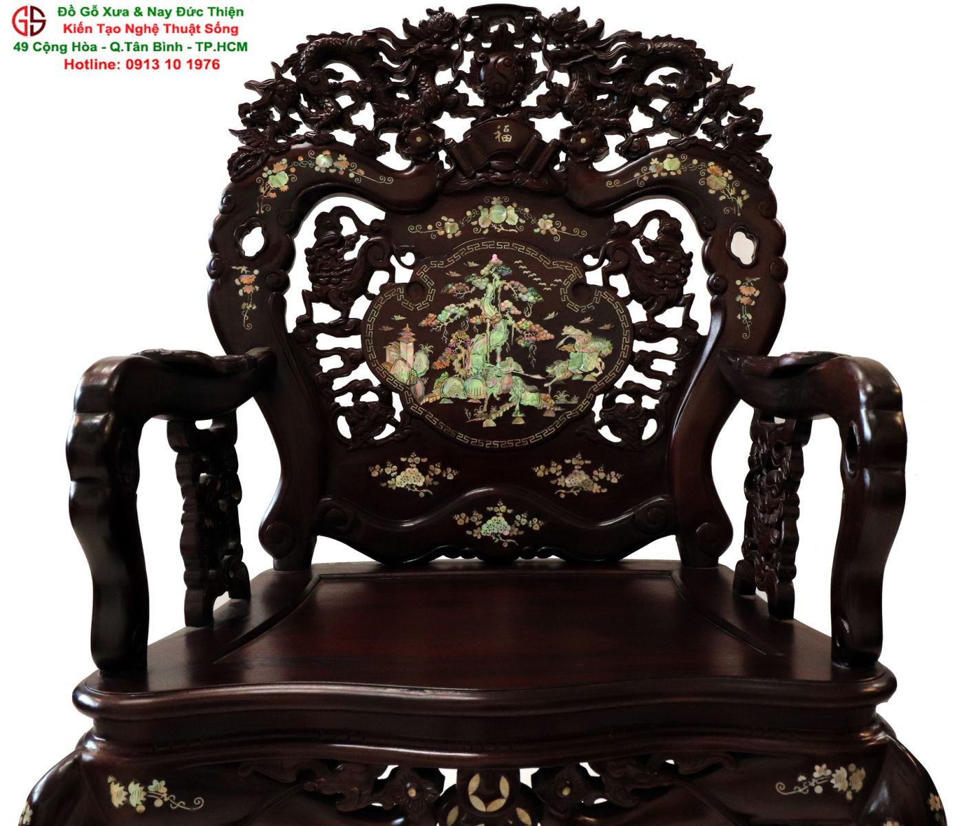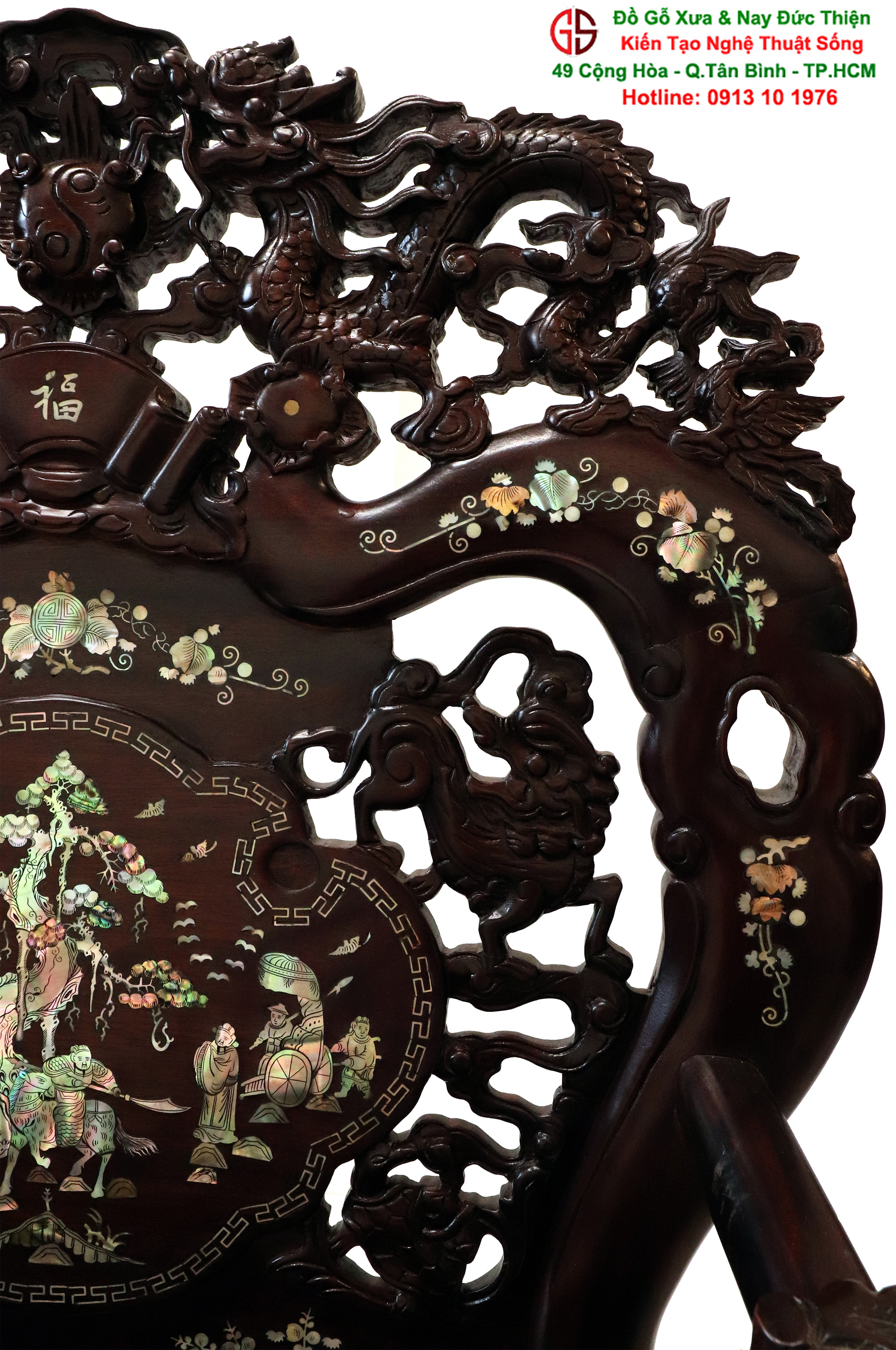 Bộ ghế gồm 9 món với hình tượng chủ đạo là rồng được chạm khảm cầu kỳ, tinh tế, qua bàn tay của người nghệ nhân tài hoa xứ Huế, gỗ đã được thổi hồn vào đó. Hàng trăm năm sau, nó trở thành những tuyệt tác để đời mà ai đó được hữu duyên sở hữu có quyền tự hào với đời sau.