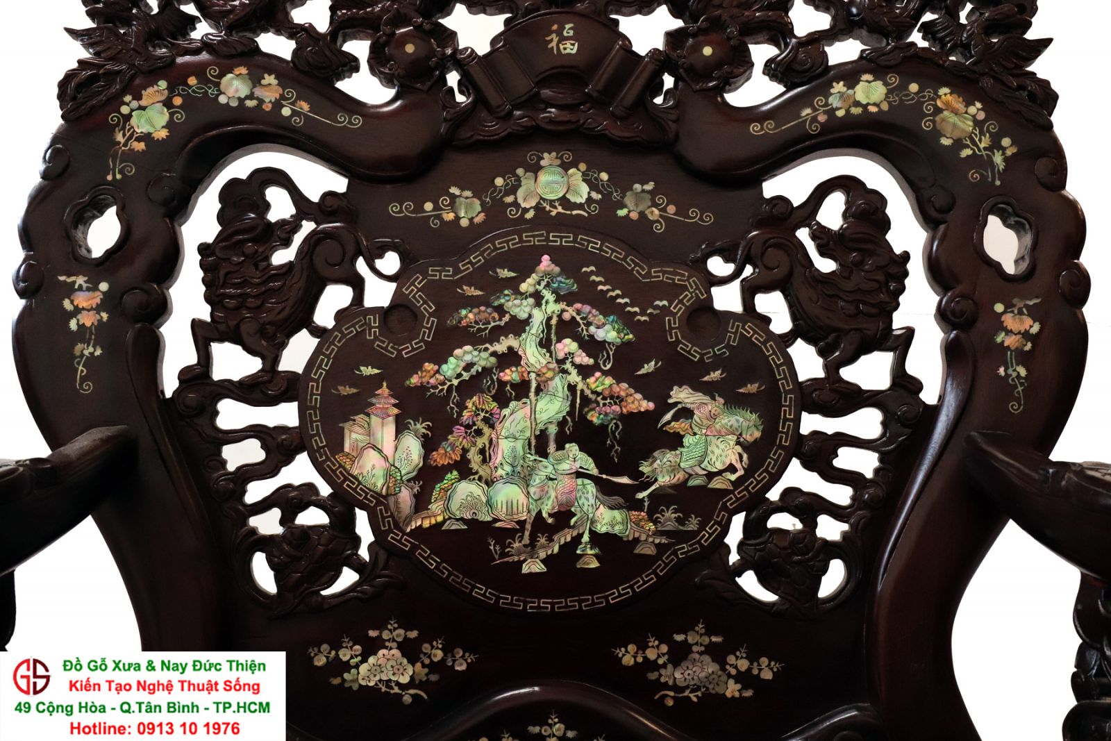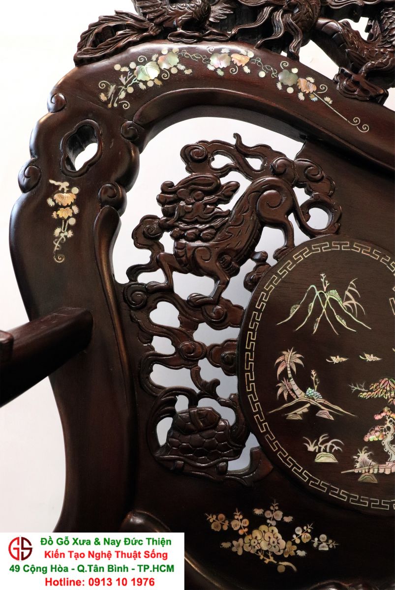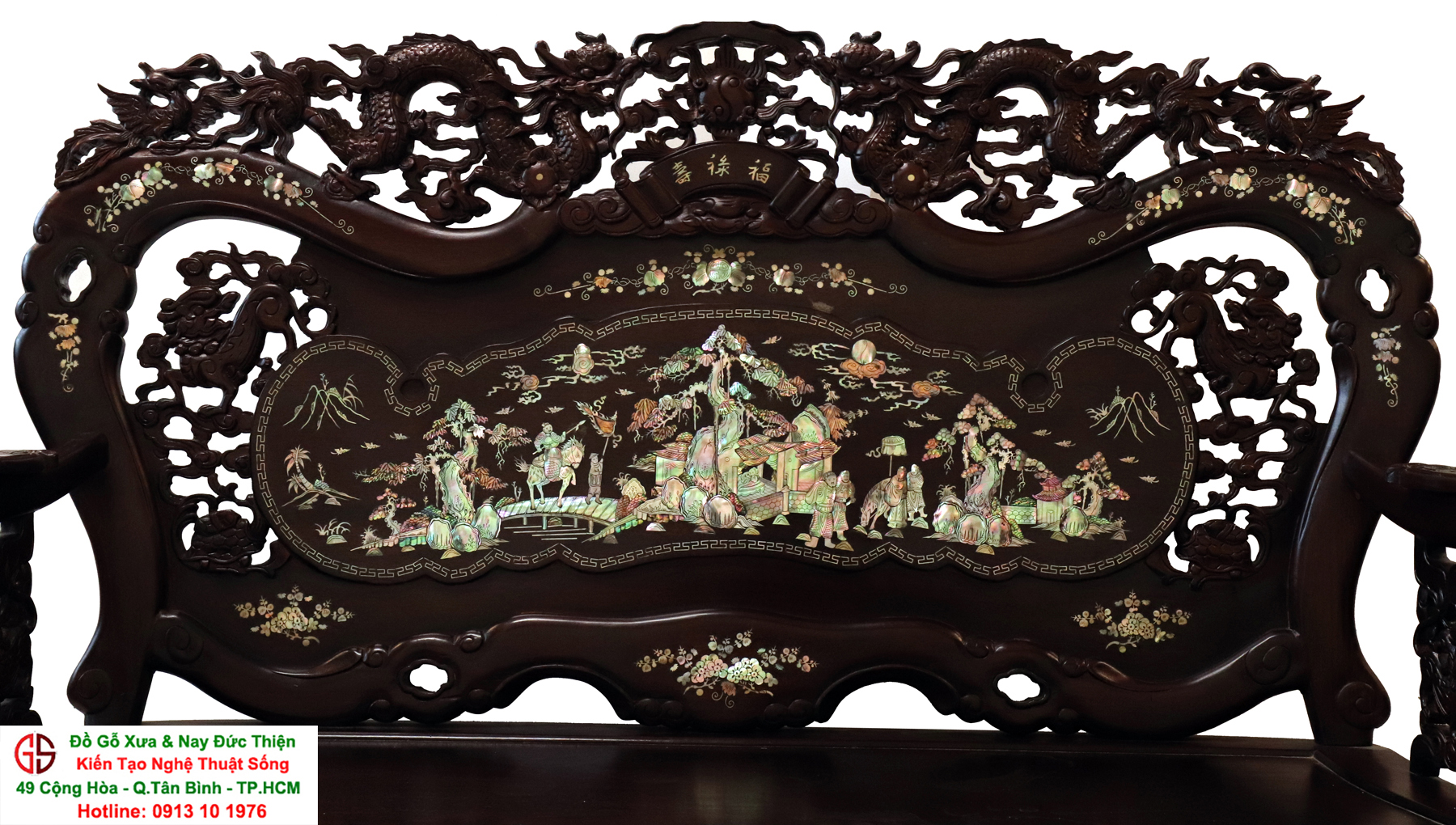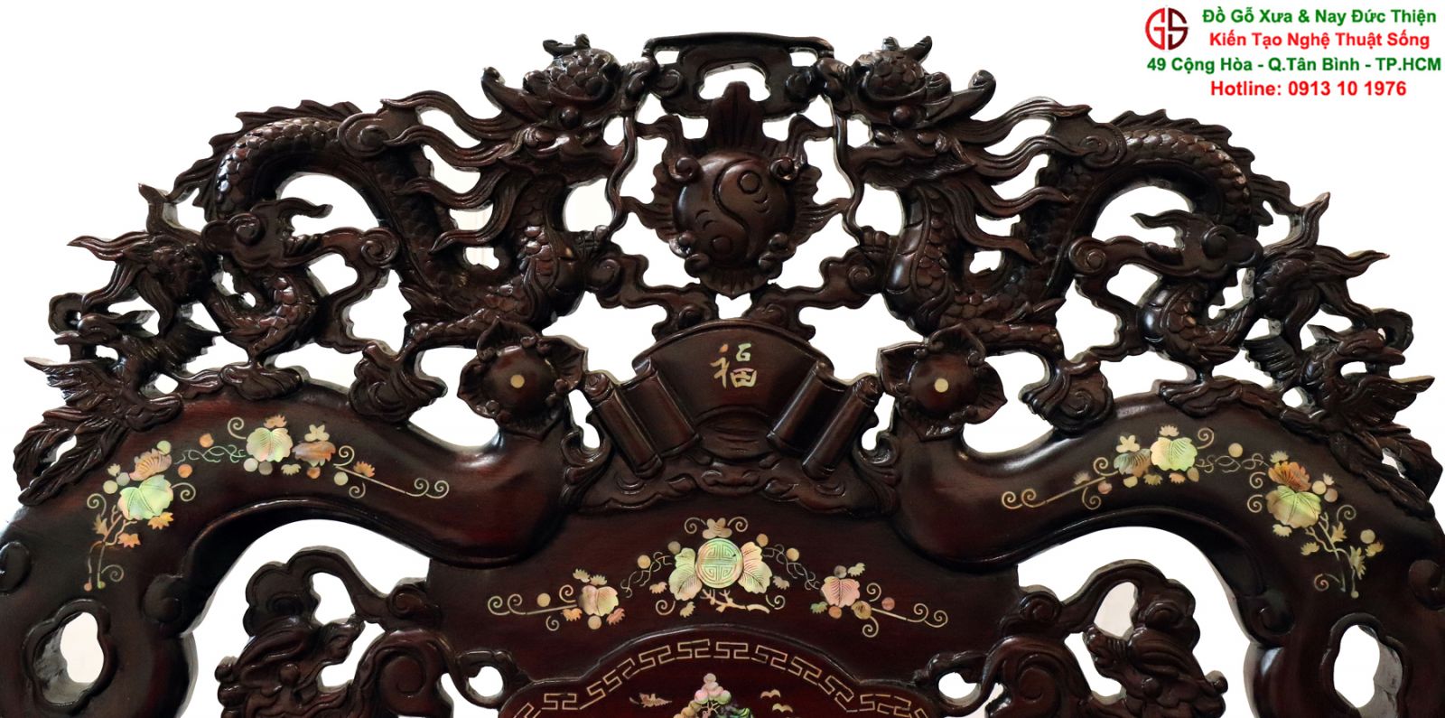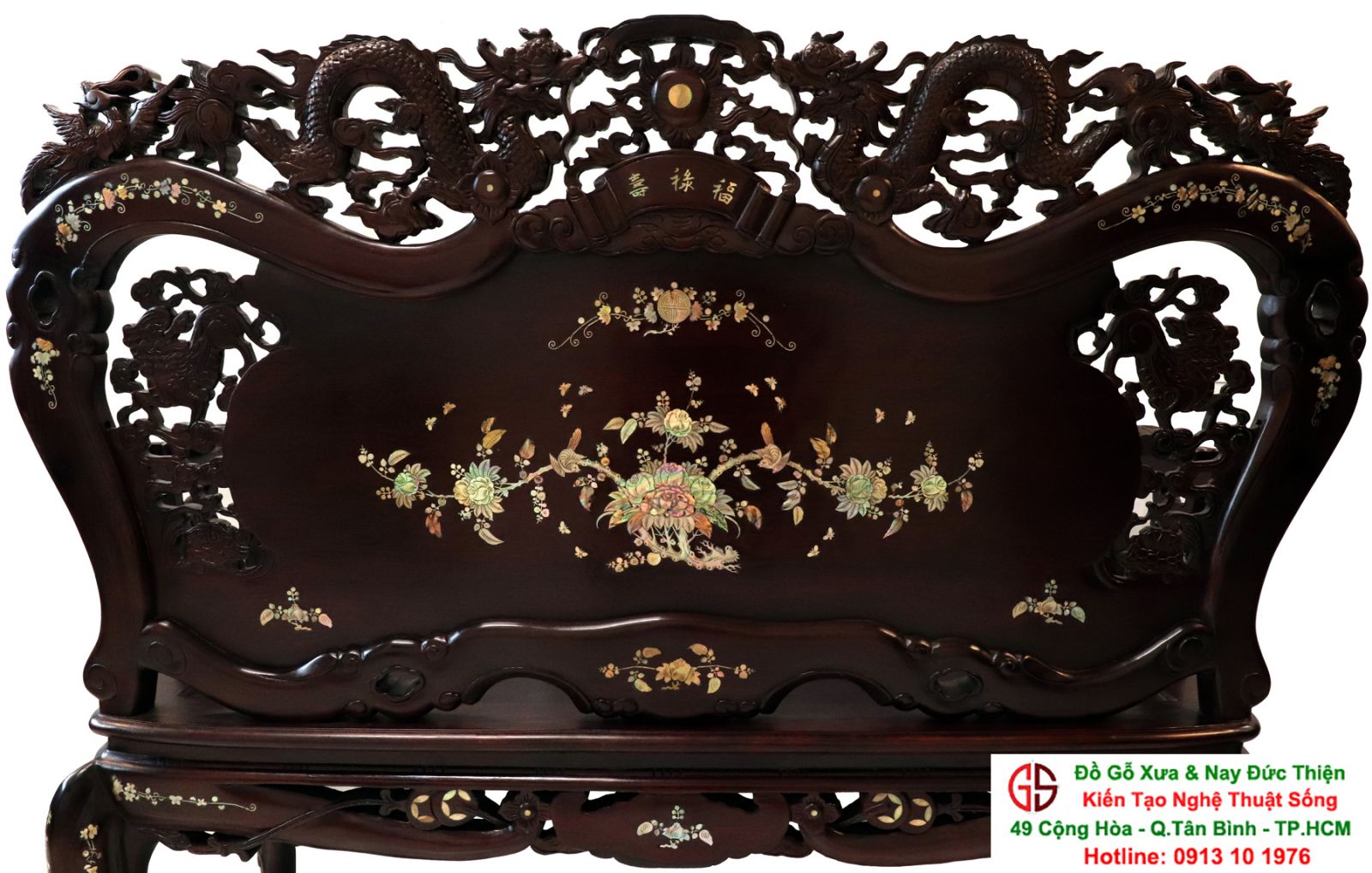 Bộ ghế gồm 9 món với hình tượng chủ đạo là rồng được chạm khảm cầu kỳ, tinh tế, qua bàn tay của người nghệ nhân tài hoa xứ Huế, gỗ đã được thổi hồn vào đó. Hàng trăm năm sau, nó trở thành những tuyệt tác để đời mà ai đó được hữu duyên sở hữu có quyền tự hào với đời sau.