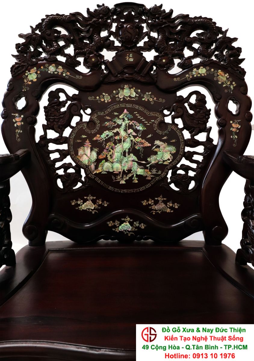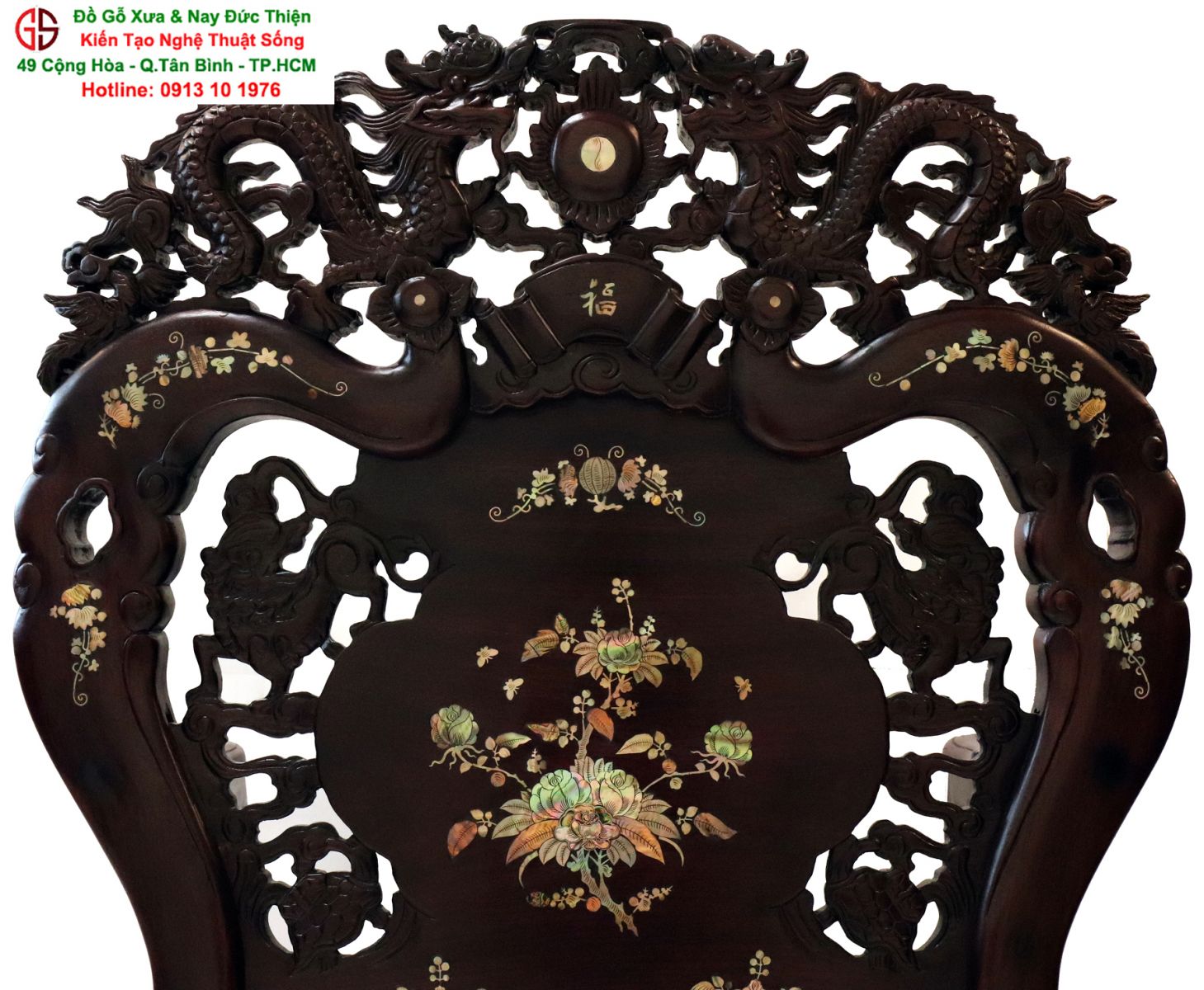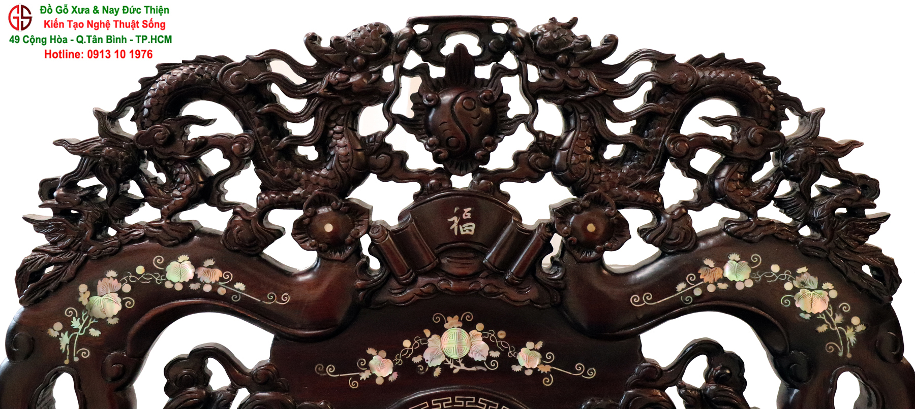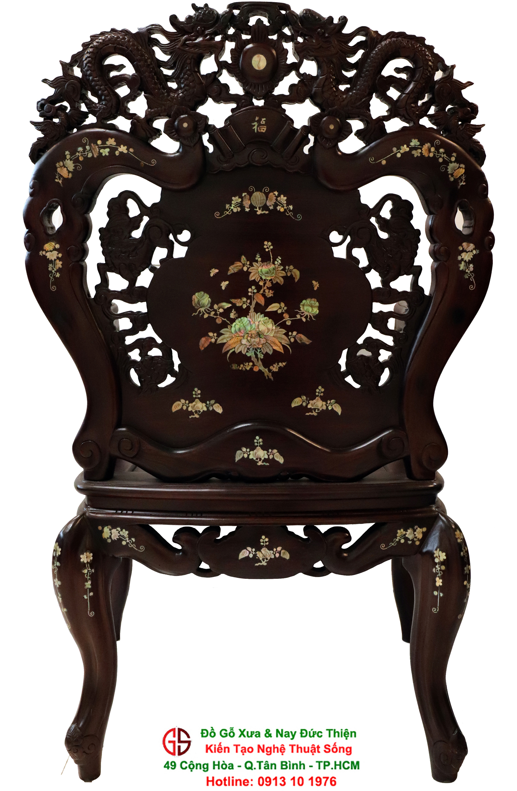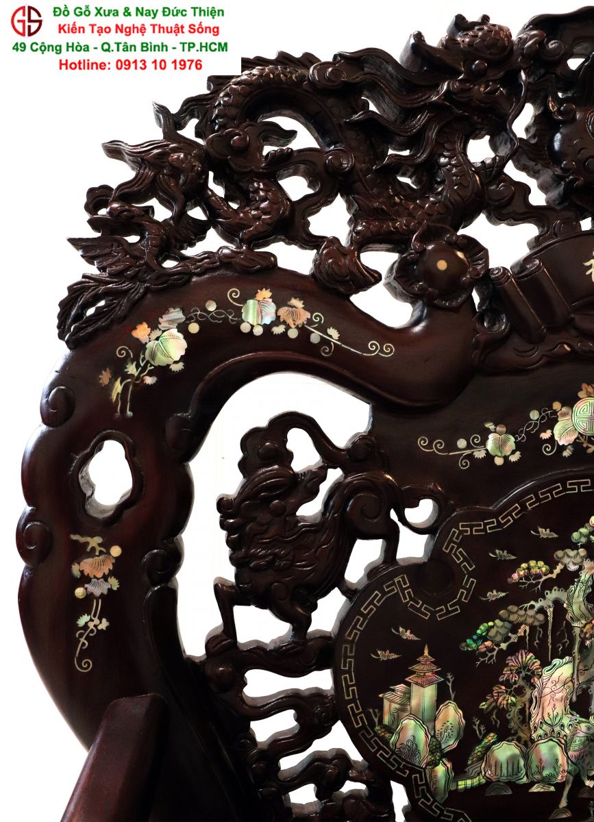 Bộ ghế gồm 9 món với hình tượng chủ đạo là rồng được chạm khảm cầu kỳ, tinh tế, qua bàn tay của người nghệ nhân tài hoa xứ Huế, gỗ đã được thổi hồn vào đó. Hàng trăm năm sau, nó trở thành những tuyệt tác để đời mà ai đó được hữu duyên sở hữu có quyền tự hào với đời sau.