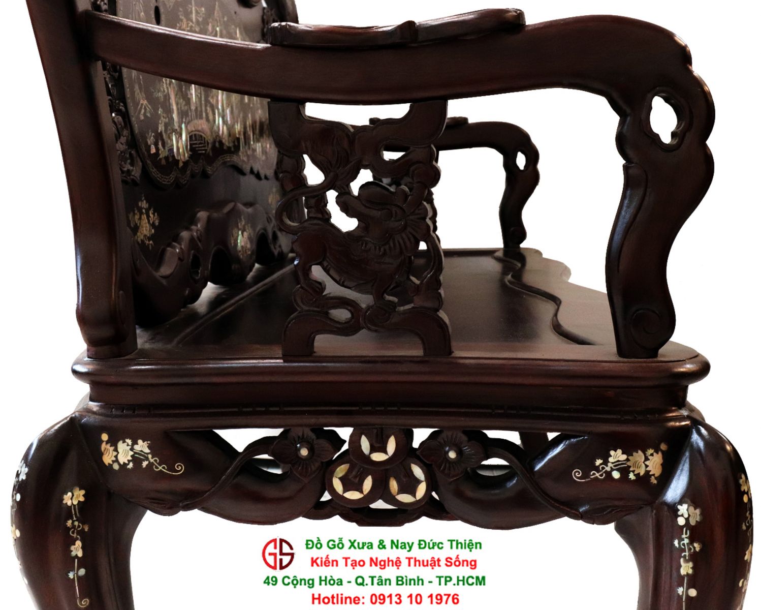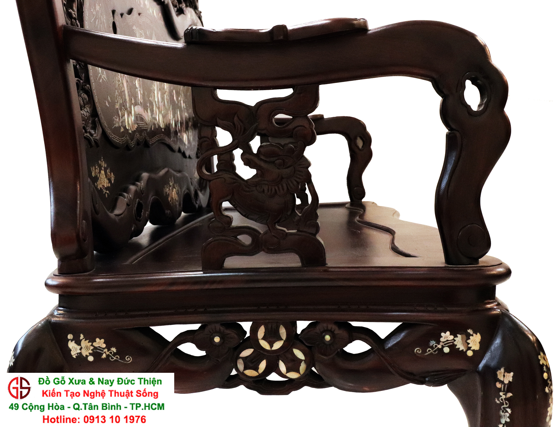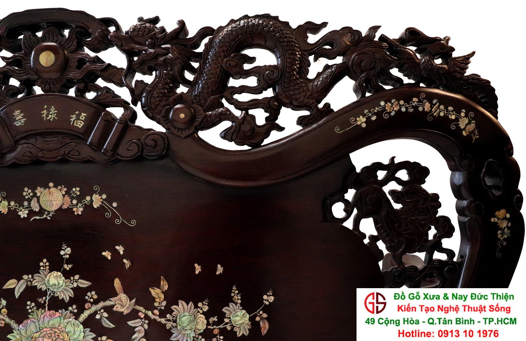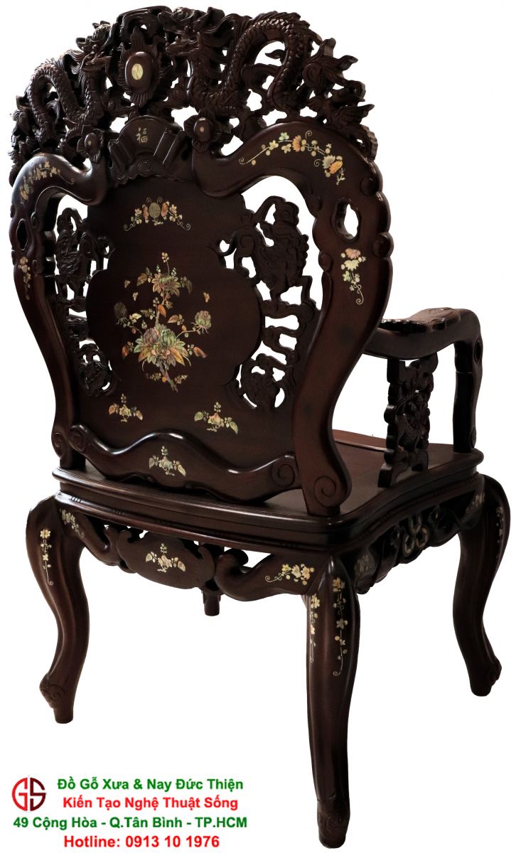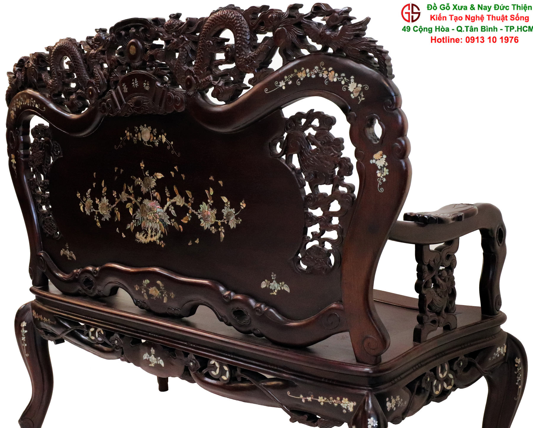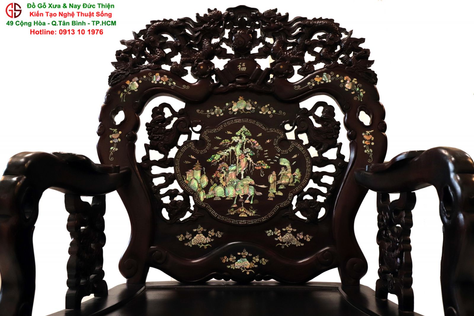 Bộ ghế gồm 9 món với hình tượng chủ đạo là rồng được chạm khảm cầu kỳ, tinh tế, qua bàn tay của người nghệ nhân tài hoa xứ Huế, gỗ đã được thổi hồn vào đó. Hàng trăm năm sau, nó trở thành những tuyệt tác để đời mà ai đó được hữu duyên sở hữu có quyền tự hào với đời sau.