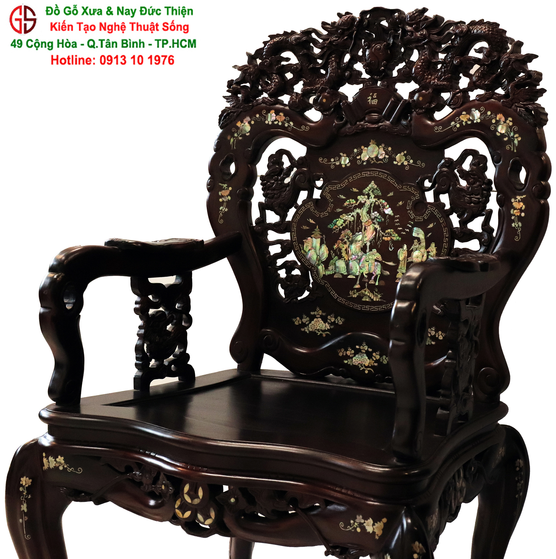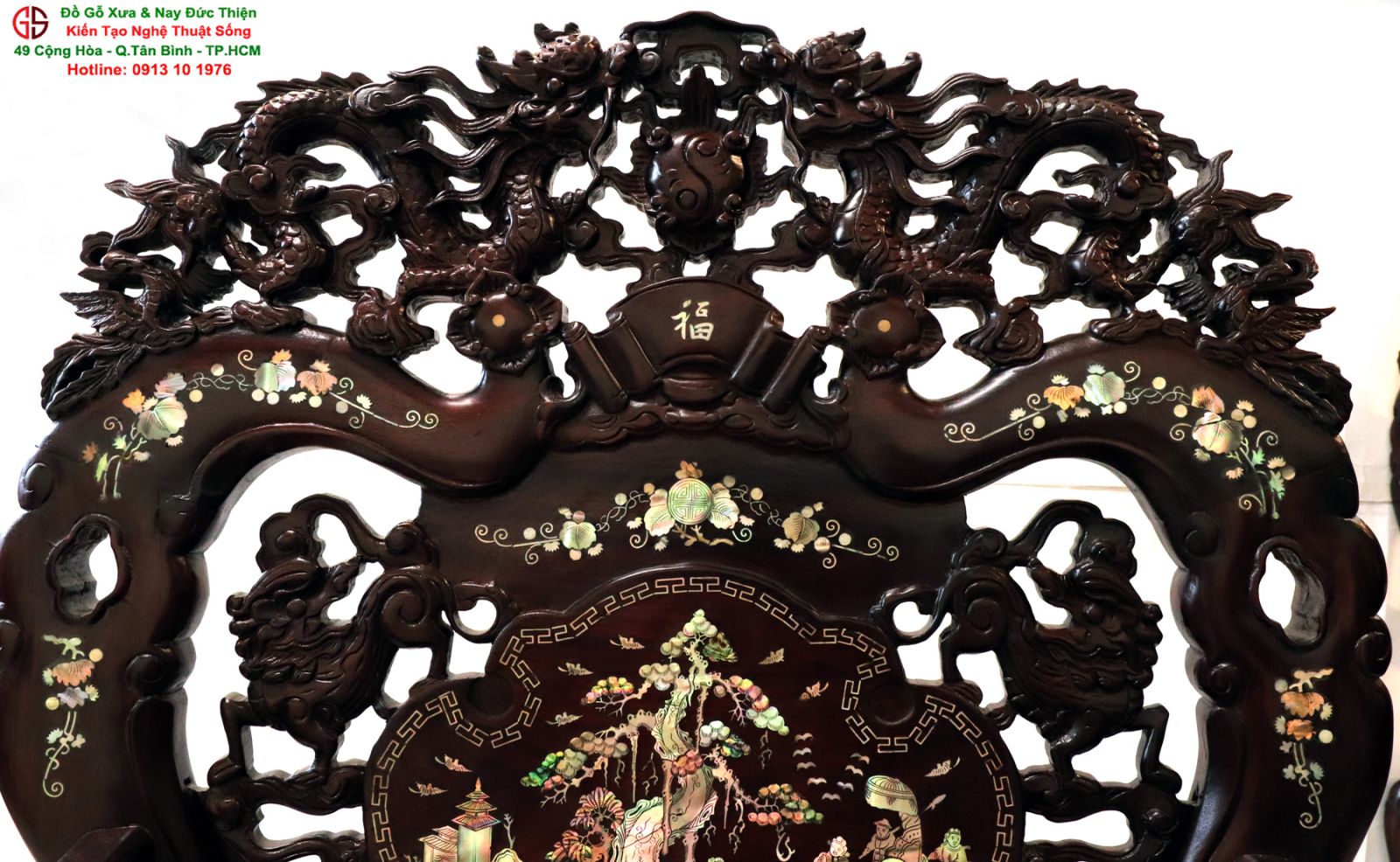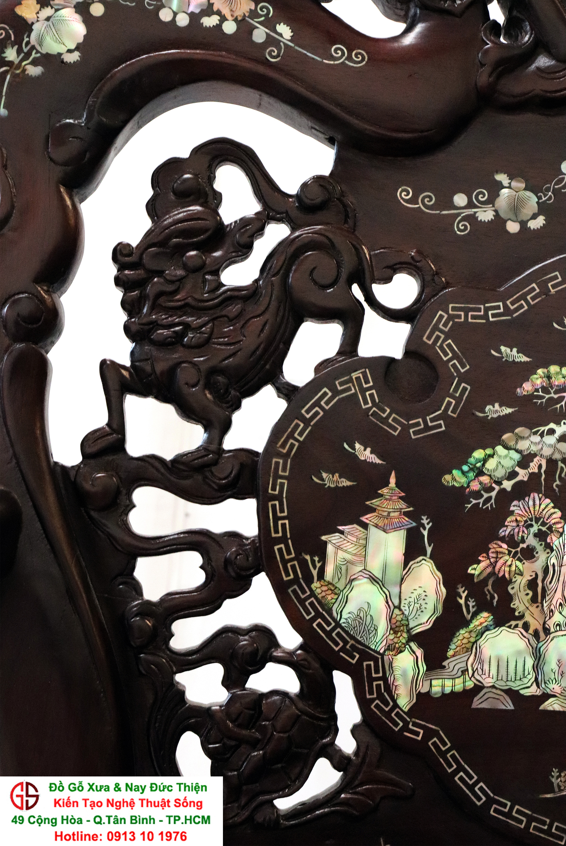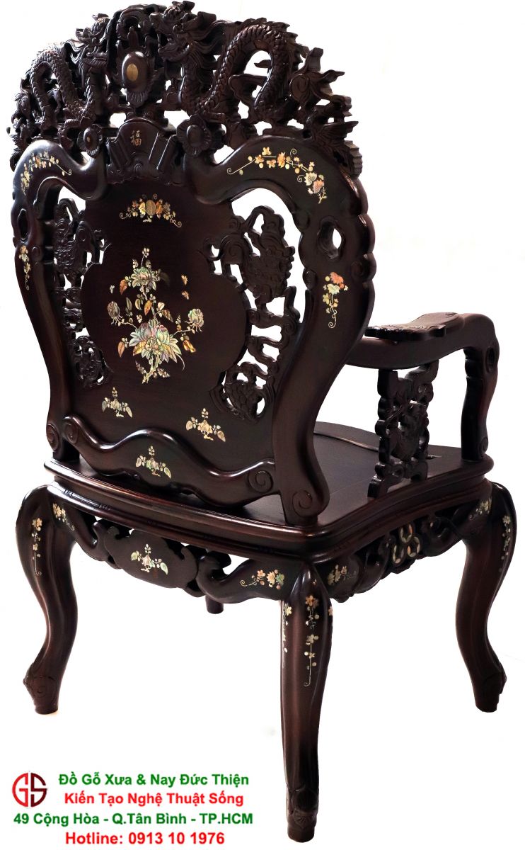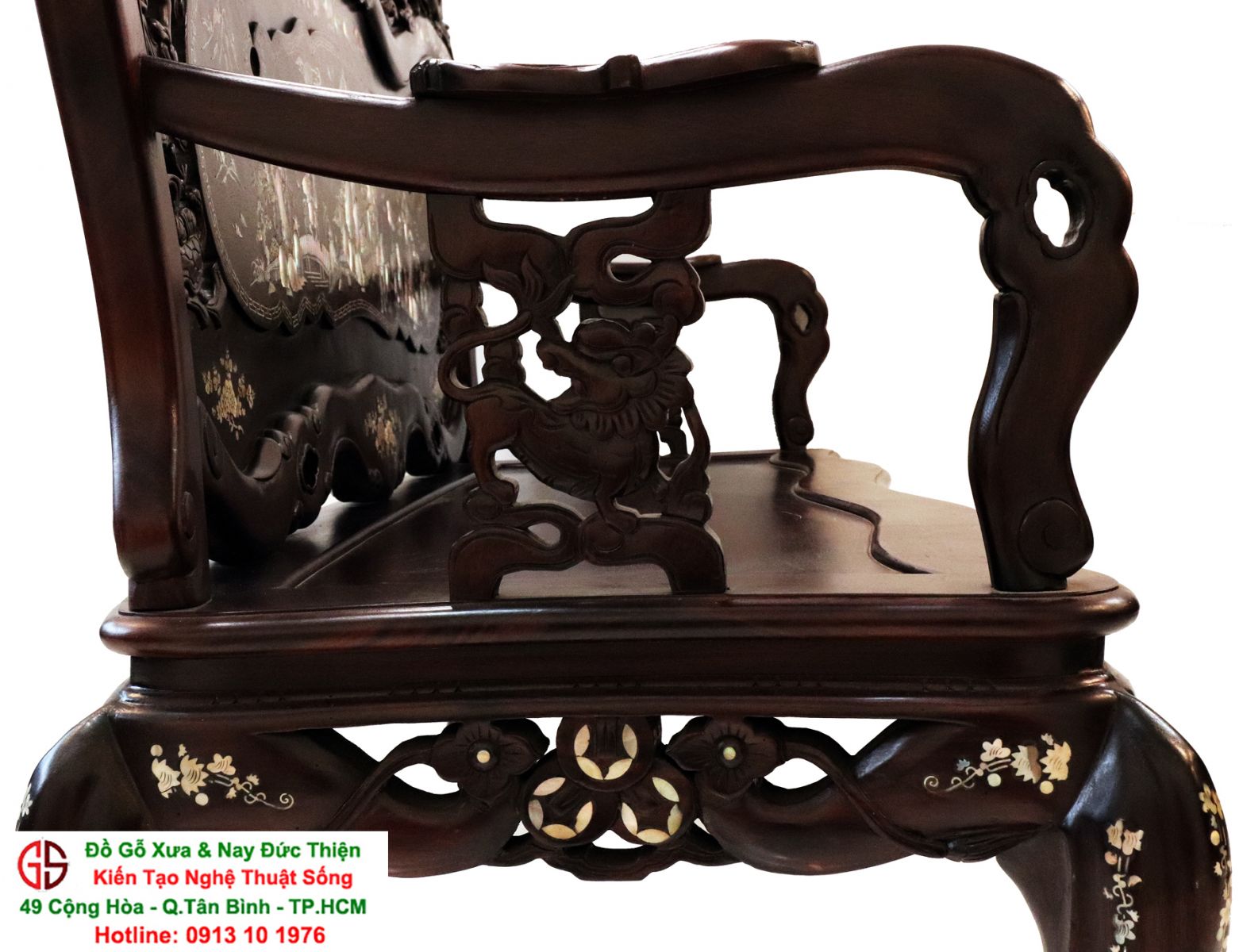 Bộ ghế gồm 9 món với hình tượng chủ đạo là rồng được chạm khảm cầu kỳ, tinh tế, qua bàn tay của người nghệ nhân tài hoa xứ Huế, gỗ đã được thổi hồn vào đó. Hàng trăm năm sau, nó trở thành những tuyệt tác để đời mà ai đó được hữu duyên sở hữu có quyền tự hào với đời sau.