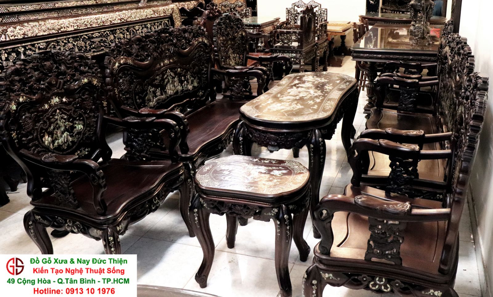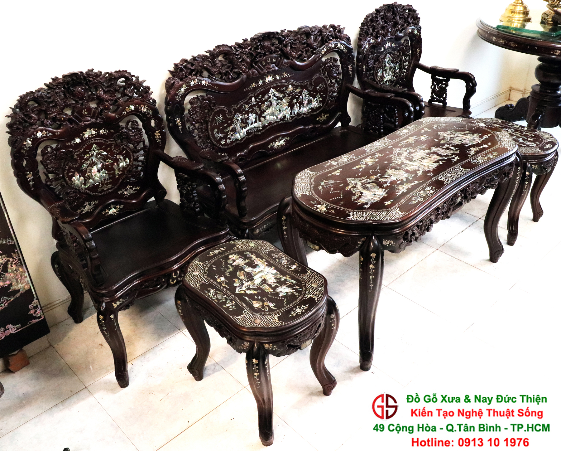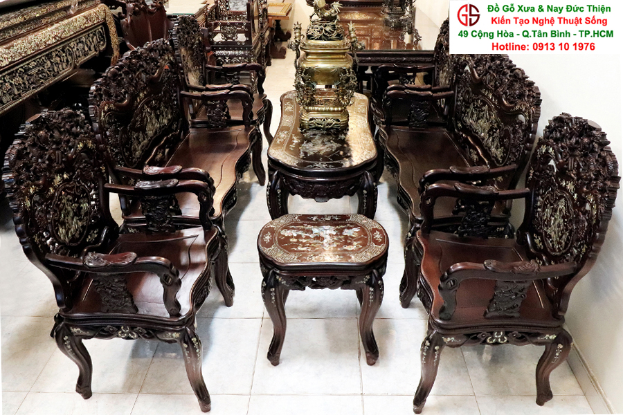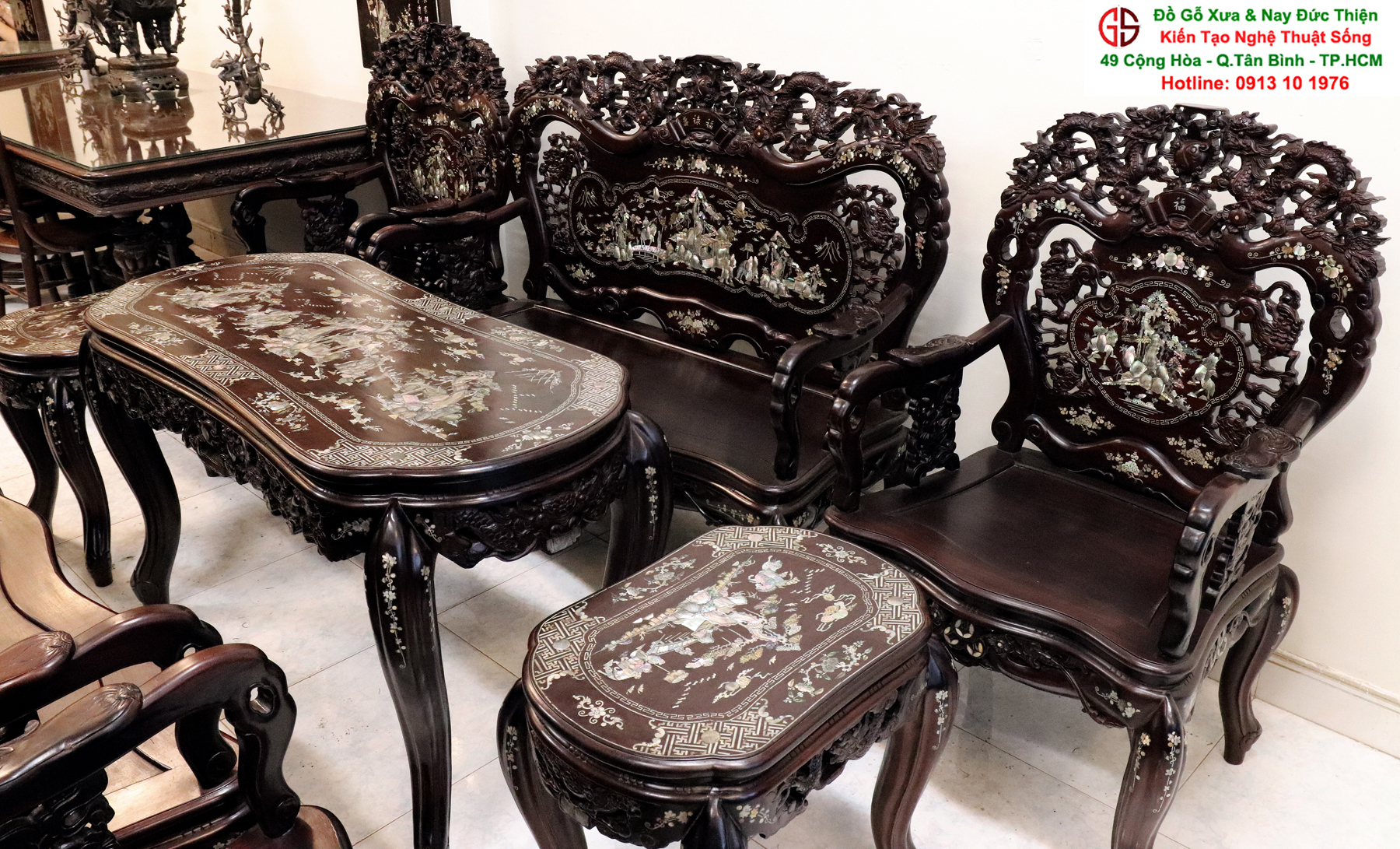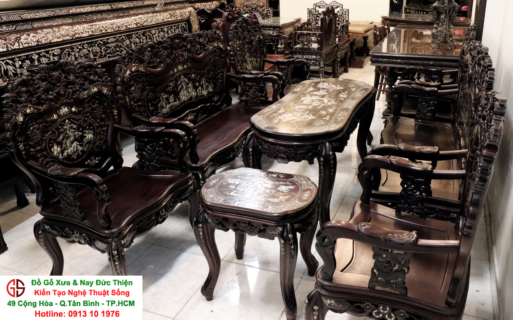 - Bàn ghế Louis, đôn trống gỗ trắc, bộ bàn ăn cẩn ốc, bàn ghế phương kỷ, bàn trung đường cẩn ốc xà cừ