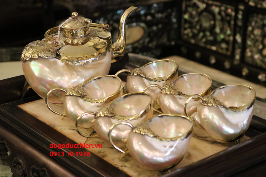 Bộ ấm chén trà được làm từ ốc sà cừ tự nhiên, dưới bàn tay trau chuốt của những người nghệ nhân tài hoa, nó trở thành một sản phẩm vô cùng độc đáo.