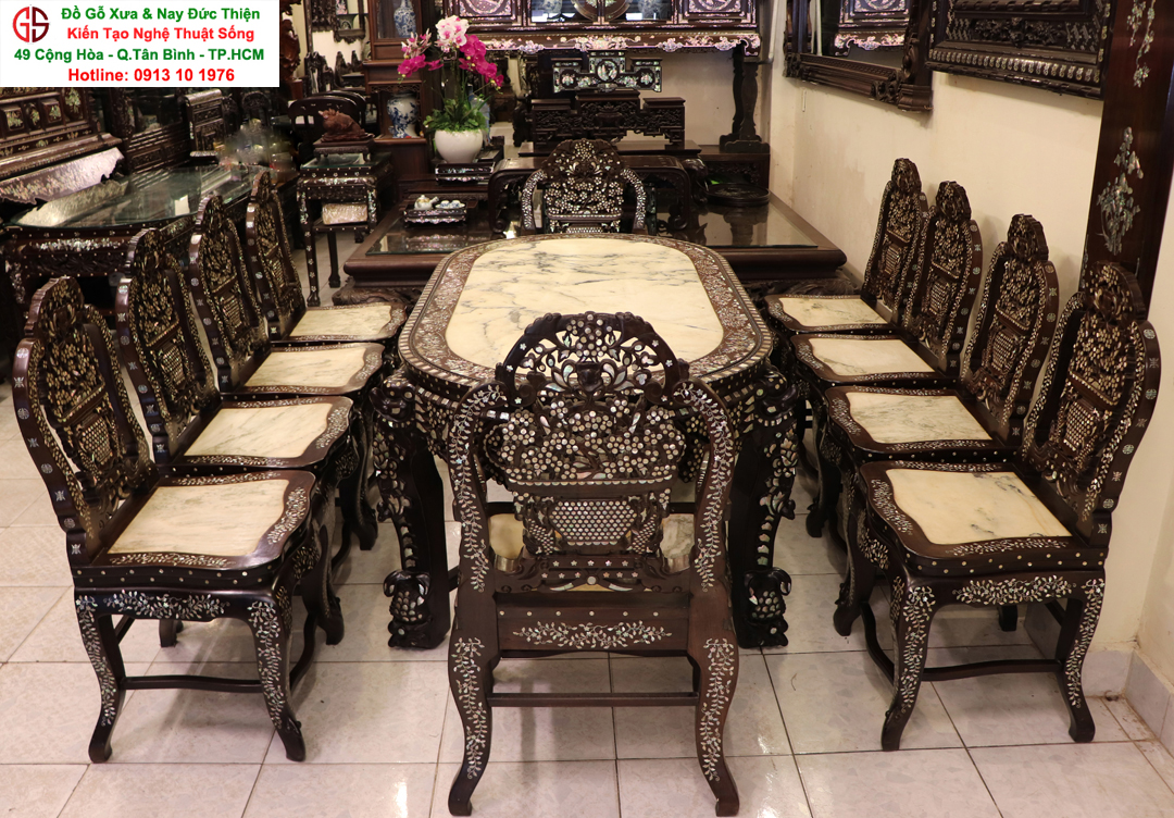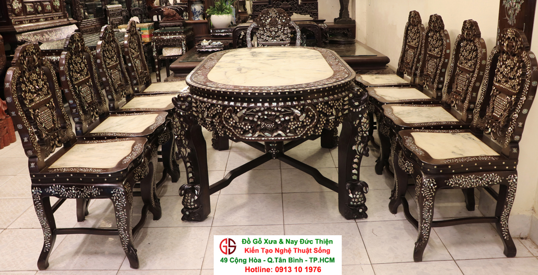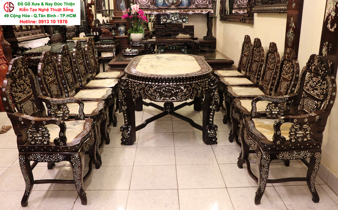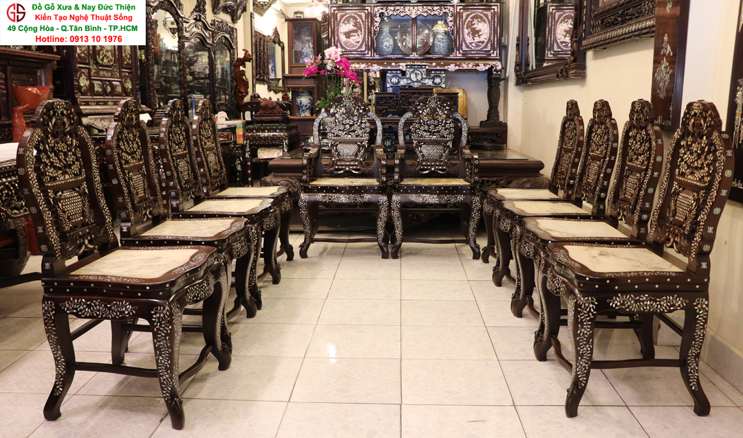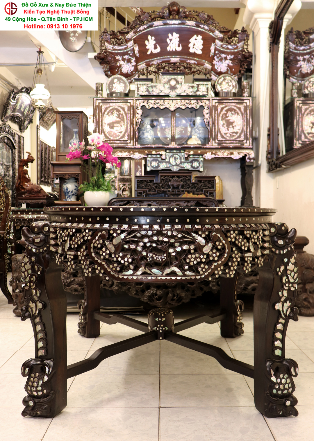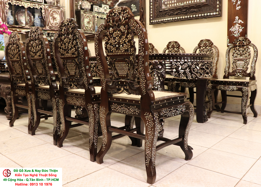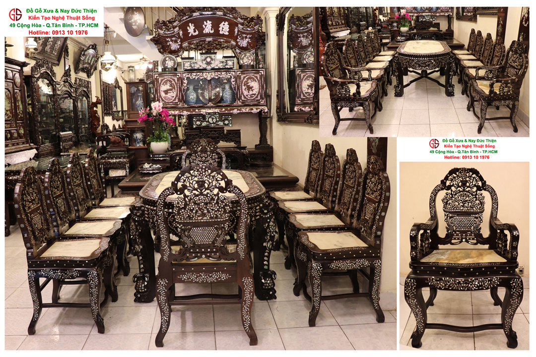 - Bàn ghế Louis, đôn trống gỗ trắc, bộ bàn ăn cẩn ốc, bàn ghế phương kỷ, bàn trung đường cẩn ốc xà cừ