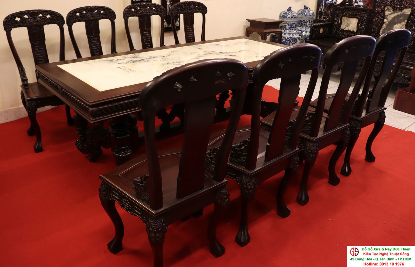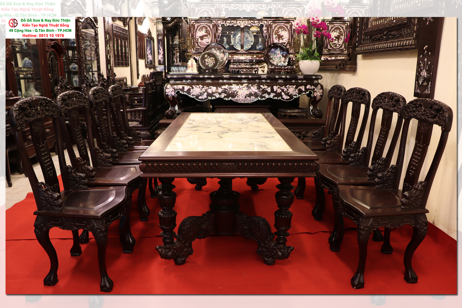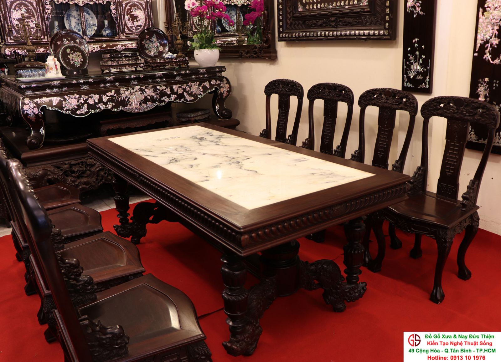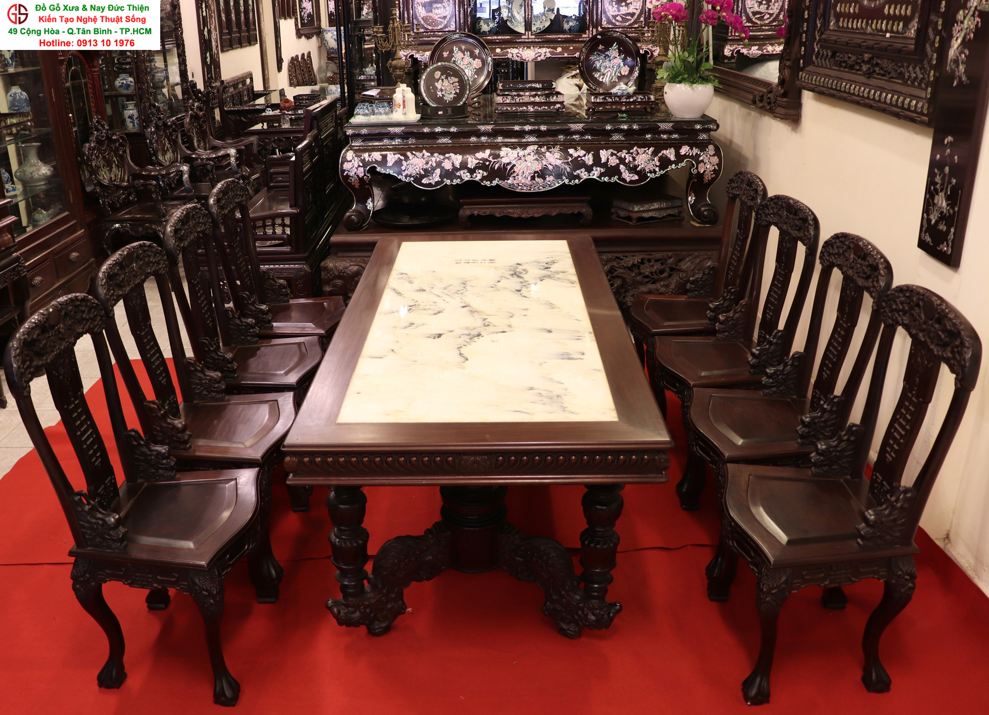 Đồ gỗ xưa và nay Đức Thiện xin trân trọng giới thiệu bộ bàn ghế ăn mặt đá Tàu 9 món : 8 ghế khách + 1 bàn lớn. Tất cả đều được làm bằng gỗ gụ mật 100 %, cầu kỳ, tỉ mỉ trong từng đường nét đem lại vẻ đẹp sang trọng cho phòng ăn, thể hiện được tầm vóc, đẳng cấp quý tộc, giàu có của gia chủ.