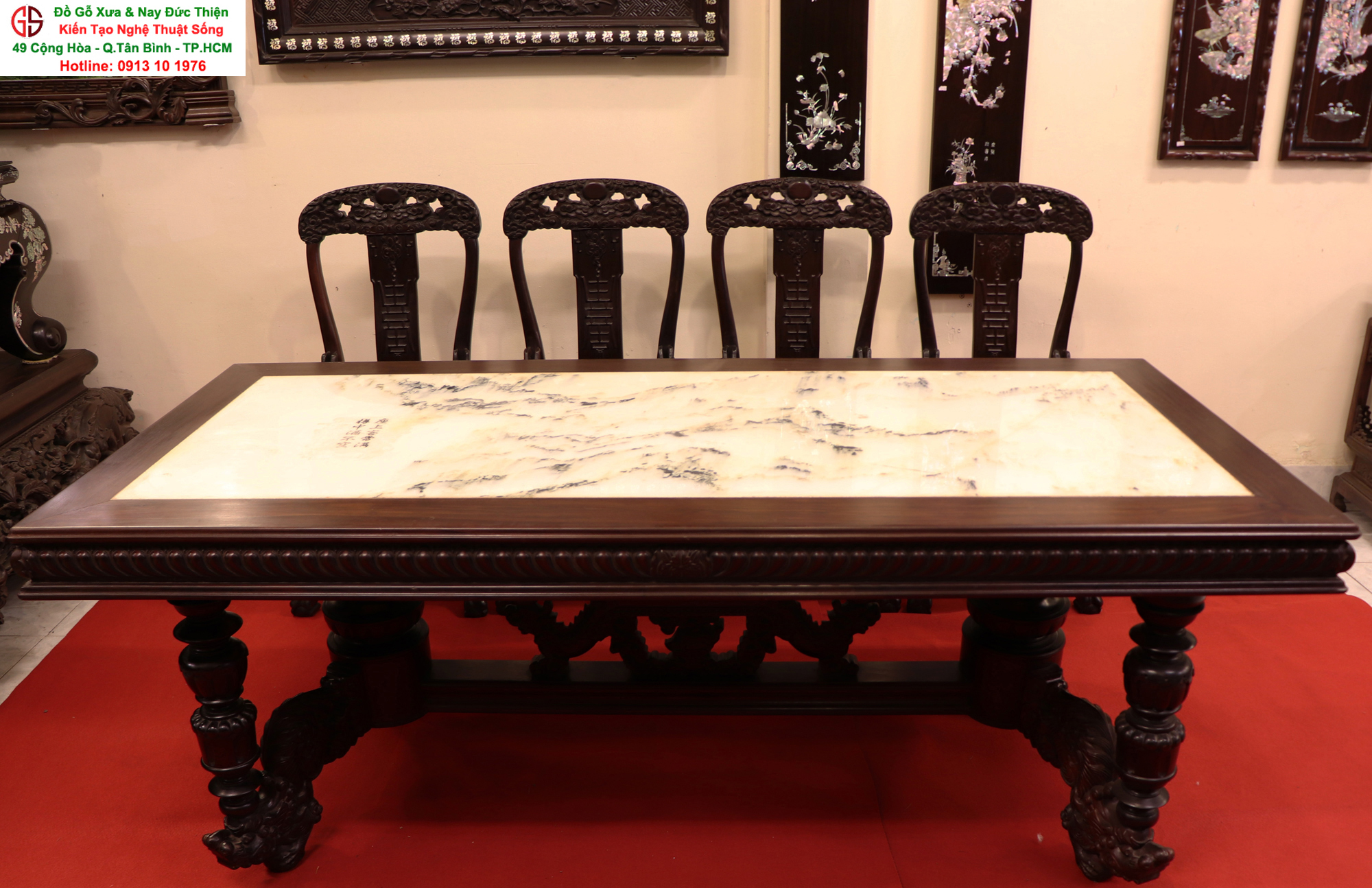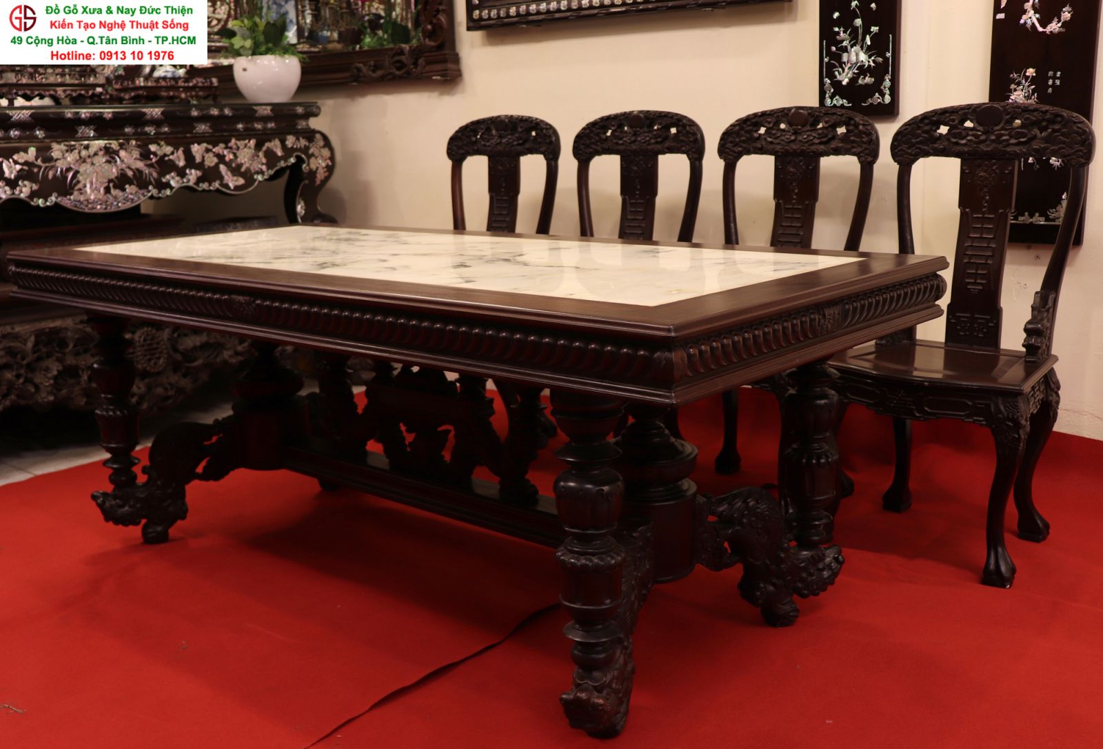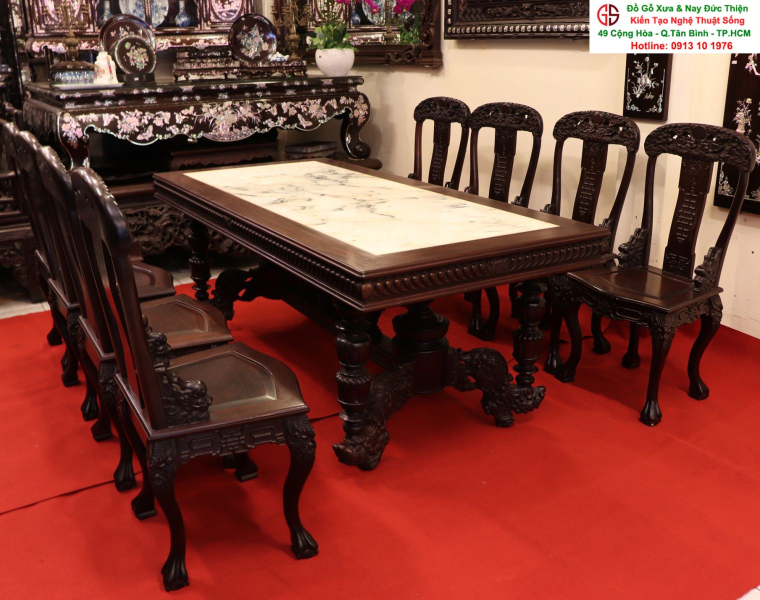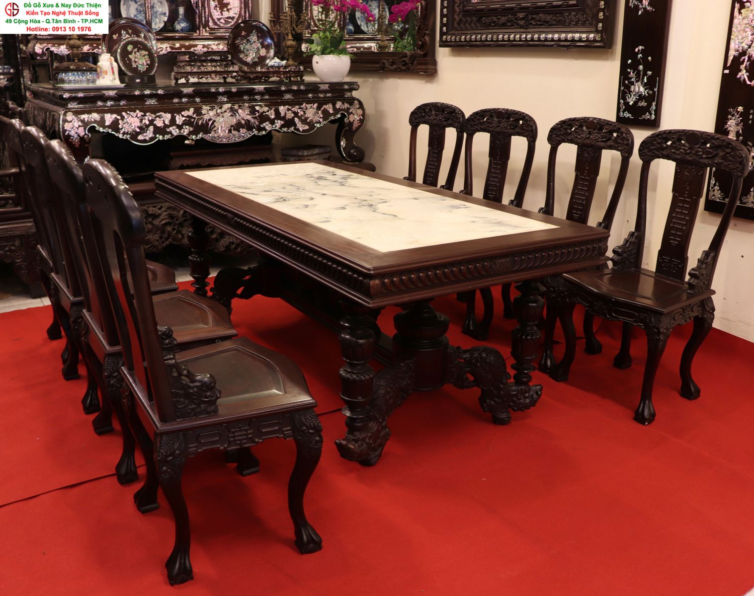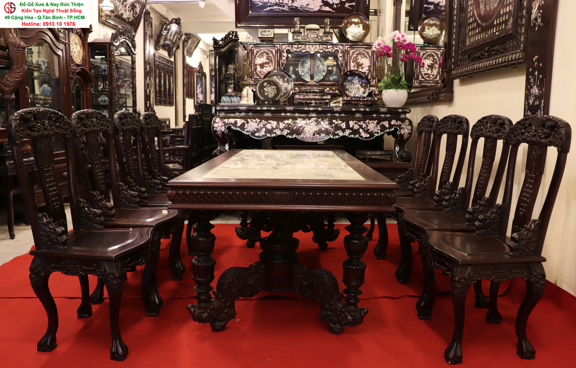 Đồ gỗ xưa và nay Đức Thiện xin trân trọng giới thiệu bộ bàn ghế ăn mặt đá Tàu 9 món : 8 ghế khách + 1 bàn lớn. Tất cả đều được làm bằng gỗ gụ mật 100 %, cầu kỳ, tỉ mỉ trong từng đường nét đem lại vẻ đẹp sang trọng cho phòng ăn, thể hiện được tầm vóc, đẳng cấp quý tộc, giàu có của gia chủ.