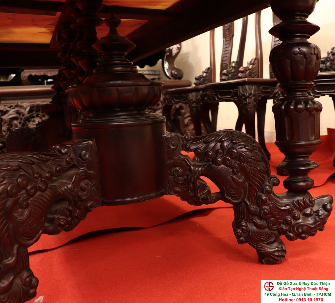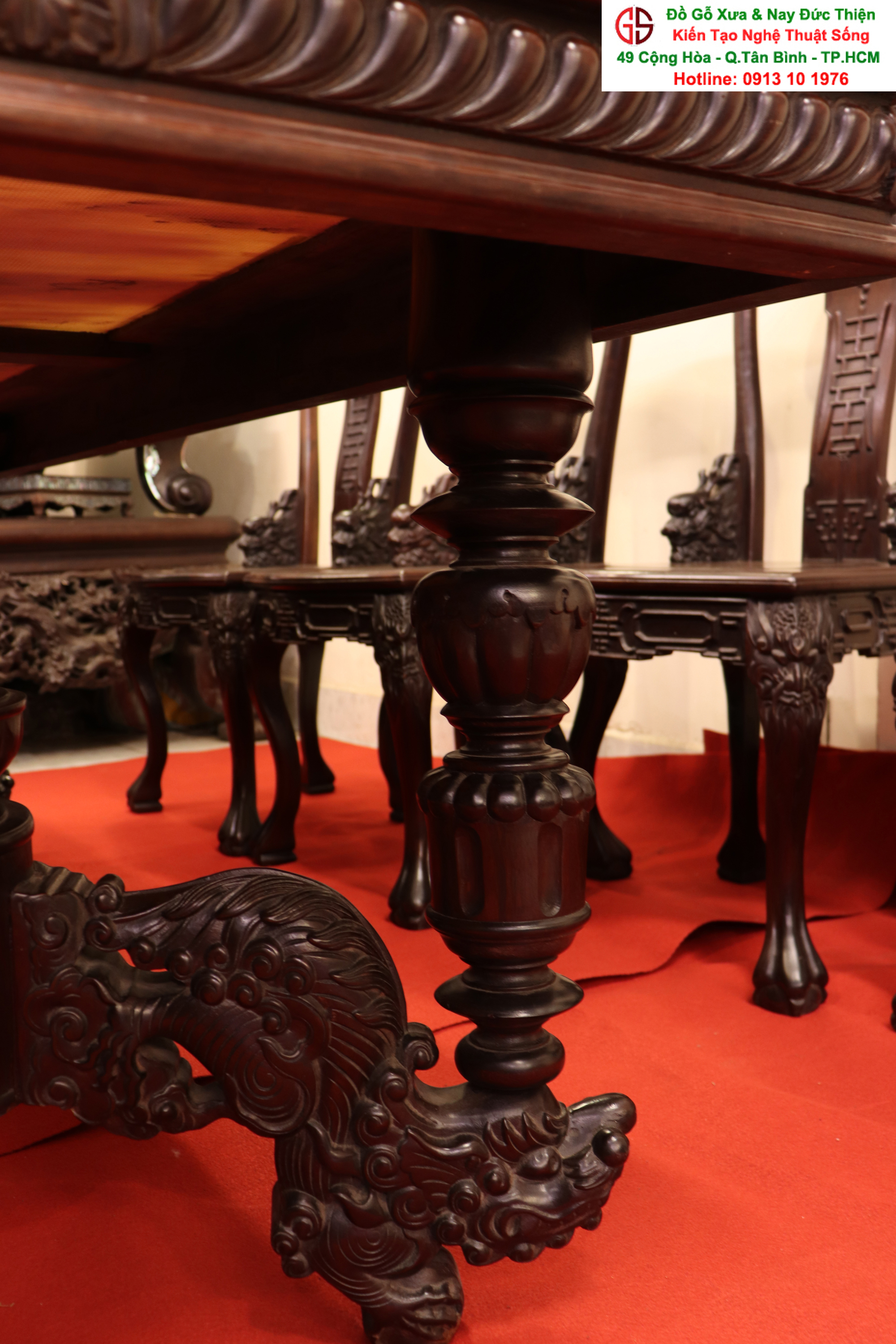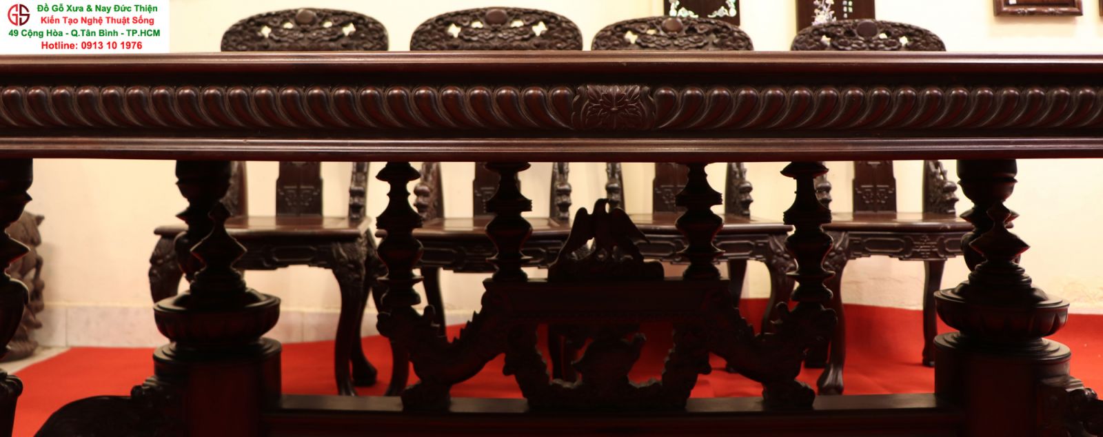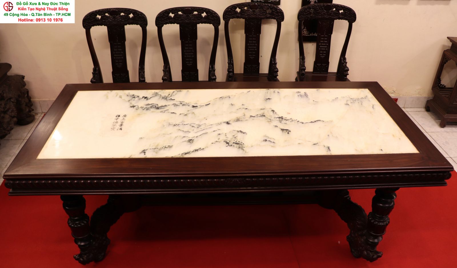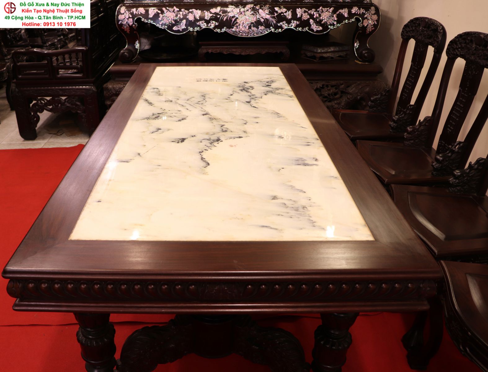 Đồ gỗ xưa và nay Đức Thiện xin trân trọng giới thiệu bộ bàn ghế ăn mặt đá Tàu 9 món : 8 ghế khách + 1 bàn lớn. Tất cả đều được làm bằng gỗ gụ mật 100 %, cầu kỳ, tỉ mỉ trong từng đường nét đem lại vẻ đẹp sang trọng cho phòng ăn, thể hiện được tầm vóc, đẳng cấp quý tộc, giàu có của gia chủ.
