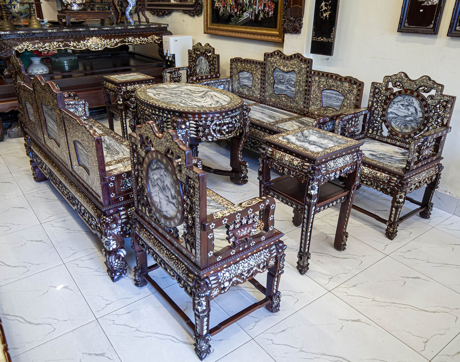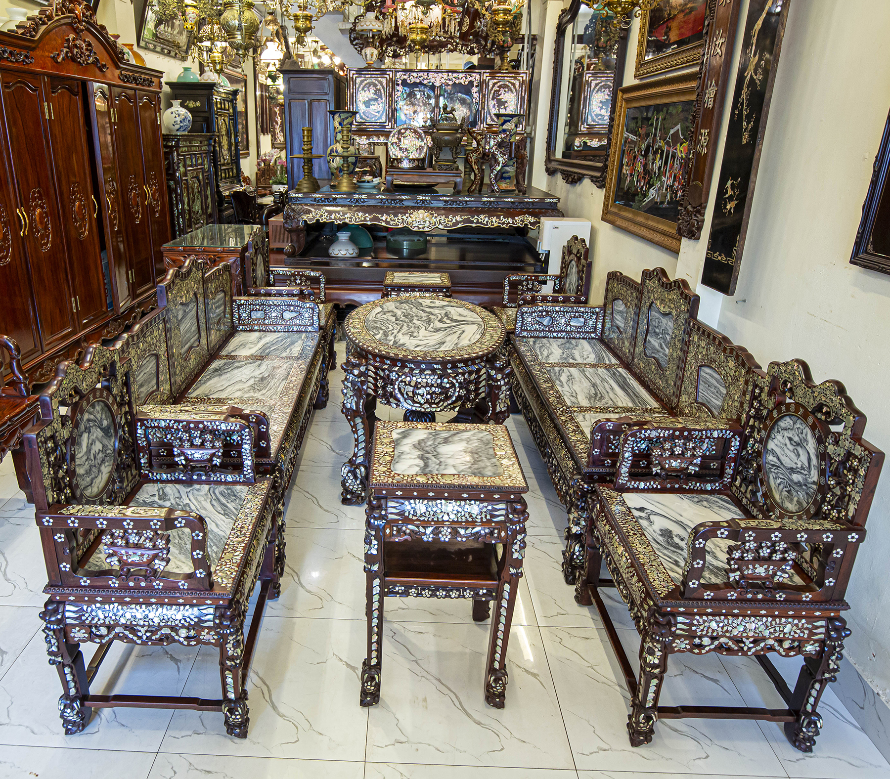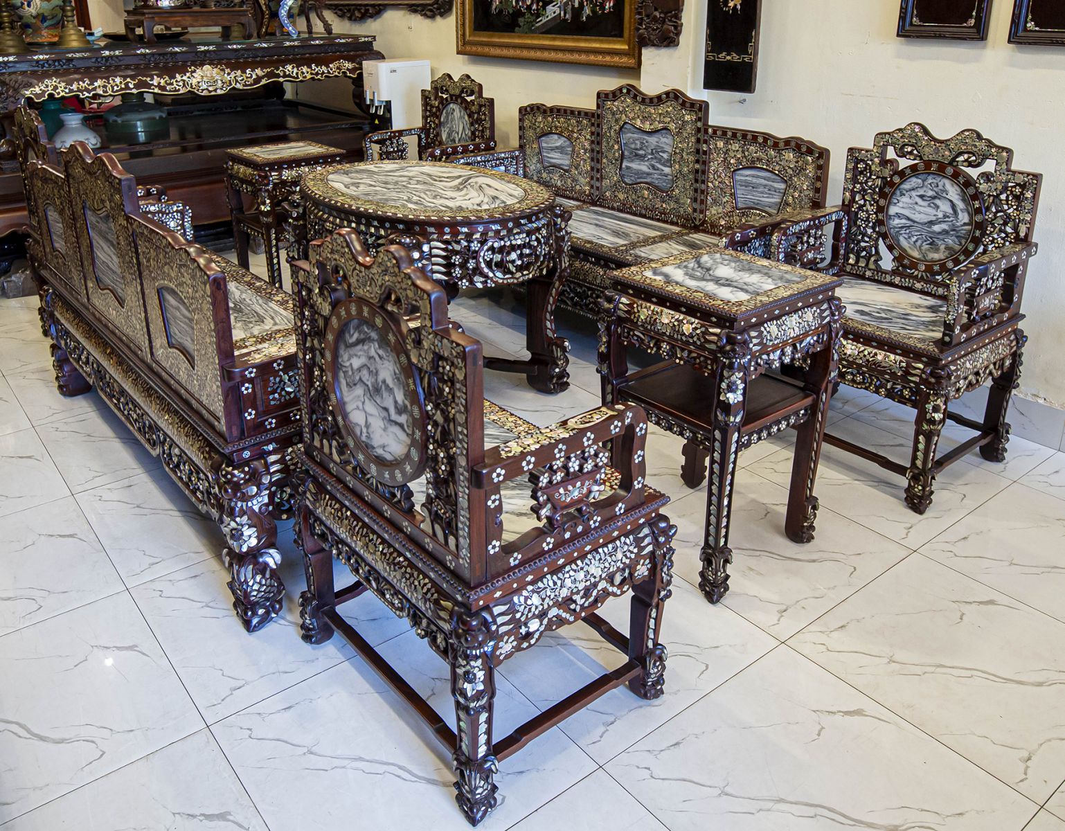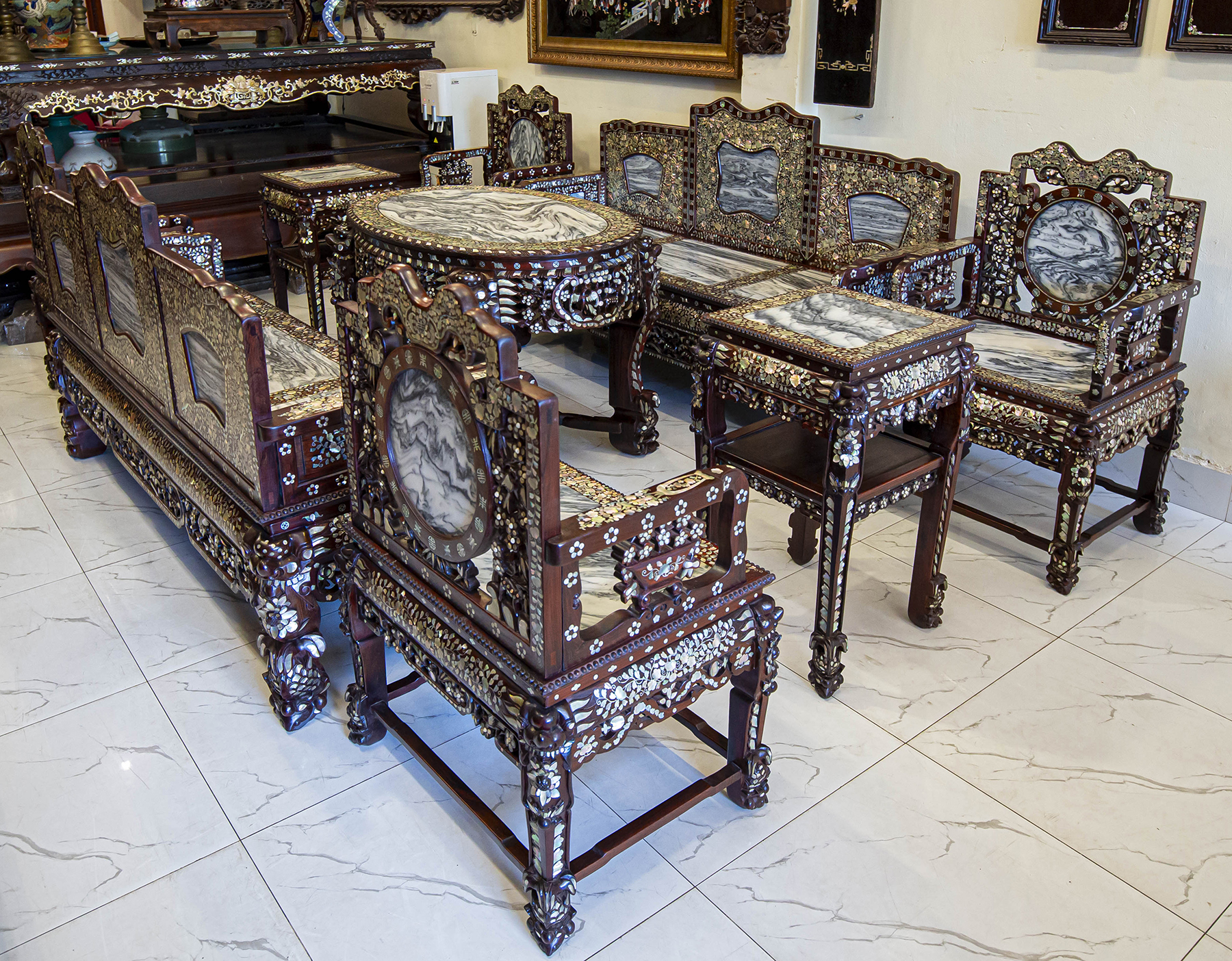 - Bàn ghế Louis, đôn trống gỗ trắc, bộ bàn ăn cẩn ốc, bàn ghế phương kỷ, bàn trung đường cẩn ốc xà cừ