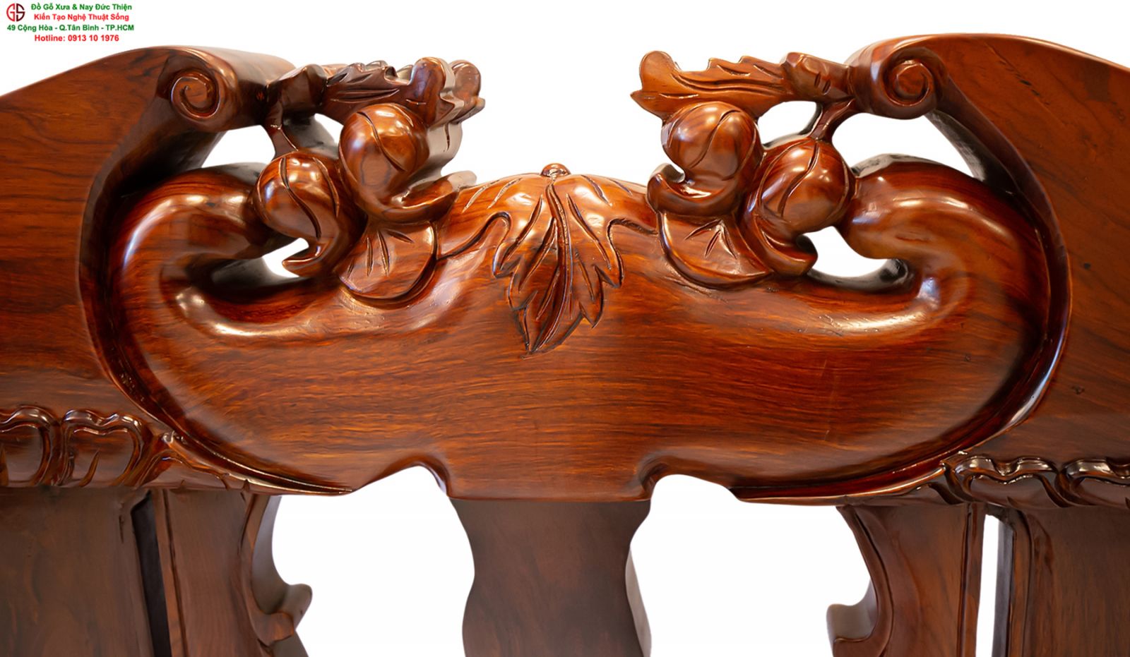 – Mẫu chạm đào được ưa chuộng, đơn giản nhưng tinh tế – Điểm đặc biệt của bộ bàn ghế này là những khối gỗ được tuyển chọn vân gỗ, lọc giác