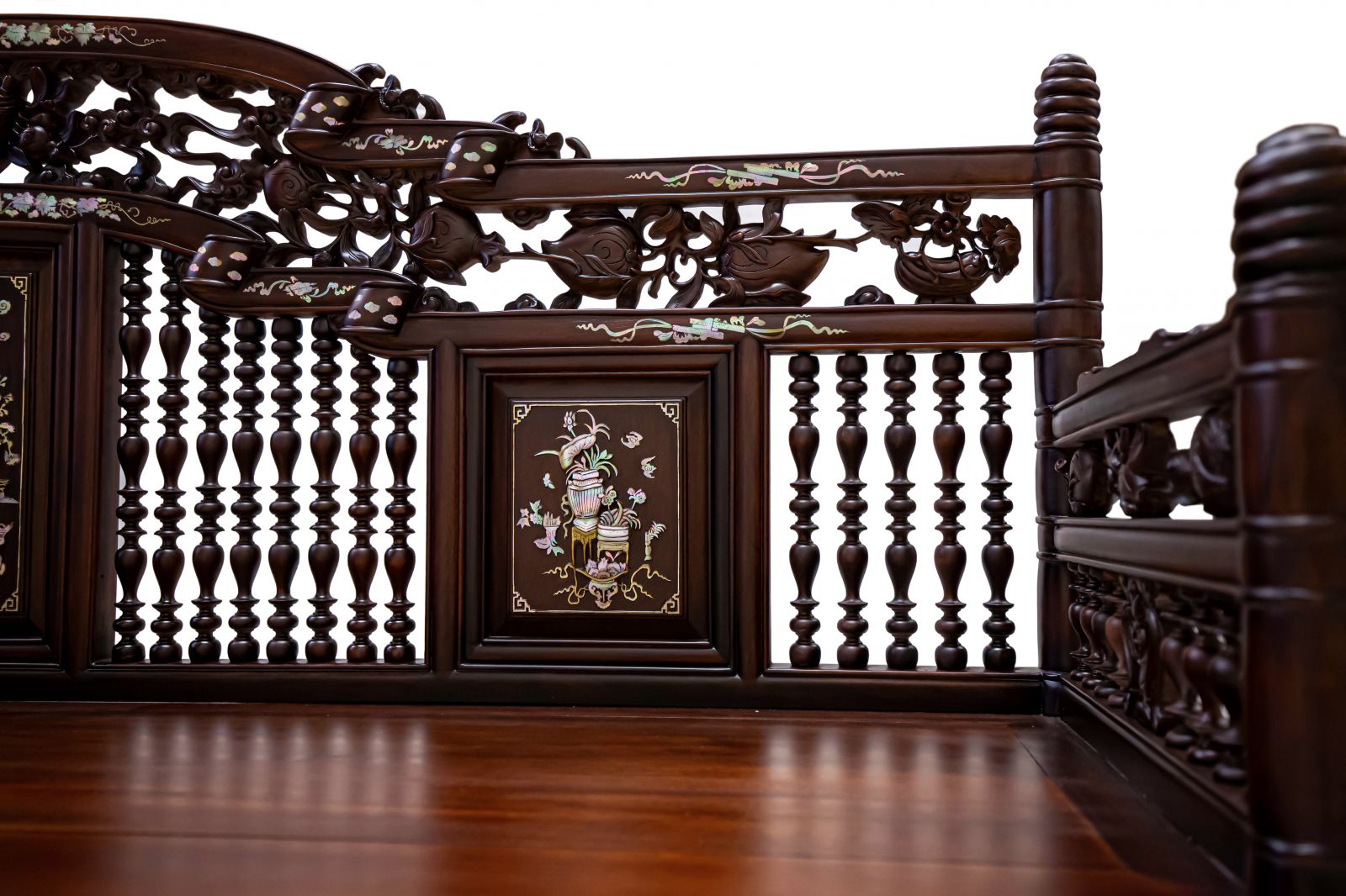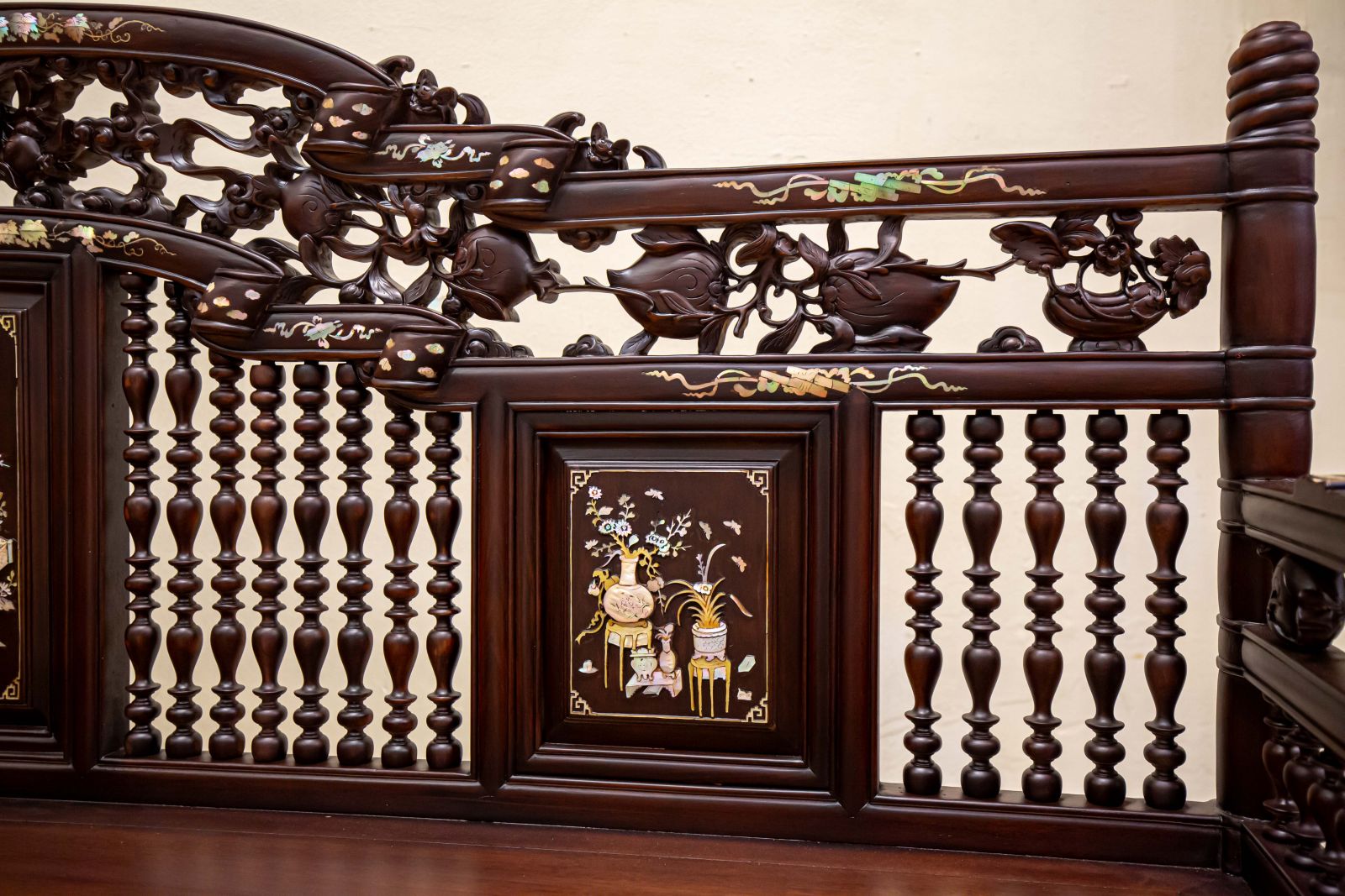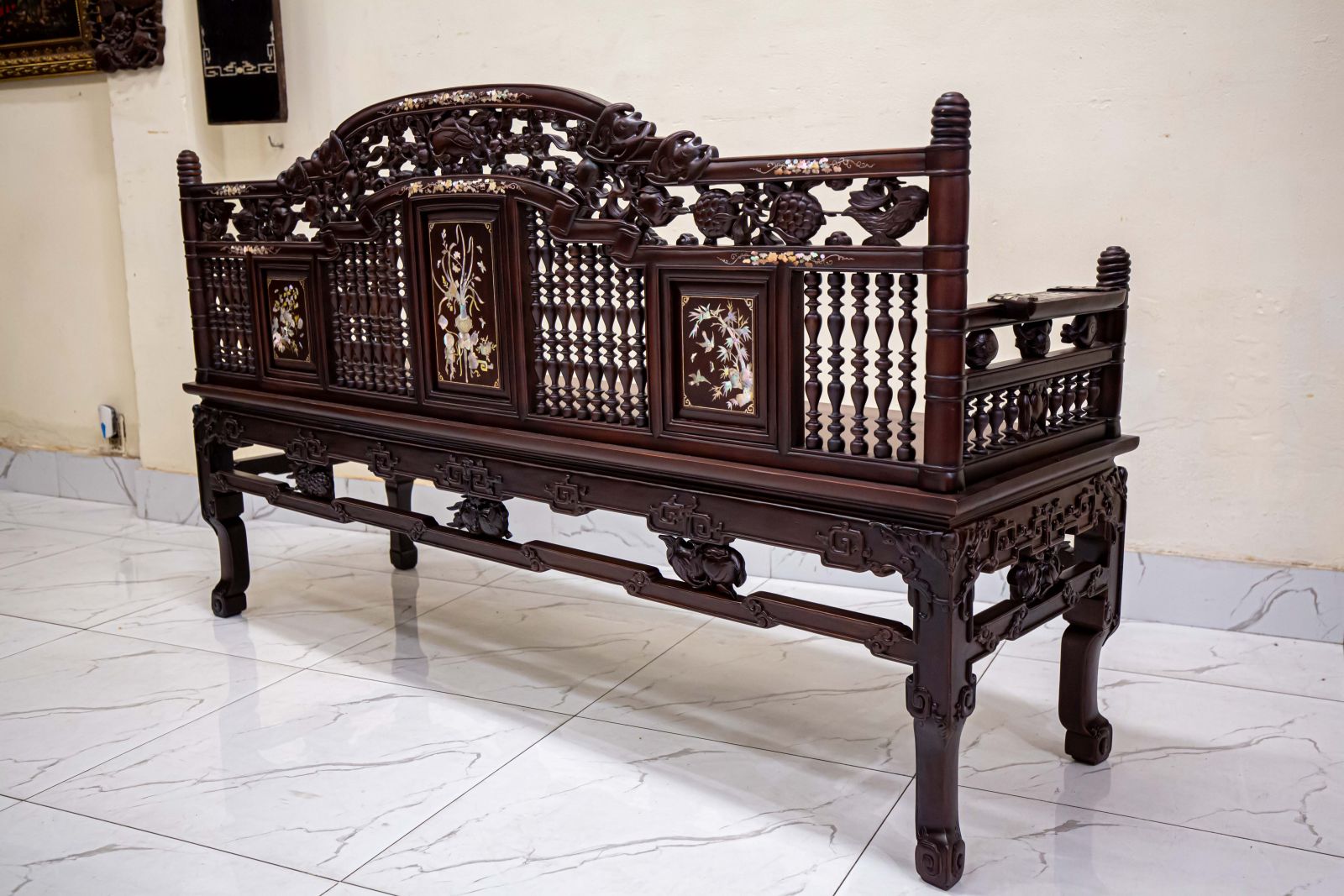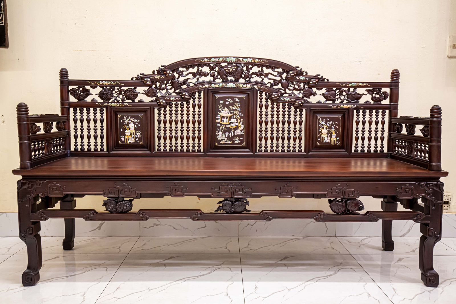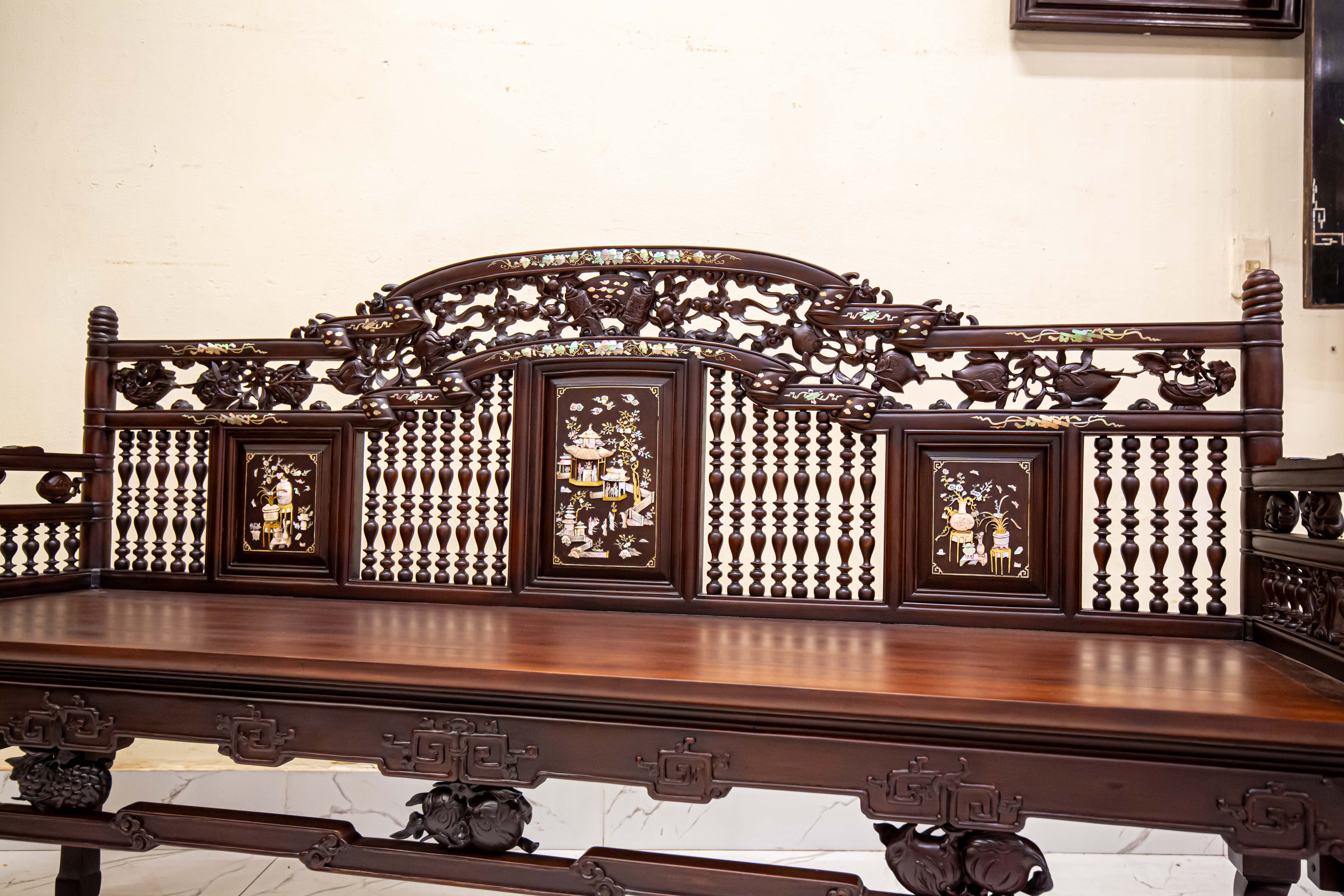 Bộ trường kỷ Huế xịn khảm nổi là dòng sản phẩm cao cấp, thể hiện đỉnh cao của nghệ thuật chạm khảm truyền thống. Mỗi chi tiết được chạm trổ tinh xảo, khảm nổi bằng ốc xà cừ sắc sảo và nổi bật. Gỗ quý dày dặn, kiểu dáng bề thế, toát lên vẻ sang trọng, quyền quý chuẩn phong cách hoàng gia xưa