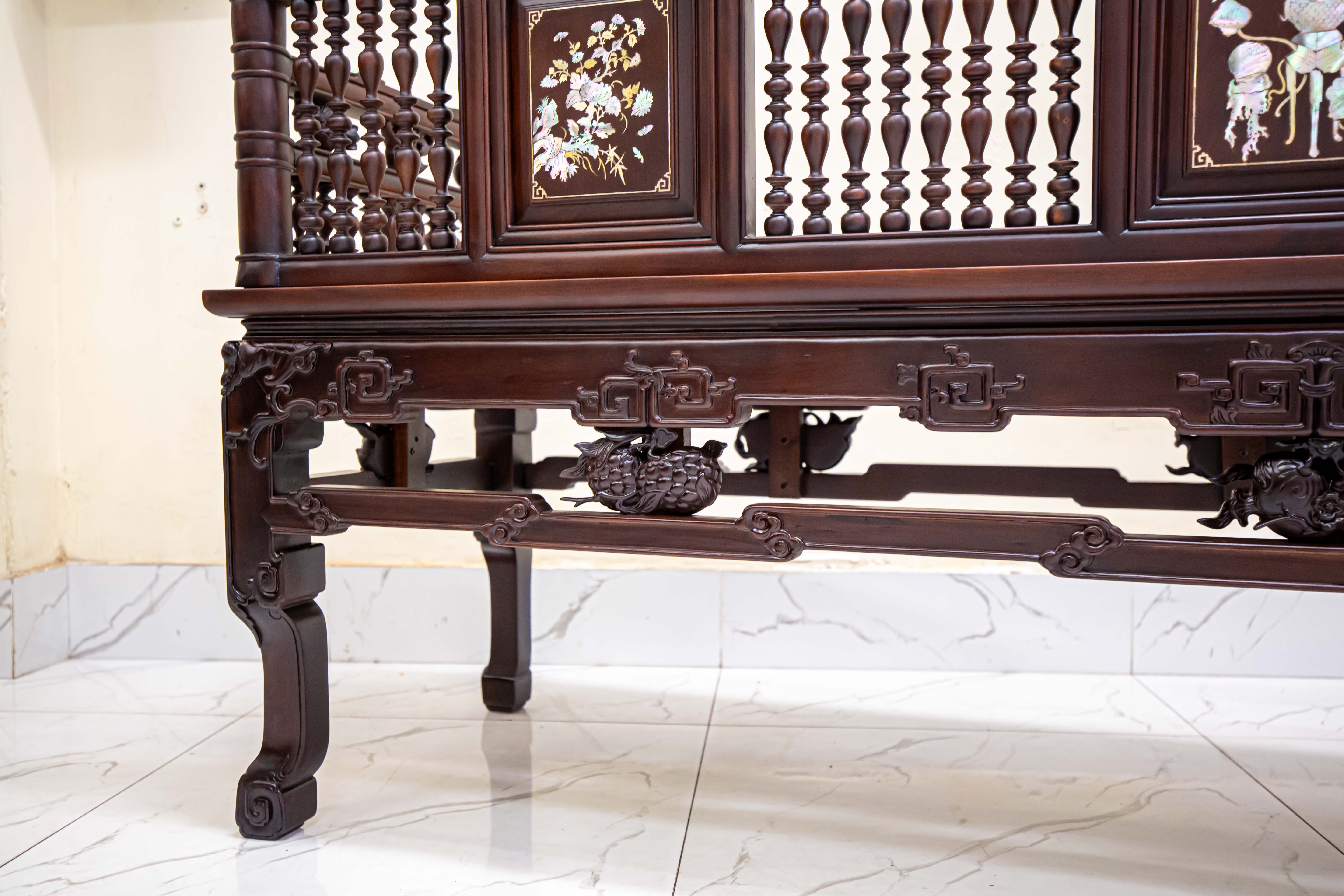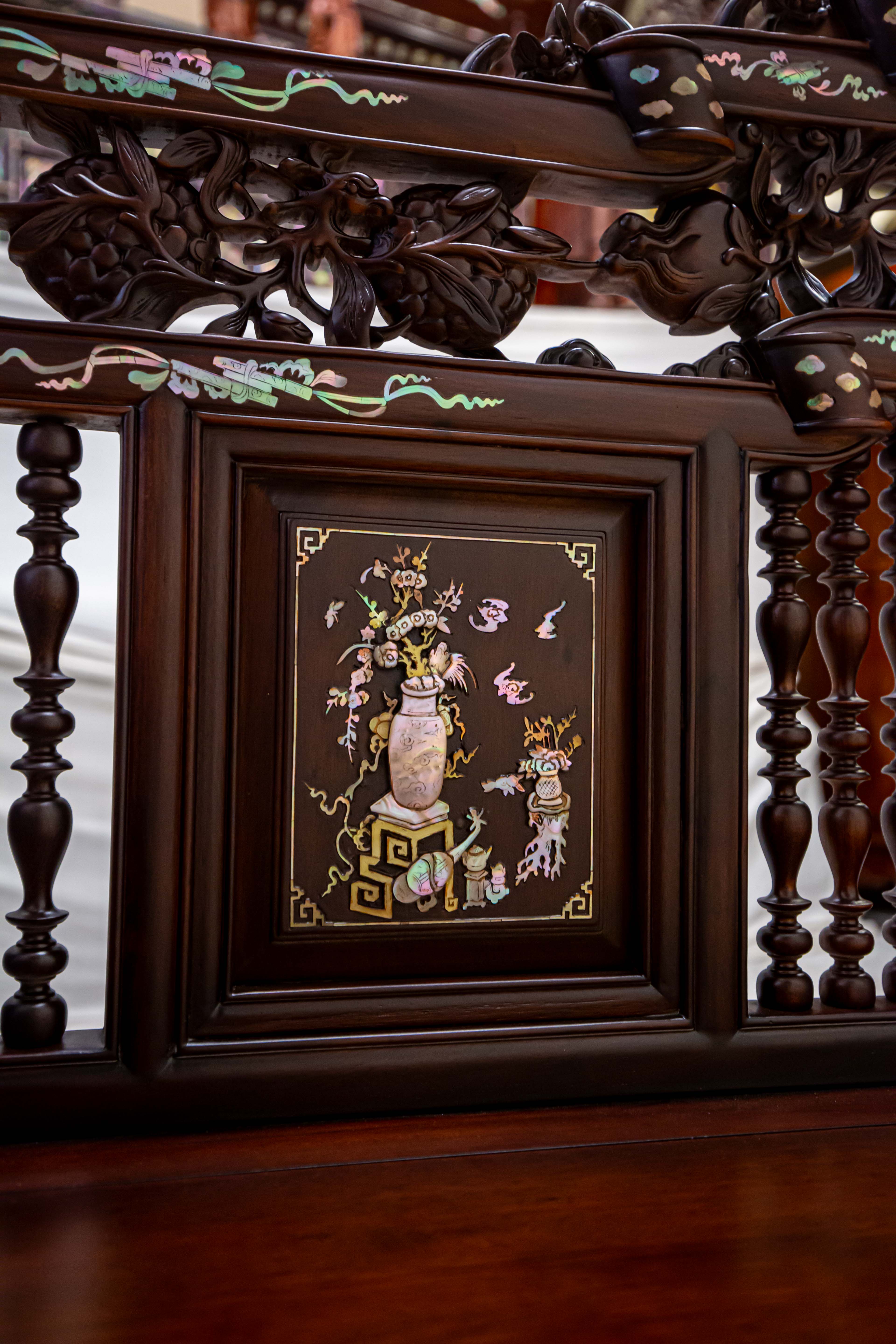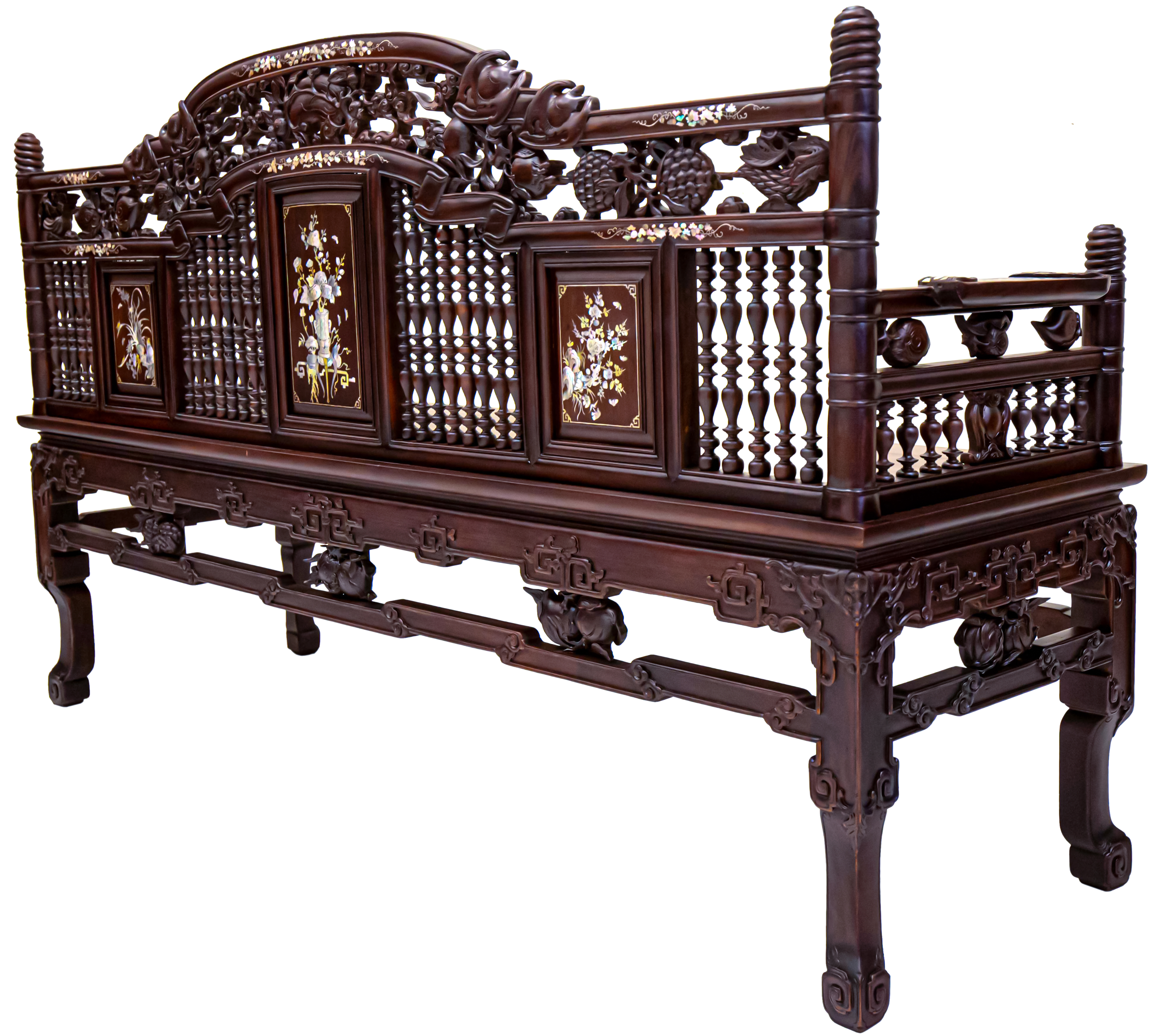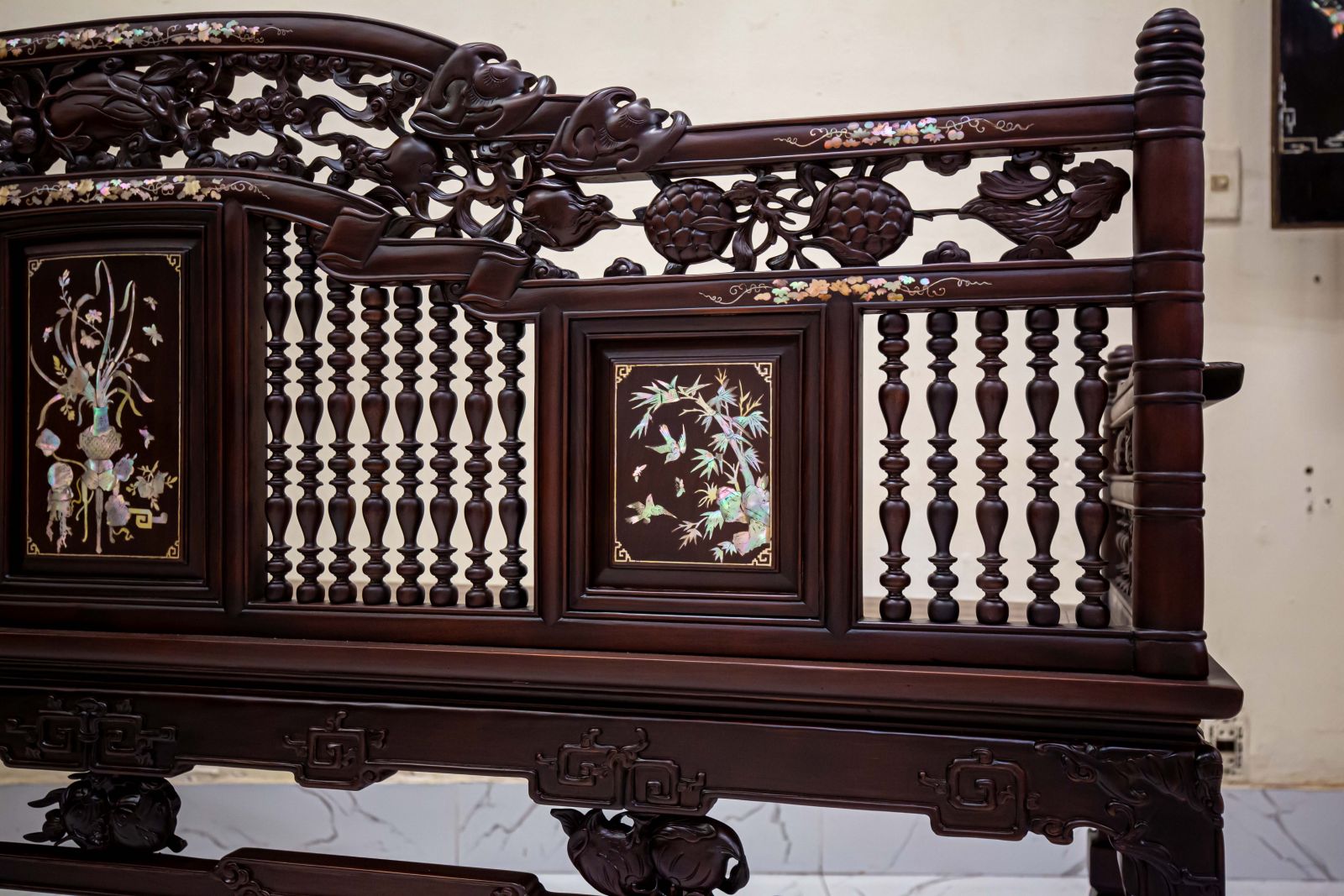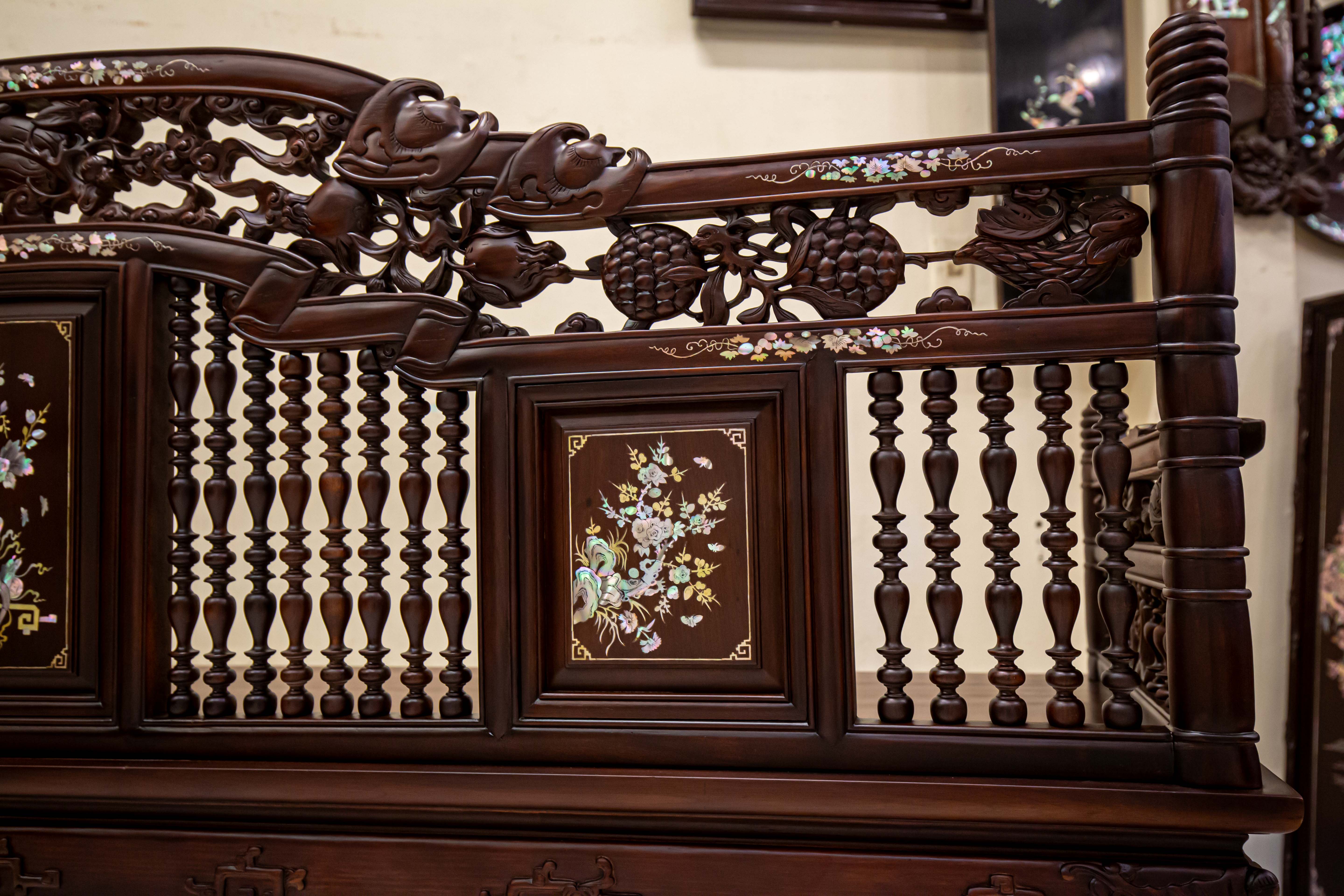 Bộ trường kỷ Huế xịn khảm nổi là dòng sản phẩm cao cấp, thể hiện đỉnh cao của nghệ thuật chạm khảm truyền thống. Mỗi chi tiết được chạm trổ tinh xảo, khảm nổi bằng ốc xà cừ sắc sảo và nổi bật. Gỗ quý dày dặn, kiểu dáng bề thế, toát lên vẻ sang trọng, quyền quý chuẩn phong cách hoàng gia xưa