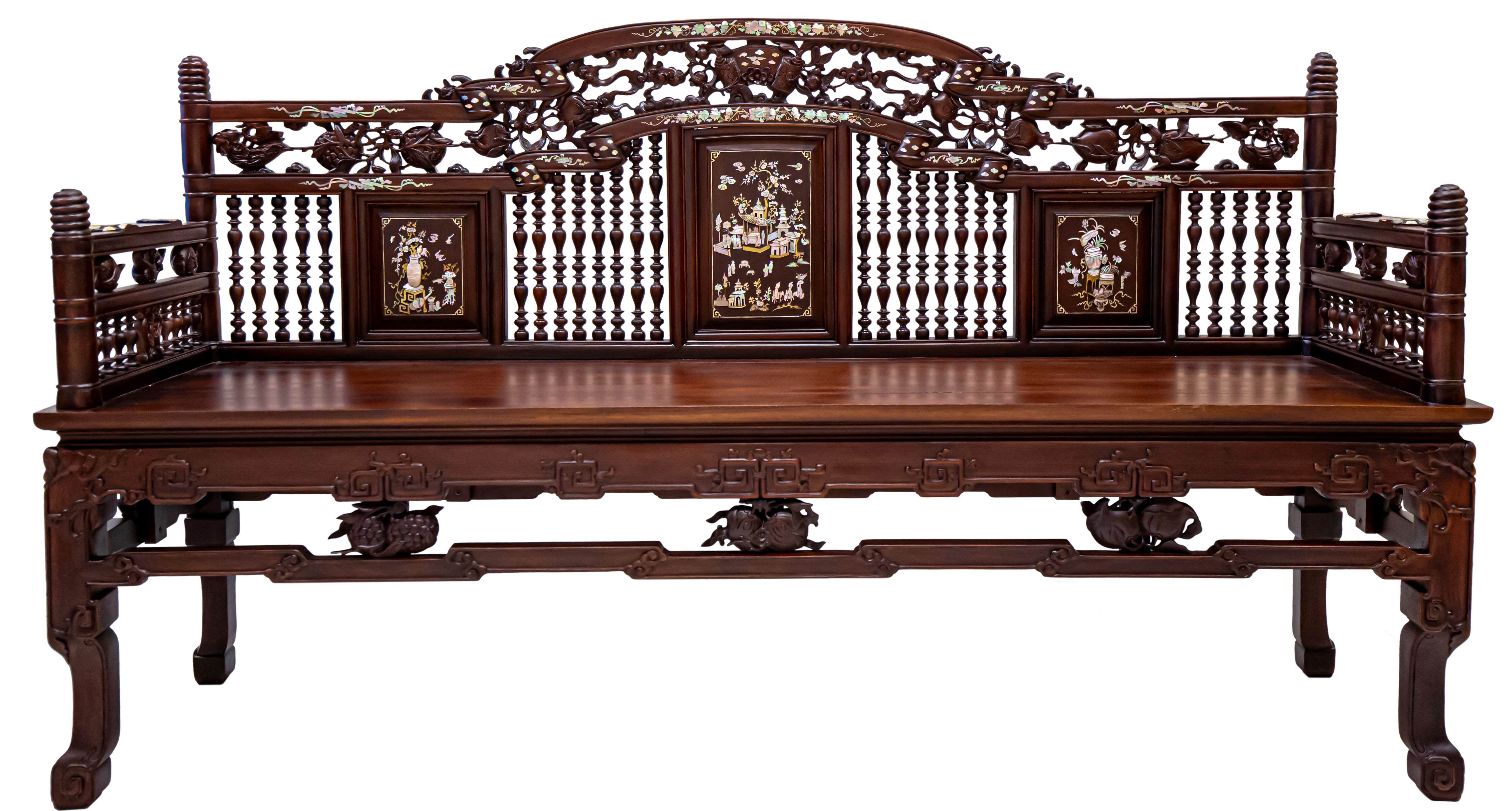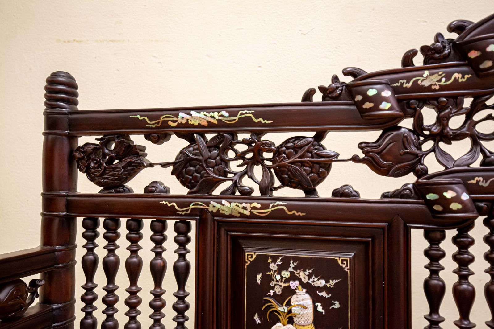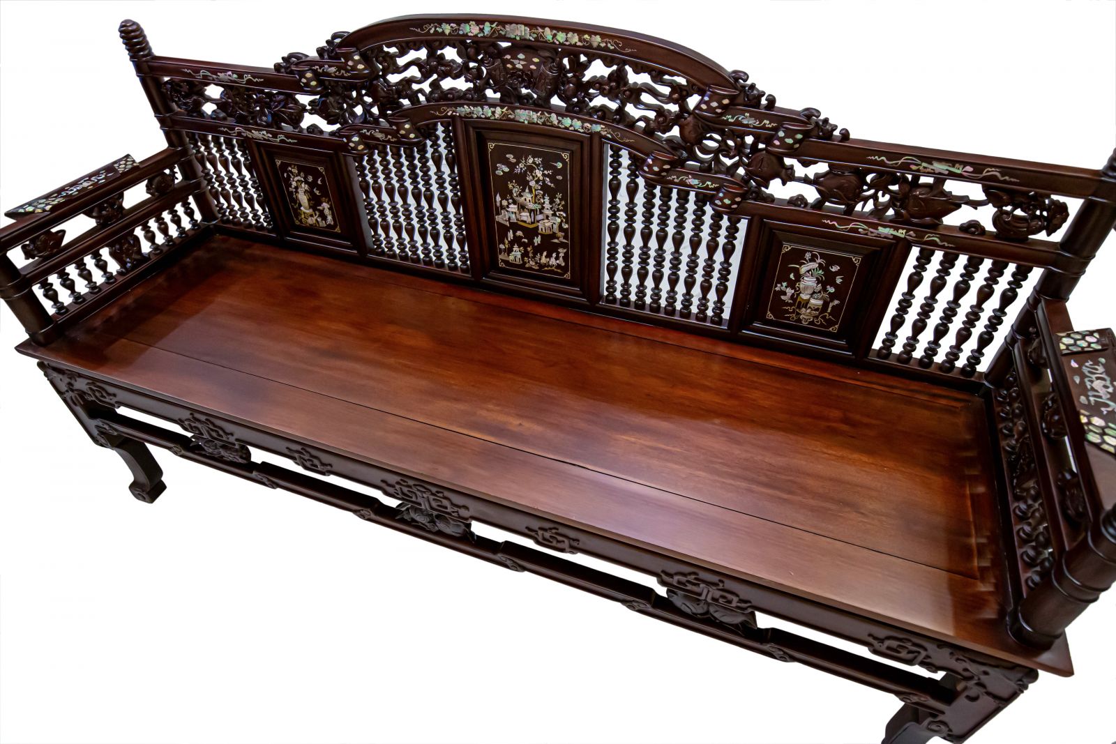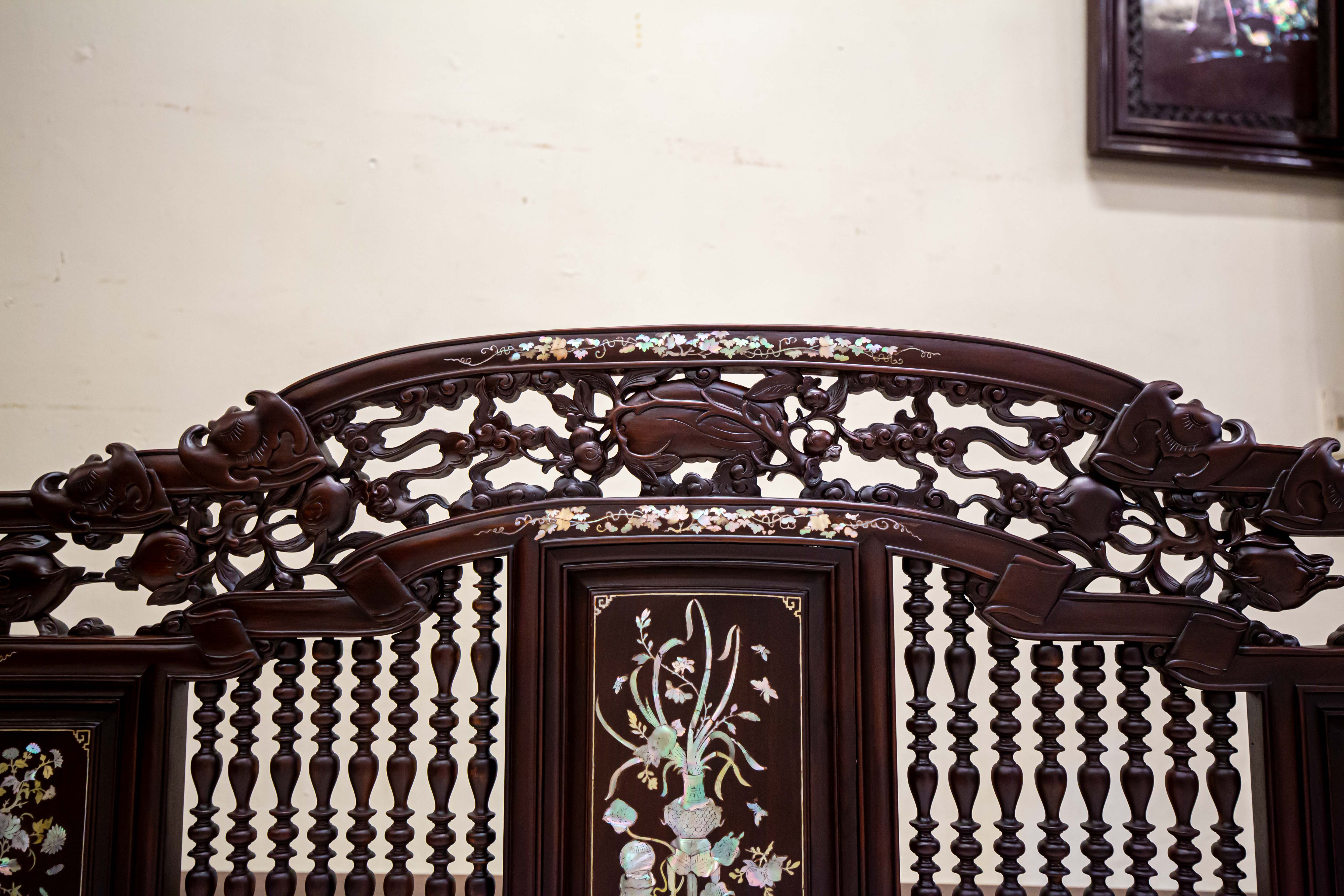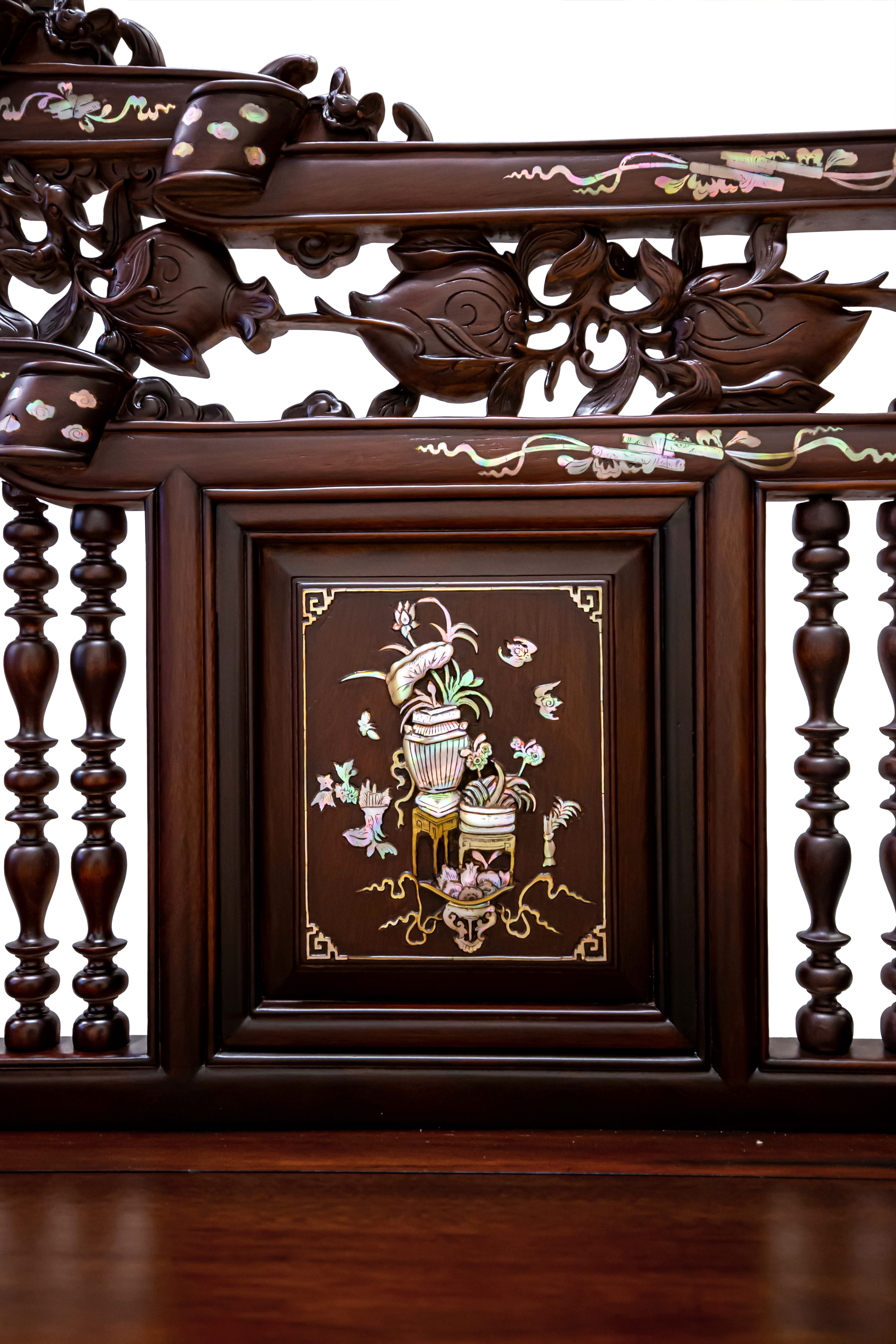 Bộ trường kỷ Huế xịn khảm nổi là dòng sản phẩm cao cấp, thể hiện đỉnh cao của nghệ thuật chạm khảm truyền thống. Mỗi chi tiết được chạm trổ tinh xảo, khảm nổi bằng ốc xà cừ sắc sảo và nổi bật. Gỗ quý dày dặn, kiểu dáng bề thế, toát lên vẻ sang trọng, quyền quý chuẩn phong cách hoàng gia xưa
