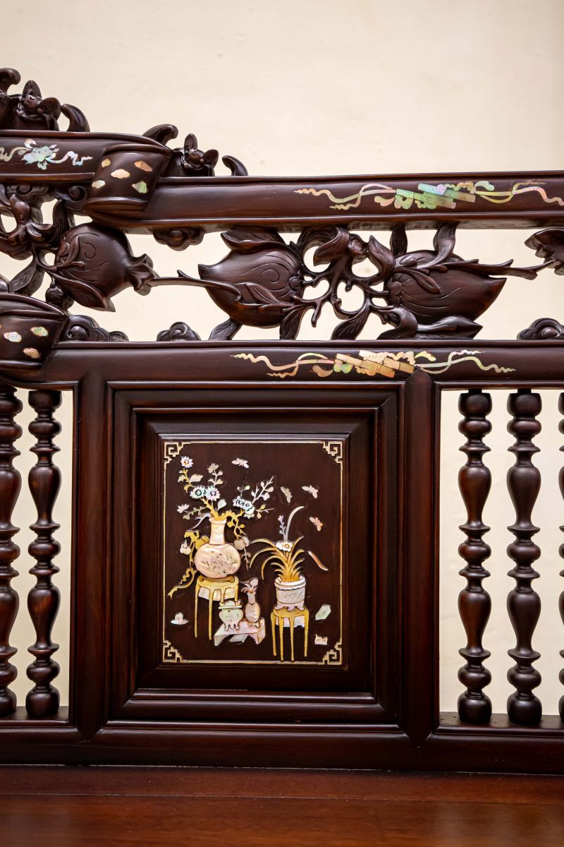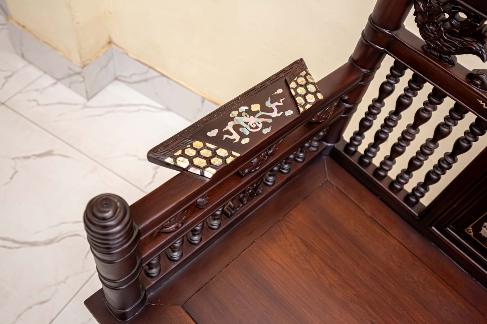 Bộ bàn ghế trường kỷ Huế làm từ gỗ gụ ta, khảm ốc nổi là tuyệt phẩm hội tụ tinh hoa của nghệ thuật thủ công đất Cố đô. Kỹ thuật khảm ốc nổi độc đáo, chỉ riêng thợ Huế xưa mới thực hiện được, tạo nên những họa tiết sống động như tranh nổi 3D trên mặt gỗ. Gỗ gụ ta già dặn, vân mịn, kết hợp với ốc xà cừ óng ánh khiến từng chi tiết trở nên sắc sảo và quý hiếm. Đây không chỉ là bộ bàn ghế, mà còn là giá trị văn hóa và nghệ thuật cần được gìn giữ. Rất hiếm gặp trên thị trường, sản phẩm dành cho người thật sự am hiểu và đam mê đồ gỗ cổ.