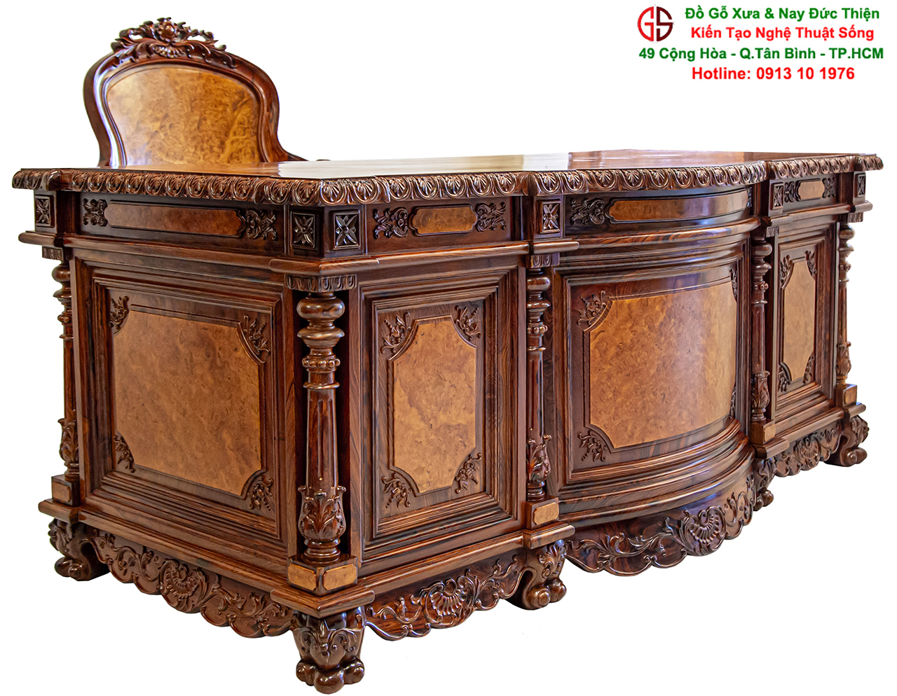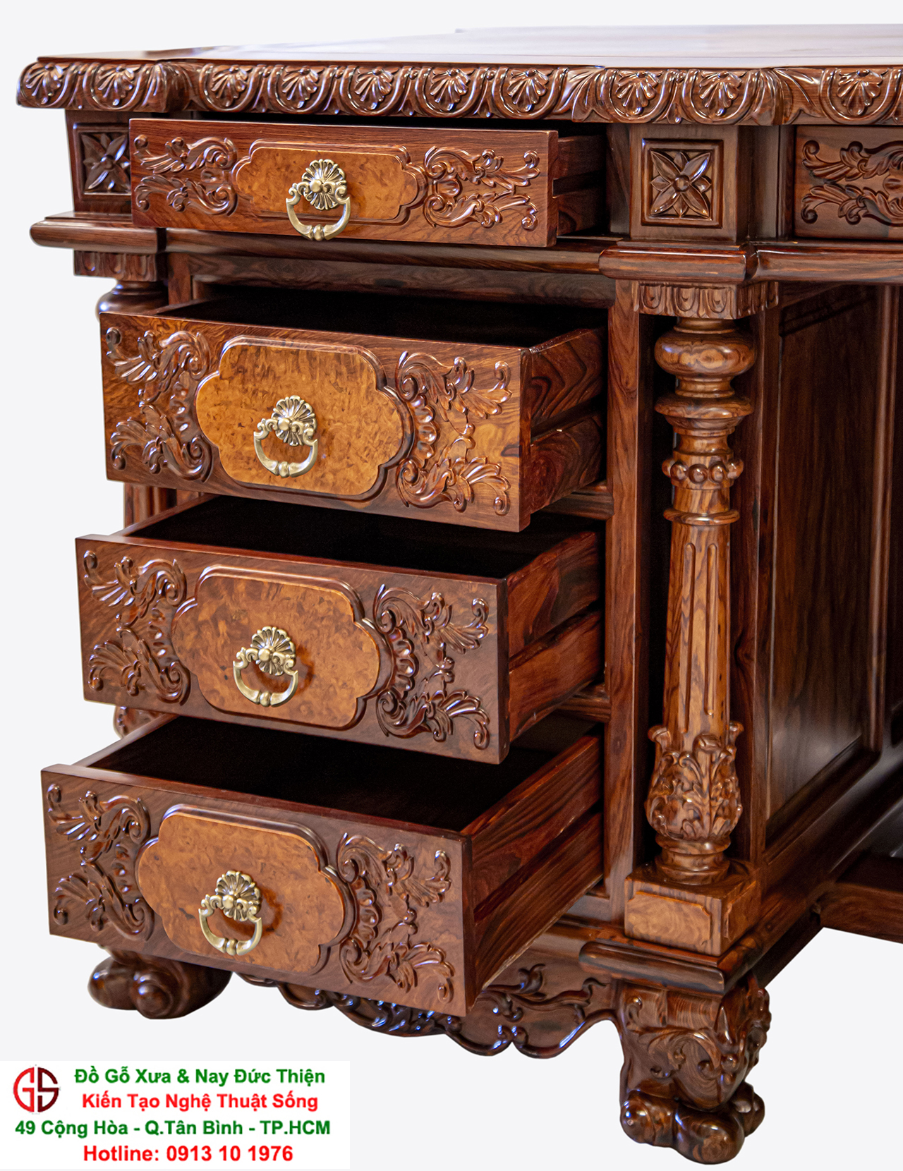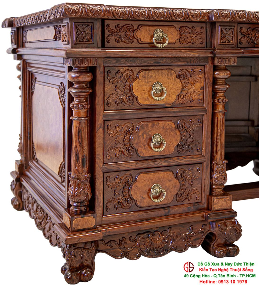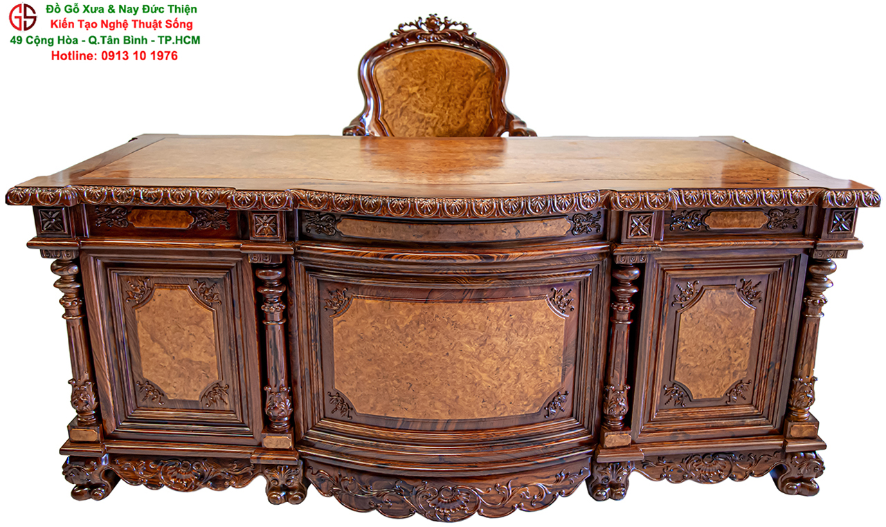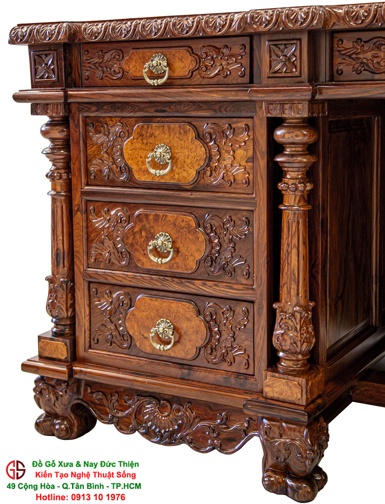 Bộ bàn làm việc làm từ gỗ quý hiếm cẩm lai kết hợp với gỗ nu là biểu tượng của sự sang trọng, quyền uy và đẳng cấp bậc nhất, dành riêng cho các chủ tịch, doanh nhân và giới tinh hoa. Sự kết hợp hoàn mỹ giữa hai loại gỗ quý này không chỉ mang lại vẻ đẹp tinh tế, mà còn thể hiện sức mạnh và uy quyền của người sở hữu.