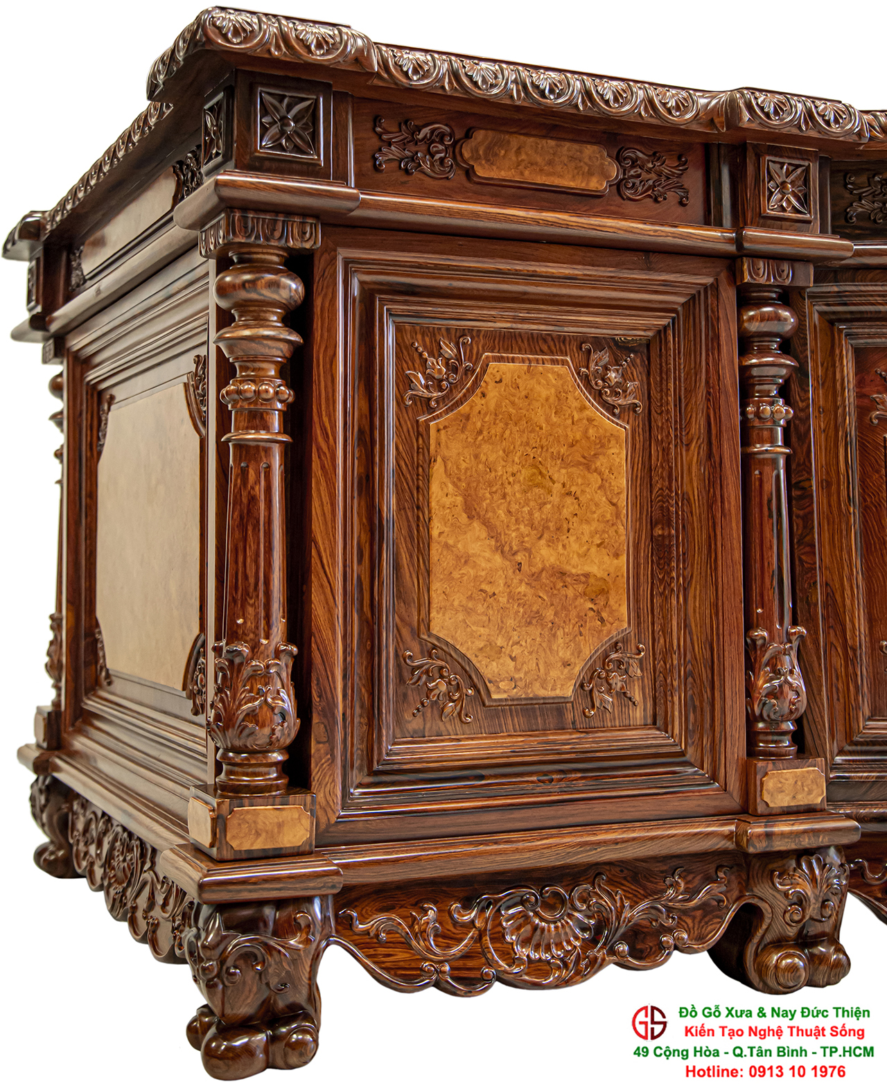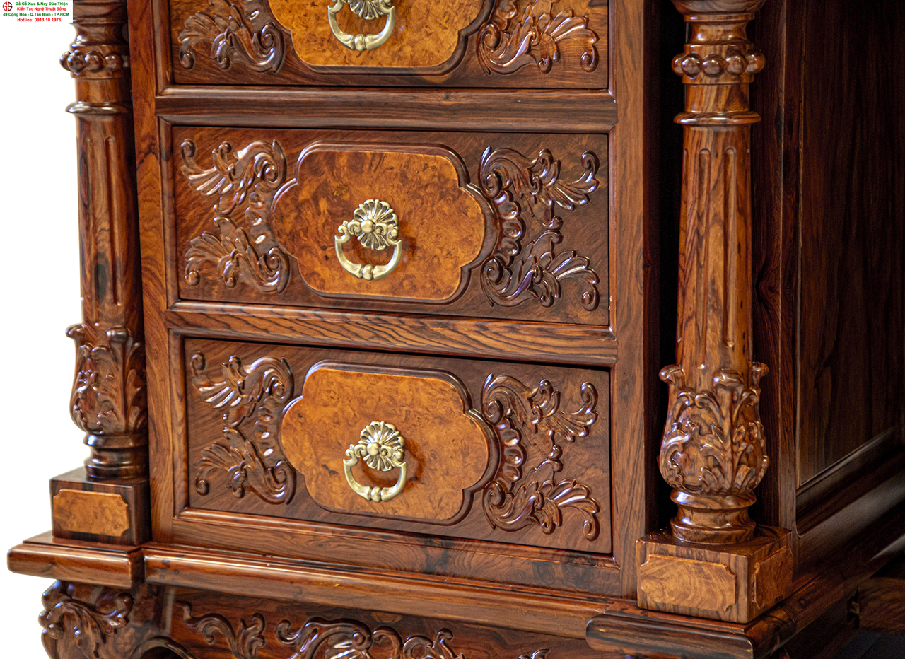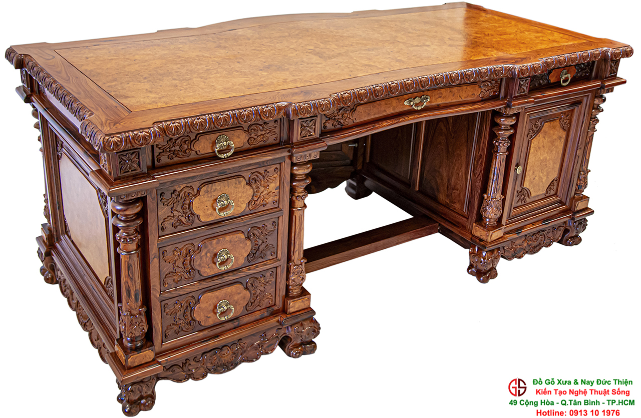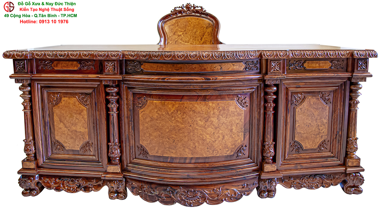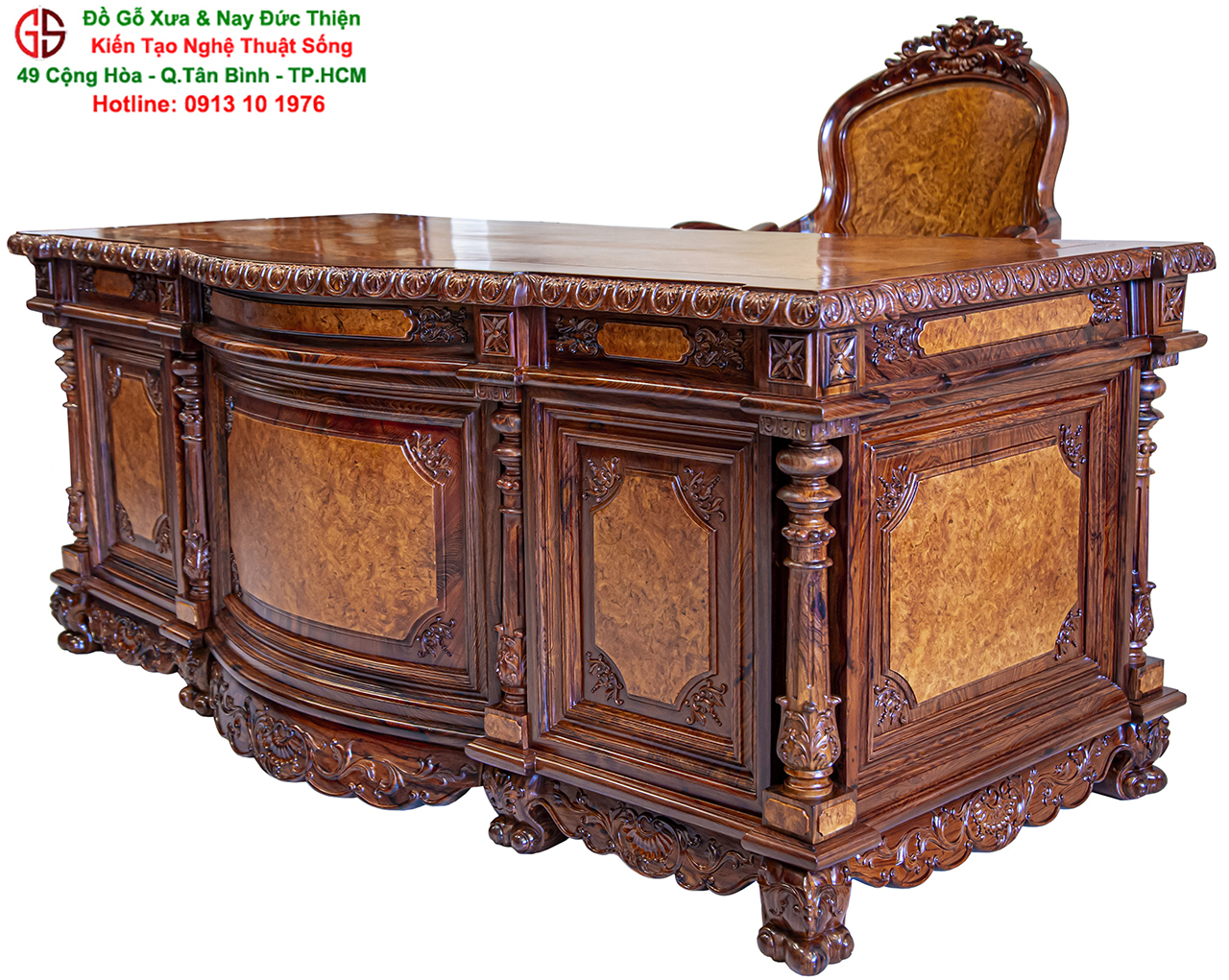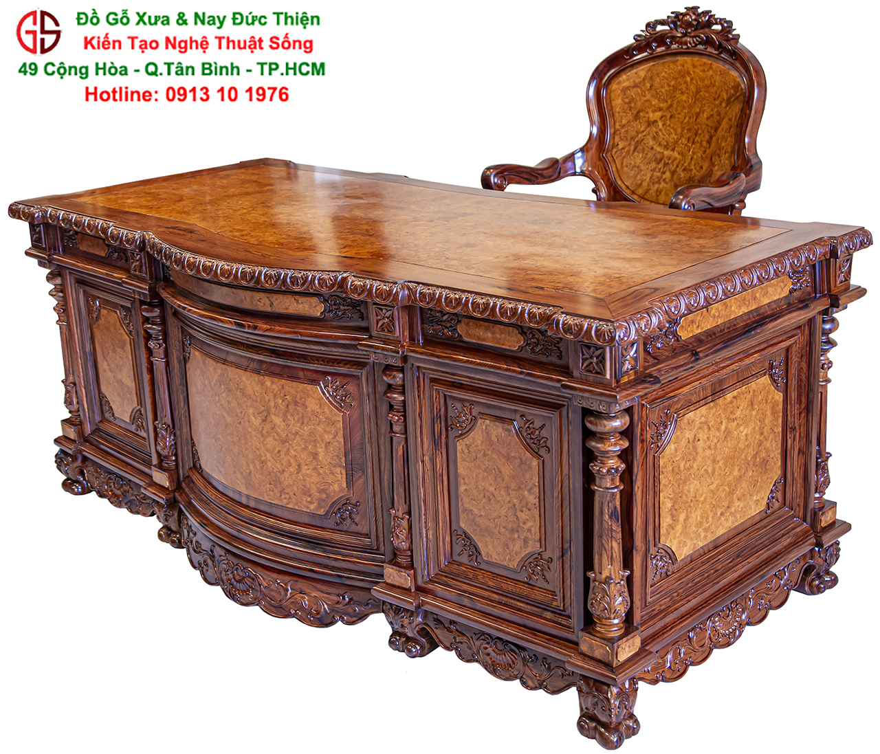 Bộ bàn làm việc làm từ gỗ quý hiếm cẩm lai kết hợp với gỗ nu là biểu tượng của sự sang trọng, quyền uy và đẳng cấp bậc nhất, dành riêng cho các chủ tịch, doanh nhân và giới tinh hoa. Sự kết hợp hoàn mỹ giữa hai loại gỗ quý này không chỉ mang lại vẻ đẹp tinh tế, mà còn thể hiện sức mạnh và uy quyền của người sở hữu.