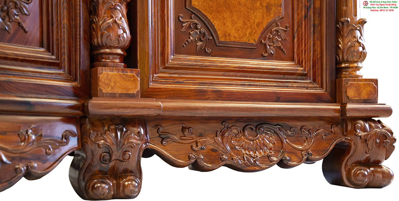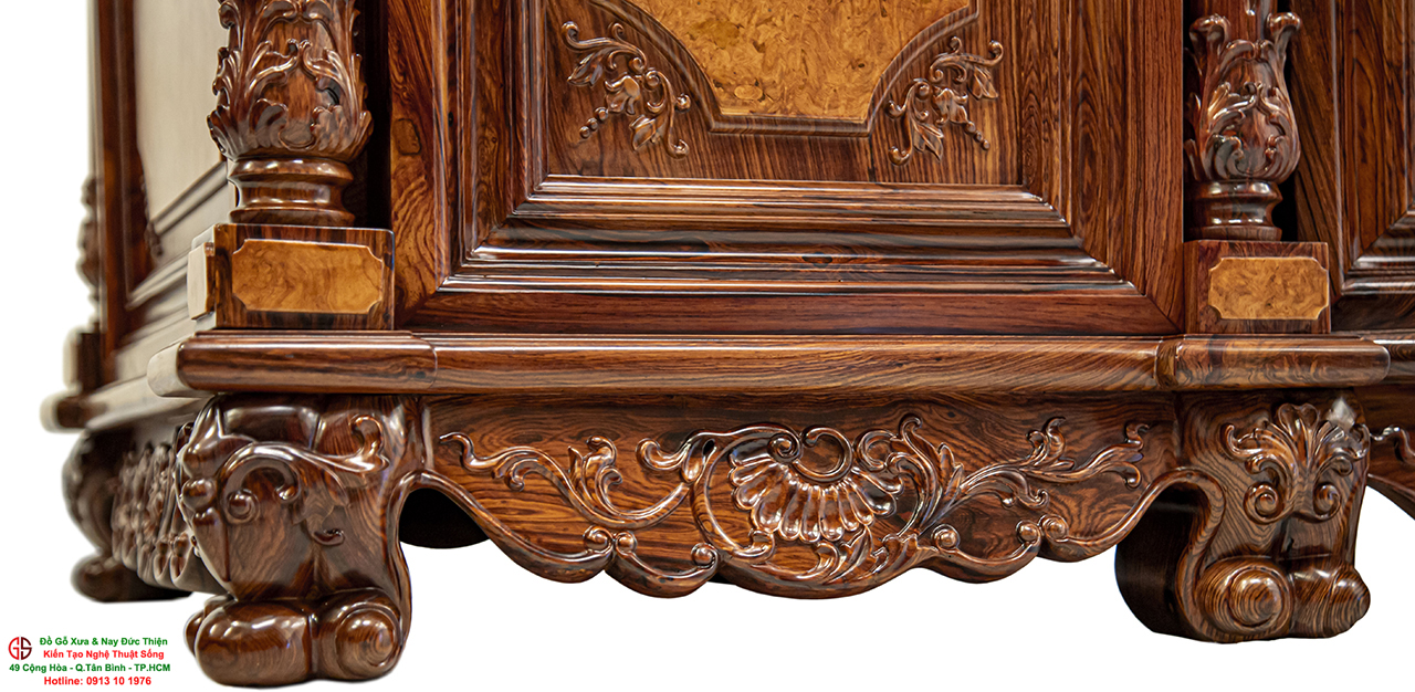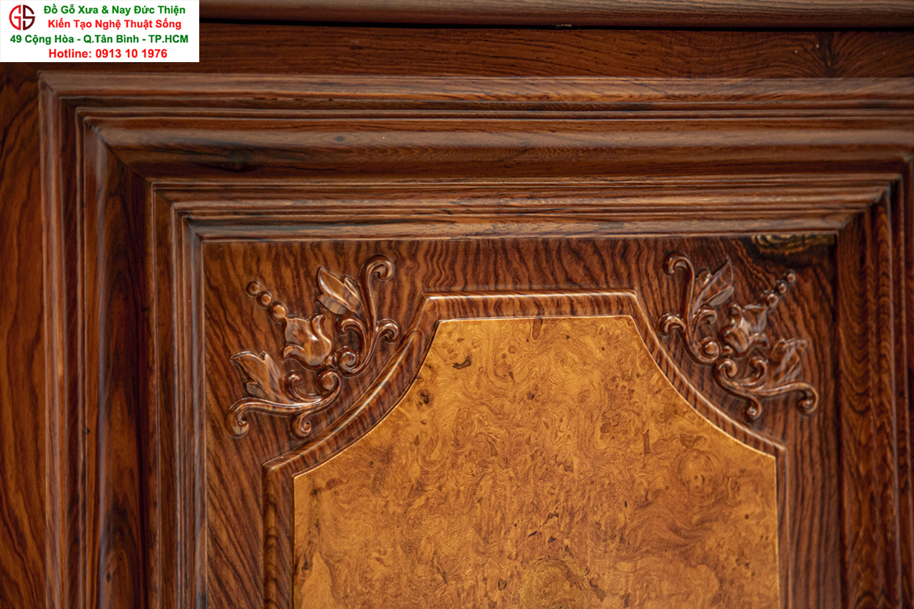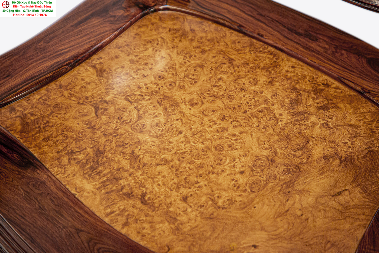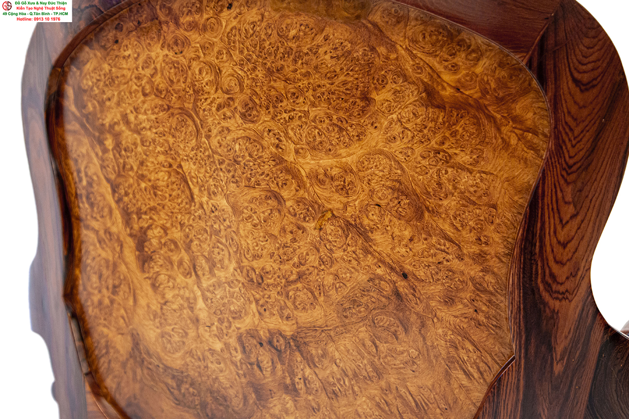 Gỗ cẩm lai được biết đến như một trong những loại gỗ quý hiếm và giá trị bậc nhất trong giới nội thất. Với màu sắc nâu đỏ trầm ấm, vân gỗ đẹp tự nhiên như tranh, cẩm lai toát lên vẻ đẹp quý phái, xa hoa nhưng không kém phần thanh lịch. Trong khi đó, gỗ nu – phần gỗ có vân xoắn tự nhiên do phát triển đặc biệt – tạo ra những hoa văn kỳ diệu, không trùng lặp, làm nên nét độc đáo riêng biệt và sự quý giá khó tìm.