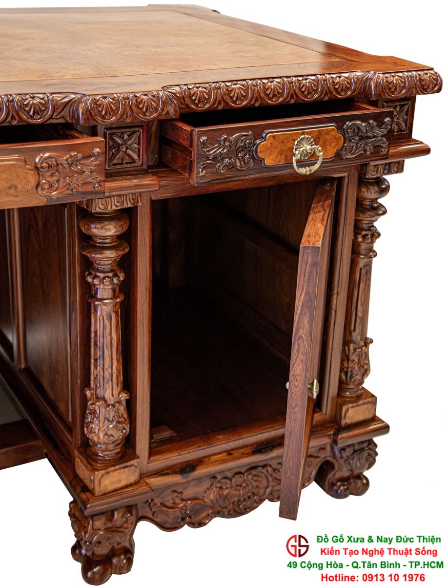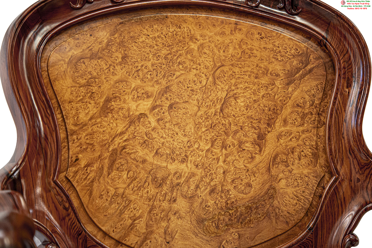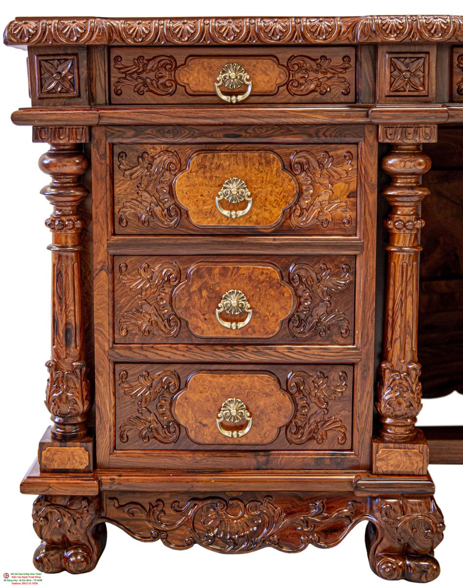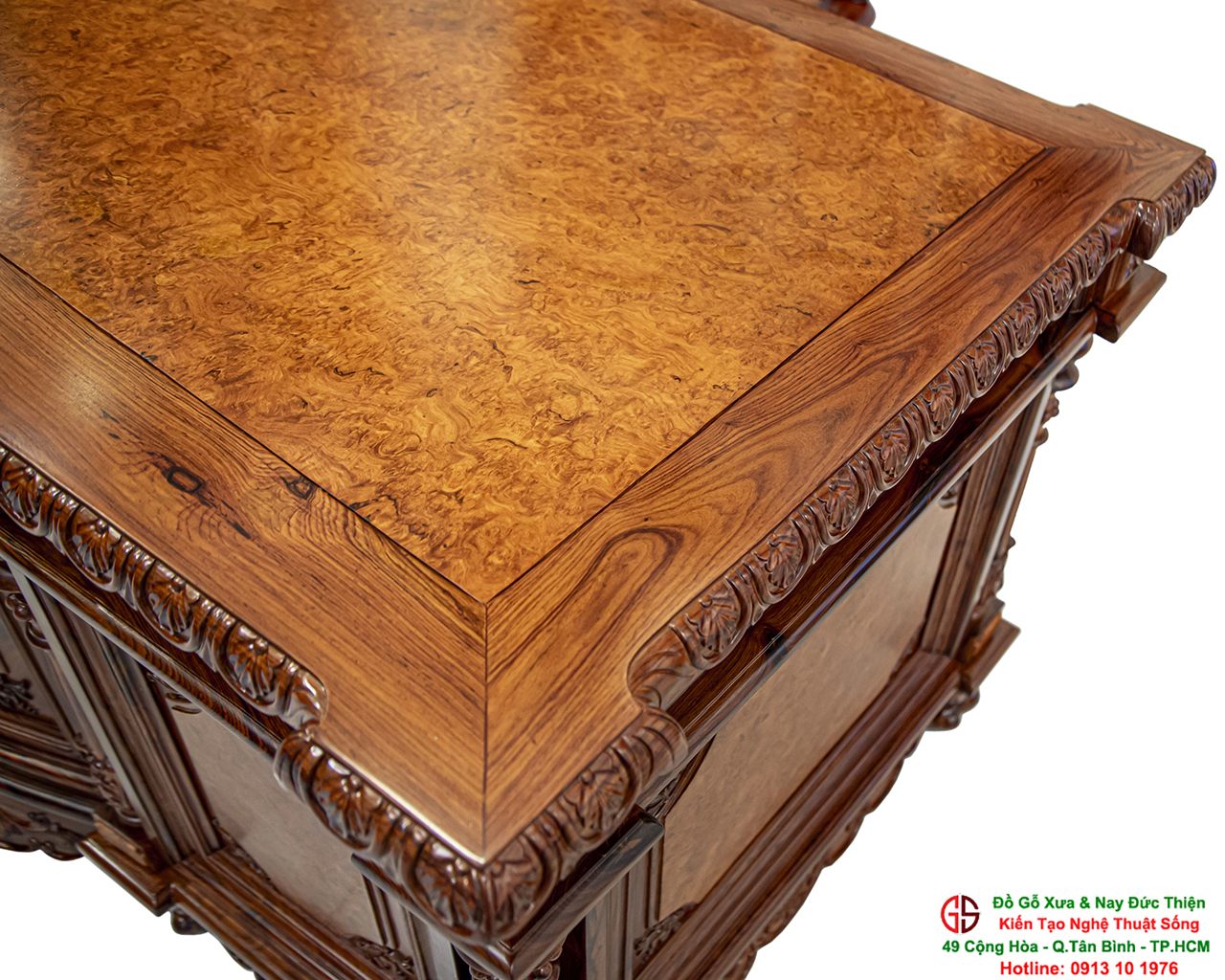 Bộ bàn làm việc cẩm lai – gỗ nu được thiết kế với đường nét tinh xảo, thể hiện đẳng cấp của một sản phẩm xa xỉ. Mặt bàn rộng rãi, bề mặt được đánh bóng mịn màng làm nổi bật vân gỗ tự nhiên. Những đường viền, hoa văn chạm khắc tinh tế tôn vinh sự tỉ mỉ trong từng chi tiết, toát lên vẻ bề thế và đầy quyền uy.