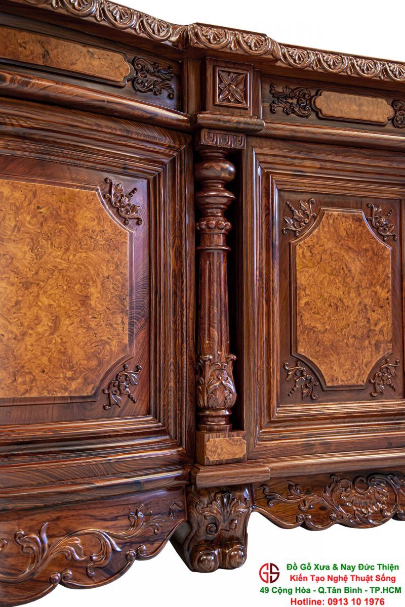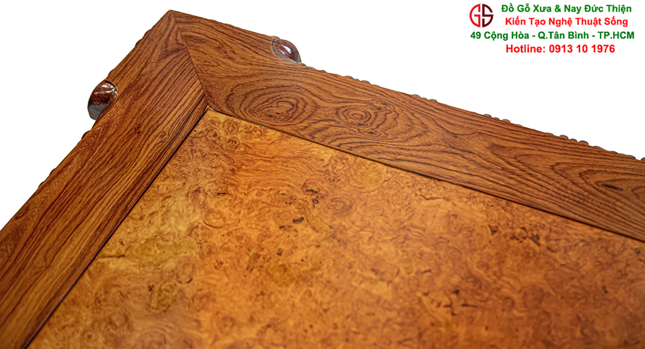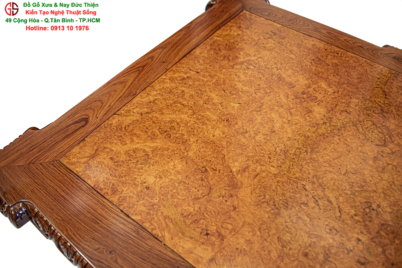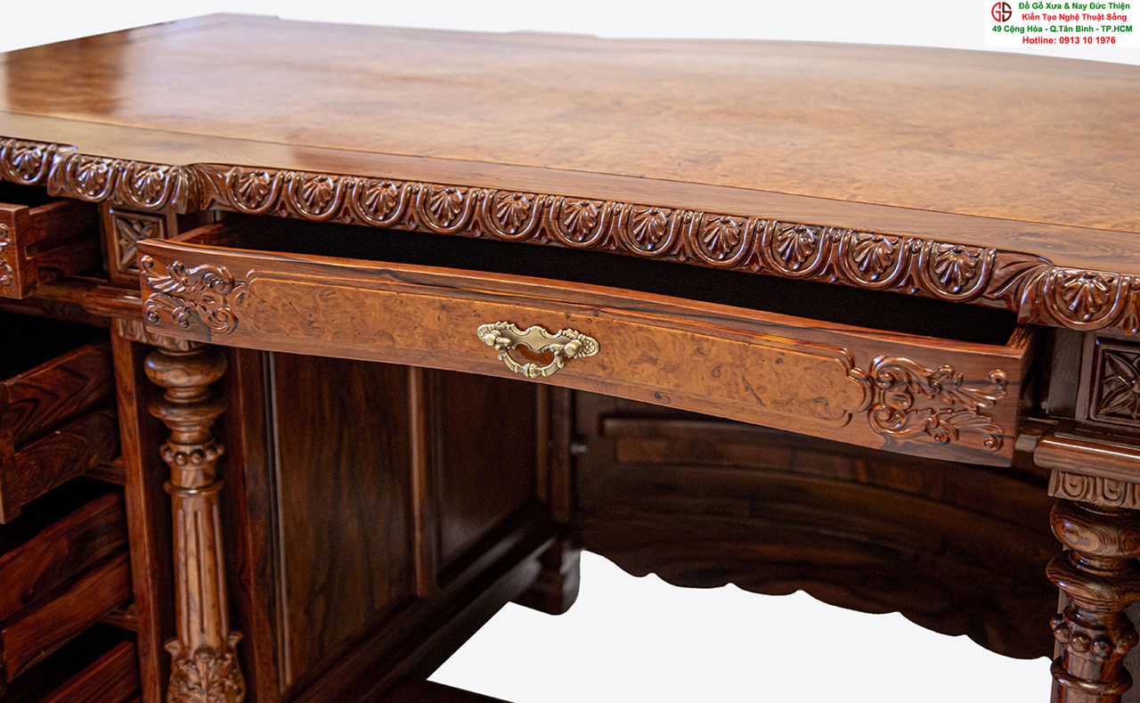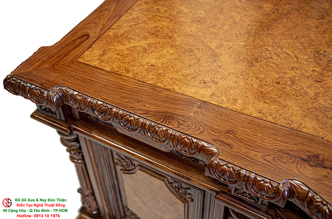 Bộ bàn làm việc cẩm lai – gỗ nu được thiết kế với đường nét tinh xảo, thể hiện đẳng cấp của một sản phẩm xa xỉ. Mặt bàn rộng rãi, bề mặt được đánh bóng mịn màng làm nổi bật vân gỗ tự nhiên. Những đường viền, hoa văn chạm khắc tinh tế tôn vinh sự tỉ mỉ trong từng chi tiết, toát lên vẻ bề thế và đầy quyền uy.