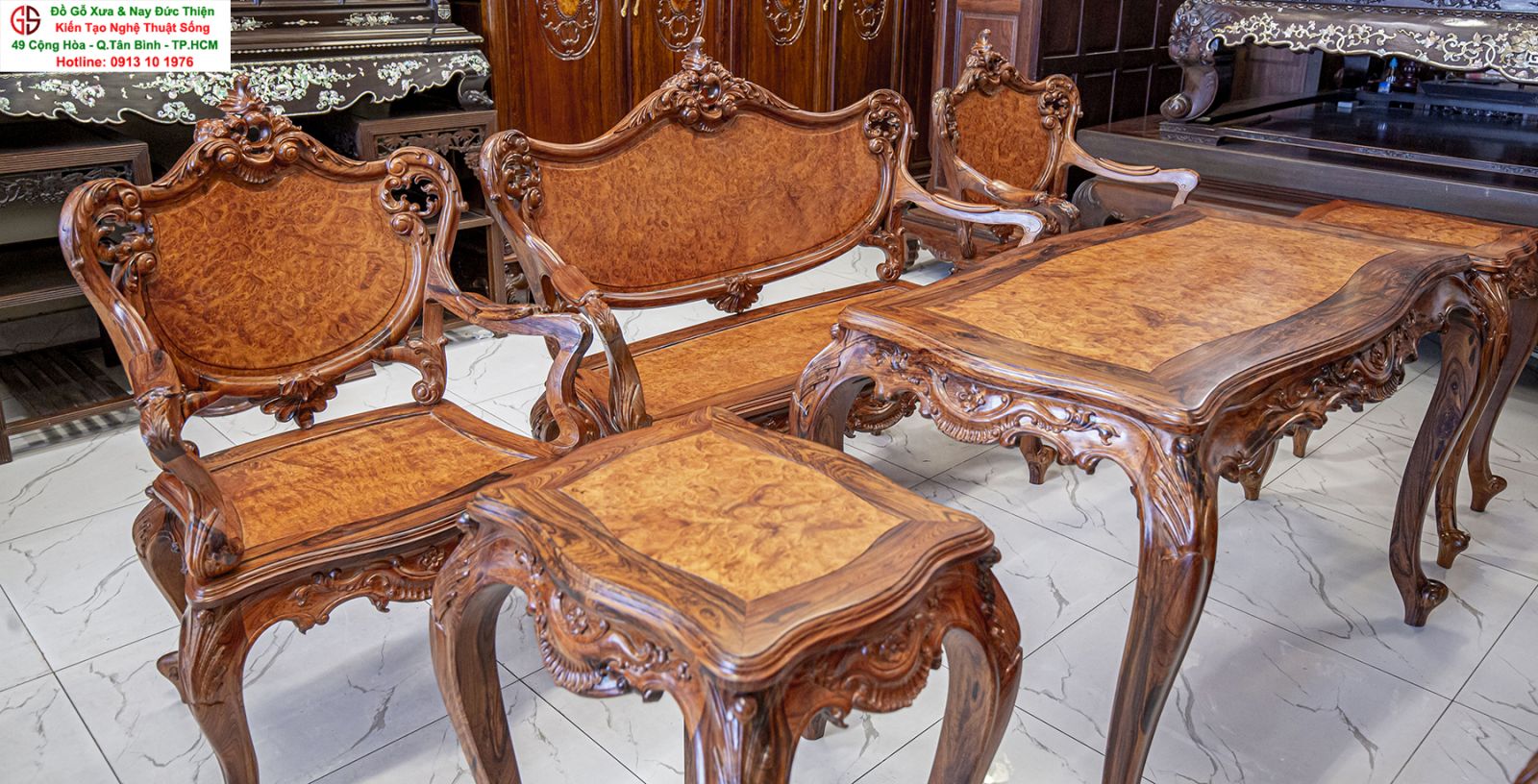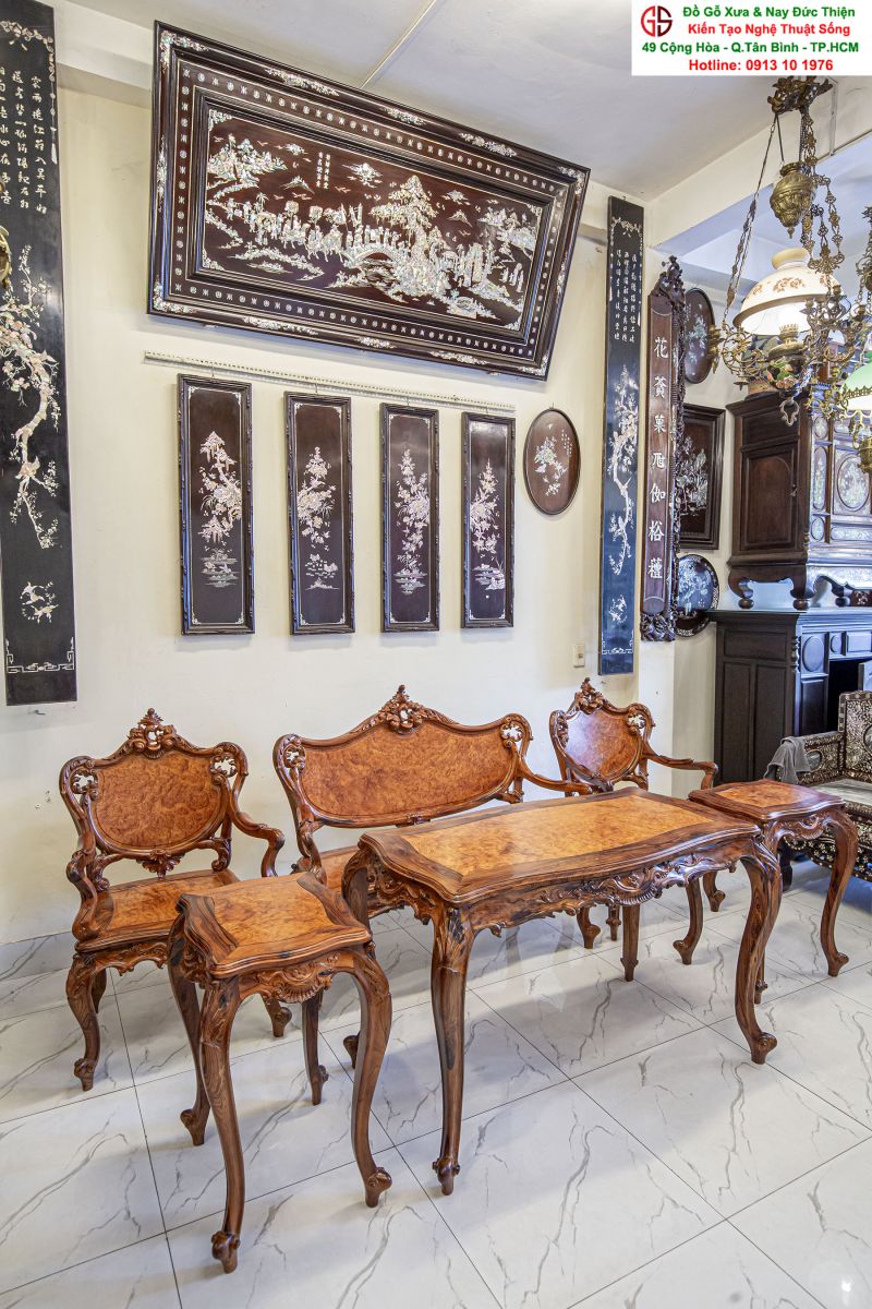 - Bàn ghế Louis, đôn trống gỗ trắc, bộ bàn ăn cẩn ốc, bàn ghế phương kỷ, bàn trung đường cẩn ốc xà cừ
