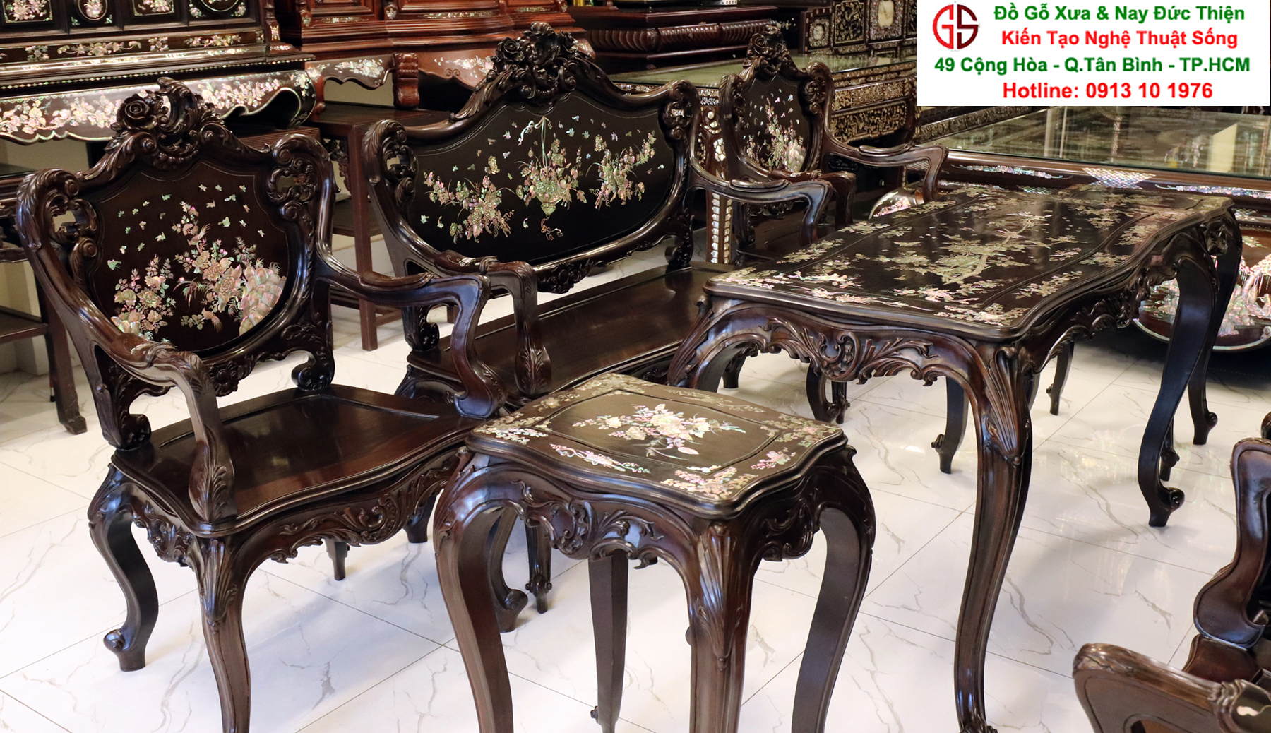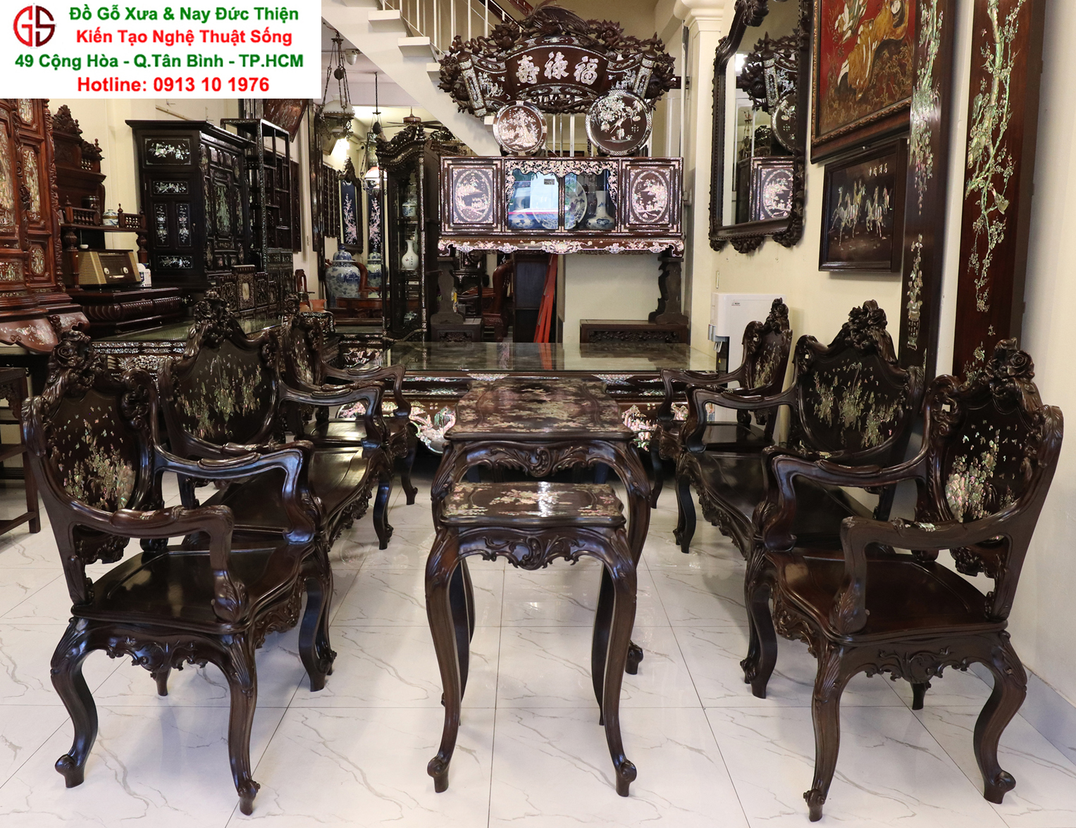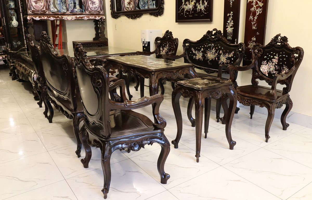- Bàn ghế Louis, đôn trống gỗ trắc, bộ bàn ăn cẩn ốc, bàn ghế phương kỷ, bàn trung đường cẩn ốc xà cừ