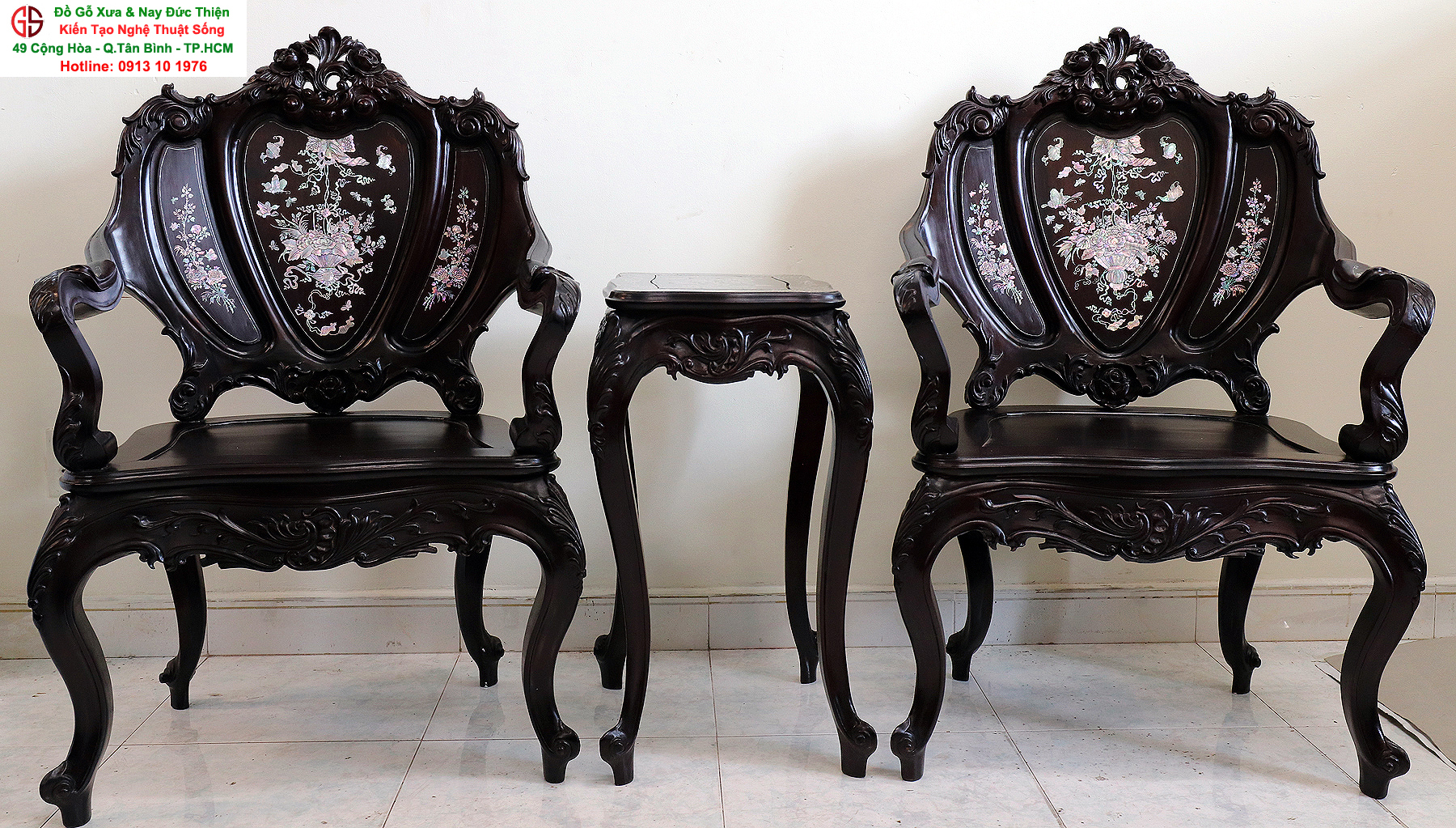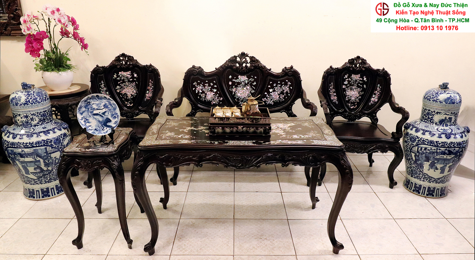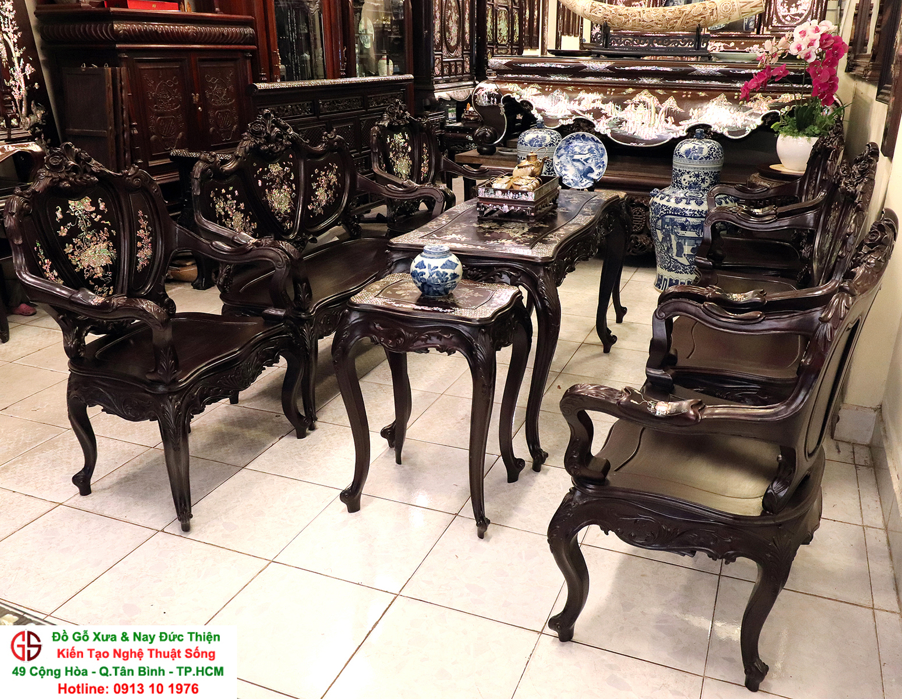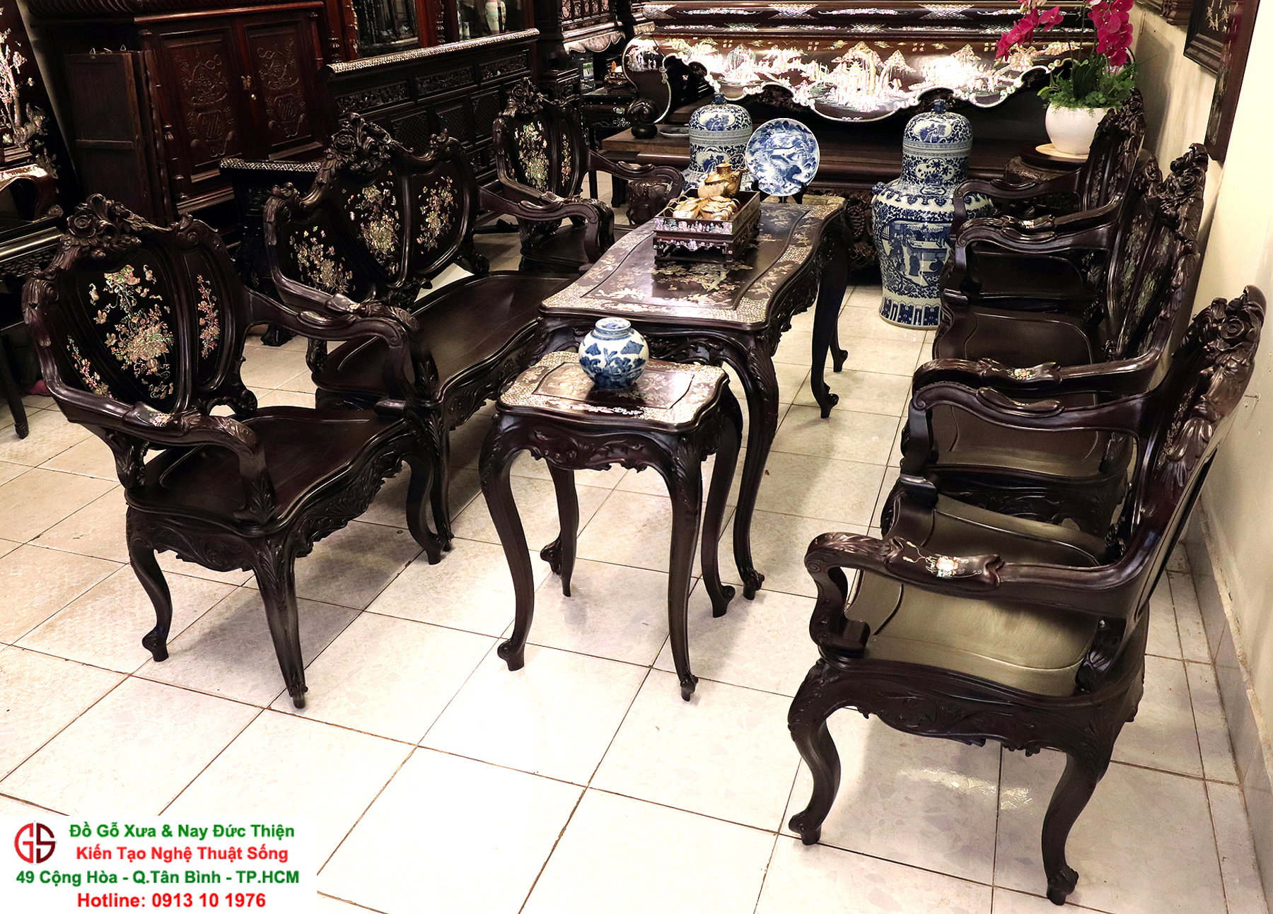 - Bàn ghế Louis, đôn trống gỗ trắc, bộ bàn ăn cẩn ốc, bàn ghế phương kỷ, bàn trung đường cẩn ốc xà cừ