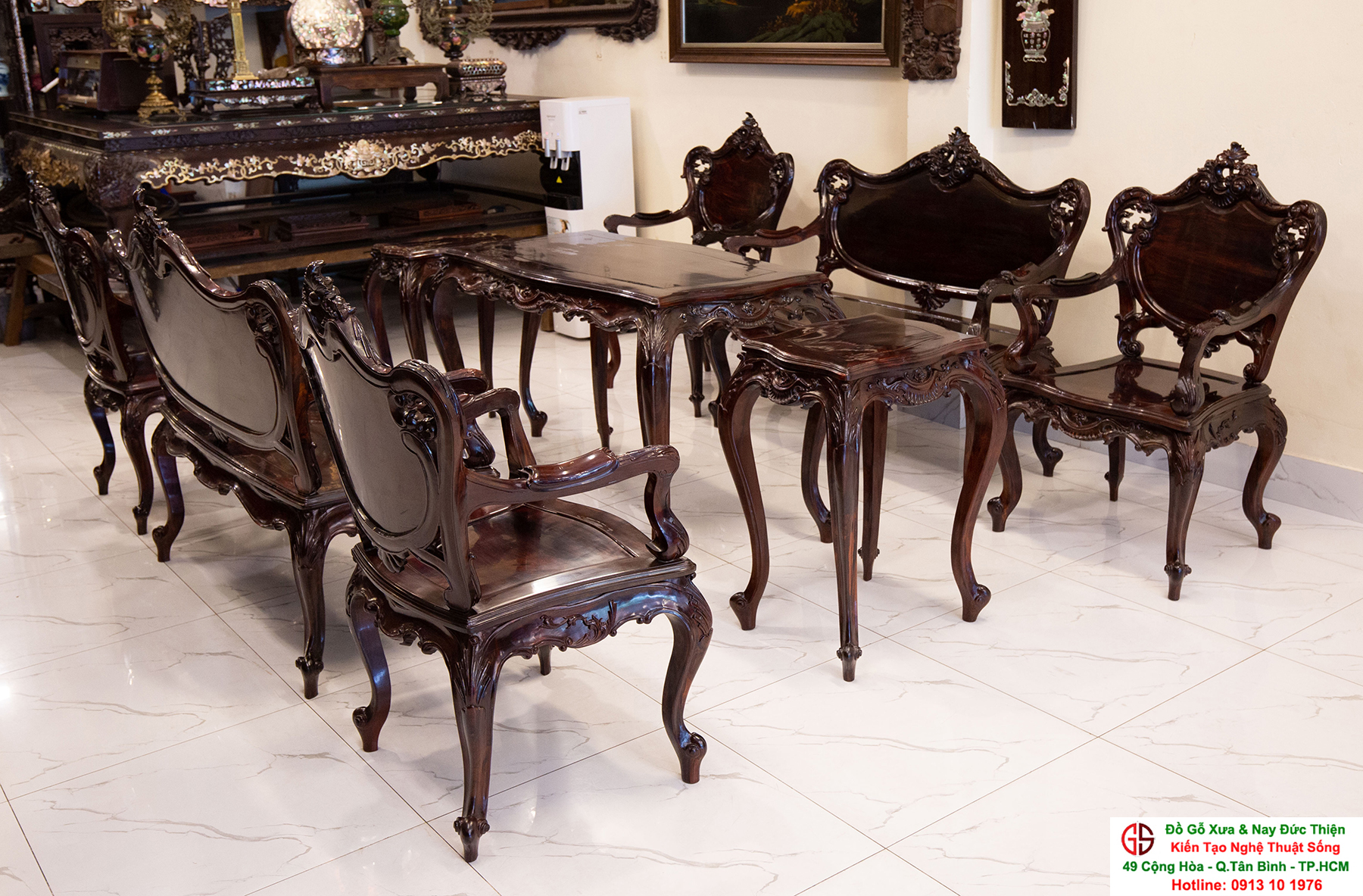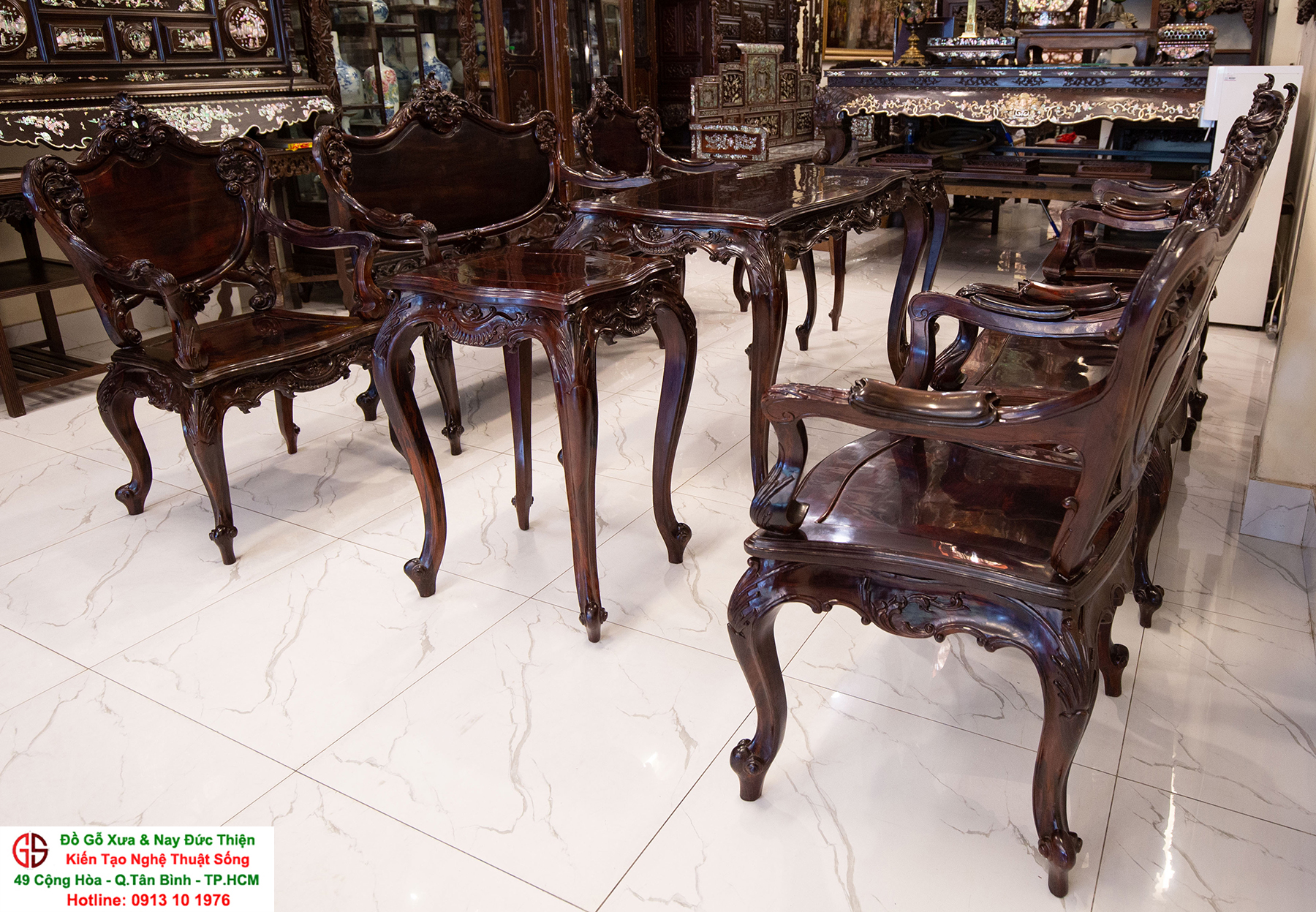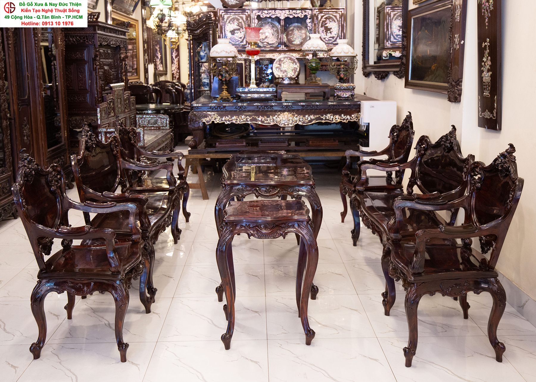 - Bàn ghế Louis, đôn trống gỗ trắc, bộ bàn ăn cẩn ốc, bàn ghế phương kỷ, bàn trung đường cẩn ốc xà cừ