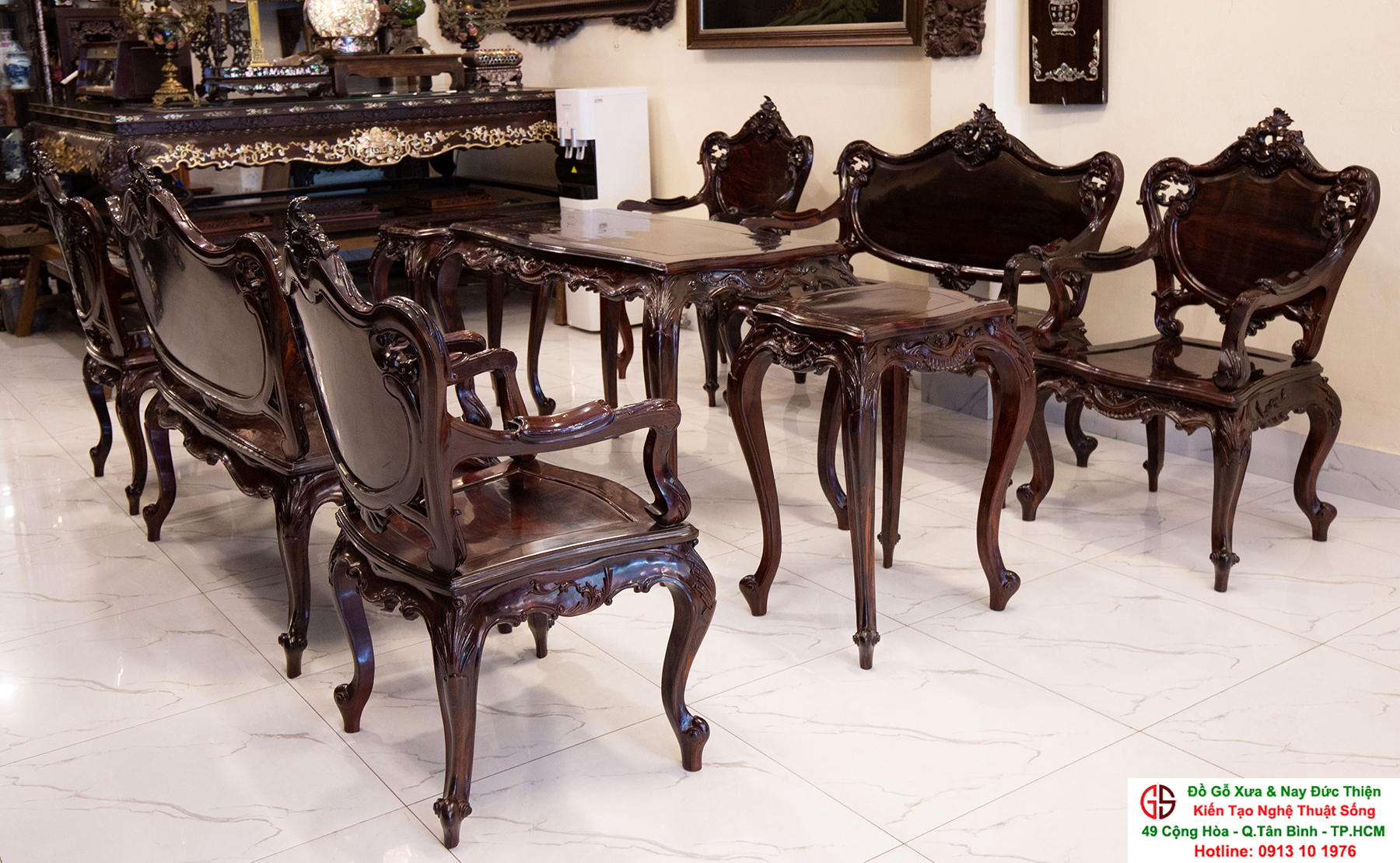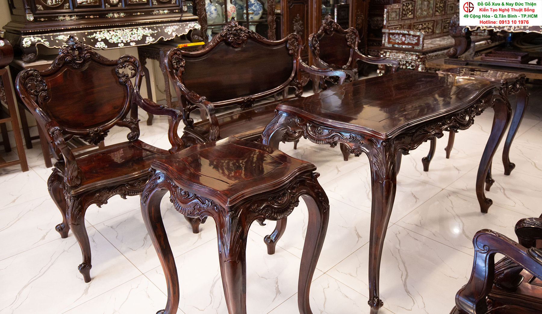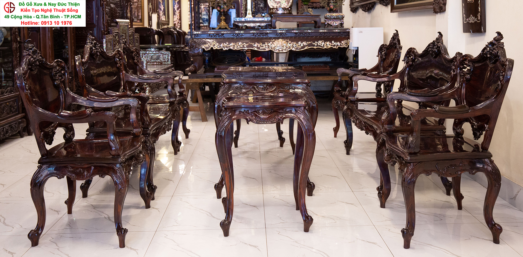 - Bàn ghế Louis, đôn trống gỗ trắc, bộ bàn ăn cẩn ốc, bàn ghế phương kỷ, bàn trung đường cẩn ốc xà cừ