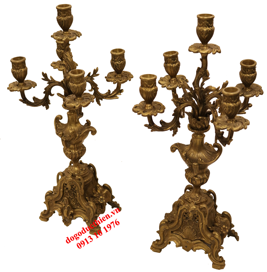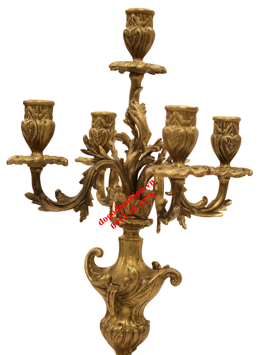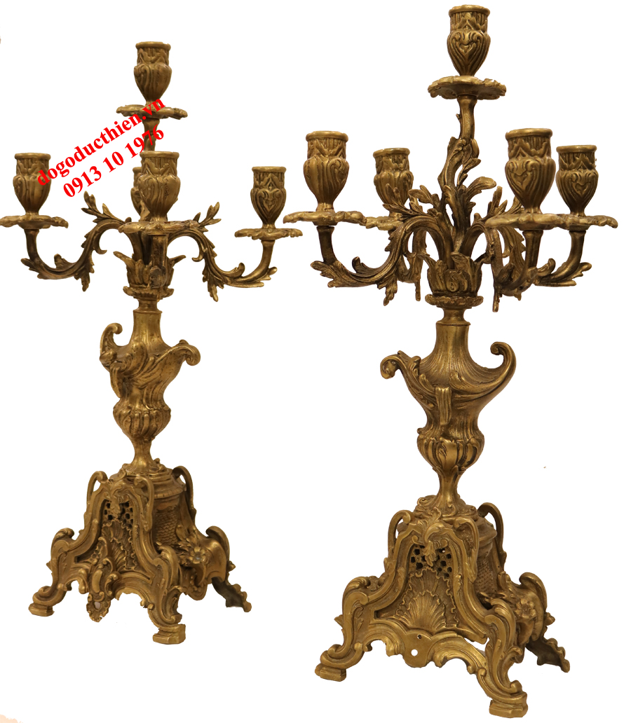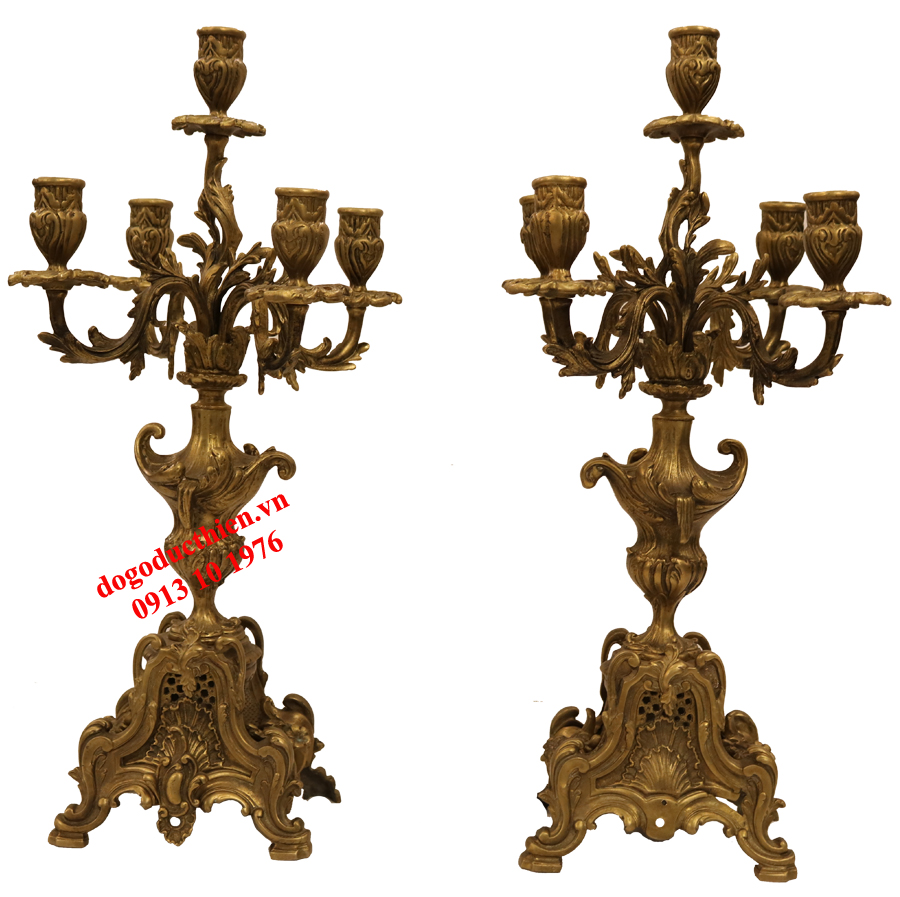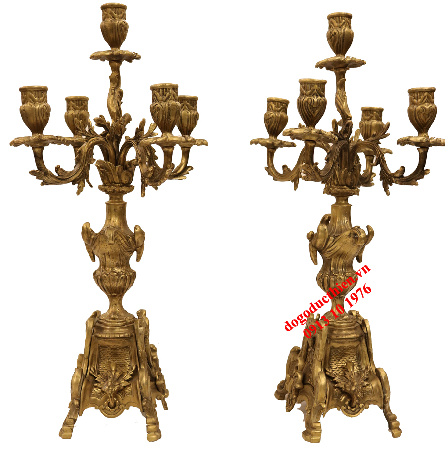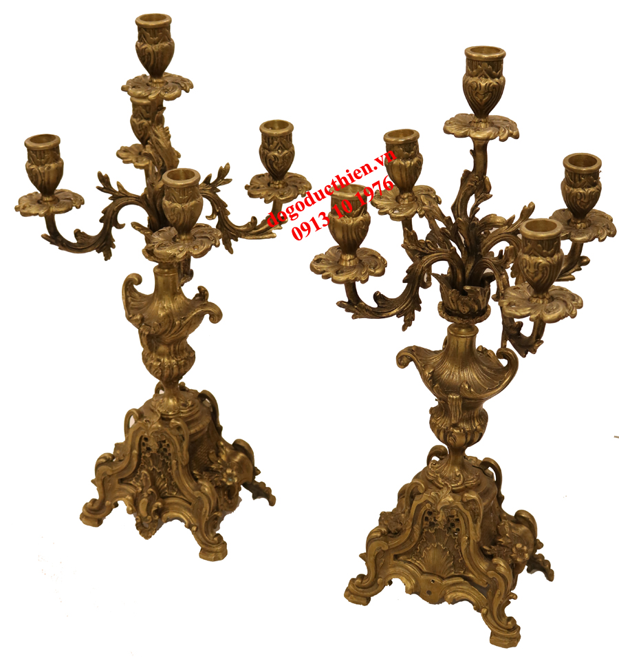 Đồ gỗ Đức Thiện xin giao lưu với các bác cặp chân đèn phong cách Pháp. Cổ đèn và chân đèn được chạm hoa lá tây rất cầu kỳ và tinh xảo, bên trên gồm có 4 ngọn nến và 1 ngọn ở trung tâm tổng cộng là 5 ngọn. Sản phẩm được đúc từ 100% đồng nguyên chất rất bền và đẹp . Là một món đồ quý trang trí trong phòng khách của bạn.