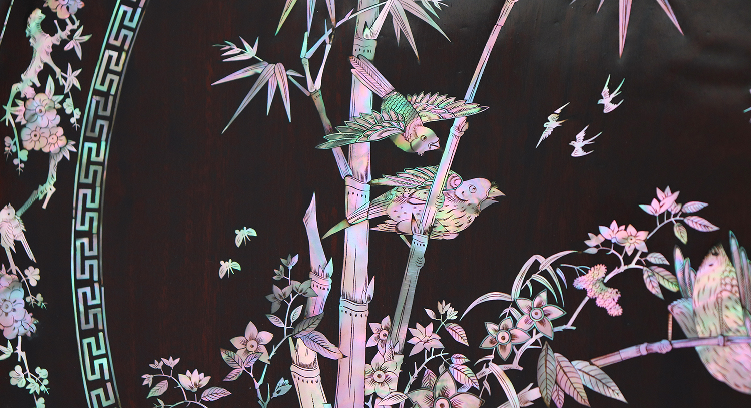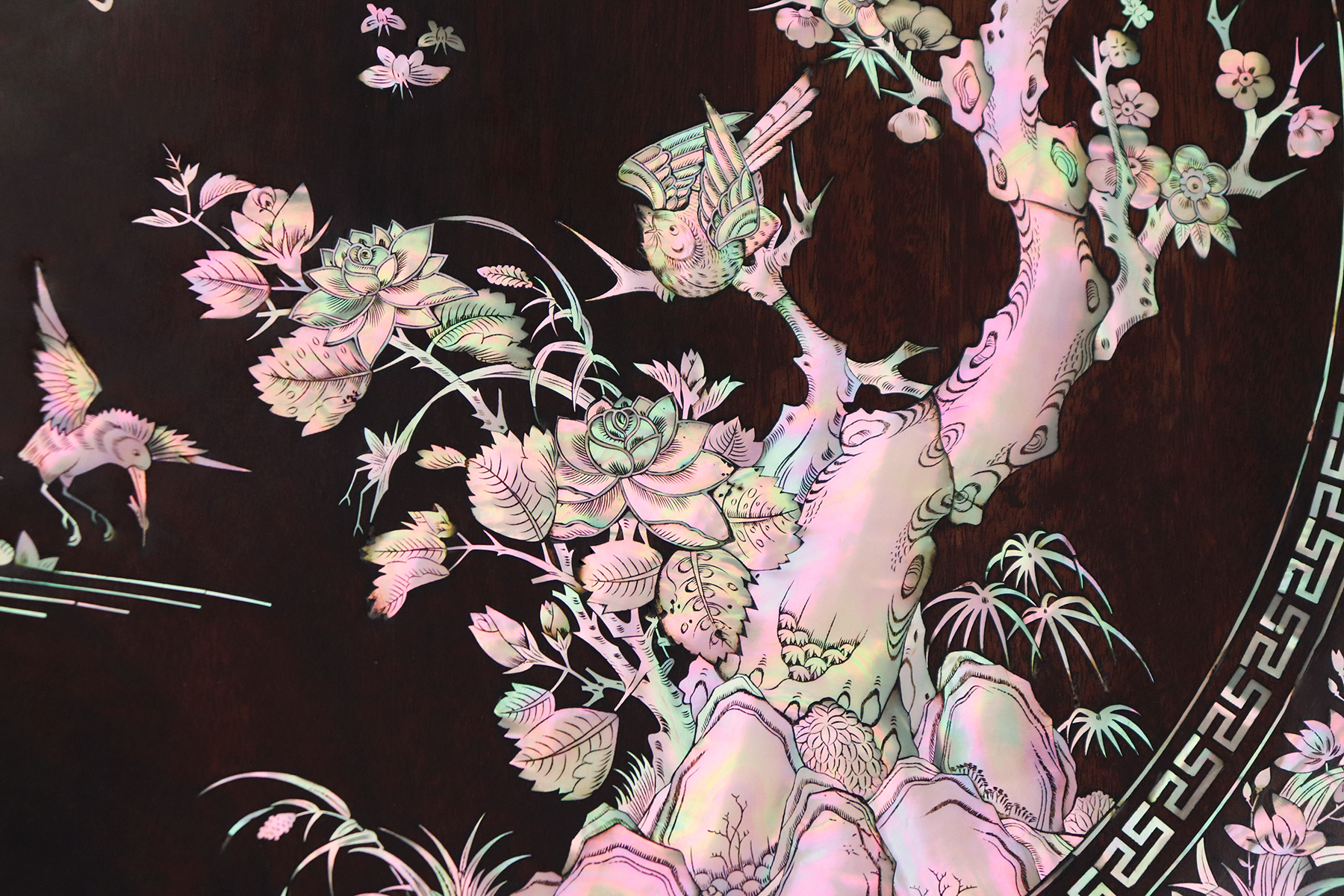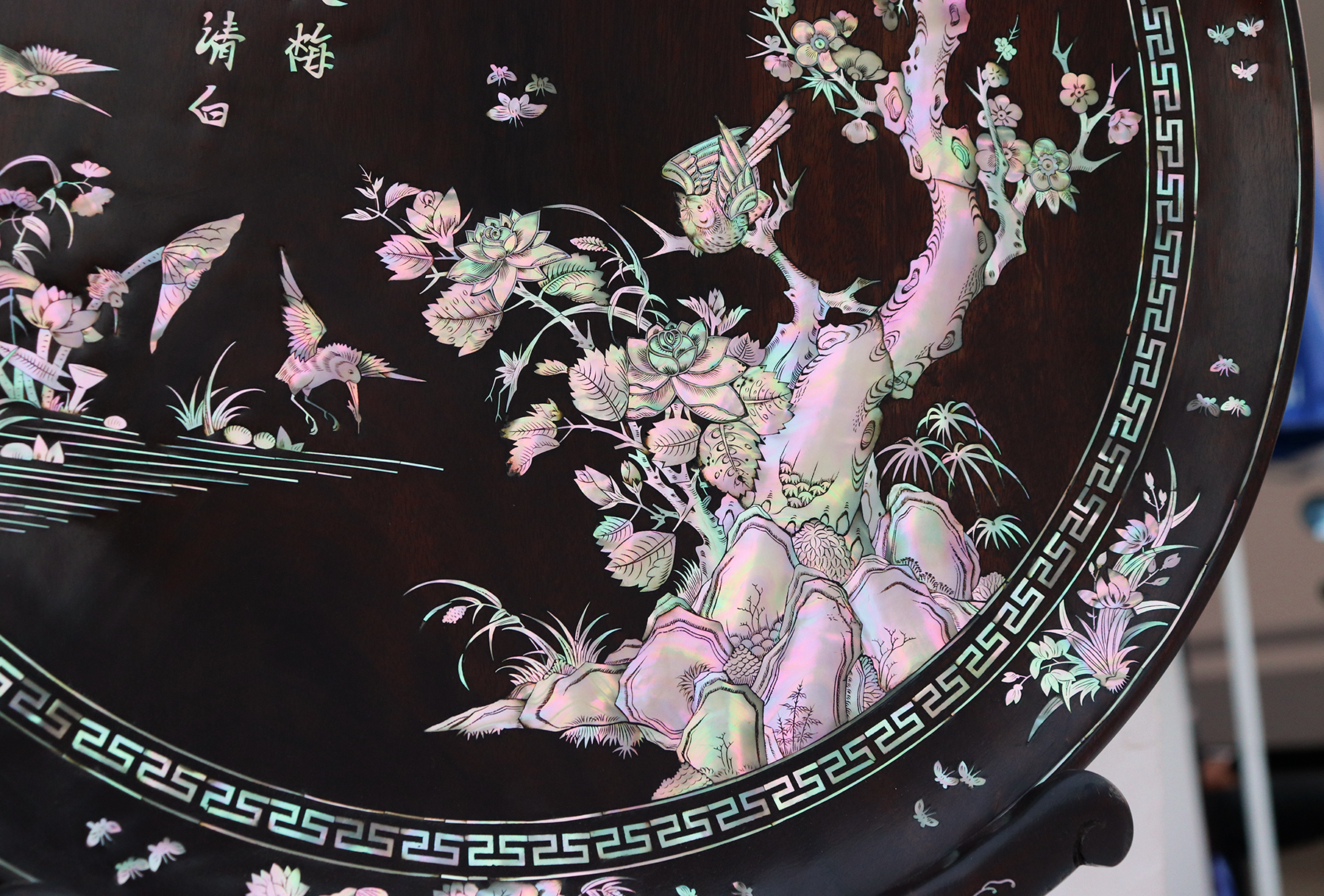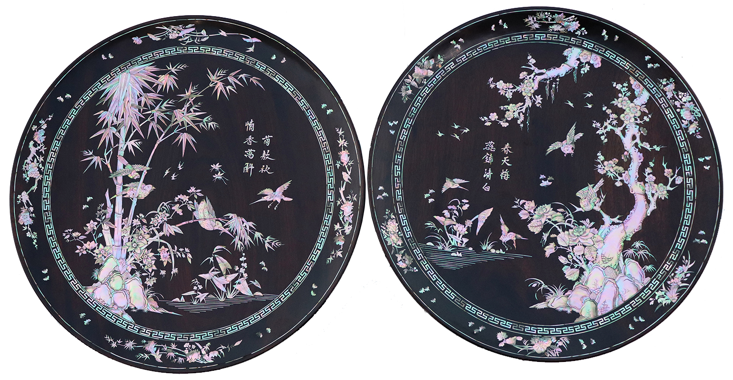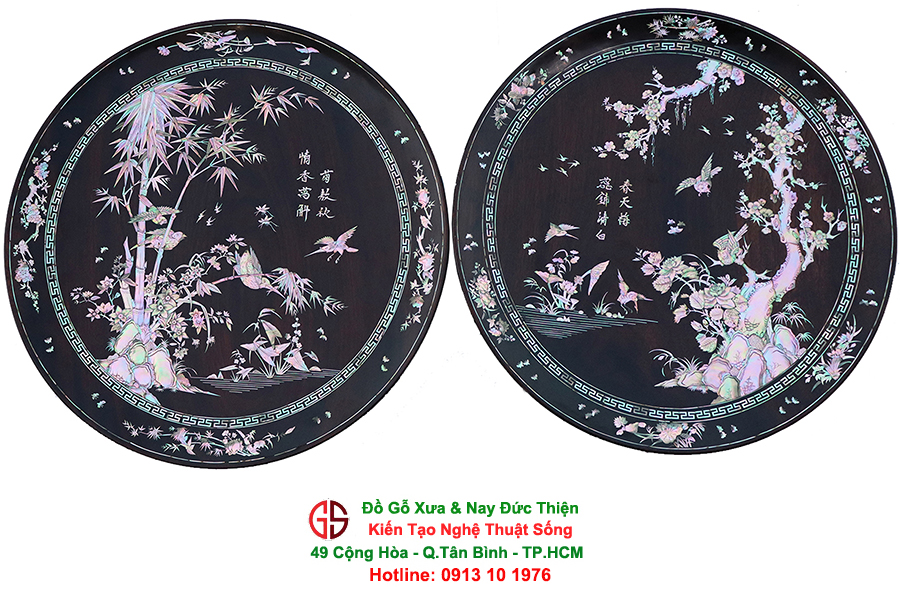 Mỗi món đồ khảm ốc luôn chất chứa những tâm huyết của người nghệ nhân. Với đôi đĩa khảm trúc mai sum họp một nhà này là một tuyệt tác điển hình