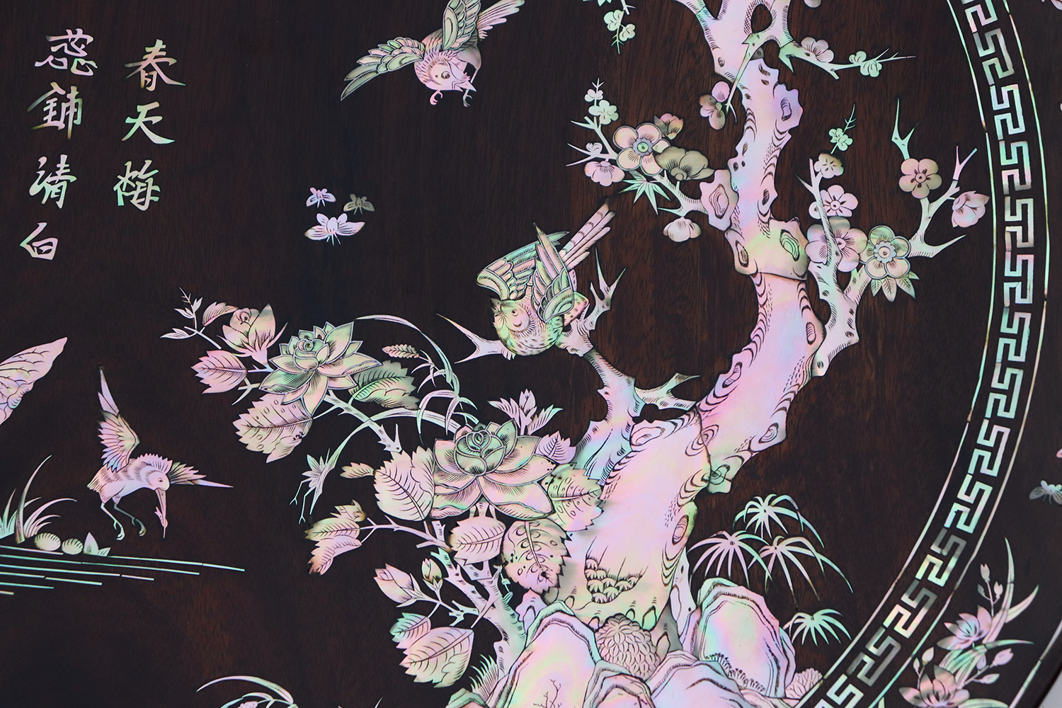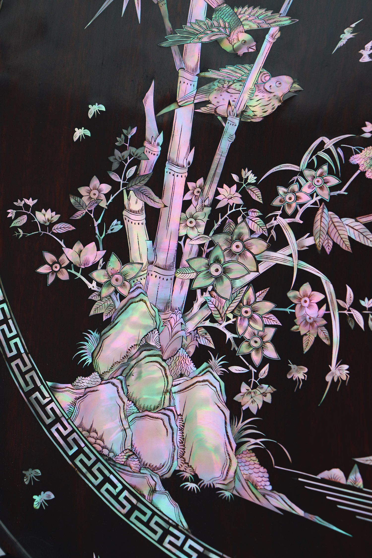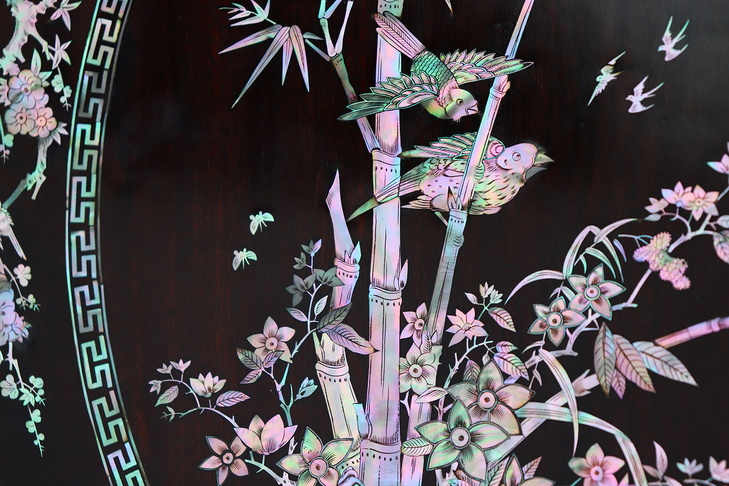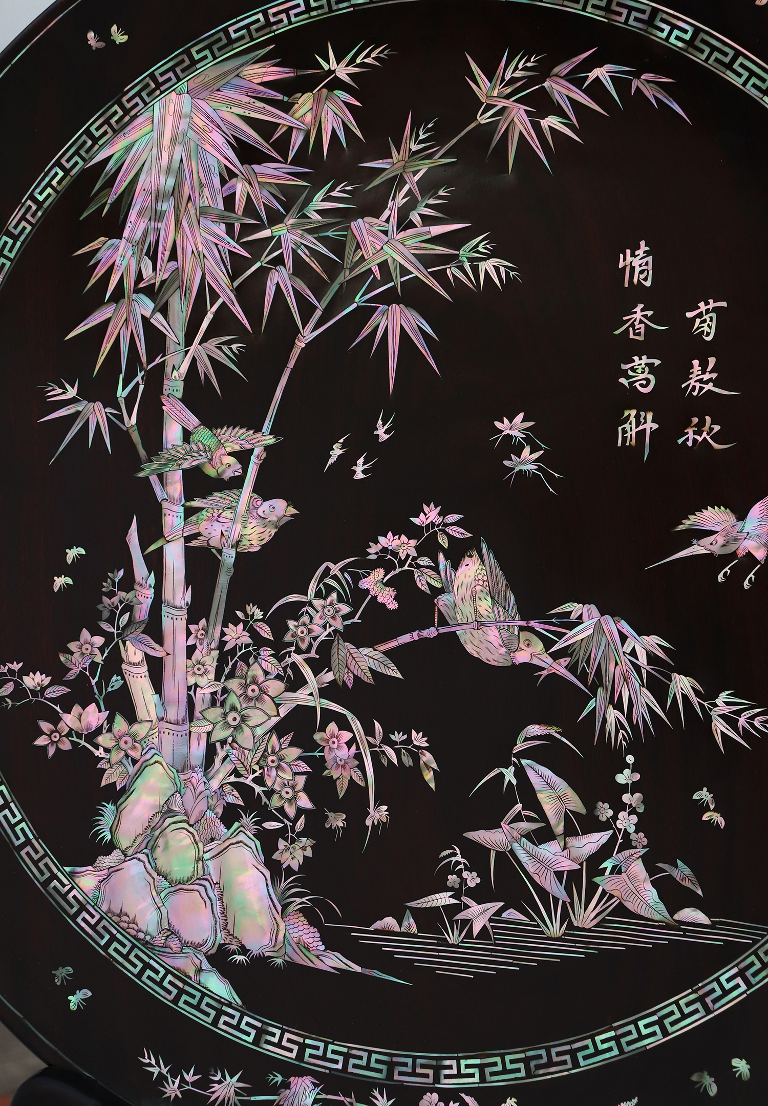 Mỗi món đồ khảm ốc luôn chất chứa những tâm huyết của người nghệ nhân. Với đôi đĩa khảm trúc mai sum họp một nhà này là một tuyệt tác điển hình