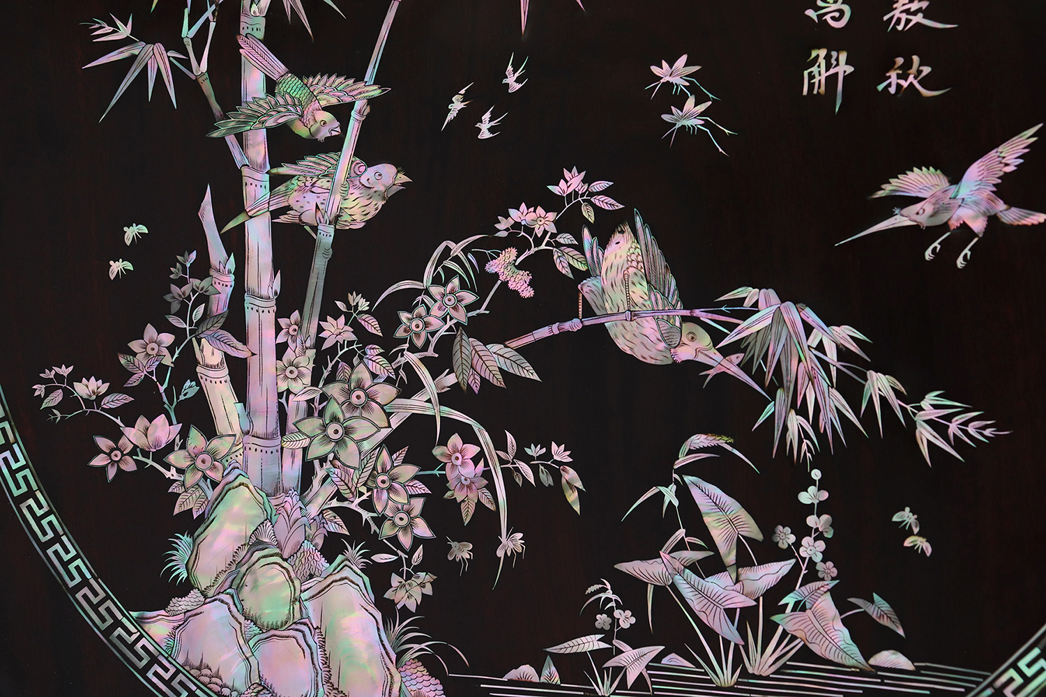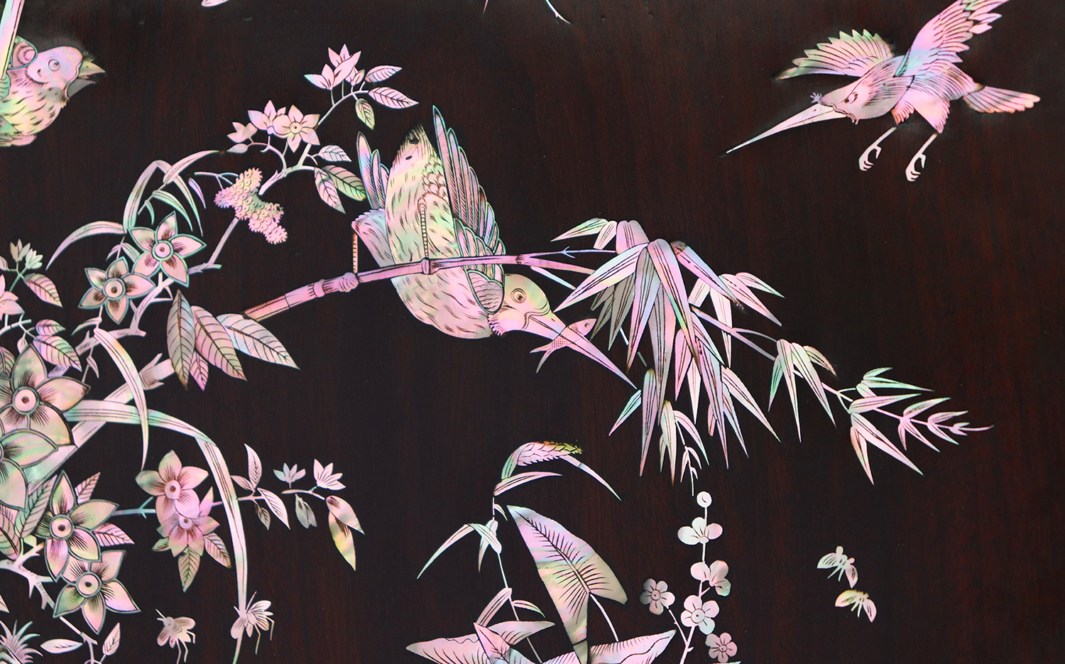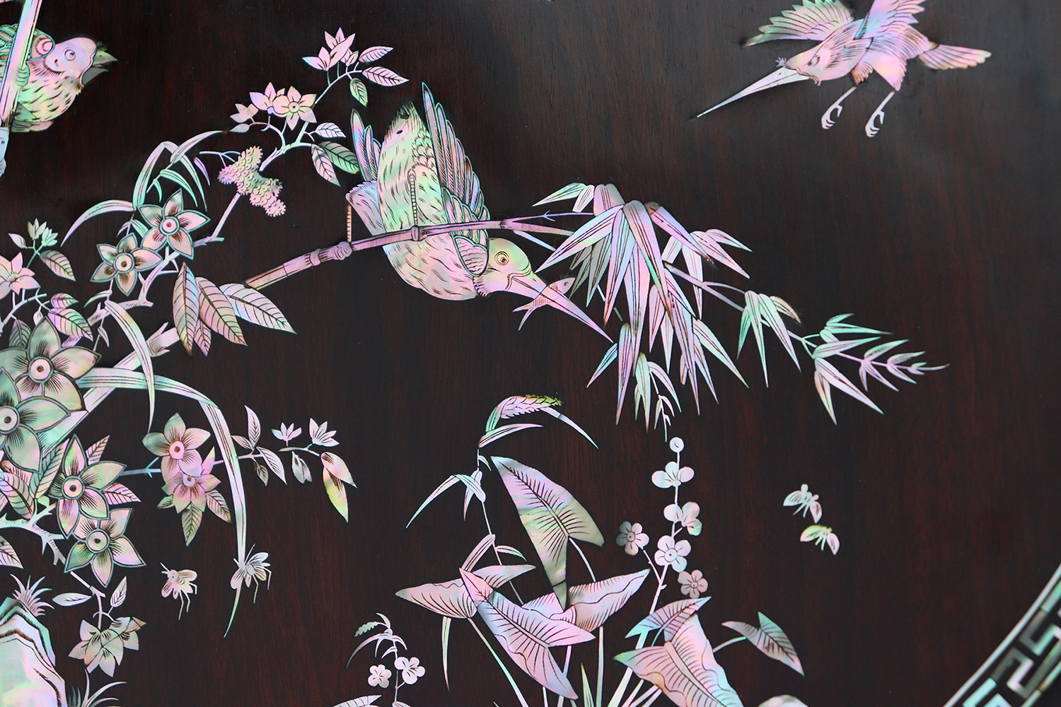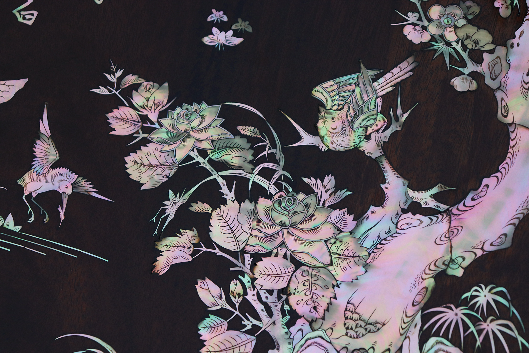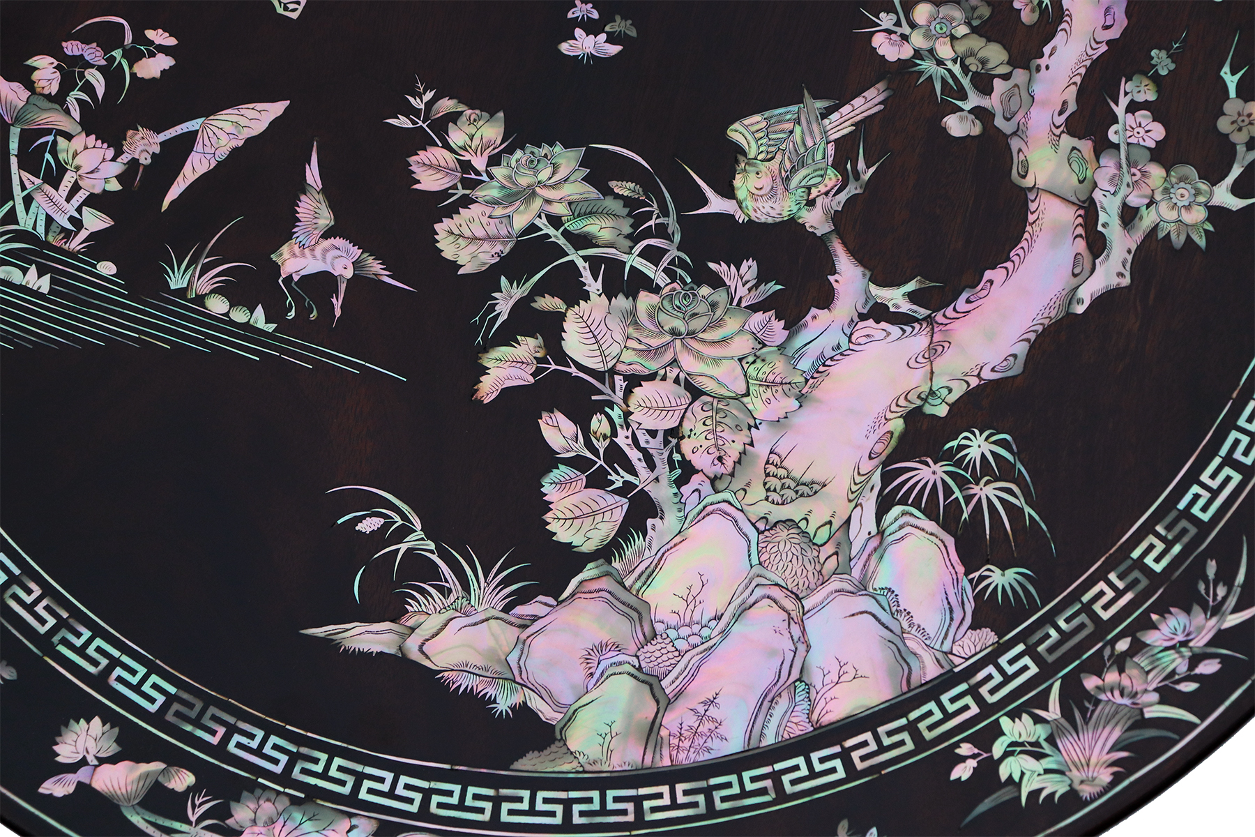 Mỗi món đồ khảm ốc luôn chất chứa những tâm huyết của người nghệ nhân. Với đôi đĩa khảm trúc mai sum họp một nhà này là một tuyệt tác điển hình