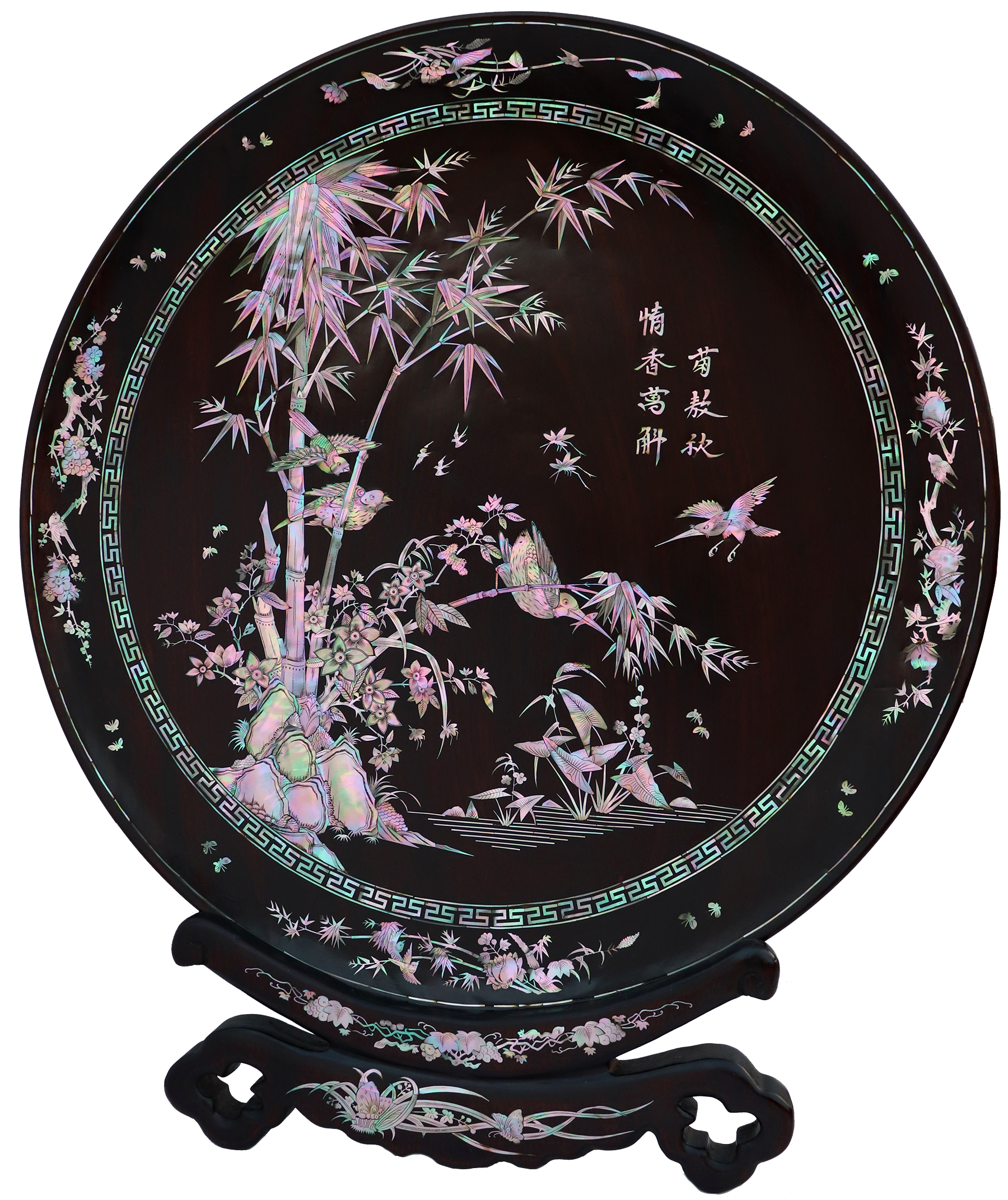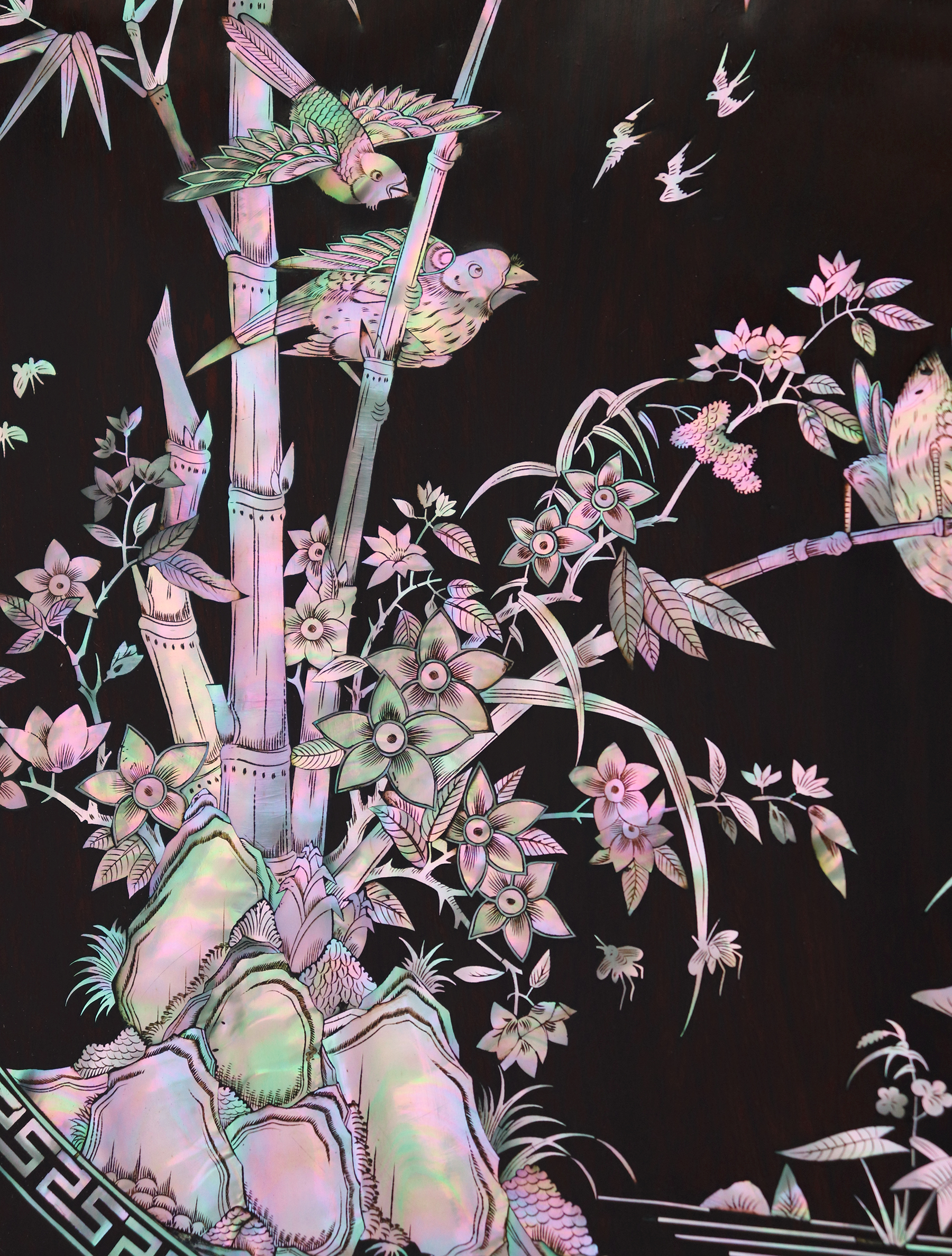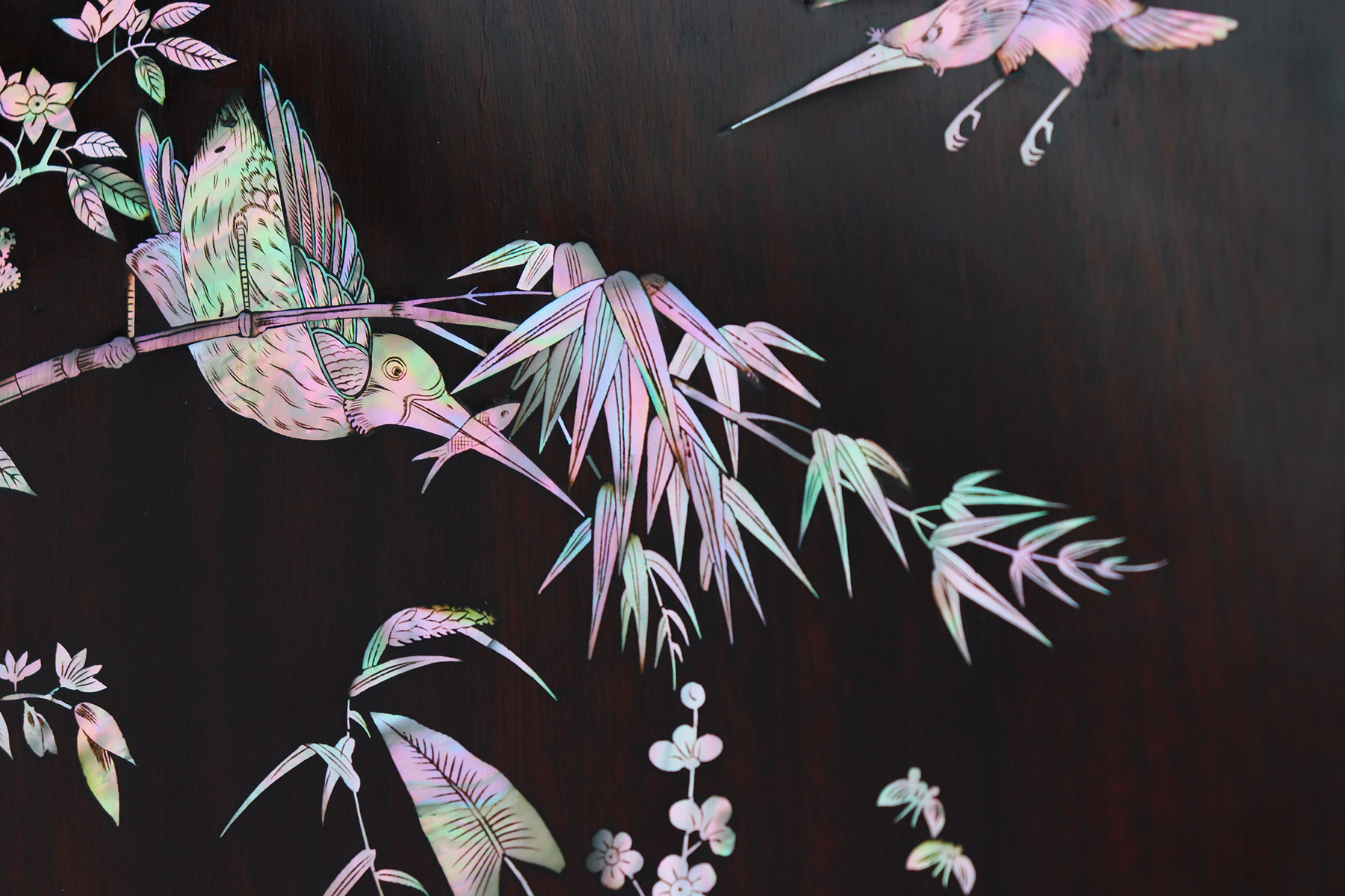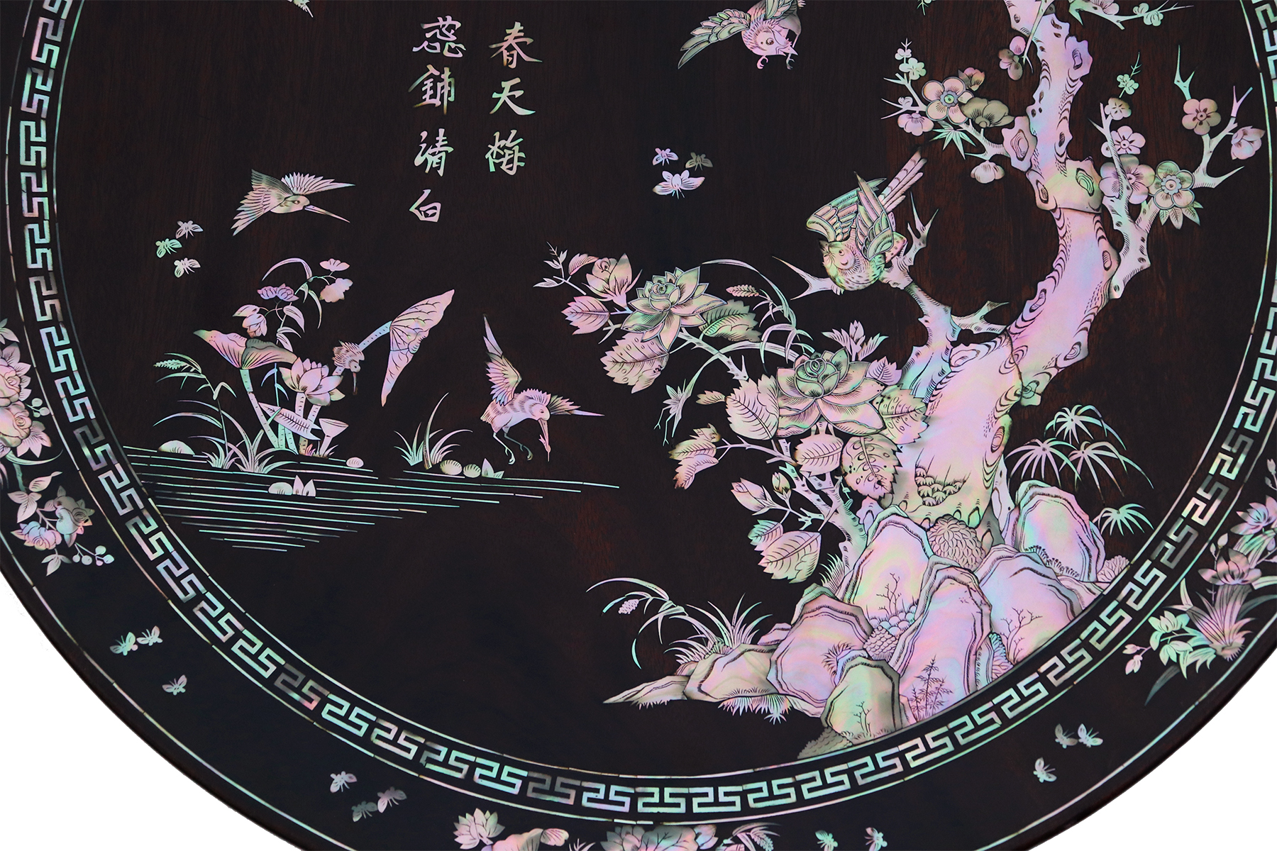Mỗi món đồ khảm ốc luôn chất chứa những tâm huyết của người nghệ nhân. Với đôi đĩa khảm trúc mai sum họp một nhà này là một tuyệt tác điển hình