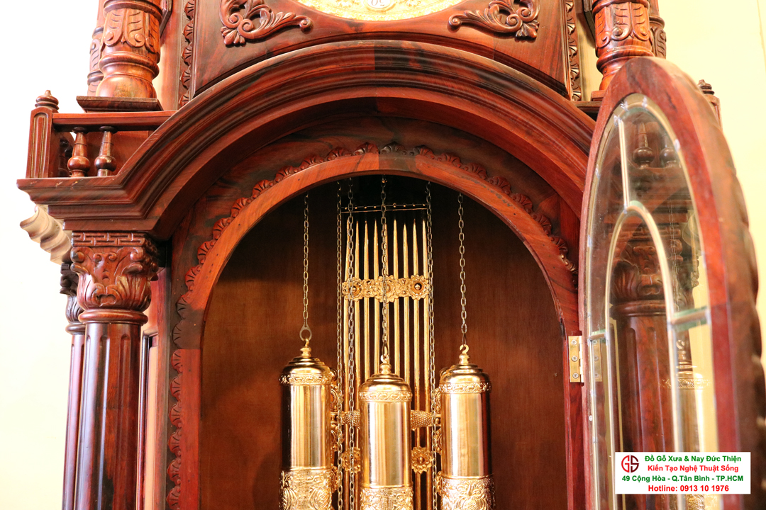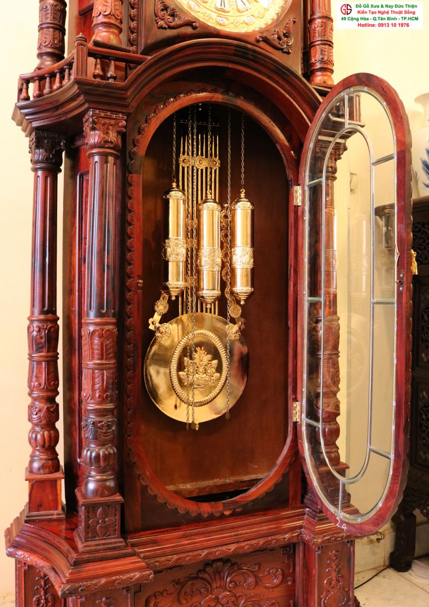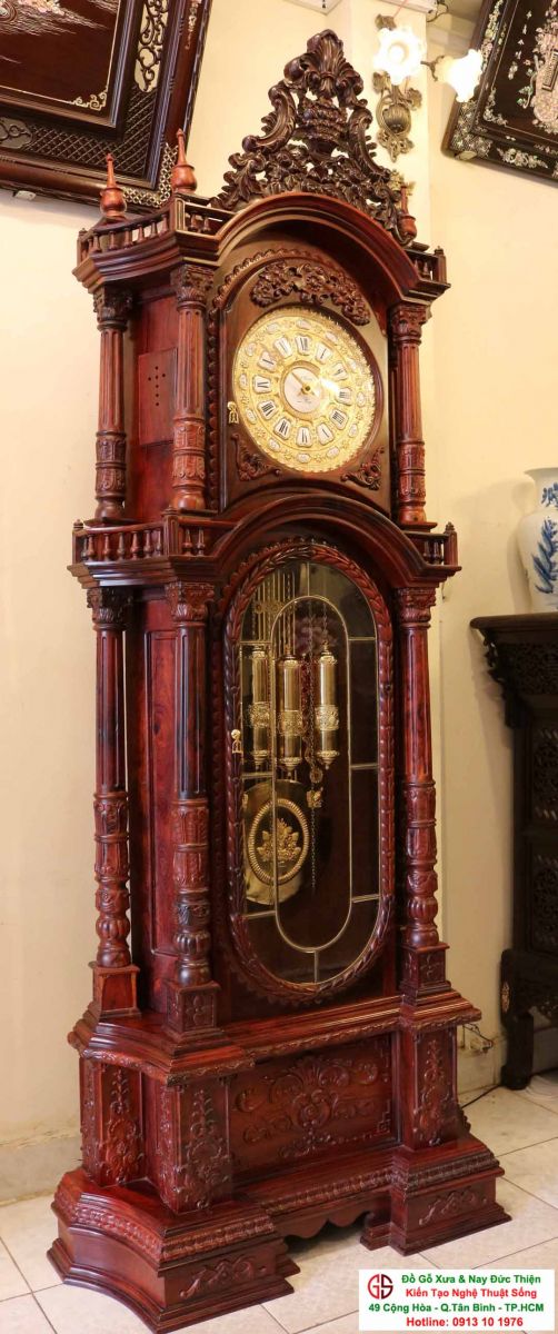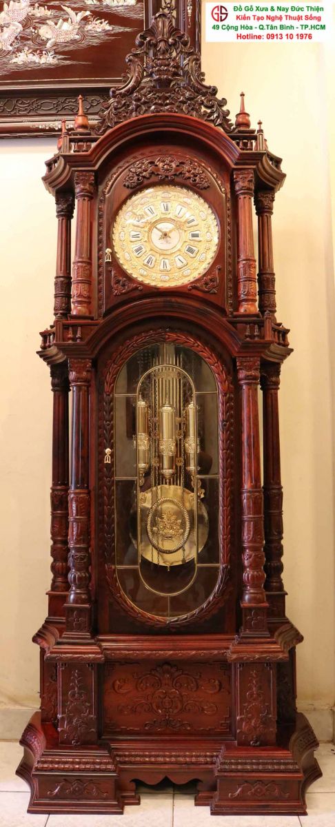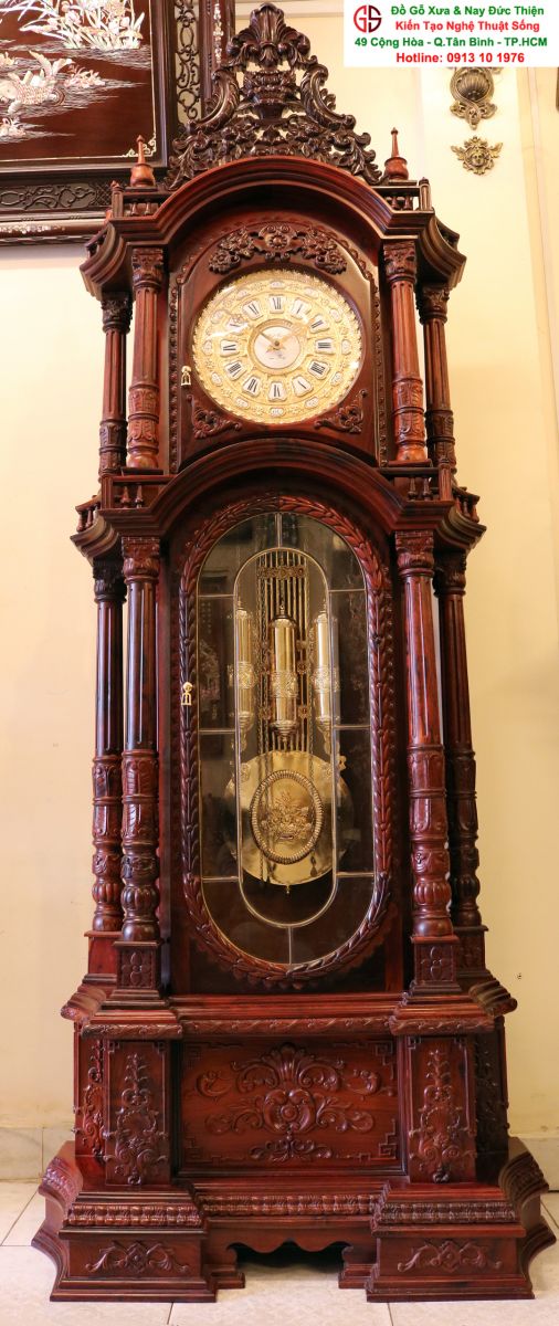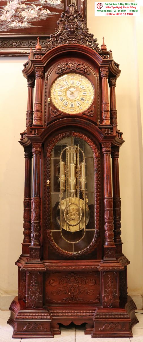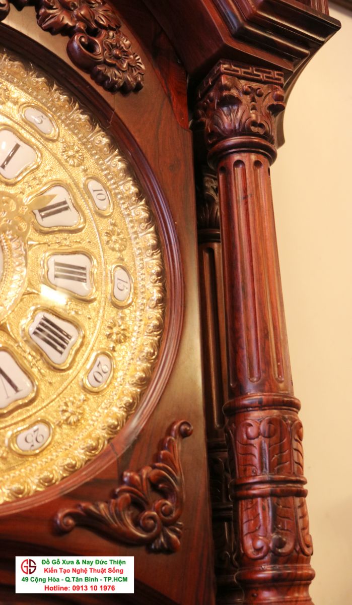 Với nhiều năm kinh nghiệm kinh doanh và sưu tầm những món đồ nội thất gỗ cao cấp, đồng hồ theo kiểu xưa, hôm nay, Đồ Gỗ Đức Thiện đã chọn lọc rất kỹ và xin gửi tới quý khách hàng một "siêu phẩm " hàng hiếm - Chiếc đồng hồ tủ loại VIP. Chiếc đồng hồ tủ loại lớn này là sự hội tụ những gì đẹp nhất, quý giá nhất, tinh túy nhất. Tủ đồng hồ được đóng hoàn toàn từ loại gỗ lõi của cây Cẩm Lai Việt ( Vân đẹp như vân gỗ Trắc ). Máy được sử dụng là dòng máy lớn được nhập khẩu từ Đức - chạy ổn định. Toàn bộ phần mặt đồng hồ, quả lắc, tạ đều được mạ vàng 24K, đẹp, sang trọng và đẳng cấp.