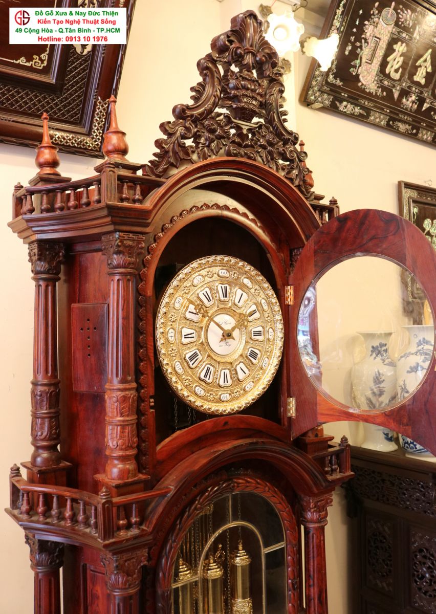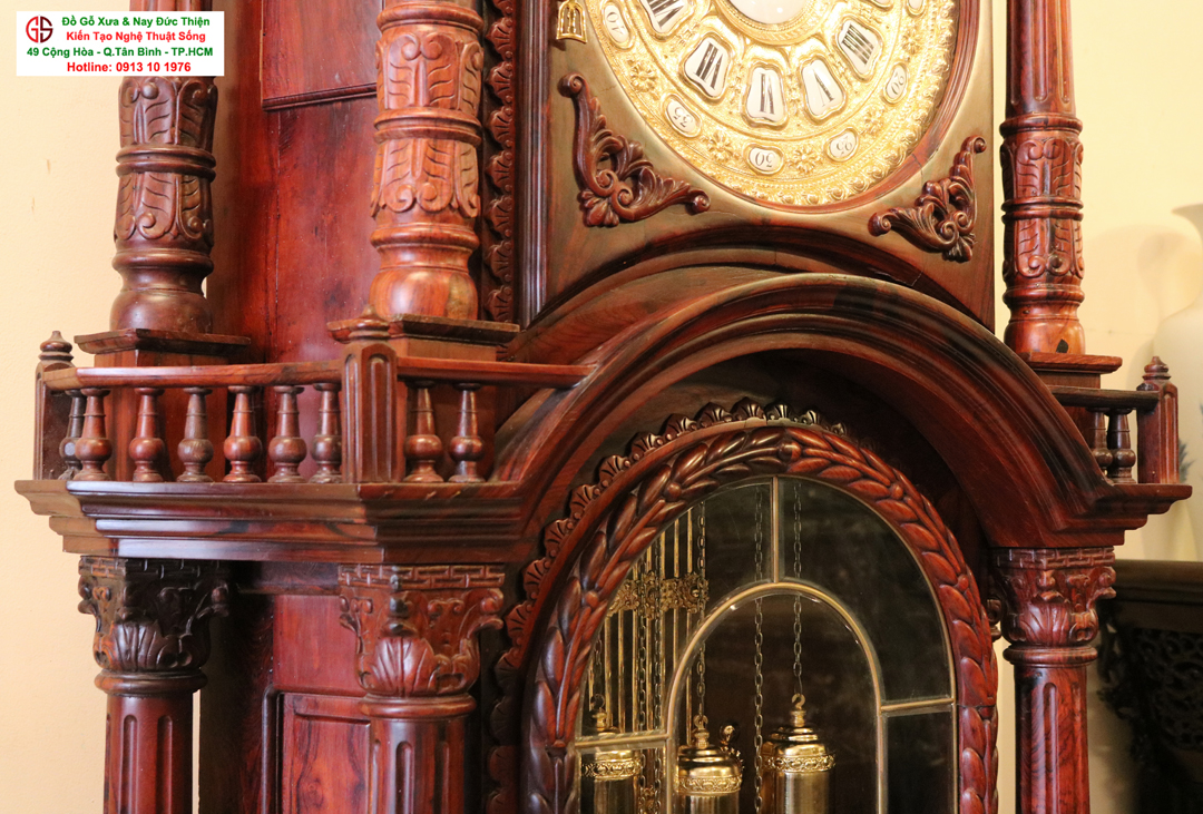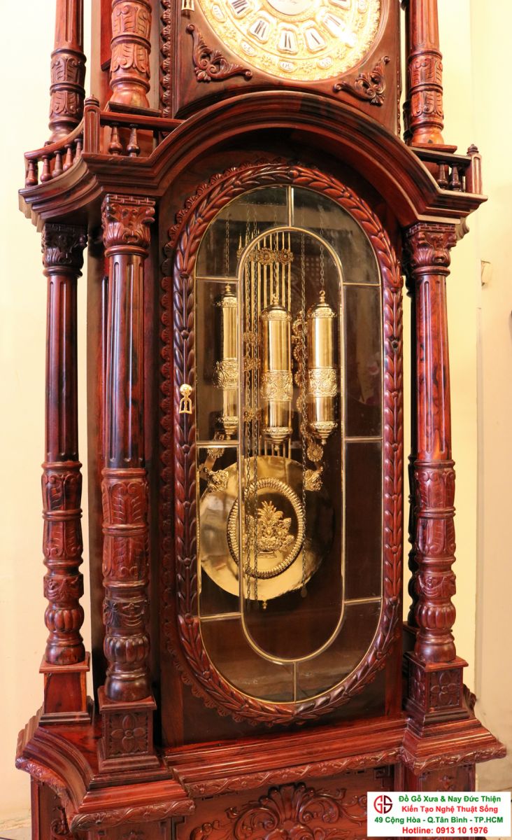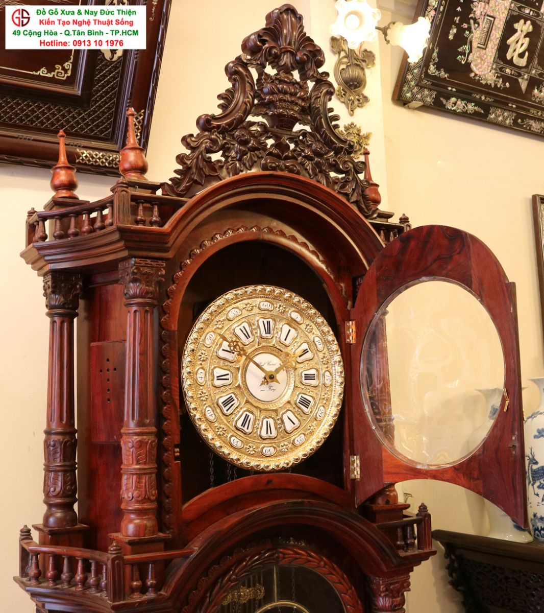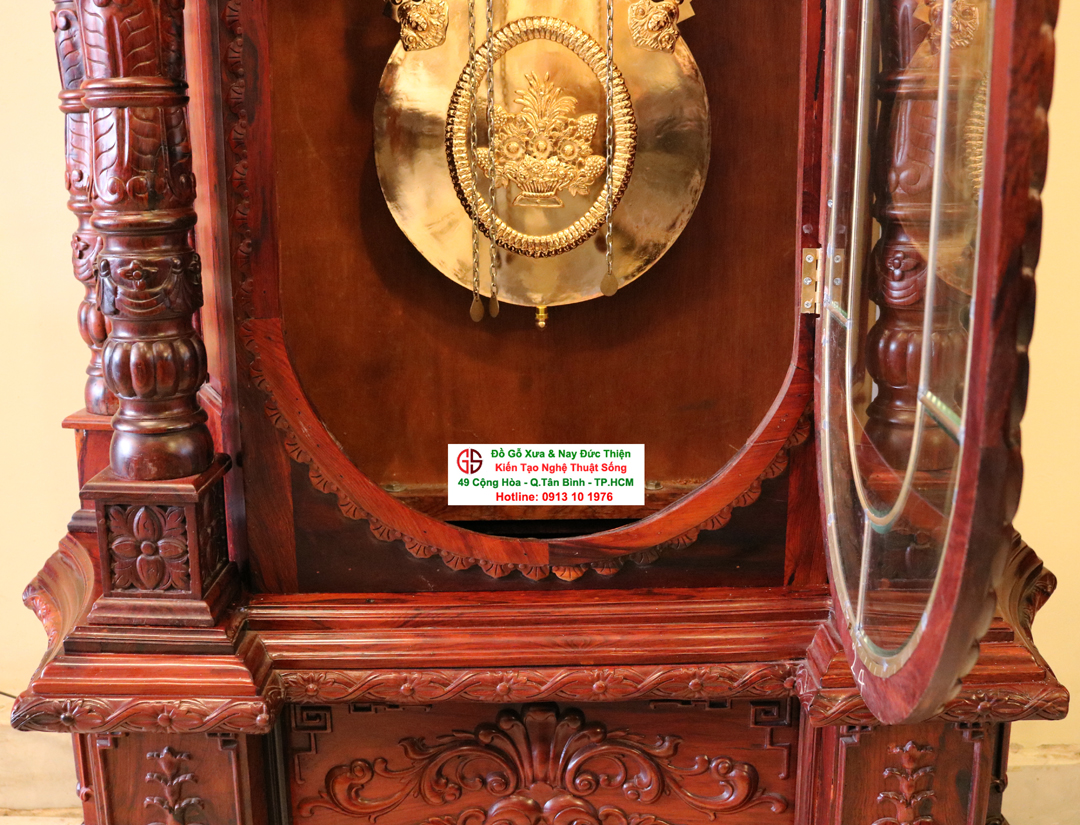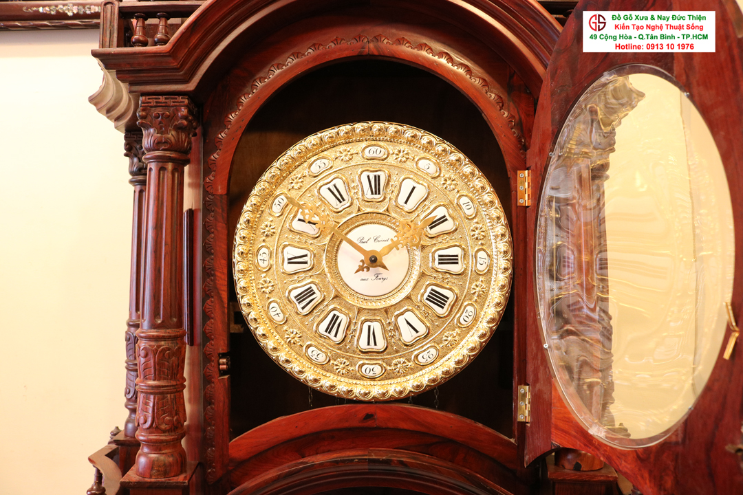 Với nhiều năm kinh nghiệm kinh doanh và sưu tầm những món đồ nội thất gỗ cao cấp, đồng hồ theo kiểu xưa, hôm nay, Đồ Gỗ Đức Thiện đã chọn lọc rất kỹ và xin gửi tới quý khách hàng một "siêu phẩm " hàng hiếm - Chiếc đồng hồ tủ loại VIP. Chiếc đồng hồ tủ loại lớn này là sự hội tụ những gì đẹp nhất, quý giá nhất, tinh túy nhất. Tủ đồng hồ được đóng hoàn toàn từ loại gỗ lõi của cây Cẩm Lai Việt ( Vân đẹp như vân gỗ Trắc ). Máy được sử dụng là dòng máy lớn được nhập khẩu từ Đức - chạy ổn định. Toàn bộ phần mặt đồng hồ, quả lắc, tạ đều được mạ vàng 24K, đẹp, sang trọng và đẳng cấp.