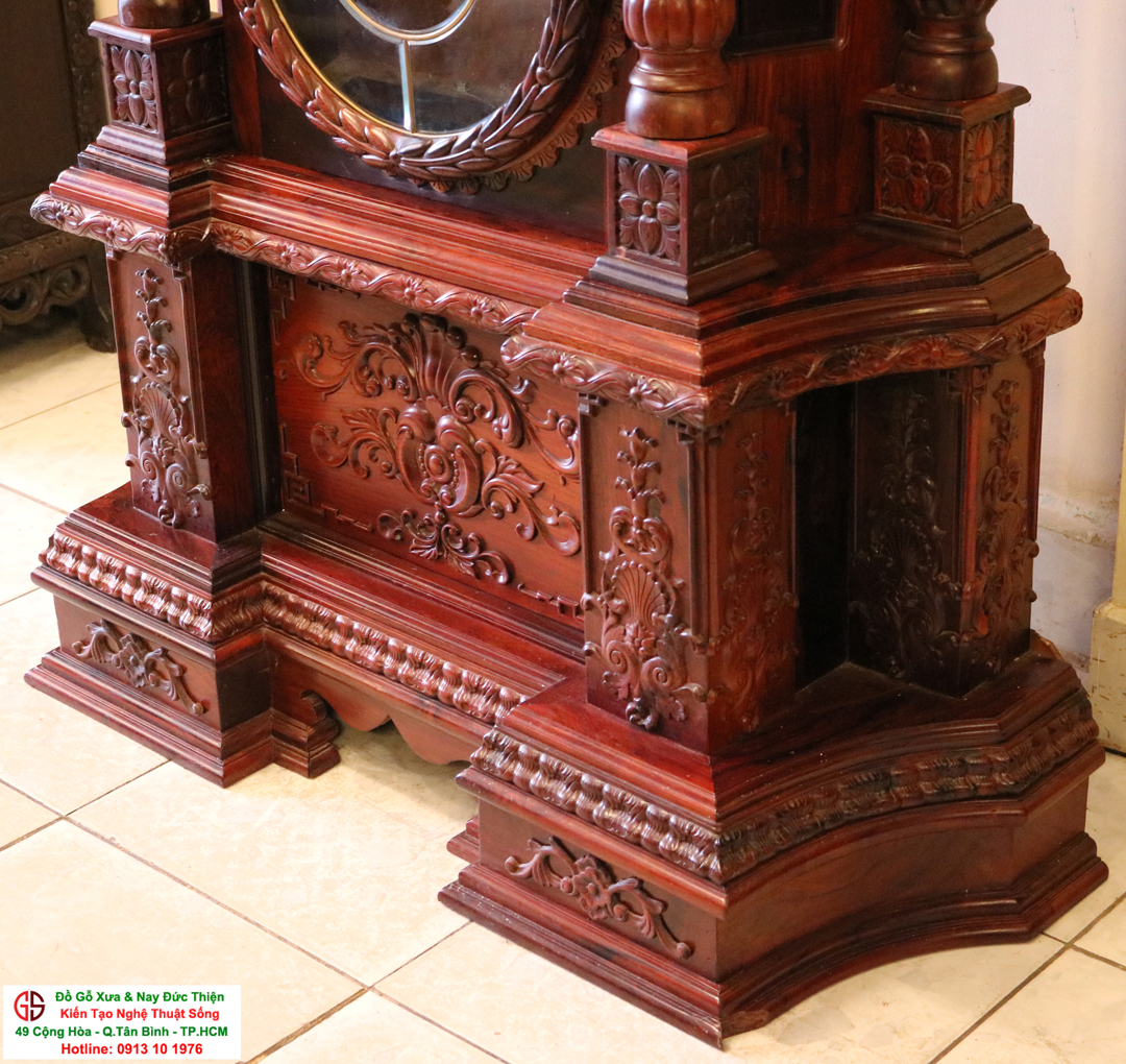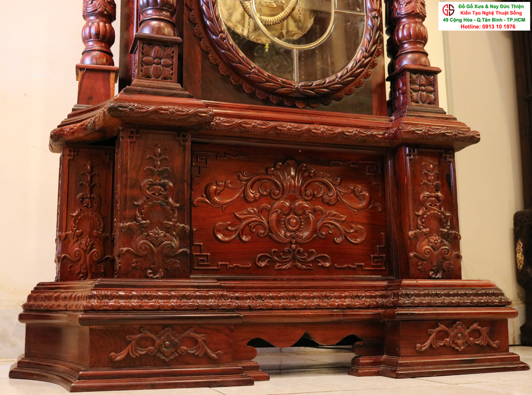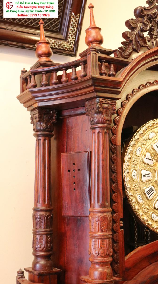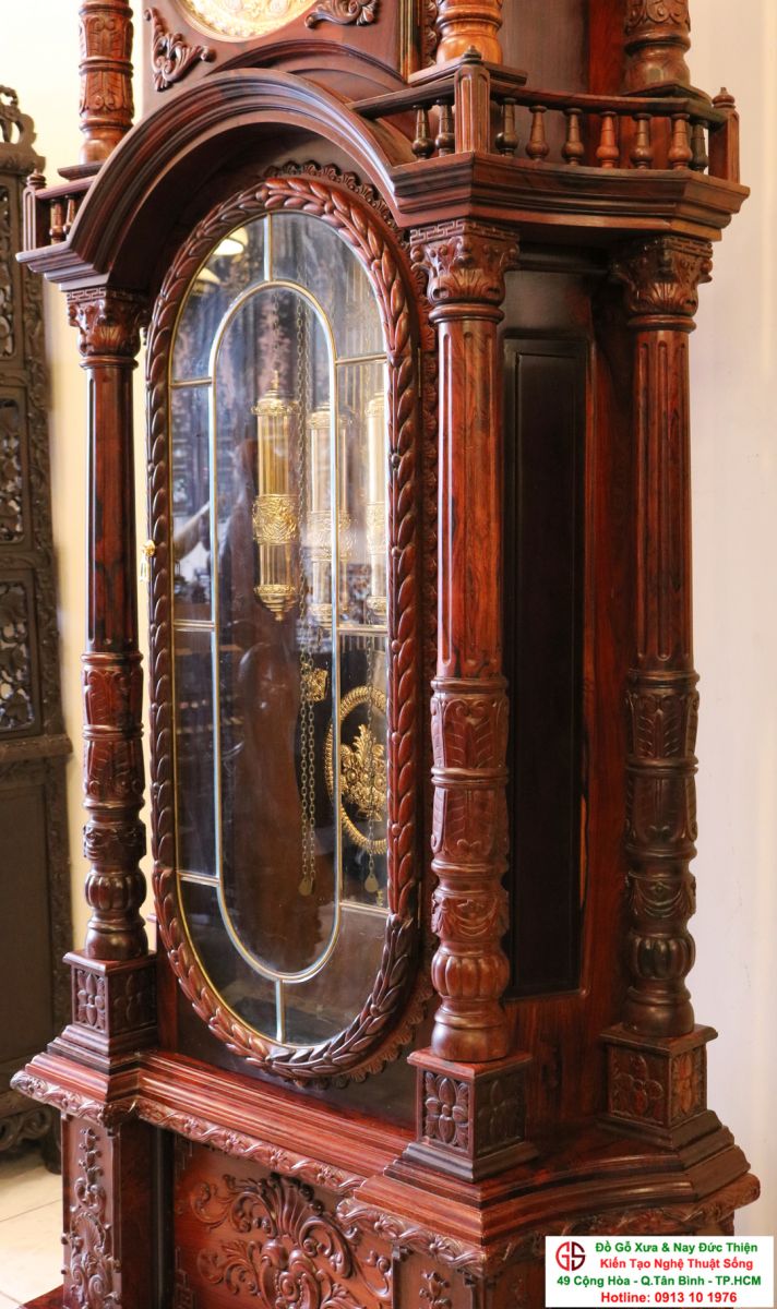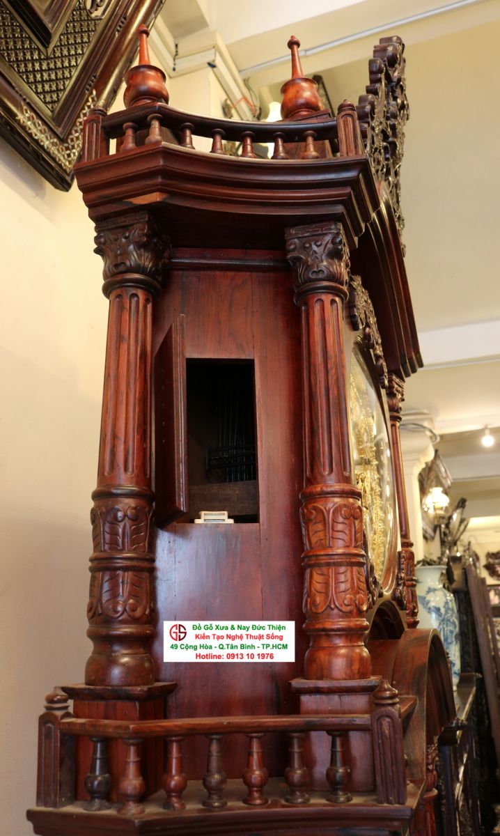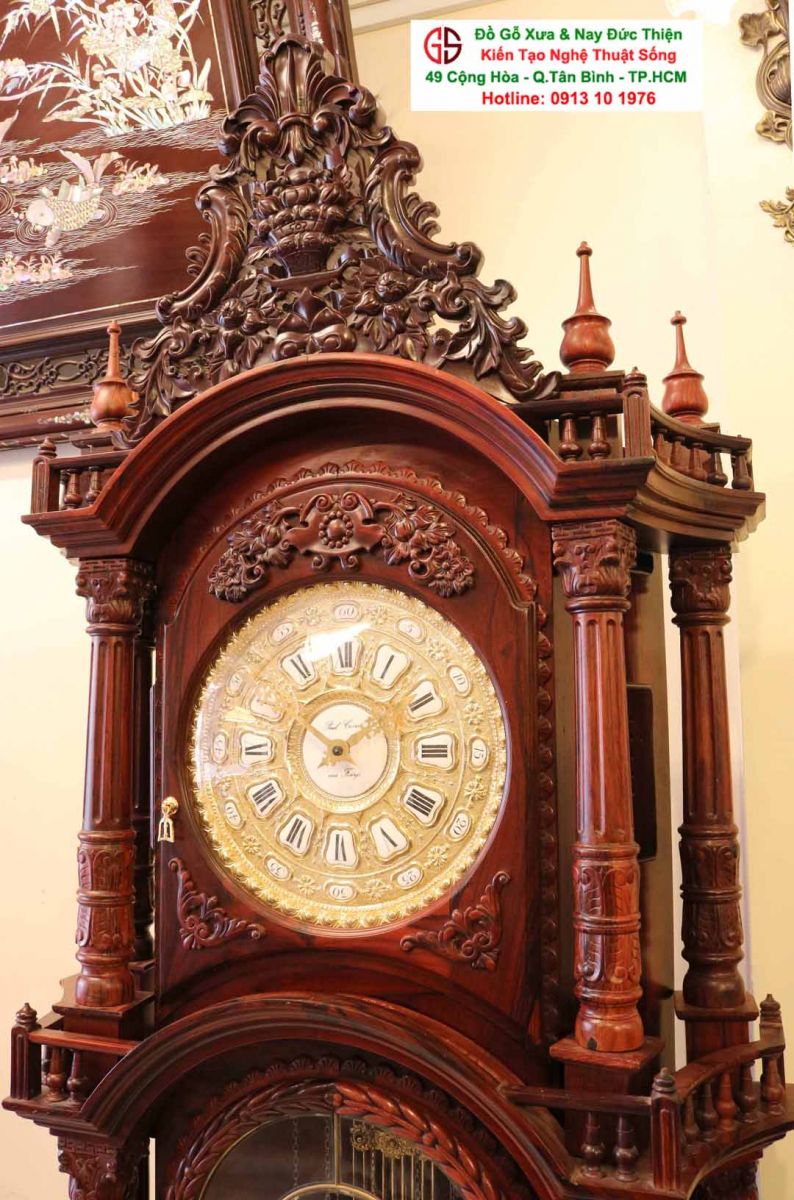 Với nhiều năm kinh nghiệm kinh doanh và sưu tầm những món đồ nội thất gỗ cao cấp, đồng hồ theo kiểu xưa, hôm nay, Đồ Gỗ Đức Thiện đã chọn lọc rất kỹ và xin gửi tới quý khách hàng một "siêu phẩm " hàng hiếm - Chiếc đồng hồ tủ loại VIP. Chiếc đồng hồ tủ loại lớn này là sự hội tụ những gì đẹp nhất, quý giá nhất, tinh túy nhất. Tủ đồng hồ được đóng hoàn toàn từ loại gỗ lõi của cây Cẩm Lai Việt ( Vân đẹp như vân gỗ Trắc ). Máy được sử dụng là dòng máy lớn được nhập khẩu từ Đức - chạy ổn định. Toàn bộ phần mặt đồng hồ, quả lắc, tạ đều được mạ vàng 24K, đẹp, sang trọng và đẳng cấp.