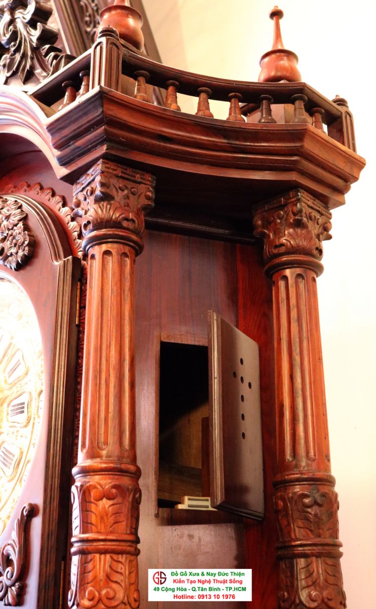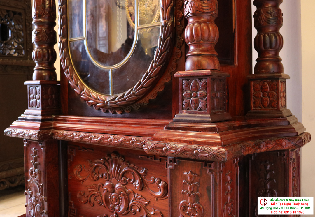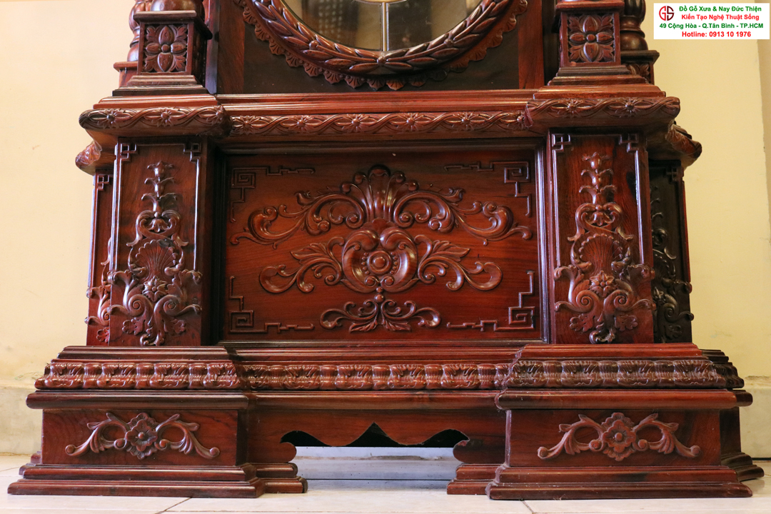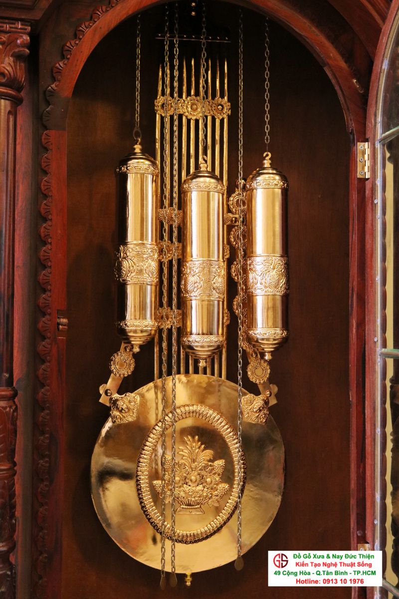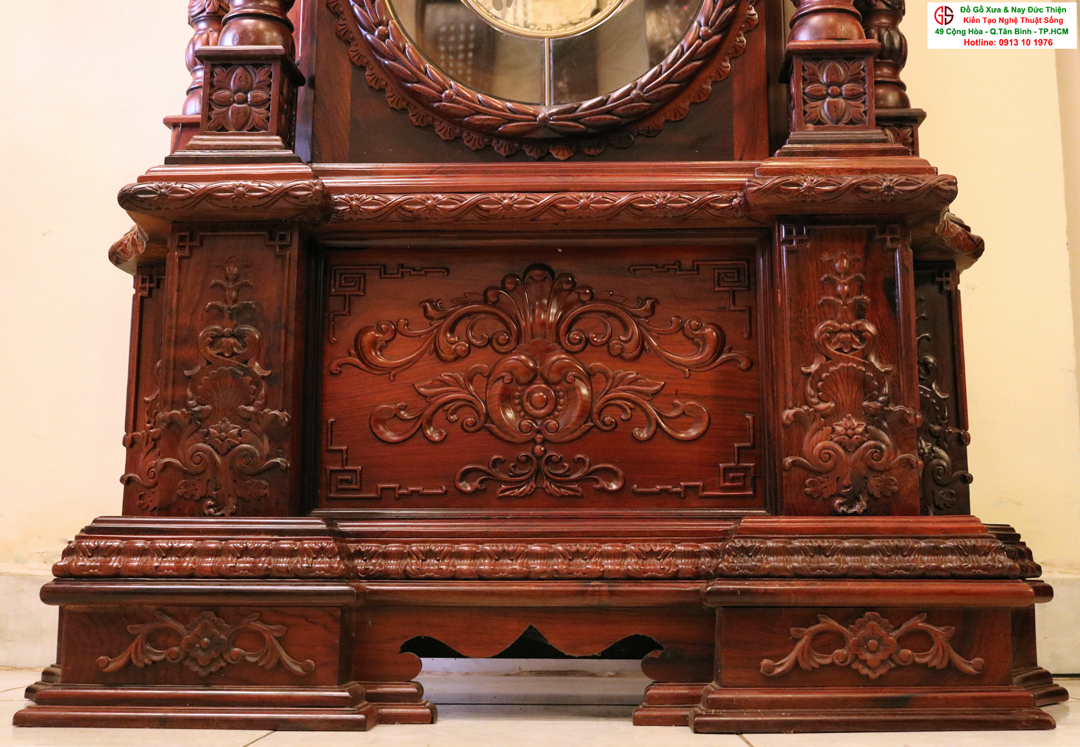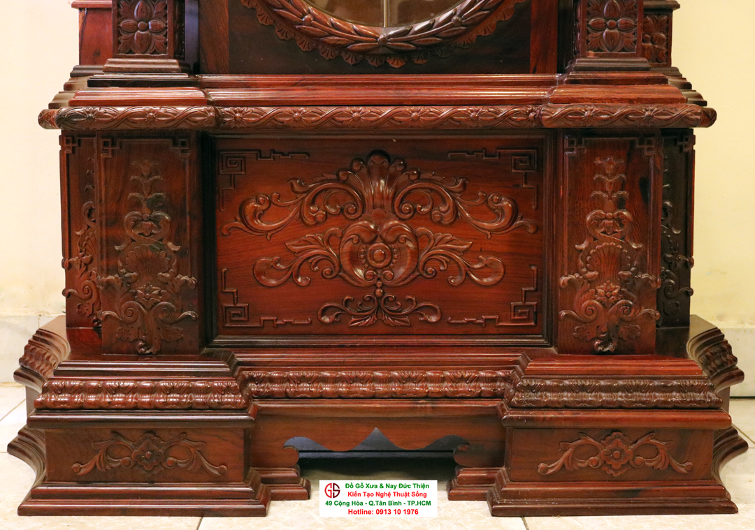 Với nhiều năm kinh nghiệm kinh doanh và sưu tầm những món đồ nội thất gỗ cao cấp, đồng hồ theo kiểu xưa, hôm nay, Đồ Gỗ Đức Thiện đã chọn lọc rất kỹ và xin gửi tới quý khách hàng một "siêu phẩm " hàng hiếm - Chiếc đồng hồ tủ loại VIP. Chiếc đồng hồ tủ loại lớn này là sự hội tụ những gì đẹp nhất, quý giá nhất, tinh túy nhất. Tủ đồng hồ được đóng hoàn toàn từ loại gỗ lõi của cây Cẩm Lai Việt ( Vân đẹp như vân gỗ Trắc ). Máy được sử dụng là dòng máy lớn được nhập khẩu từ Đức - chạy ổn định. Toàn bộ phần mặt đồng hồ, quả lắc, tạ đều được mạ vàng 24K, đẹp, sang trọng và đẳng cấp.