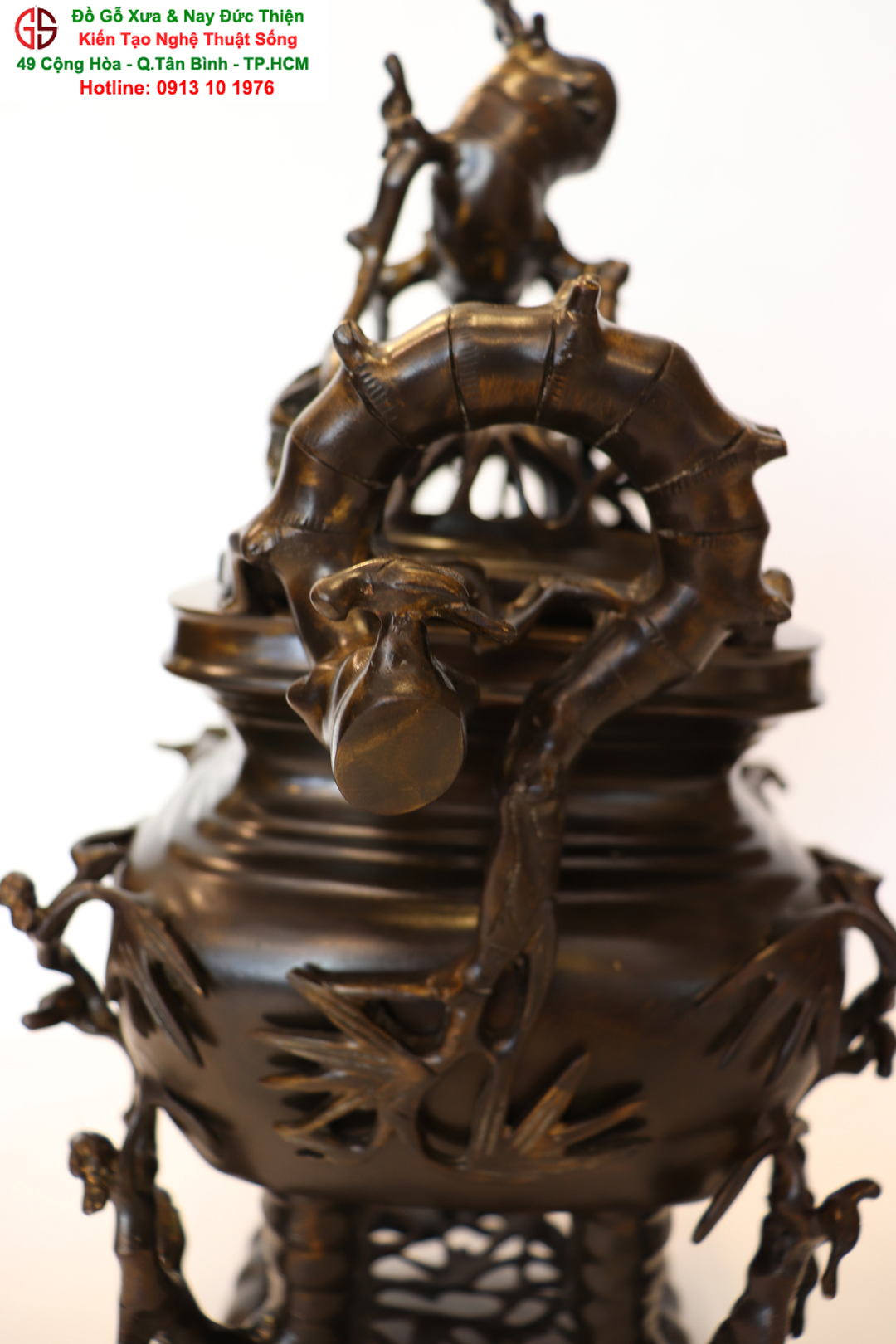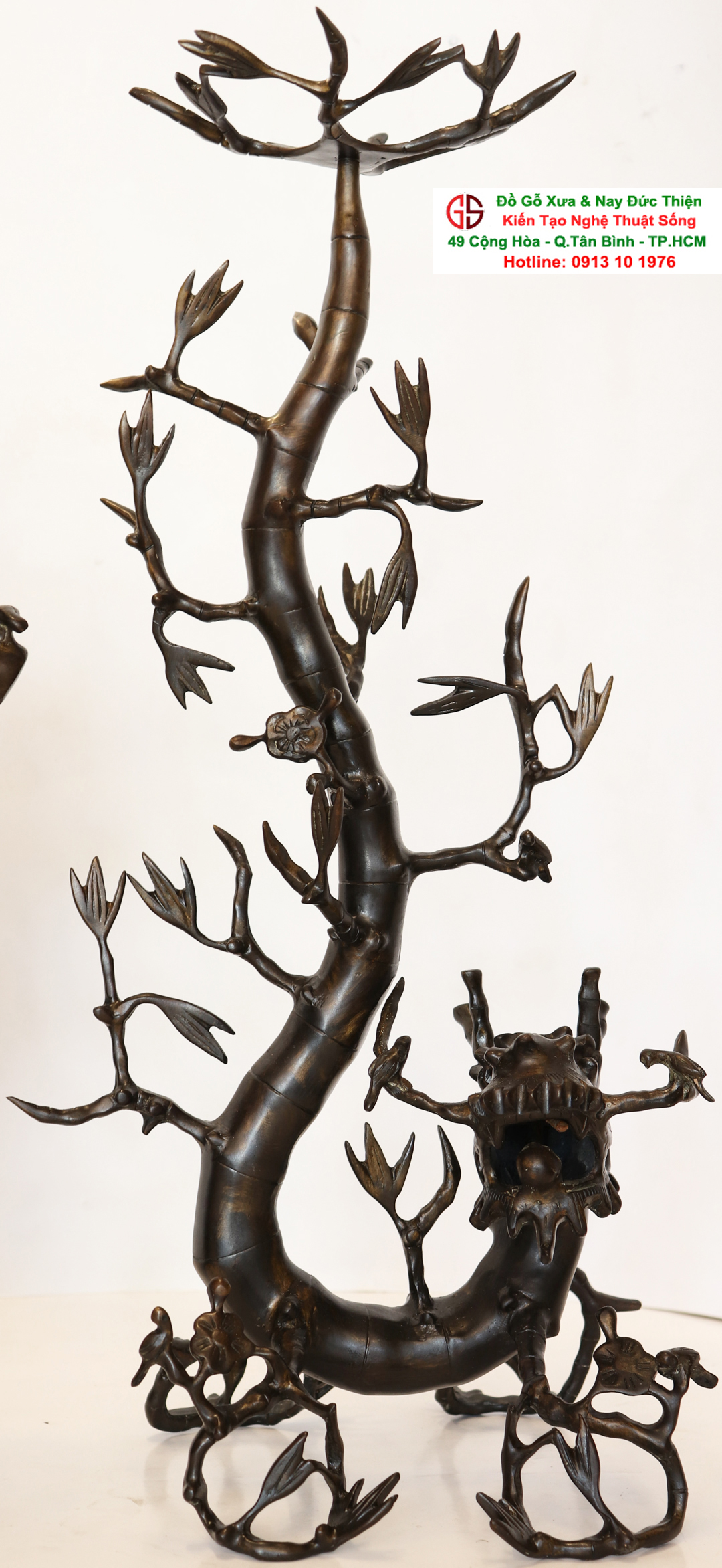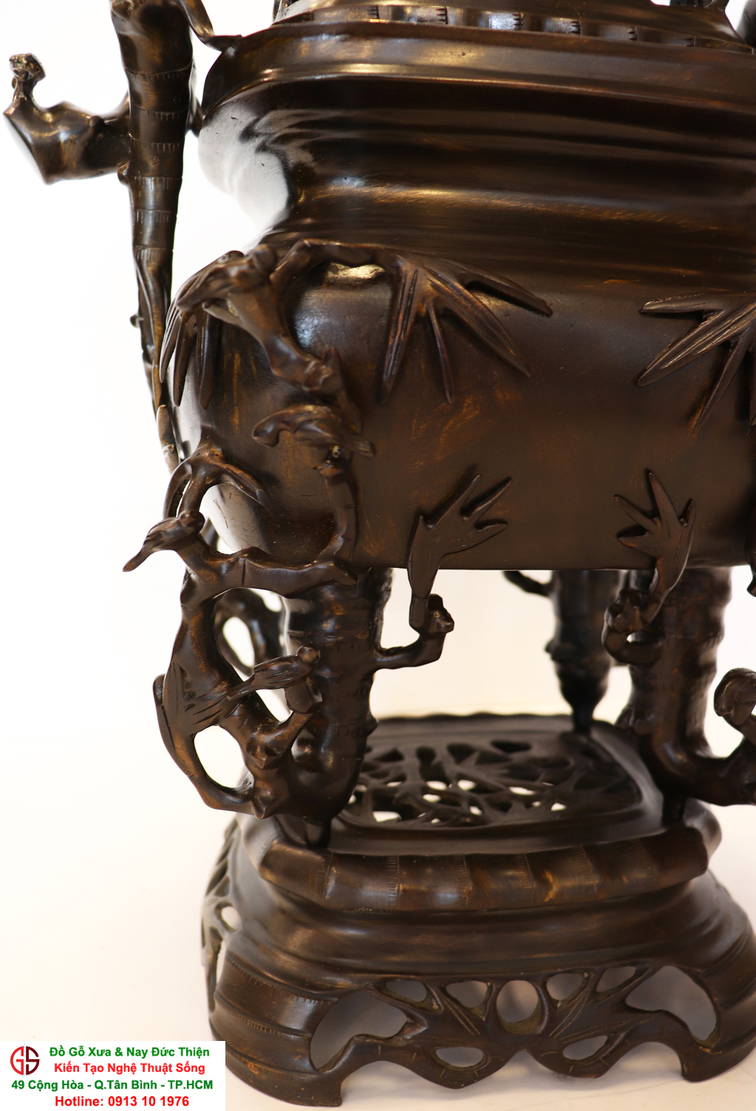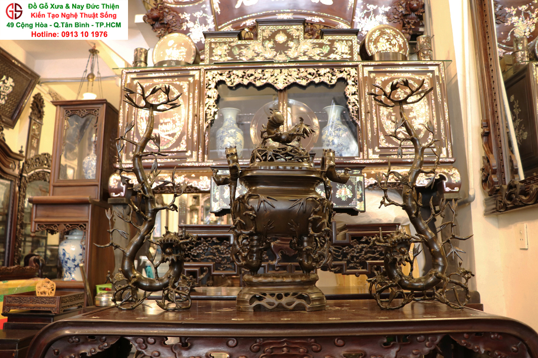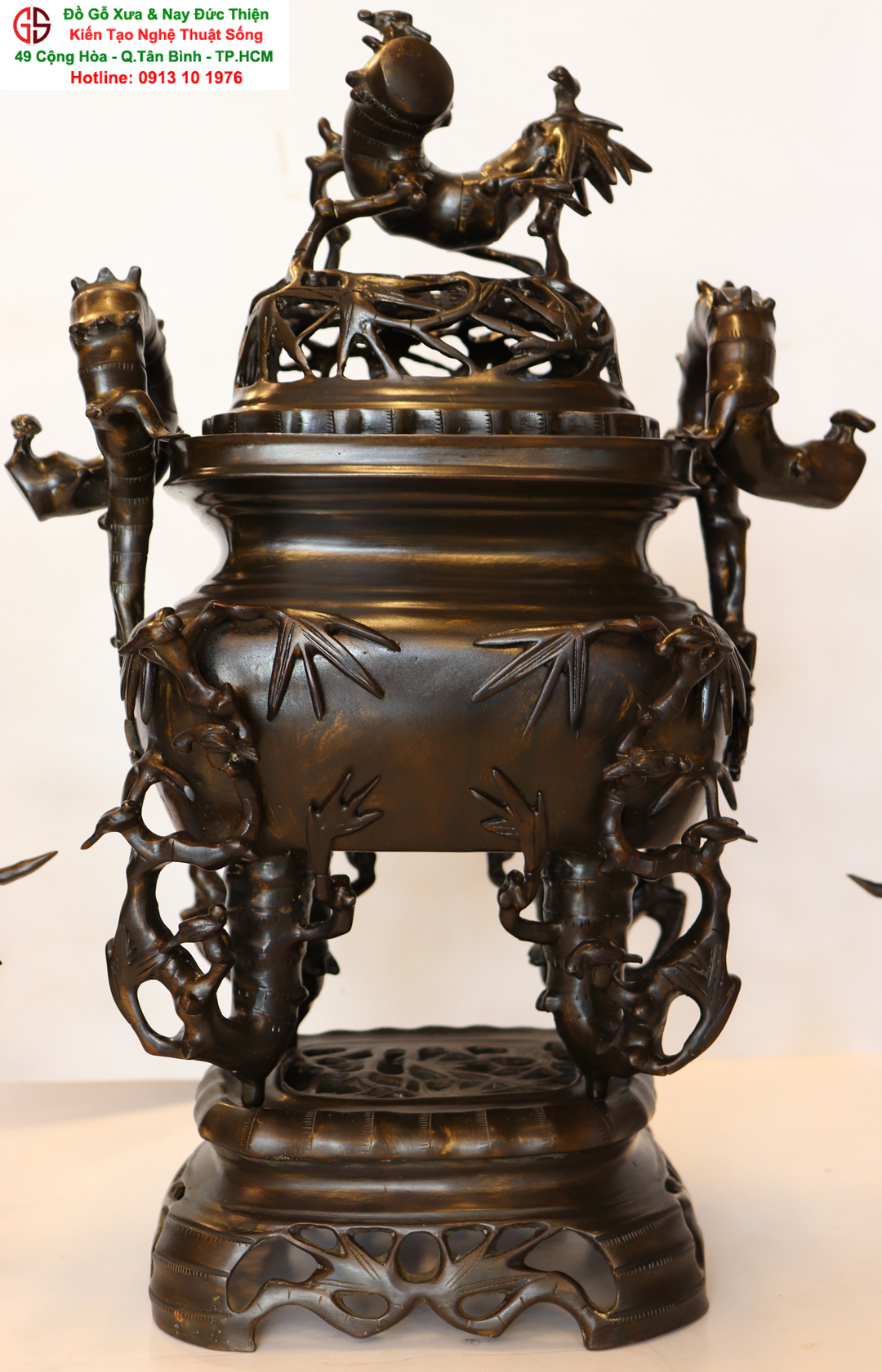 Bộ lư đồng đẹp xếp vào loại xưa nay hiếm, bộ lư đồng trúc hóa rồng ( lư trúc hóa long ) được đúc thủ công tay bởi nghệ nhân Huế theo kiểu xưa