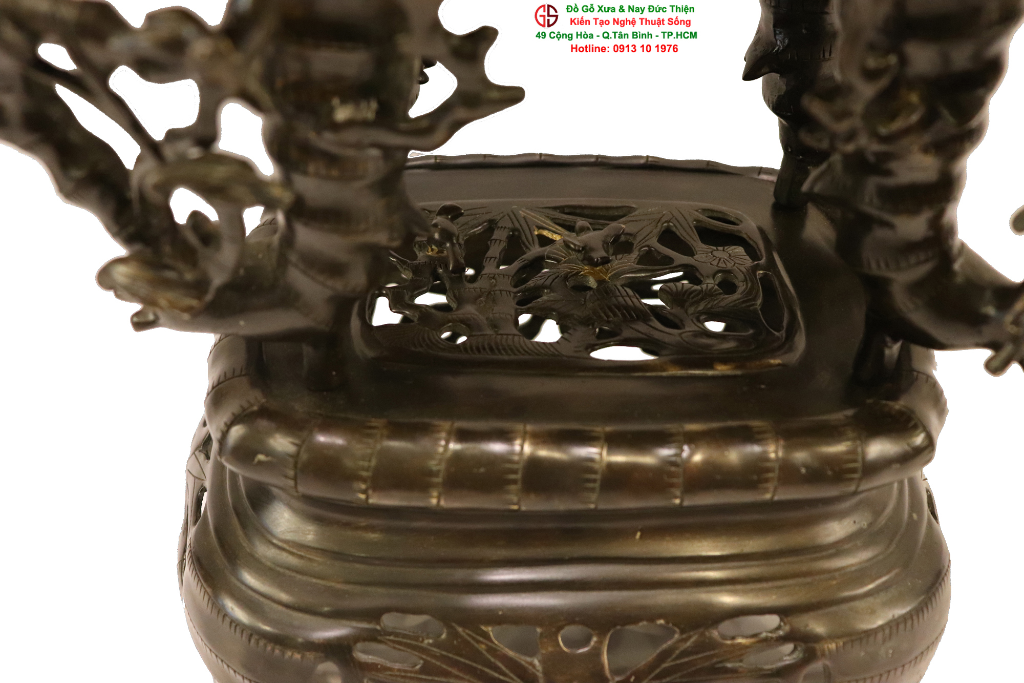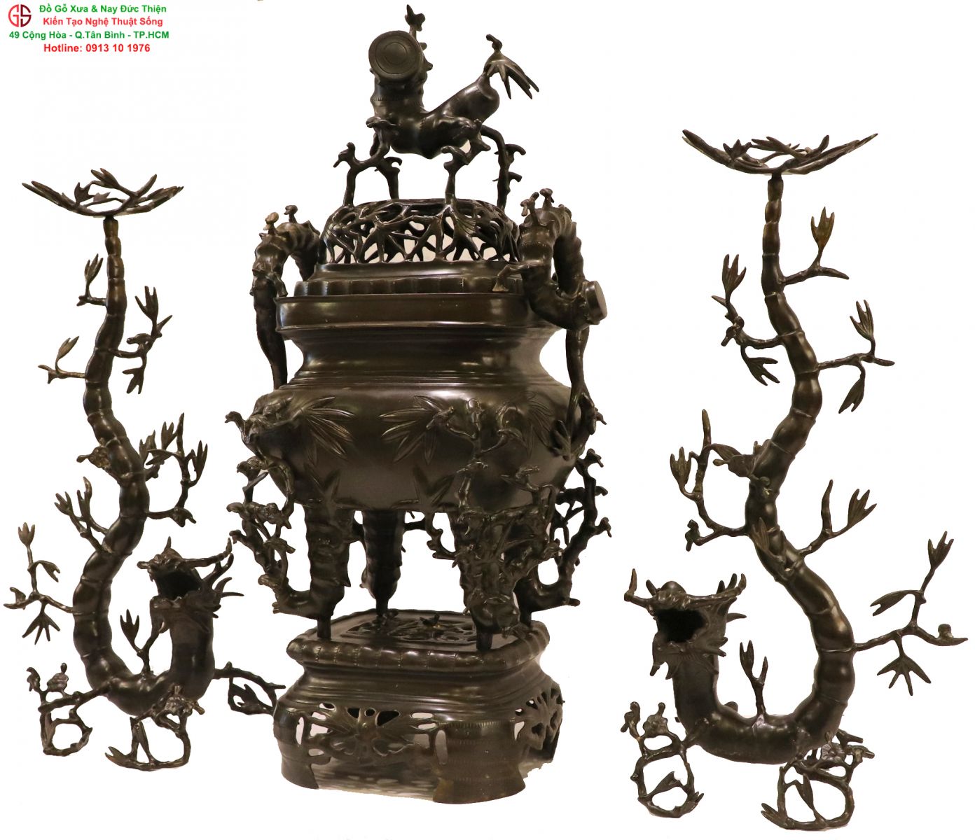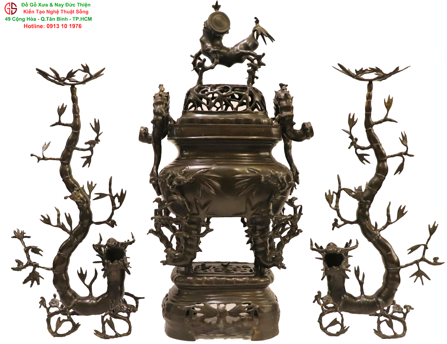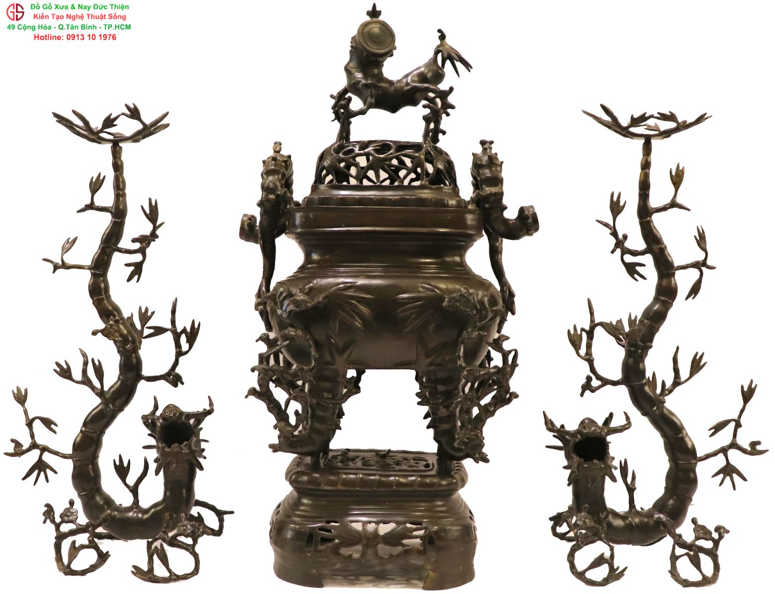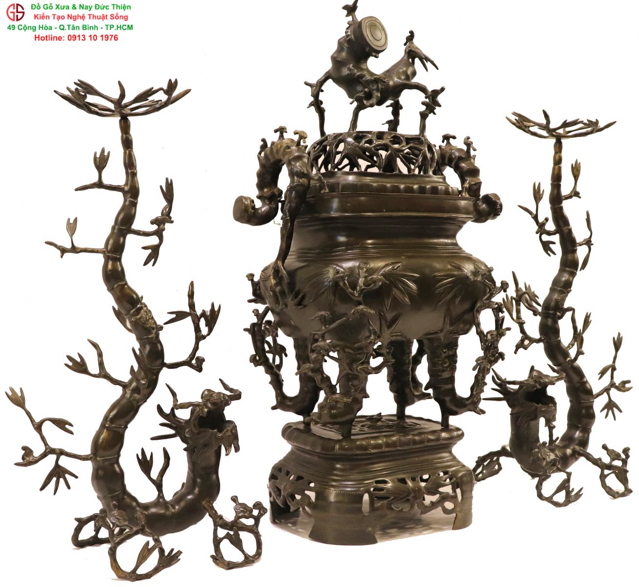 Bộ lư đồng đẹp xếp vào loại xưa nay hiếm, bộ lư đồng trúc hóa rồng ( lư trúc hóa long ) được đúc thủ công tay bởi nghệ nhân Huế theo kiểu xưa