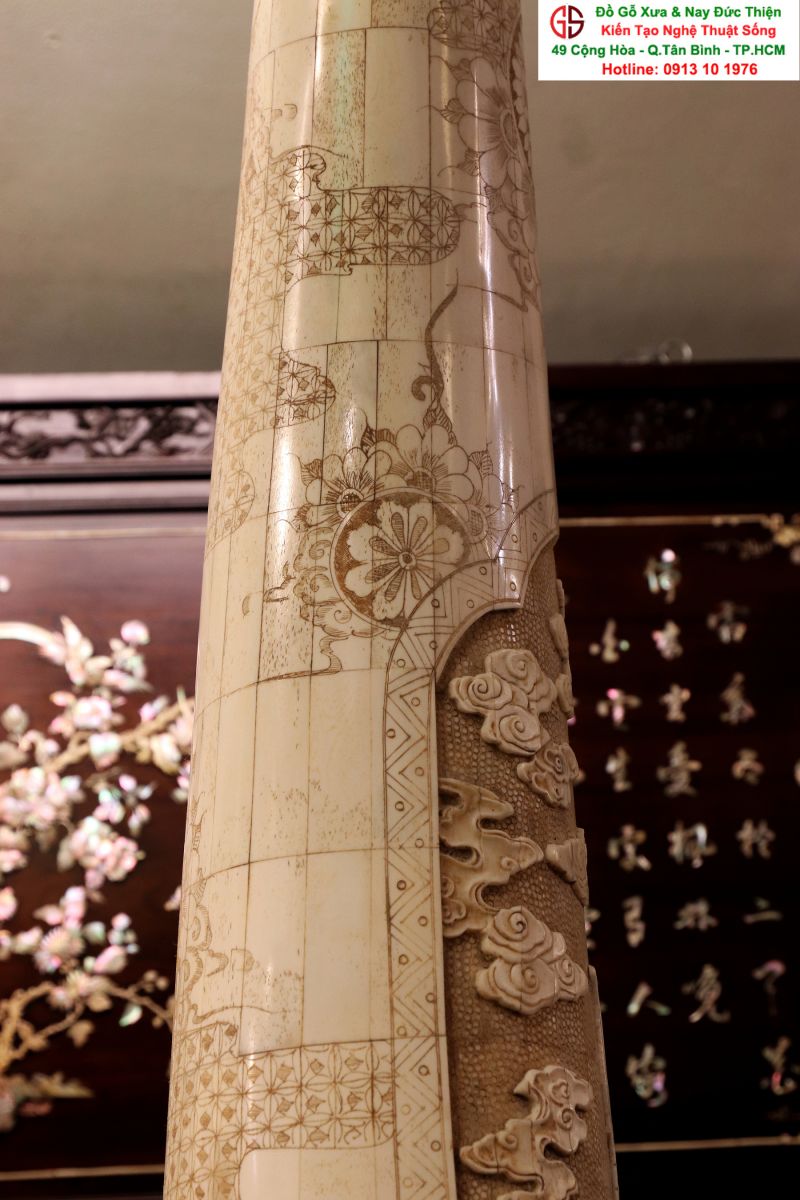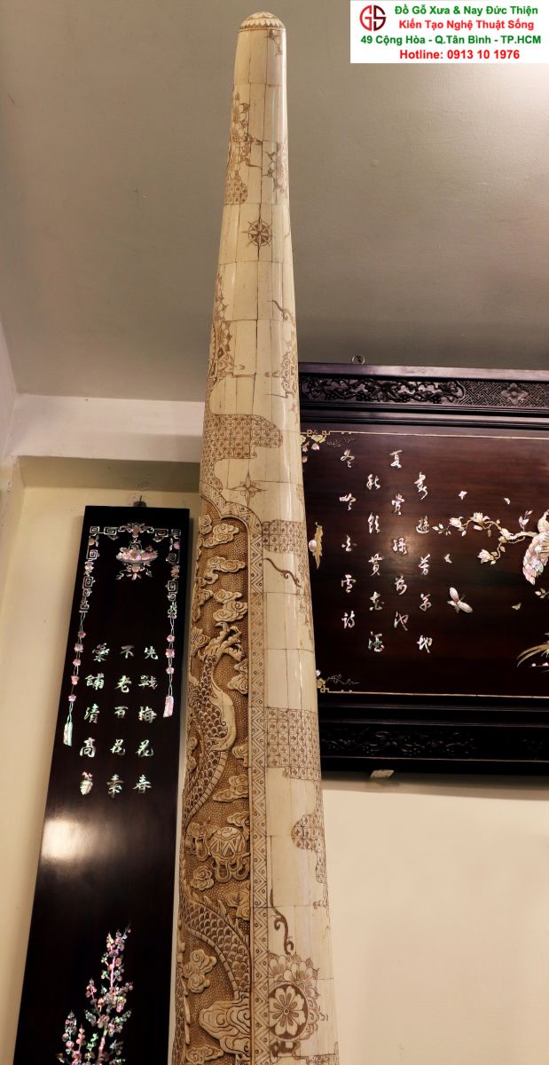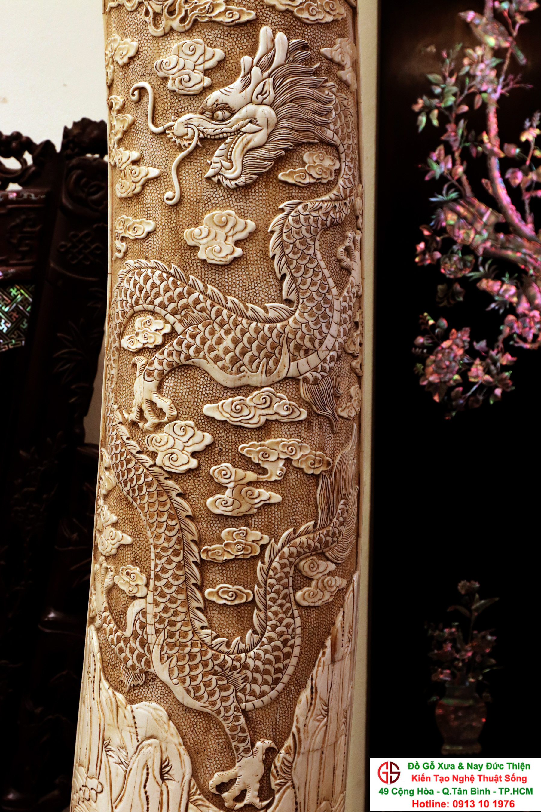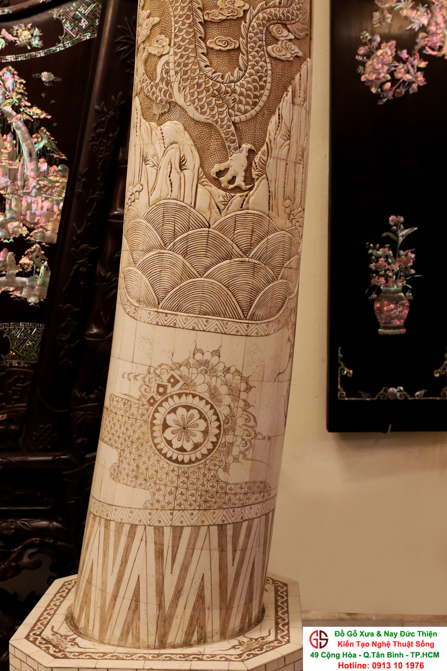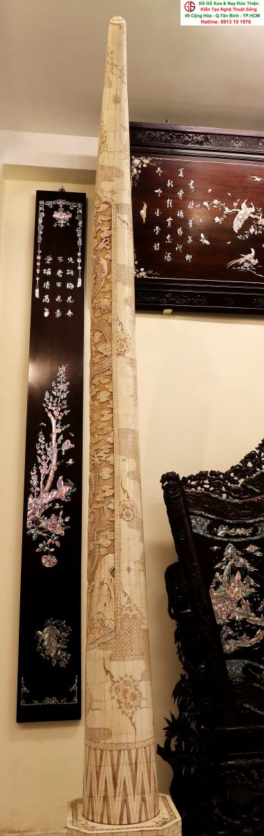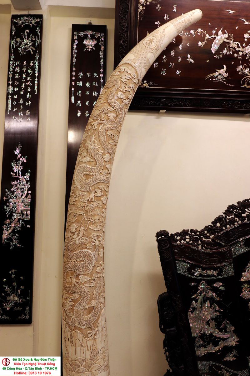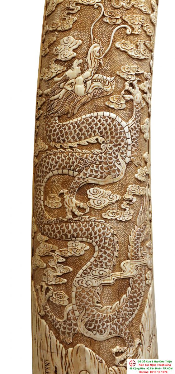 Có lẽ không cần nói nhiều, bạn ắt hẳn cũng đang cảm nhận thấy độ hoành tráng, vẻ đẹp sang trọng của cặp ngà voi được xếp vào hạng :" Siêu To Khổng Lồ " hàng hiếm này nữa. Với chiều cao lên tới 306 cm , chỗ lớn nhất có chiều rộng là 42 cm, những thợ thủ công đã rất khéo léo và tài tình khi sử dụng từng miếng xương nhỏ có kích thước khoảng 2 x 3 cm tạo hình lên một cặp ngà voi lớn, thon thả và cân đối. Không dừng lại ở đó, những người nghệ nhân còn tỉ mỉ gọn dũa, chạm khắc những hình tượng Long Ẩn - Long Cuốn thủy, những đường nét hoa văn mang dấu ấn cung đình, hoàng tộc quý phái.