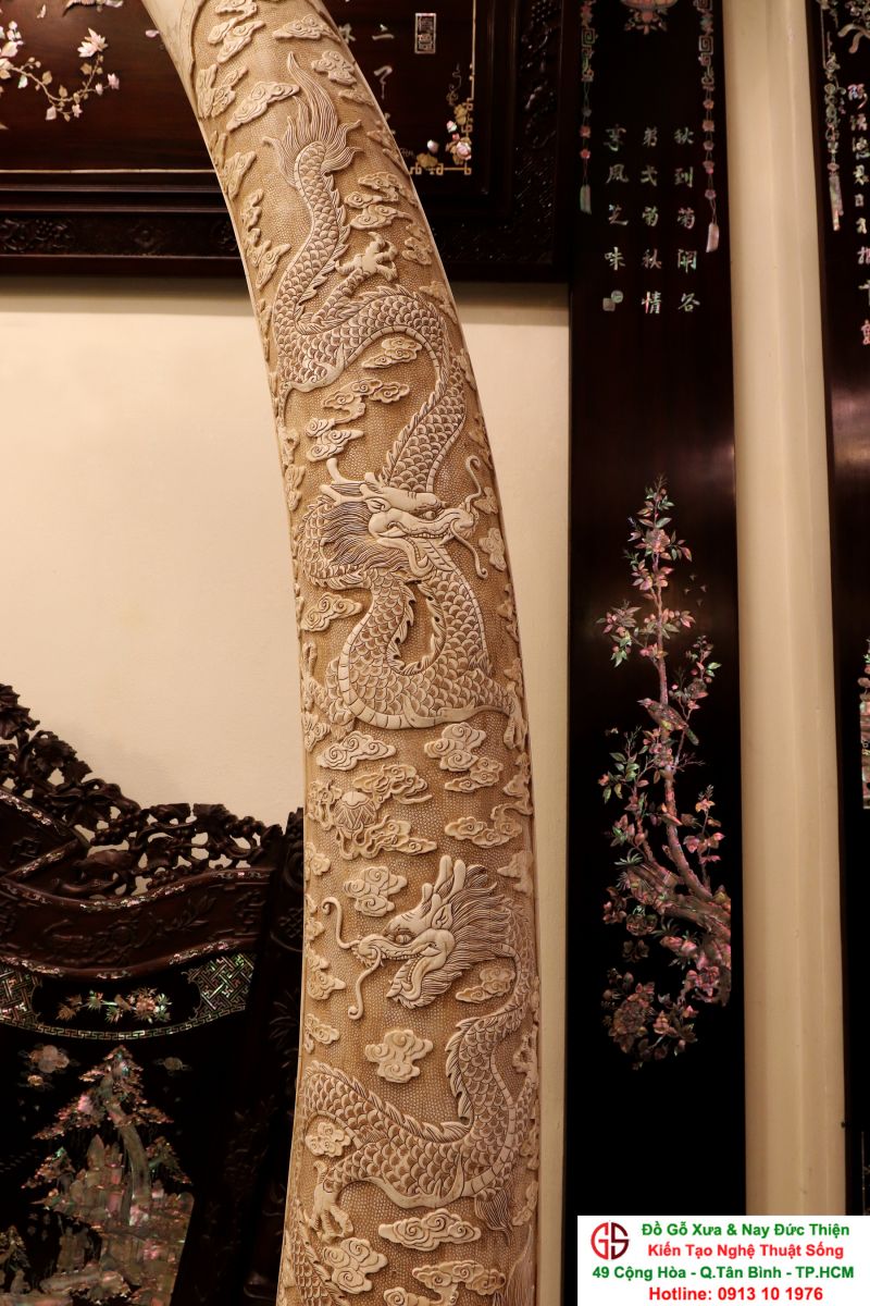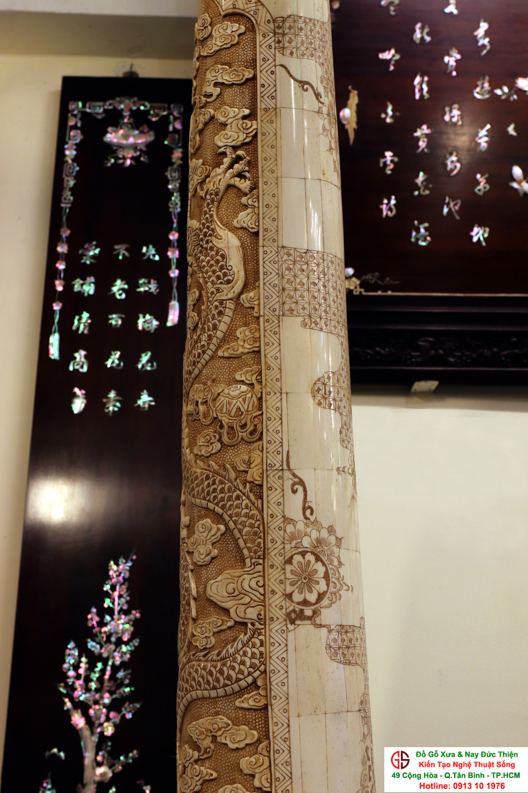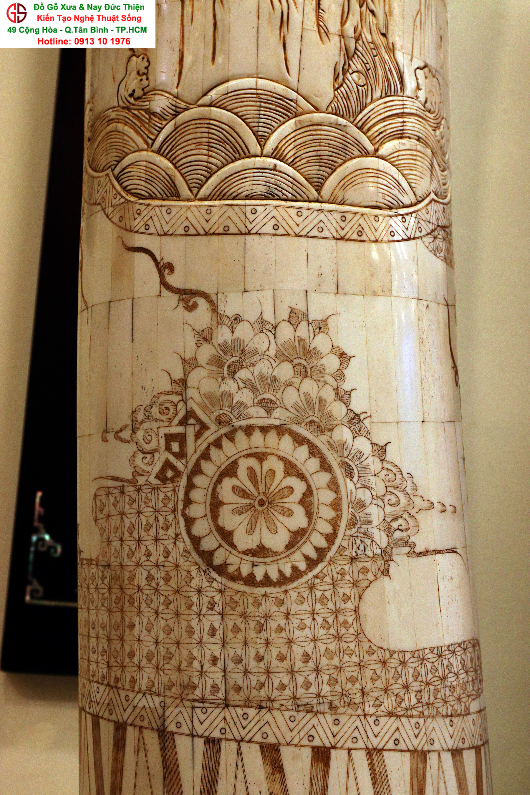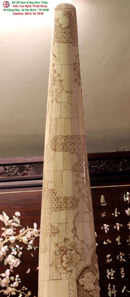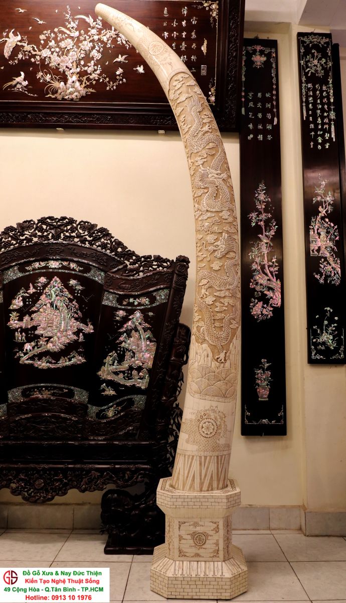 Có lẽ không cần nói nhiều, bạn ắt hẳn cũng đang cảm nhận thấy độ hoành tráng, vẻ đẹp sang trọng của cặp ngà voi được xếp vào hạng :" Siêu To Khổng Lồ " hàng hiếm này nữa. Với chiều cao lên tới 306 cm , chỗ lớn nhất có chiều rộng là 42 cm, những thợ thủ công đã rất khéo léo và tài tình khi sử dụng từng miếng xương nhỏ có kích thước khoảng 2 x 3 cm tạo hình lên một cặp ngà voi lớn, thon thả và cân đối. Không dừng lại ở đó, những người nghệ nhân còn tỉ mỉ gọn dũa, chạm khắc những hình tượng Long Ẩn - Long Cuốn thủy, những đường nét hoa văn mang dấu ấn cung đình, hoàng tộc quý phái.