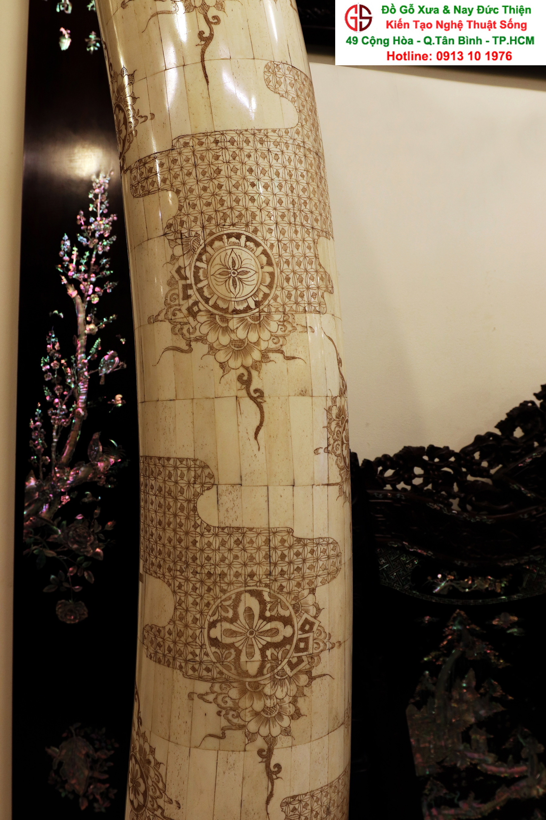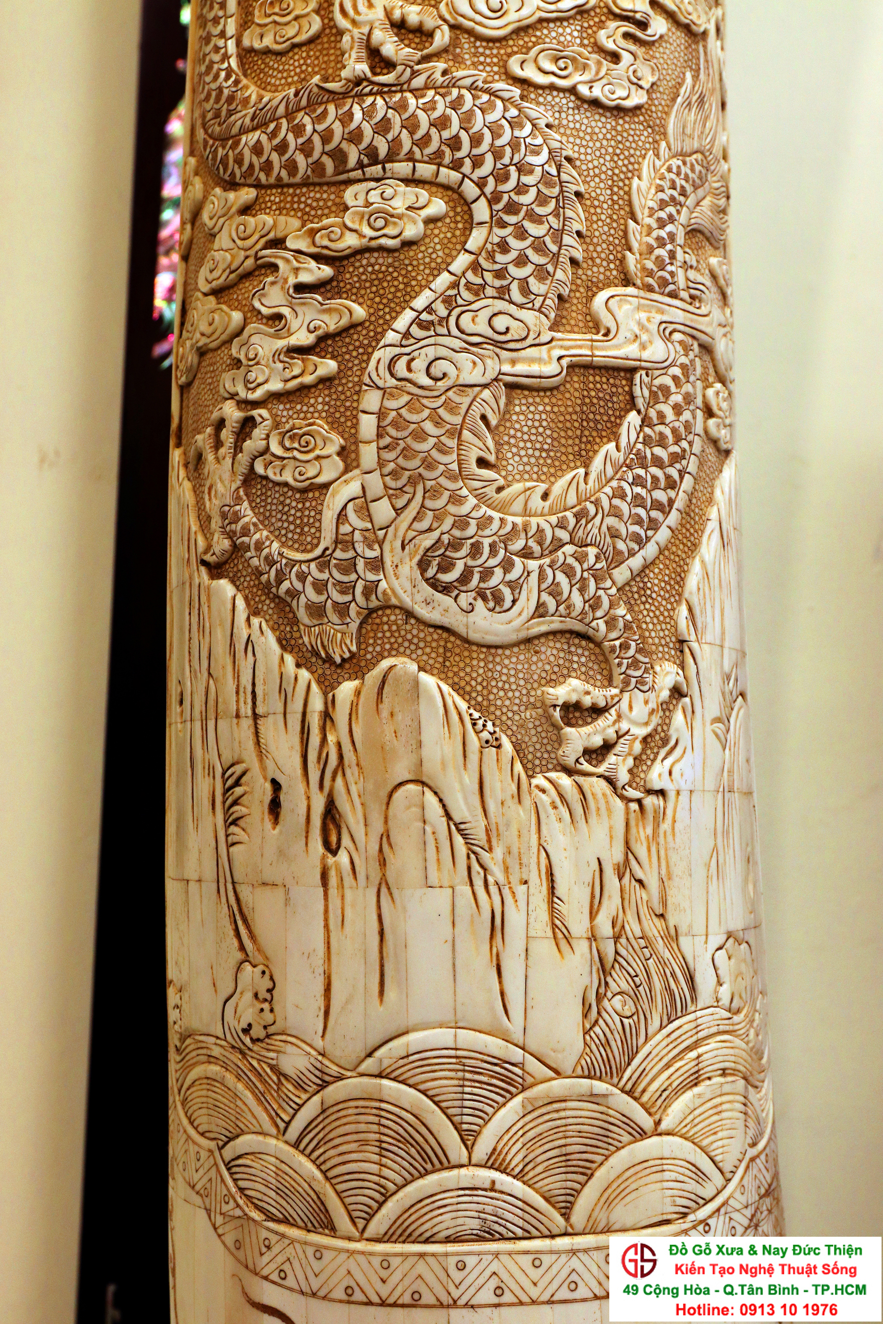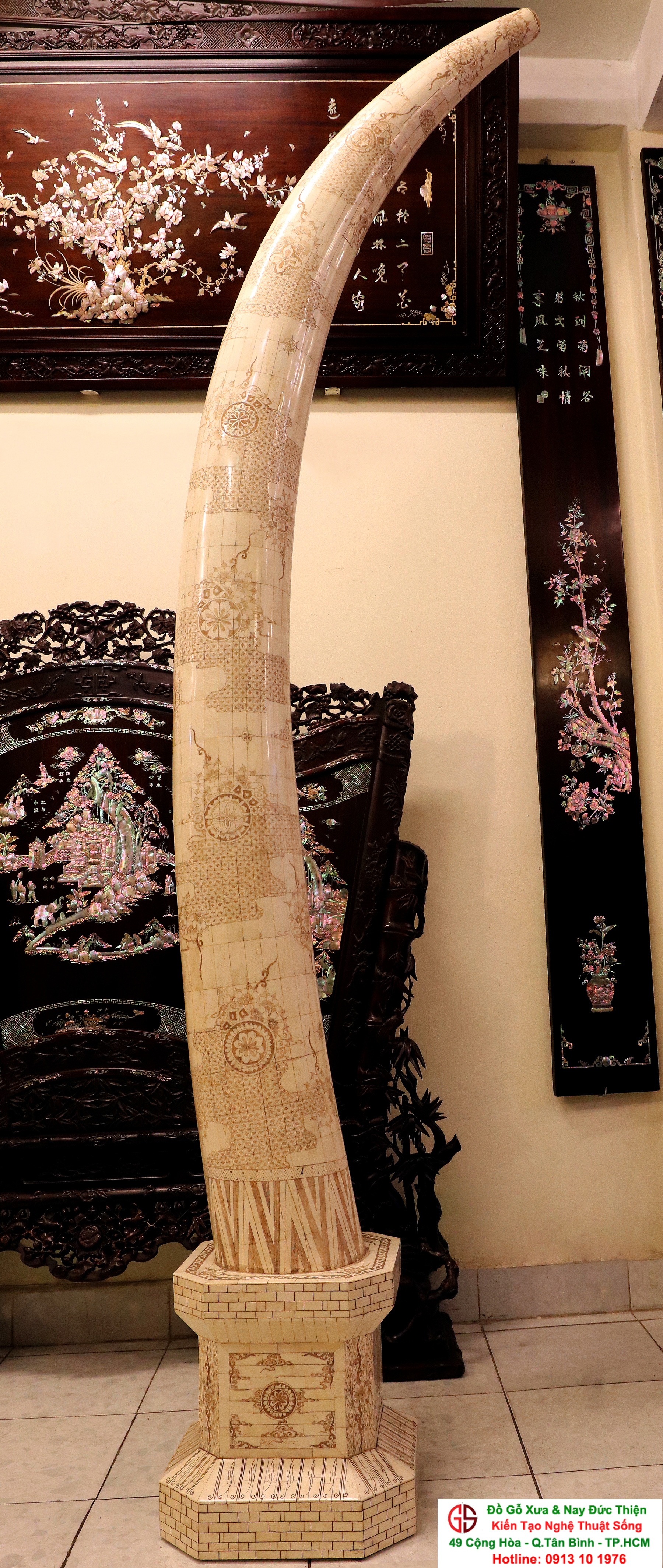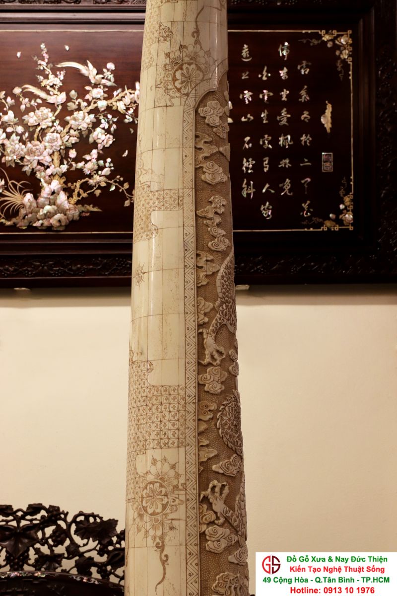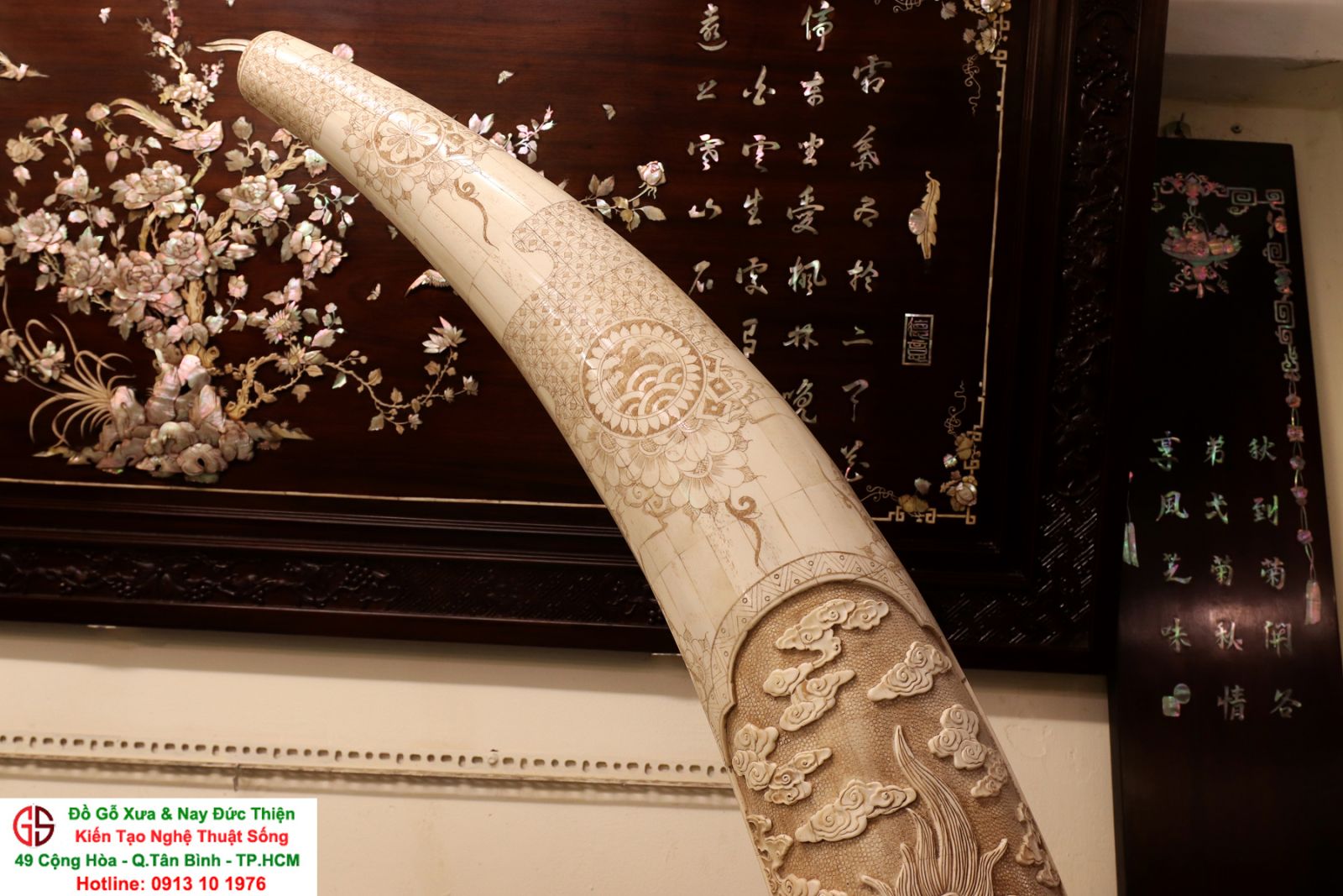 Có lẽ không cần nói nhiều, bạn ắt hẳn cũng đang cảm nhận thấy độ hoành tráng, vẻ đẹp sang trọng của cặp ngà voi được xếp vào hạng :" Siêu To Khổng Lồ " hàng hiếm này nữa. Với chiều cao lên tới 306 cm , chỗ lớn nhất có chiều rộng là 42 cm, những thợ thủ công đã rất khéo léo và tài tình khi sử dụng từng miếng xương nhỏ có kích thước khoảng 2 x 3 cm tạo hình lên một cặp ngà voi lớn, thon thả và cân đối. Không dừng lại ở đó, những người nghệ nhân còn tỉ mỉ gọn dũa, chạm khắc những hình tượng Long Ẩn - Long Cuốn thủy, những đường nét hoa văn mang dấu ấn cung đình, hoàng tộc quý phái.