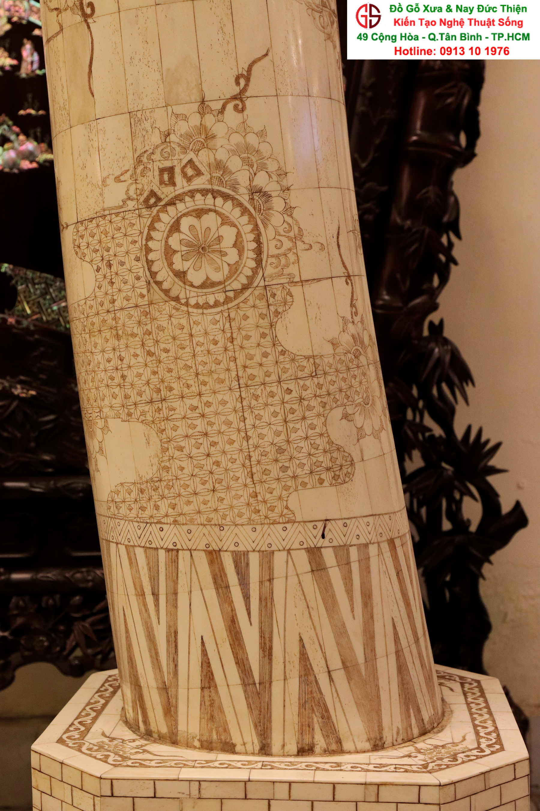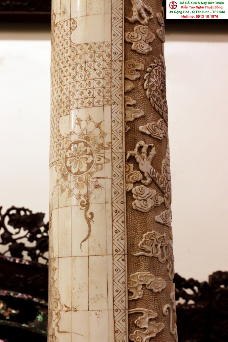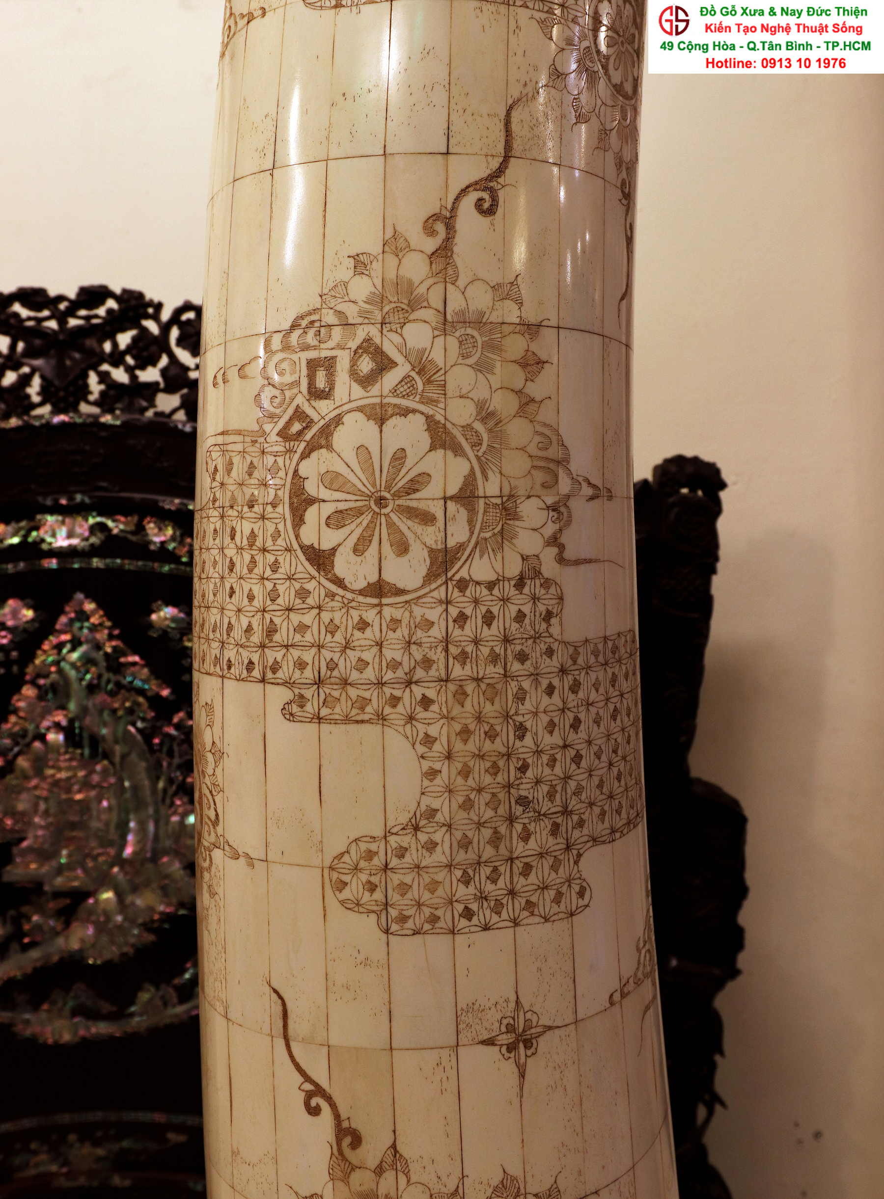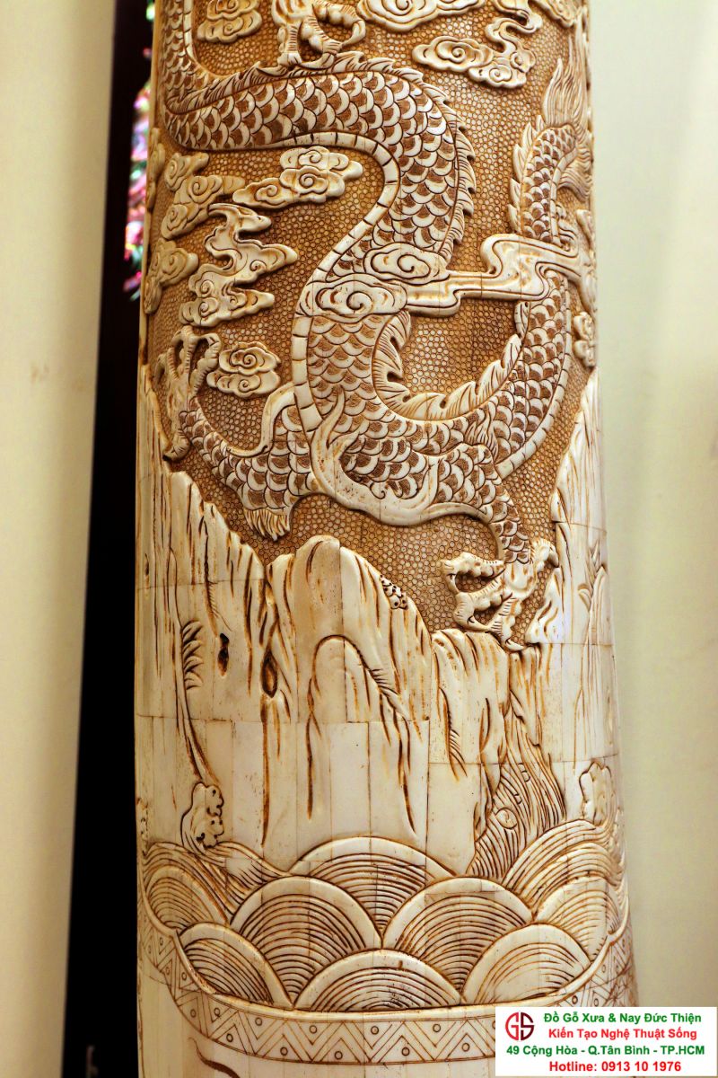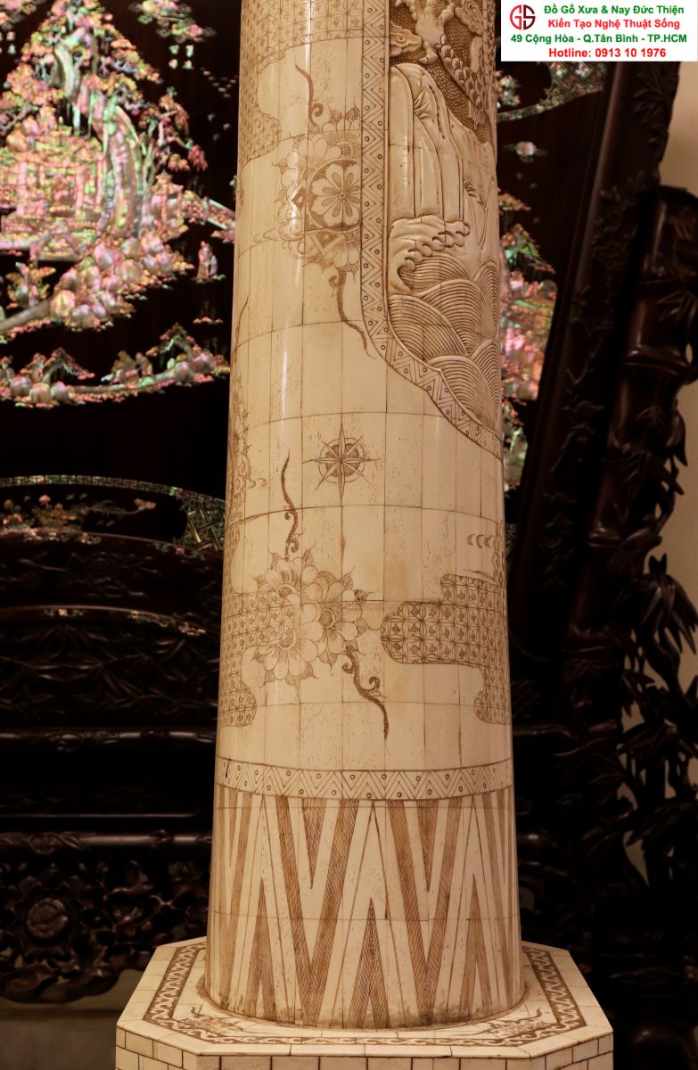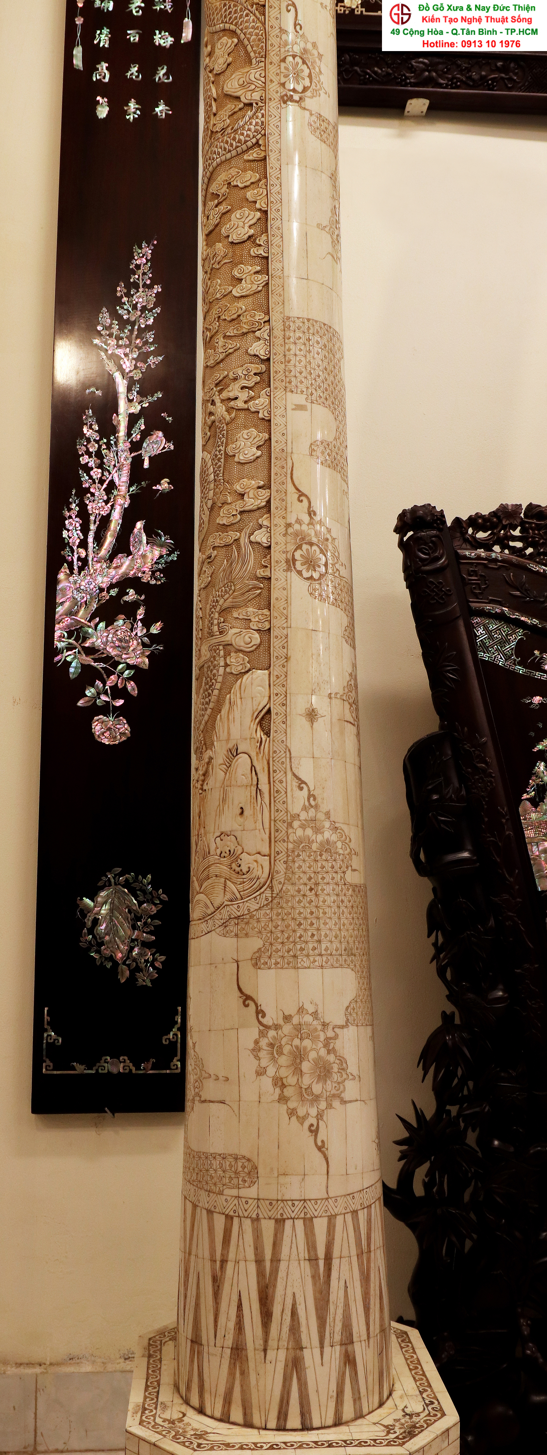 Có lẽ không cần nói nhiều, bạn ắt hẳn cũng đang cảm nhận thấy độ hoành tráng, vẻ đẹp sang trọng của cặp ngà voi được xếp vào hạng :" Siêu To Khổng Lồ " hàng hiếm này nữa. Với chiều cao lên tới 306 cm , chỗ lớn nhất có chiều rộng là 42 cm, những thợ thủ công đã rất khéo léo và tài tình khi sử dụng từng miếng xương nhỏ có kích thước khoảng 2 x 3 cm tạo hình lên một cặp ngà voi lớn, thon thả và cân đối. Không dừng lại ở đó, những người nghệ nhân còn tỉ mỉ gọn dũa, chạm khắc những hình tượng Long Ẩn - Long Cuốn thủy, những đường nét hoa văn mang dấu ấn cung đình, hoàng tộc quý phái.