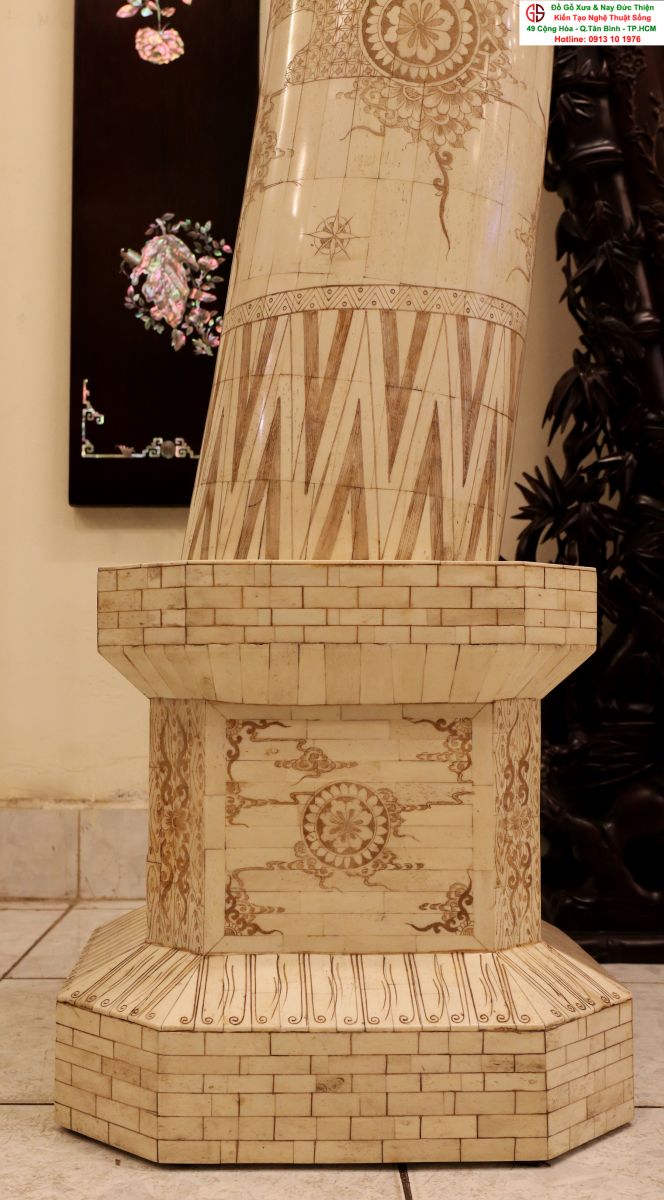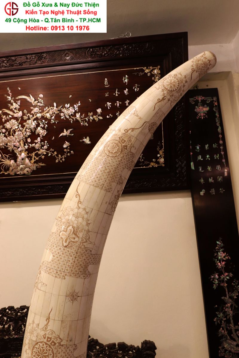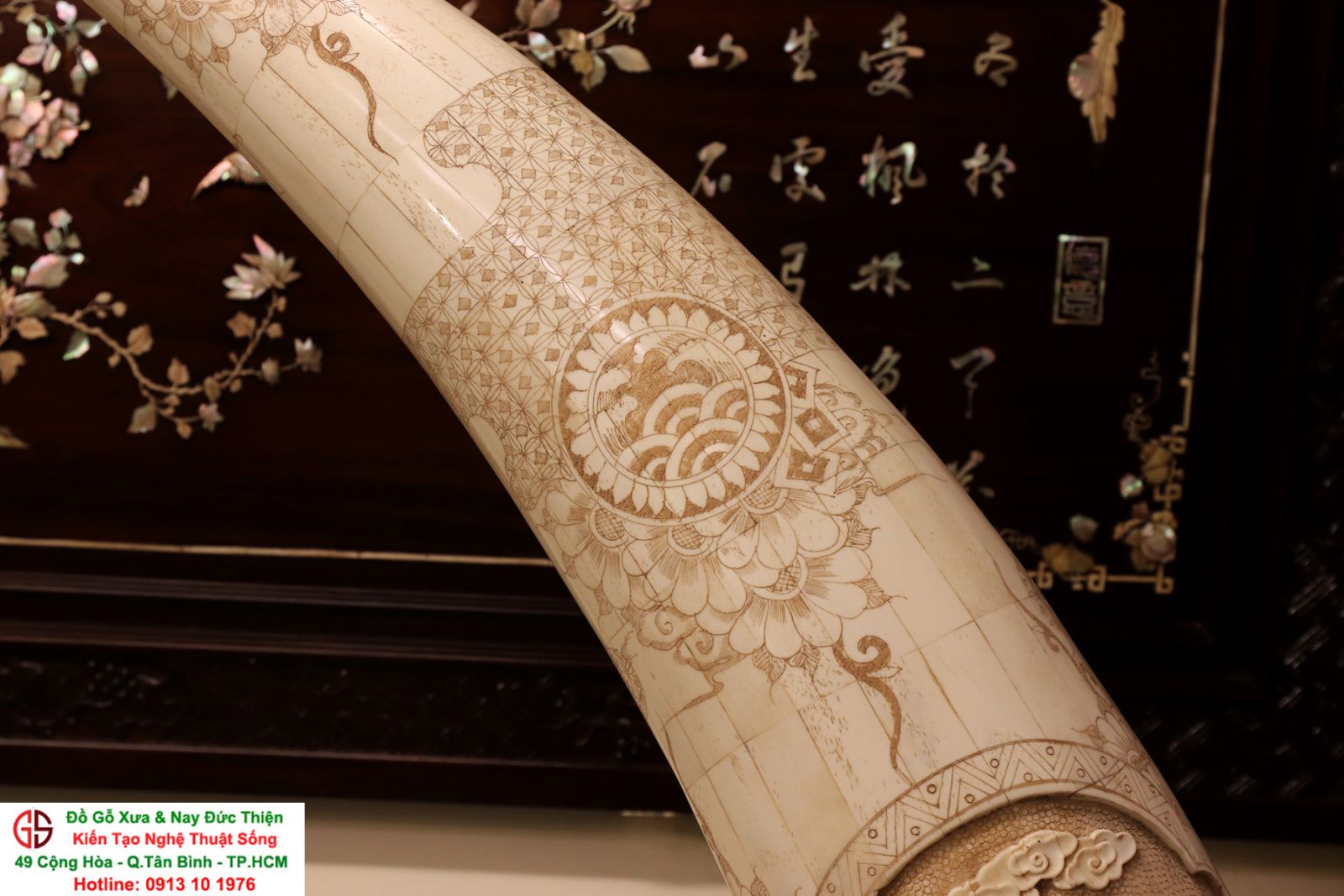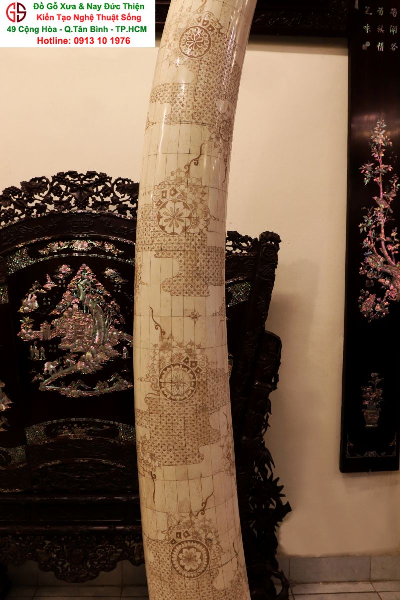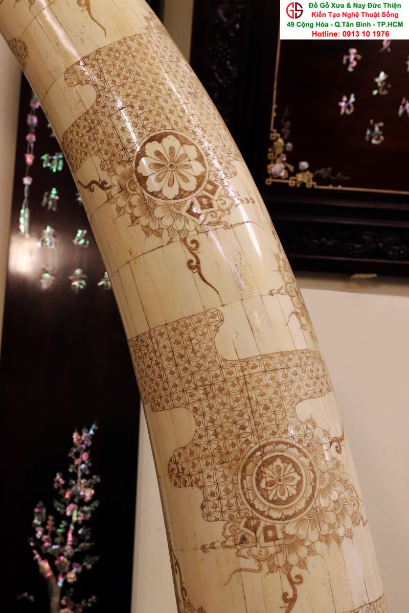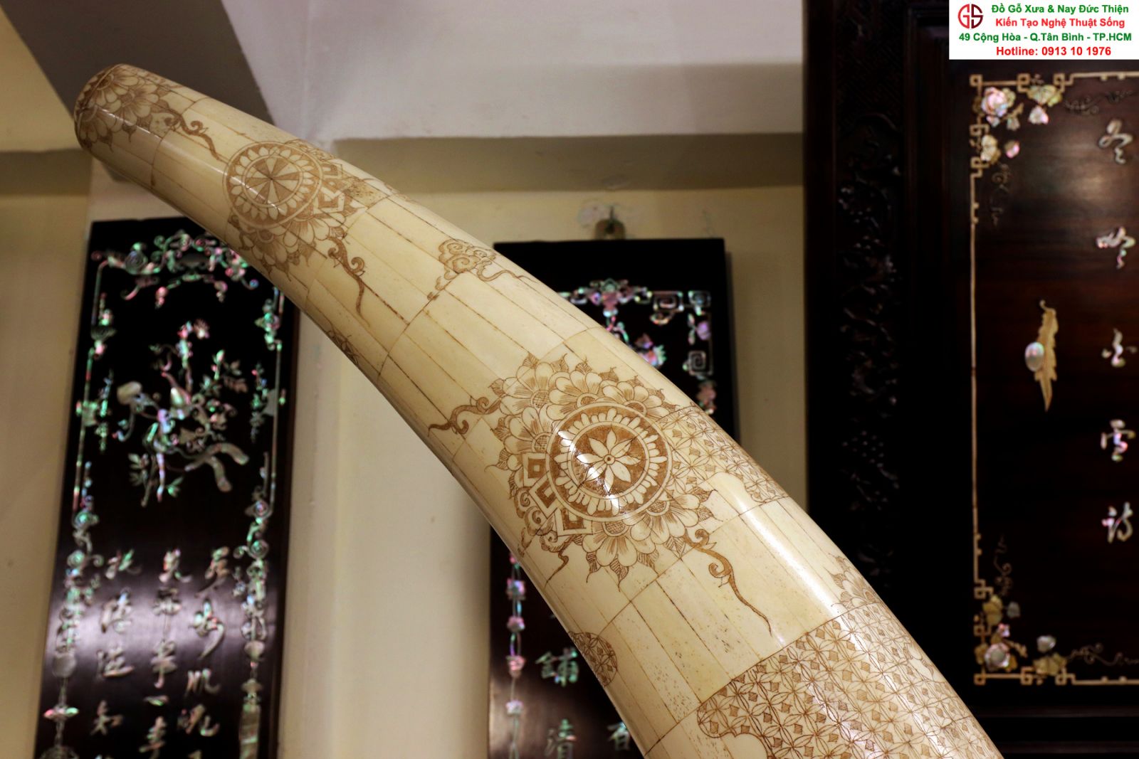 Có lẽ không cần nói nhiều, bạn ắt hẳn cũng đang cảm nhận thấy độ hoành tráng, vẻ đẹp sang trọng của cặp ngà voi được xếp vào hạng :" Siêu To Khổng Lồ " hàng hiếm này nữa. Với chiều cao lên tới 306 cm , chỗ lớn nhất có chiều rộng là 42 cm, những thợ thủ công đã rất khéo léo và tài tình khi sử dụng từng miếng xương nhỏ có kích thước khoảng 2 x 3 cm tạo hình lên một cặp ngà voi lớn, thon thả và cân đối. Không dừng lại ở đó, những người nghệ nhân còn tỉ mỉ gọn dũa, chạm khắc những hình tượng Long Ẩn - Long Cuốn thủy, những đường nét hoa văn mang dấu ấn cung đình, hoàng tộc quý phái.