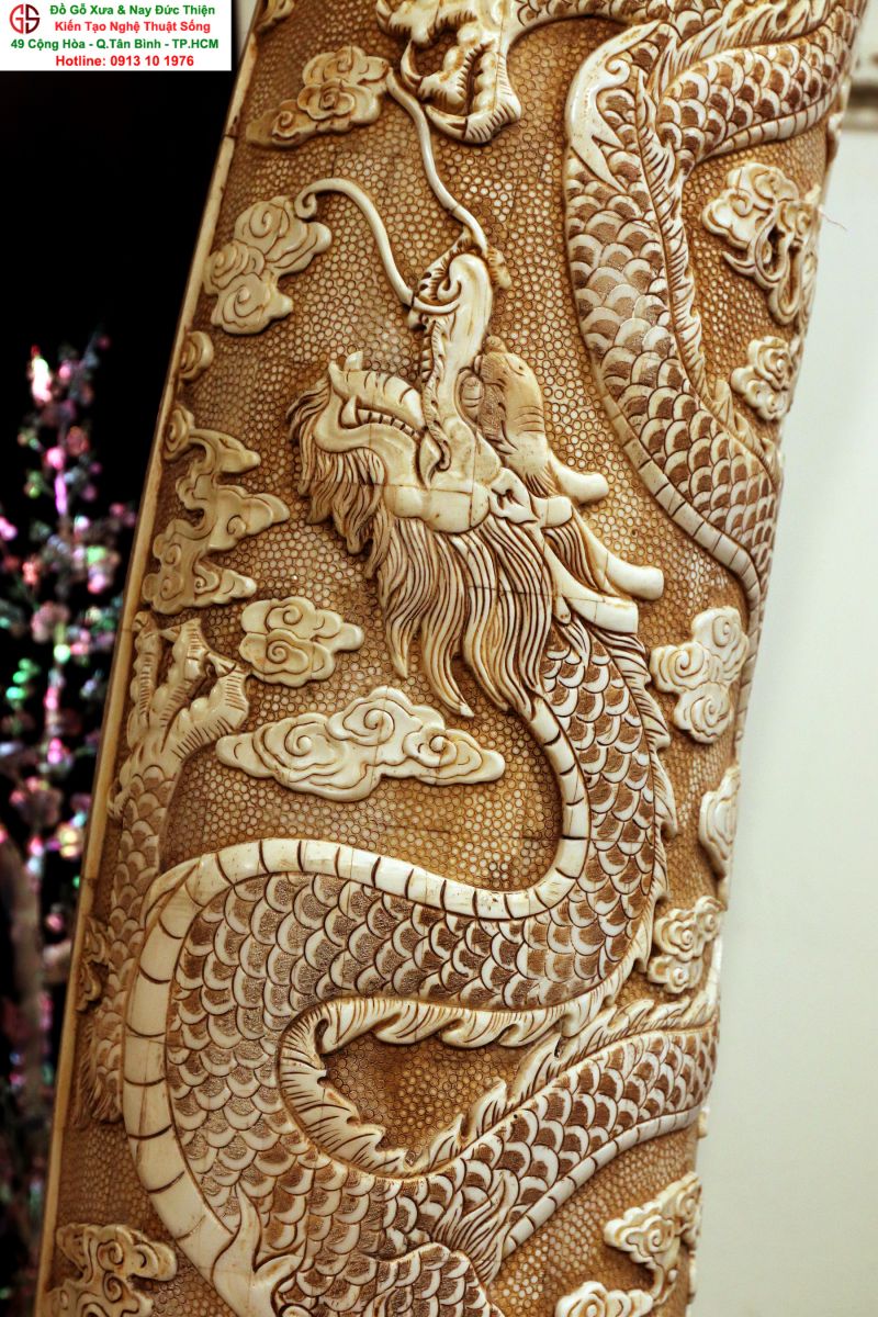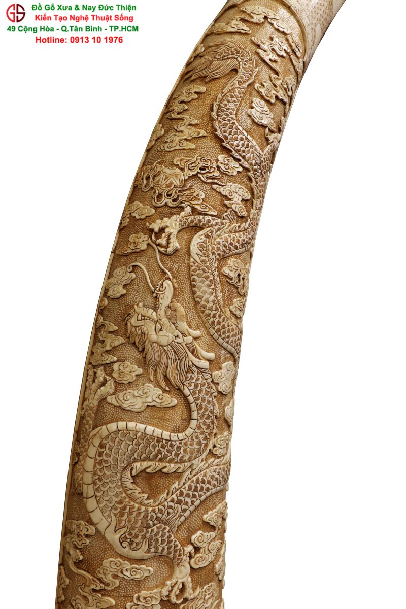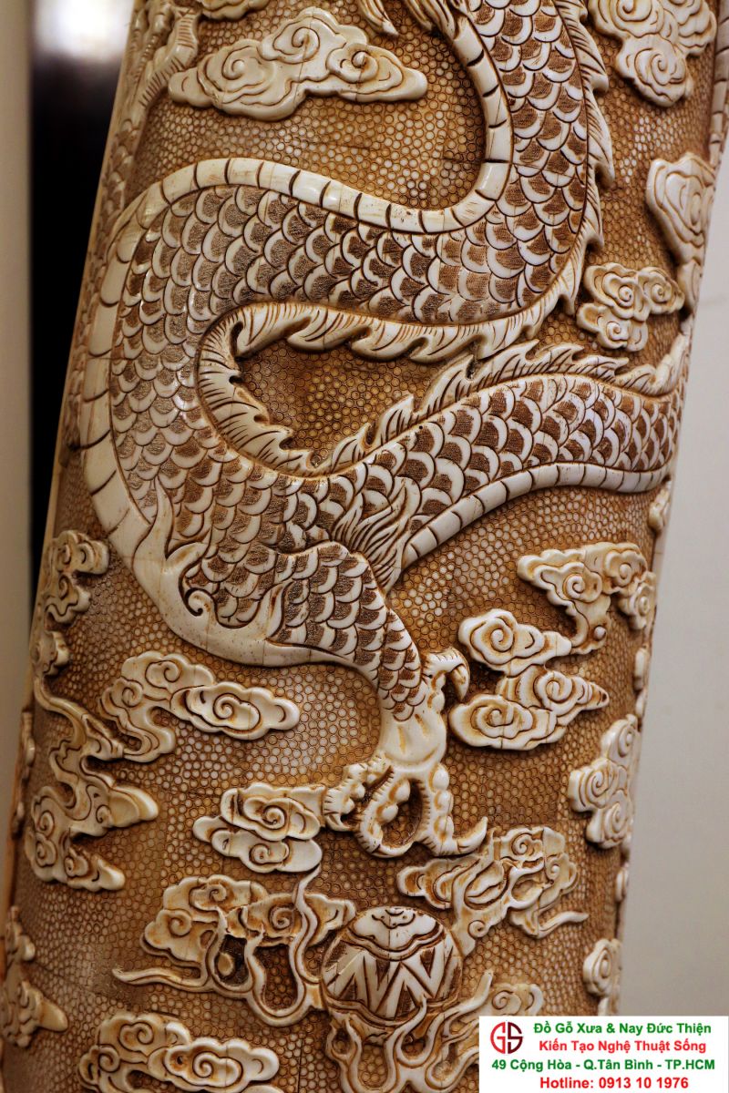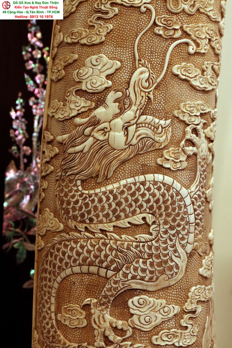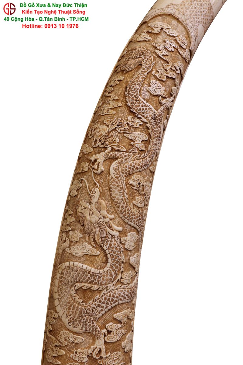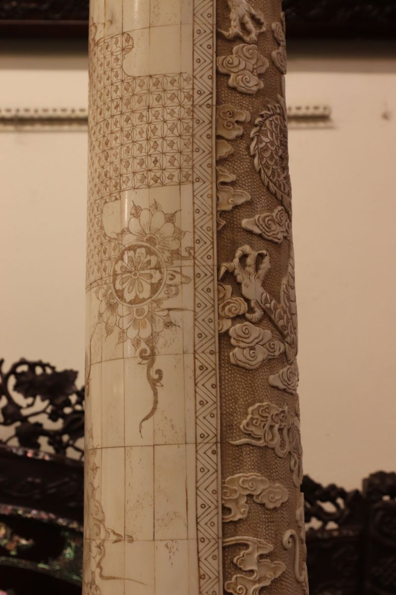 Có lẽ không cần nói nhiều, bạn ắt hẳn cũng đang cảm nhận thấy độ hoành tráng, vẻ đẹp sang trọng của cặp ngà voi được xếp vào hạng :" Siêu To Khổng Lồ " hàng hiếm này nữa. Với chiều cao lên tới 306 cm , chỗ lớn nhất có chiều rộng là 42 cm, những thợ thủ công đã rất khéo léo và tài tình khi sử dụng từng miếng xương nhỏ có kích thước khoảng 2 x 3 cm tạo hình lên một cặp ngà voi lớn, thon thả và cân đối. Không dừng lại ở đó, những người nghệ nhân còn tỉ mỉ gọn dũa, chạm khắc những hình tượng Long Ẩn - Long Cuốn thủy, những đường nét hoa văn mang dấu ấn cung đình, hoàng tộc quý phái.