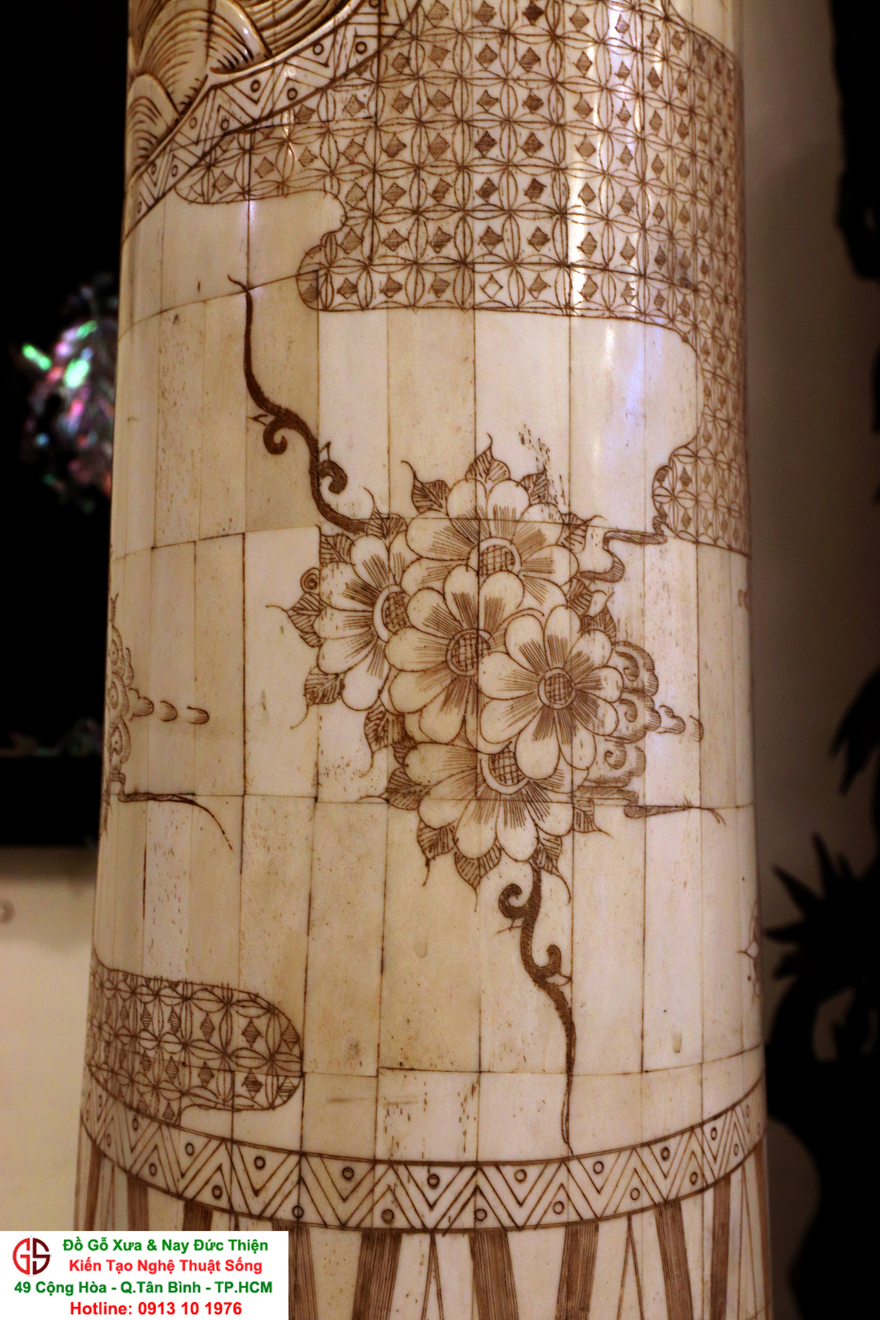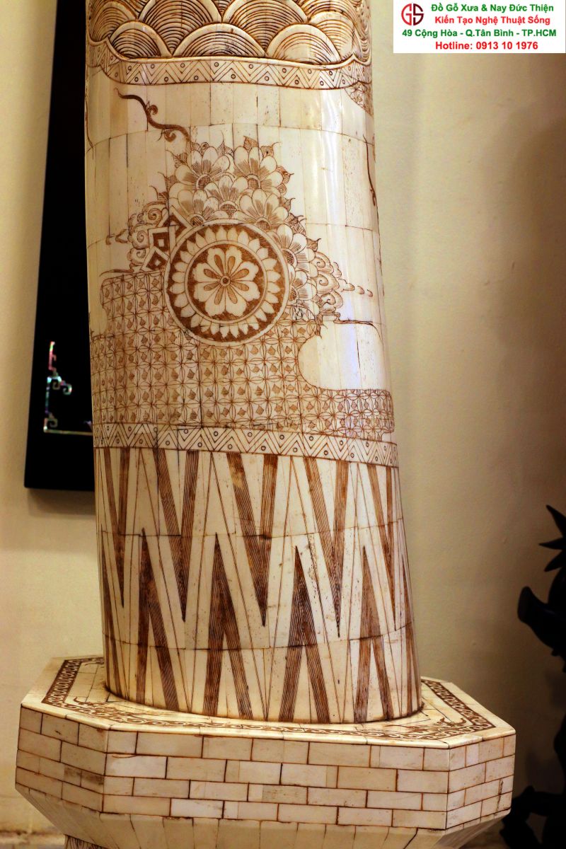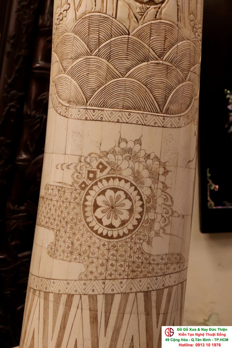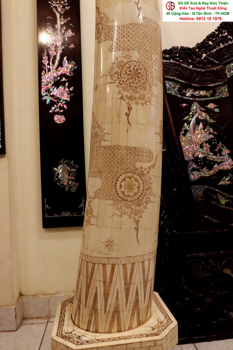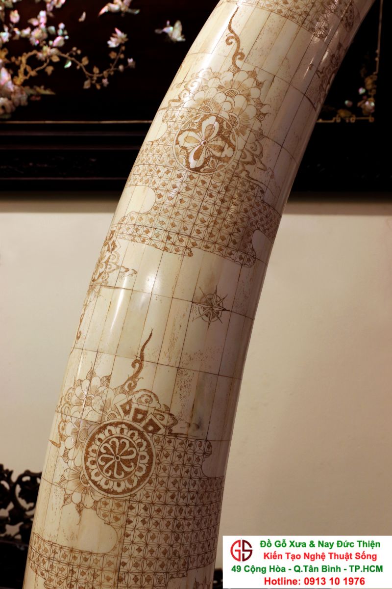Có lẽ không cần nói nhiều, bạn ắt hẳn cũng đang cảm nhận thấy độ hoành tráng, vẻ đẹp sang trọng của cặp ngà voi được xếp vào hạng :" Siêu To Khổng Lồ " hàng hiếm này nữa. Với chiều cao lên tới 306 cm , chỗ lớn nhất có chiều rộng là 42 cm, những thợ thủ công đã rất khéo léo và tài tình khi sử dụng từng miếng xương nhỏ có kích thước khoảng 2 x 3 cm tạo hình lên một cặp ngà voi lớn, thon thả và cân đối. Không dừng lại ở đó, những người nghệ nhân còn tỉ mỉ gọn dũa, chạm khắc những hình tượng Long Ẩn - Long Cuốn thủy, những đường nét hoa văn mang dấu ấn cung đình, hoàng tộc quý phái.