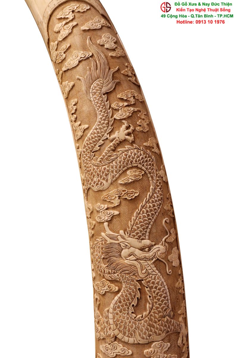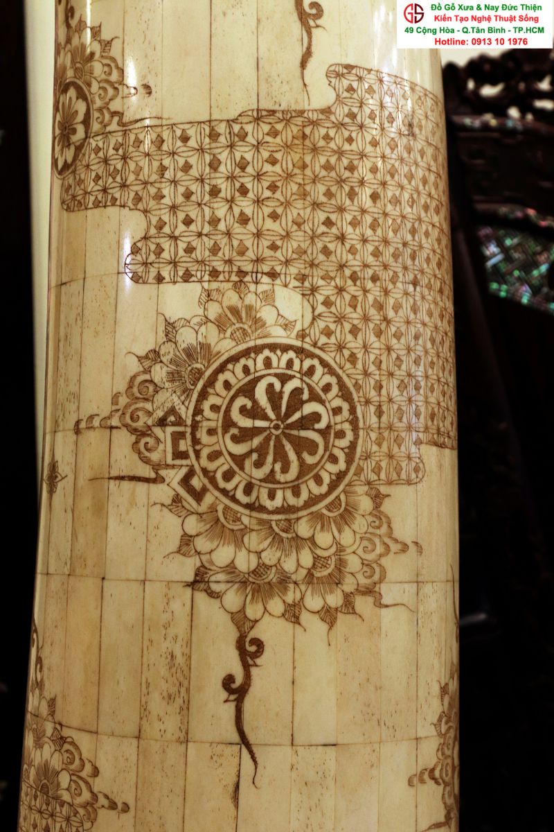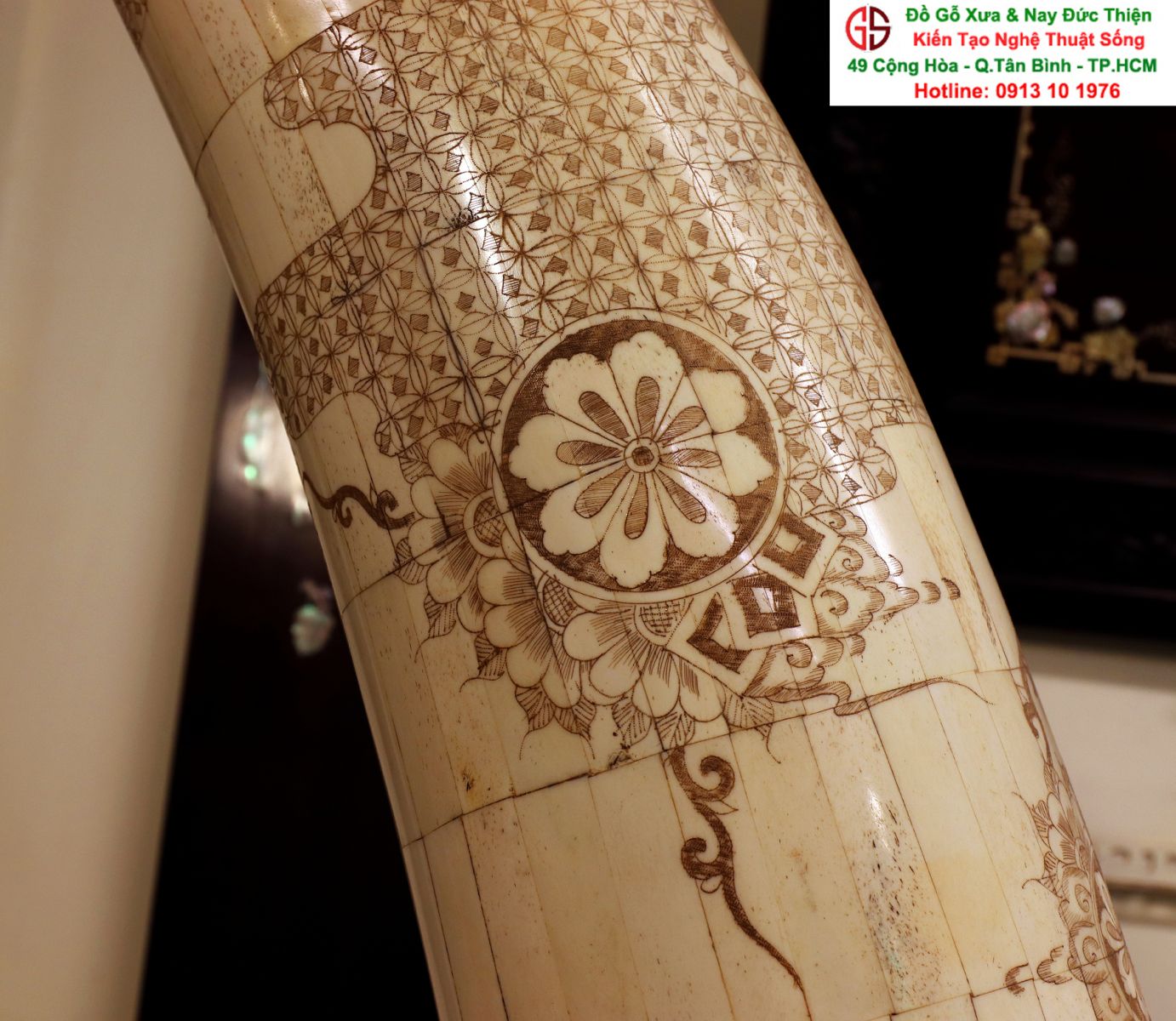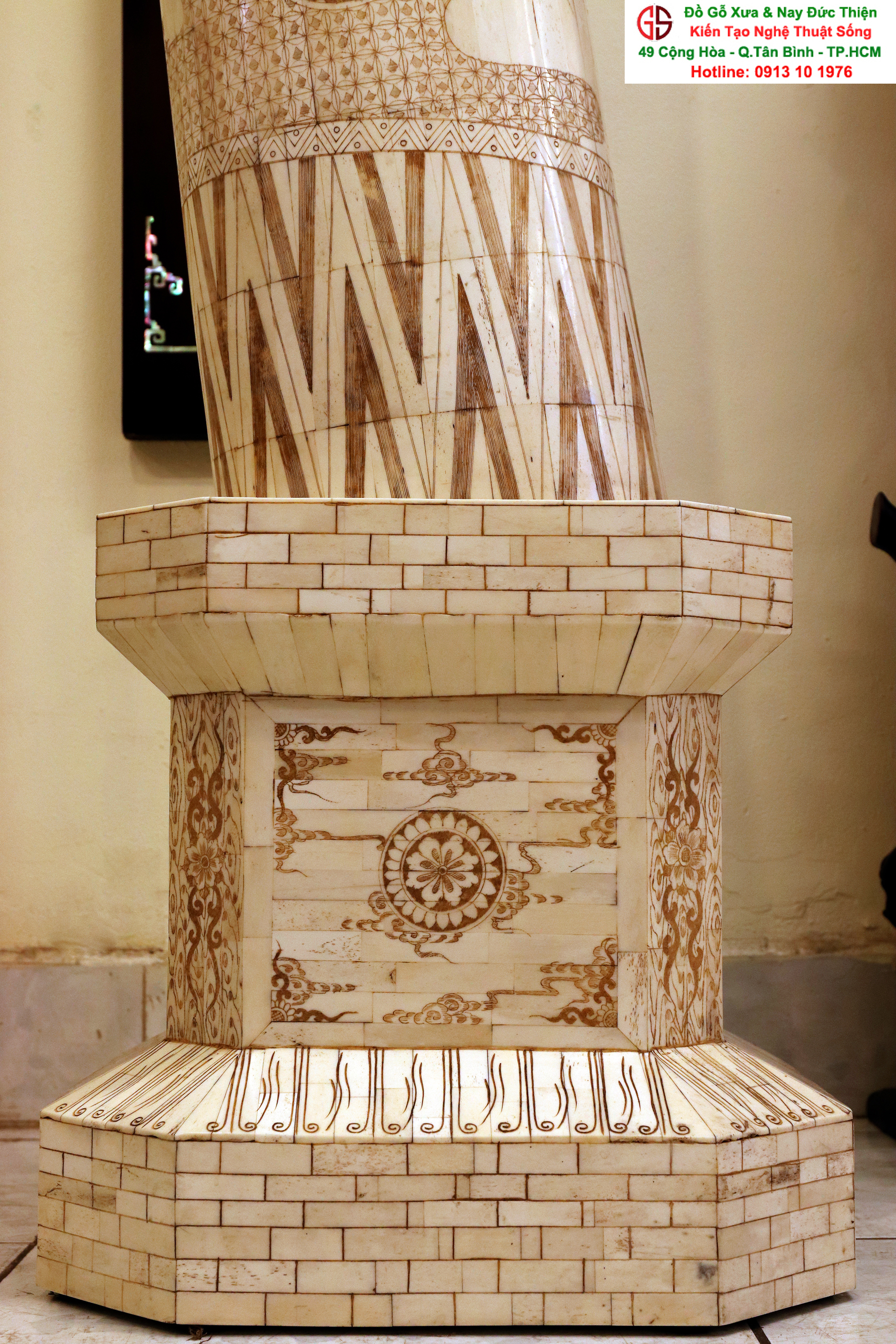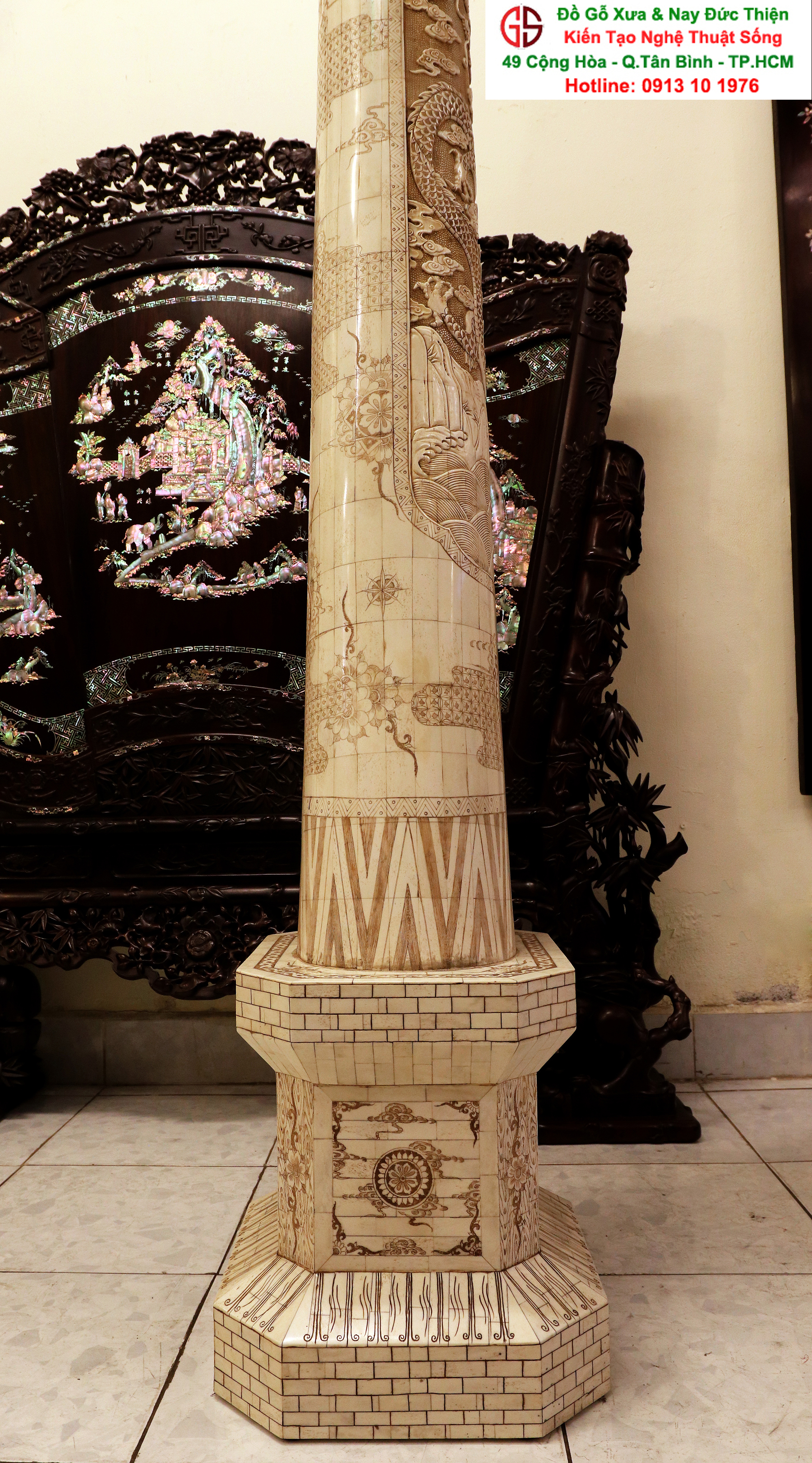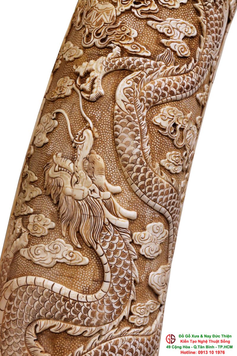 Có lẽ không cần nói nhiều, bạn ắt hẳn cũng đang cảm nhận thấy độ hoành tráng, vẻ đẹp sang trọng của cặp ngà voi được xếp vào hạng :" Siêu To Khổng Lồ " hàng hiếm này nữa. Với chiều cao lên tới 306 cm , chỗ lớn nhất có chiều rộng là 42 cm, những thợ thủ công đã rất khéo léo và tài tình khi sử dụng từng miếng xương nhỏ có kích thước khoảng 2 x 3 cm tạo hình lên một cặp ngà voi lớn, thon thả và cân đối. Không dừng lại ở đó, những người nghệ nhân còn tỉ mỉ gọn dũa, chạm khắc những hình tượng Long Ẩn - Long Cuốn thủy, những đường nét hoa văn mang dấu ấn cung đình, hoàng tộc quý phái.