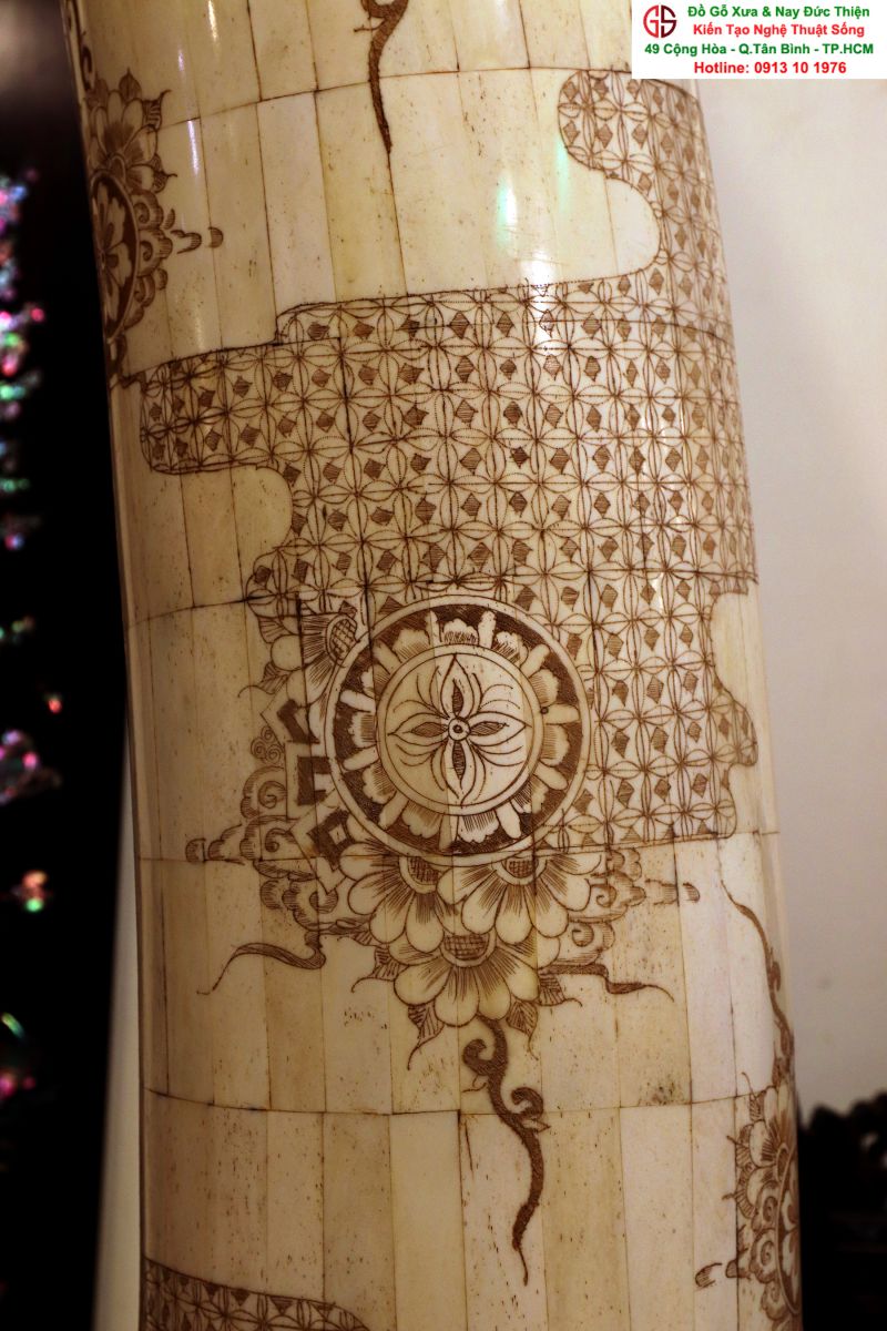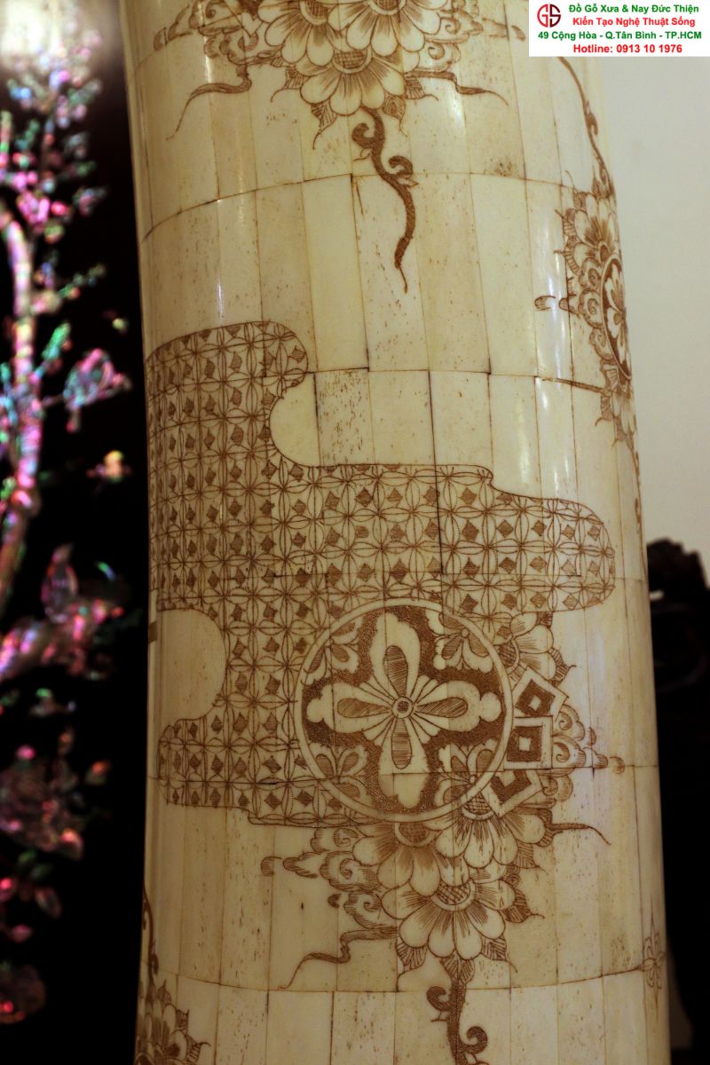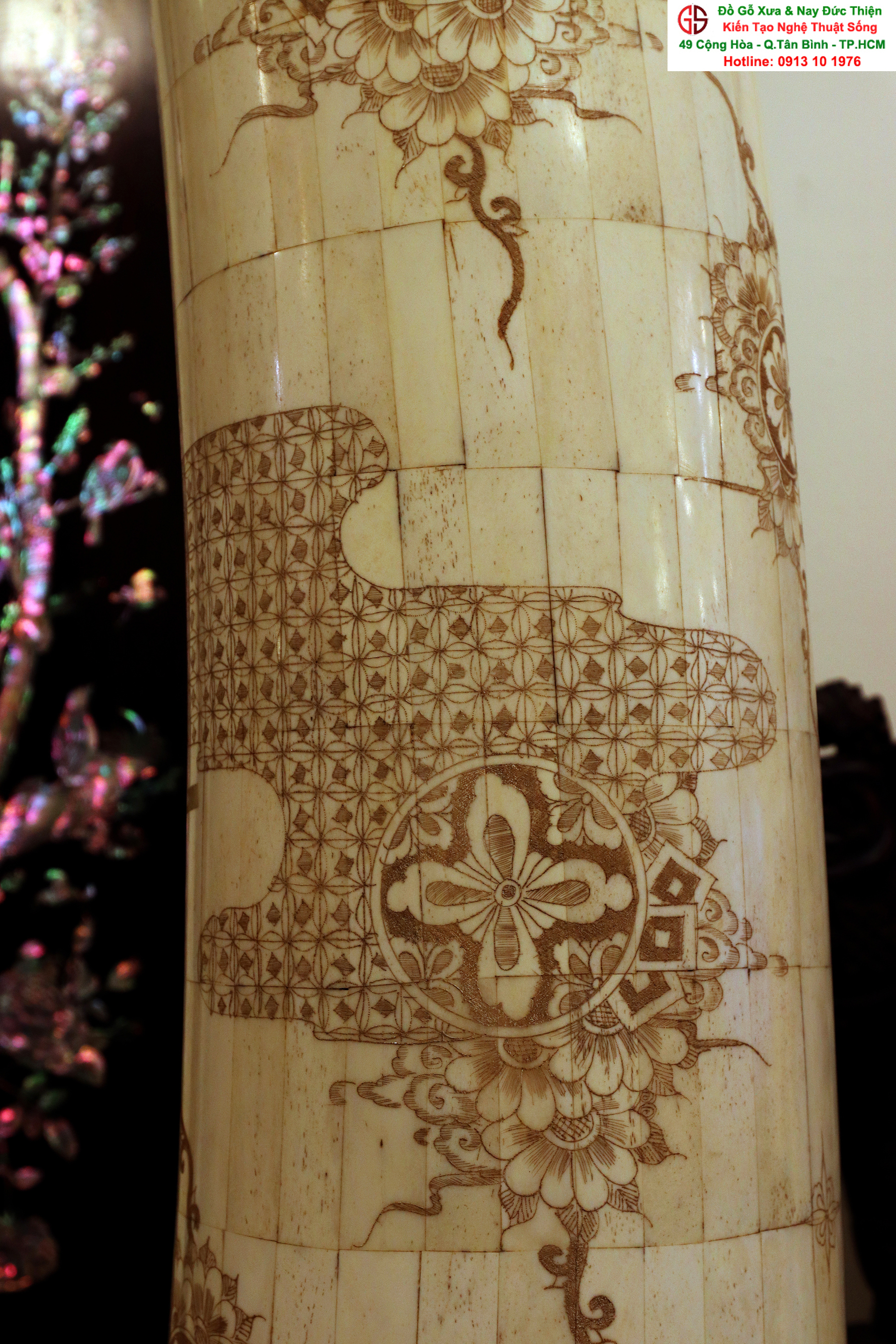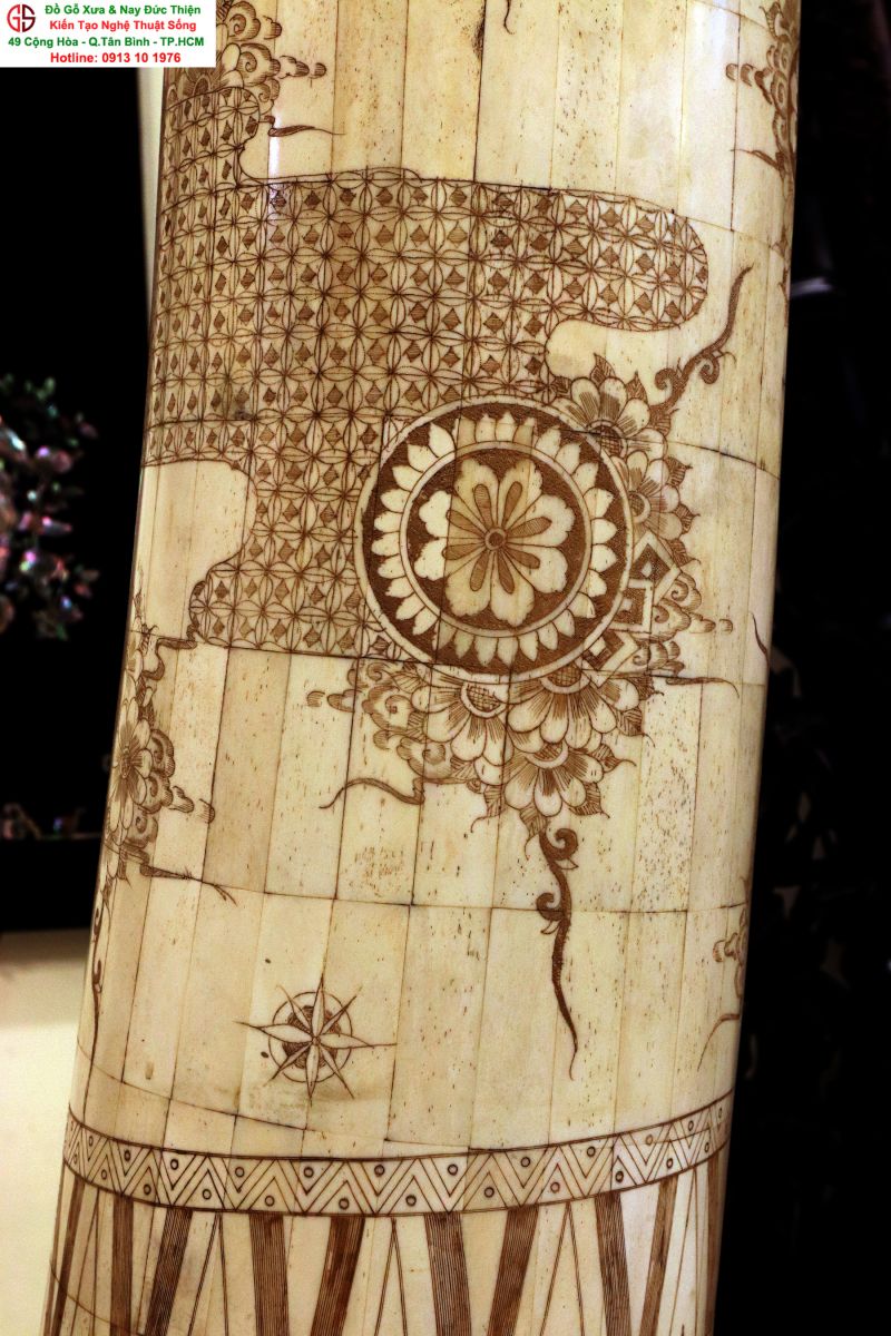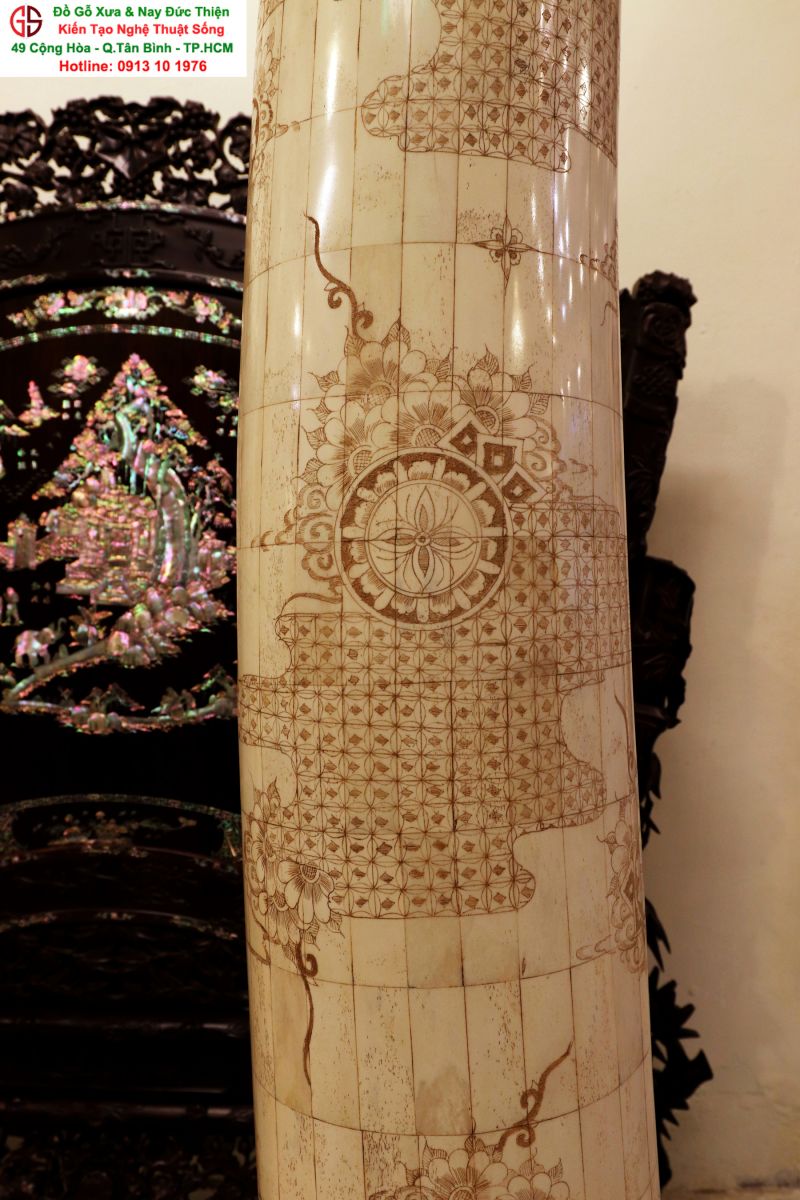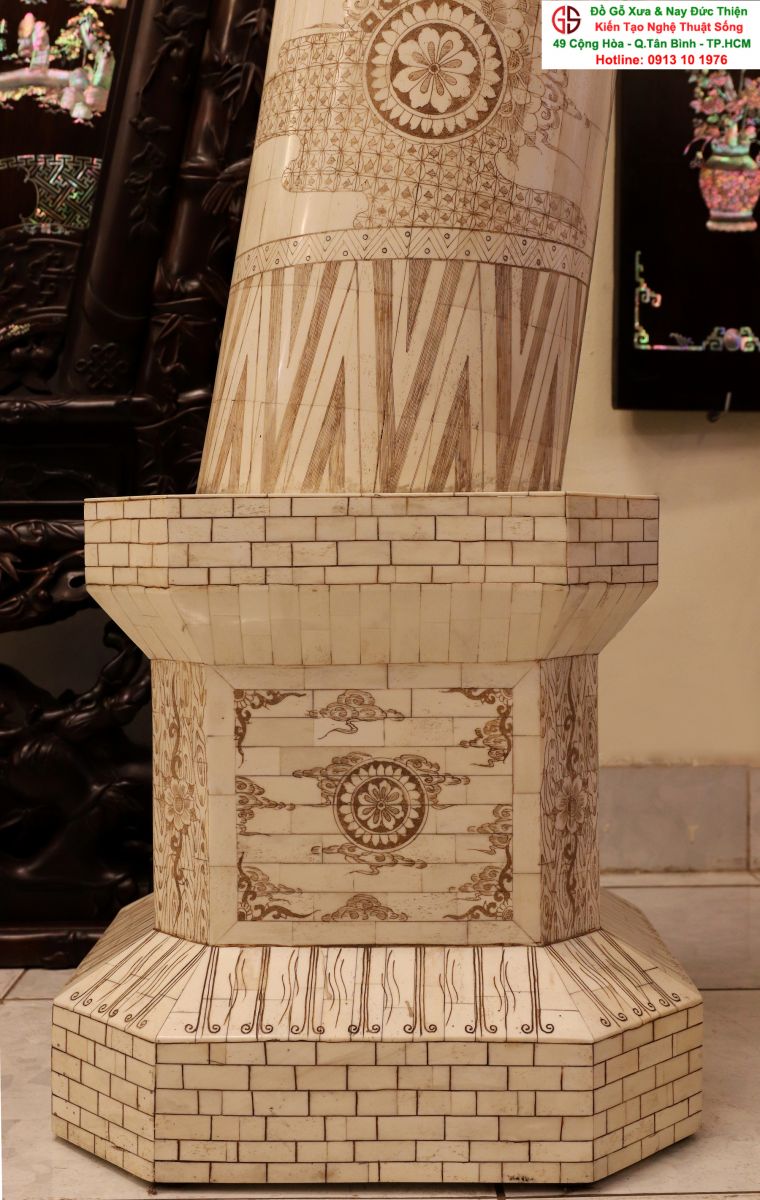 Có lẽ không cần nói nhiều, bạn ắt hẳn cũng đang cảm nhận thấy độ hoành tráng, vẻ đẹp sang trọng của cặp ngà voi được xếp vào hạng :" Siêu To Khổng Lồ " hàng hiếm này nữa. Với chiều cao lên tới 306 cm , chỗ lớn nhất có chiều rộng là 42 cm, những thợ thủ công đã rất khéo léo và tài tình khi sử dụng từng miếng xương nhỏ có kích thước khoảng 2 x 3 cm tạo hình lên một cặp ngà voi lớn, thon thả và cân đối. Không dừng lại ở đó, những người nghệ nhân còn tỉ mỉ gọn dũa, chạm khắc những hình tượng Long Ẩn - Long Cuốn thủy, những đường nét hoa văn mang dấu ấn cung đình, hoàng tộc quý phái.